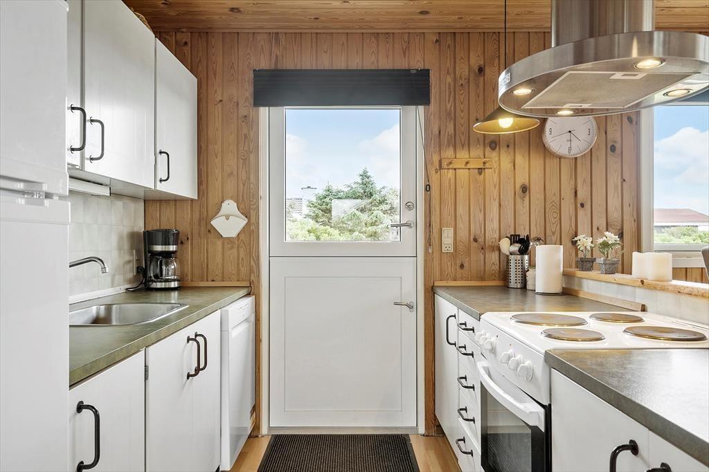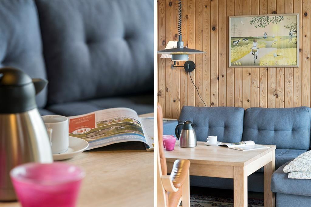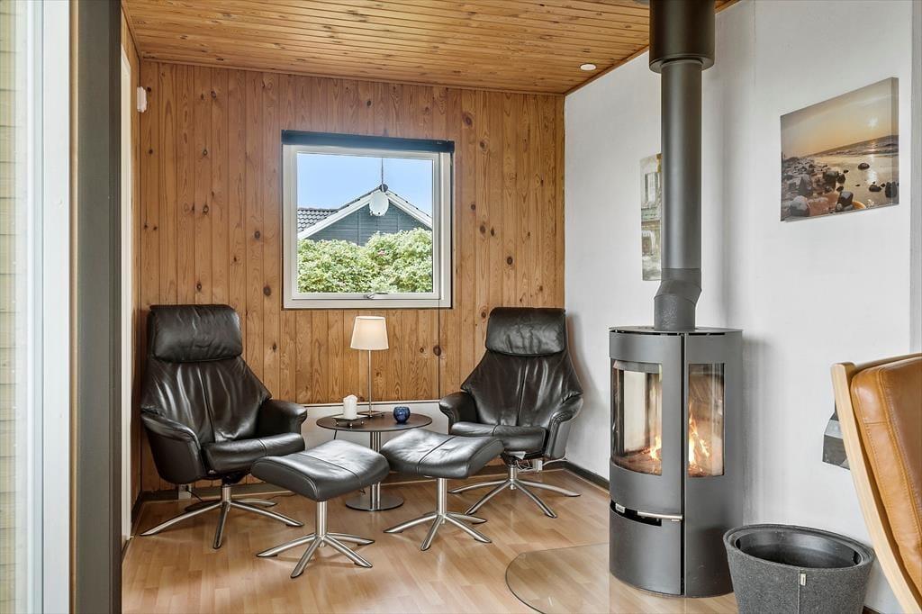 Uanset om du er her alene med din bedre halvdel, eller om I har taget hunden, børnene eller gode venner med, kan du se frem til at hygge dig inden døre i huset. Der er tre gode soveværelser til rådighed, når det er sengetid, og hvis du vil have et opkvikkende morgenbad eller bruge formiddagen på at slappe af i saunaen, er det på badeværelse, det foregår. De fleste af døgnets vågne timer kommer nu nok til at udspille sig i stuen, der er et dejligt opholdsrum med rustik træbeklædning på væggene, åbent køkken og store vinduespartier vendt mod terrassen. Nær brændeovnen er der indrettet en rigtig hyggekrog med bløde lænestole – og hvis du ikke vil sidde her med en god bog, er både sofaafdelingen og spisebordet dejlige steder at samles.