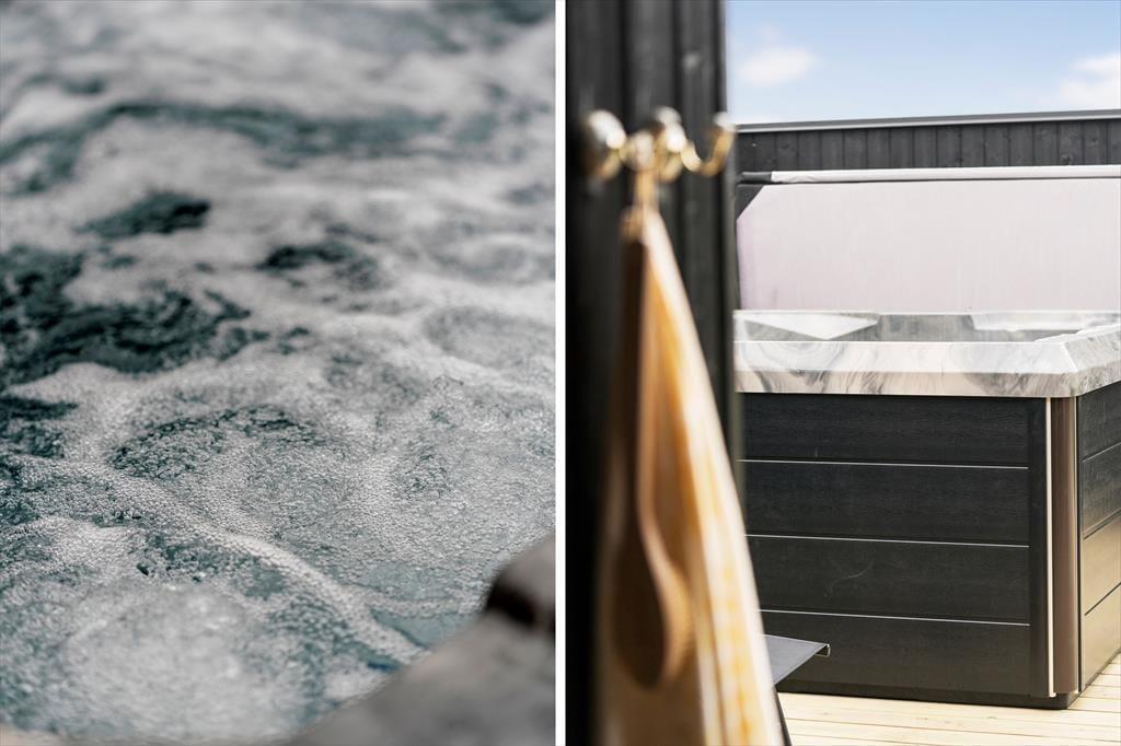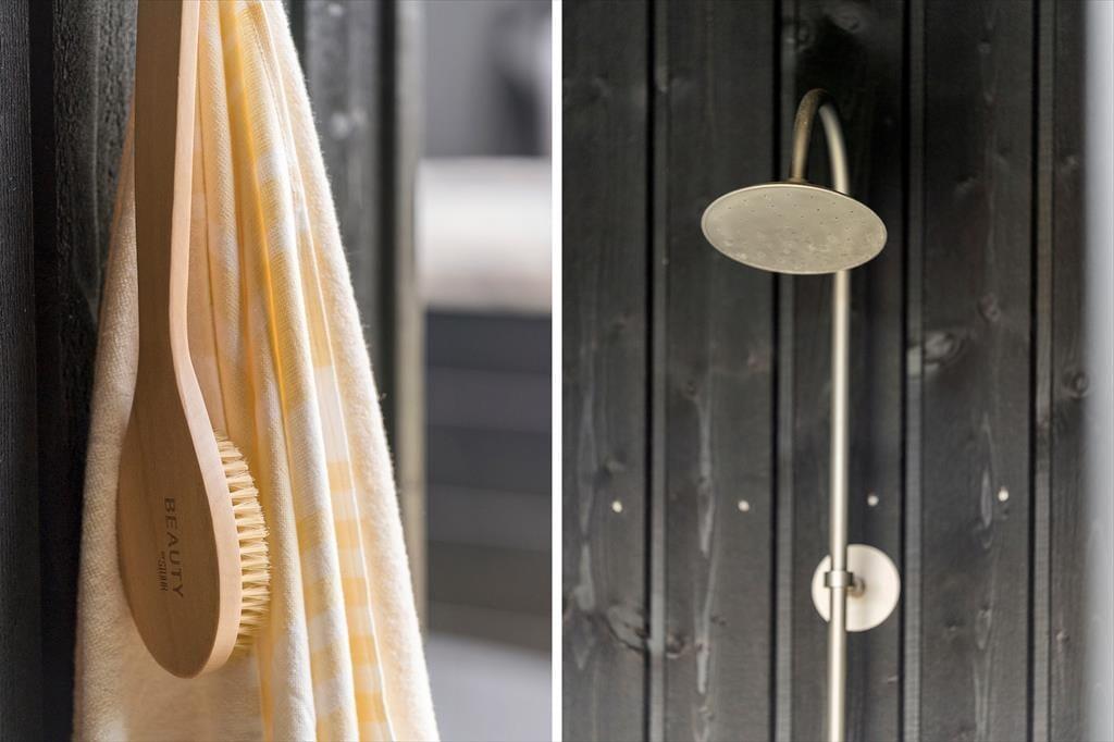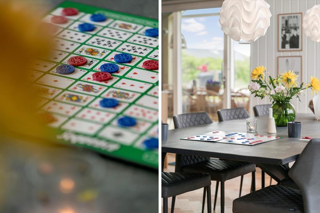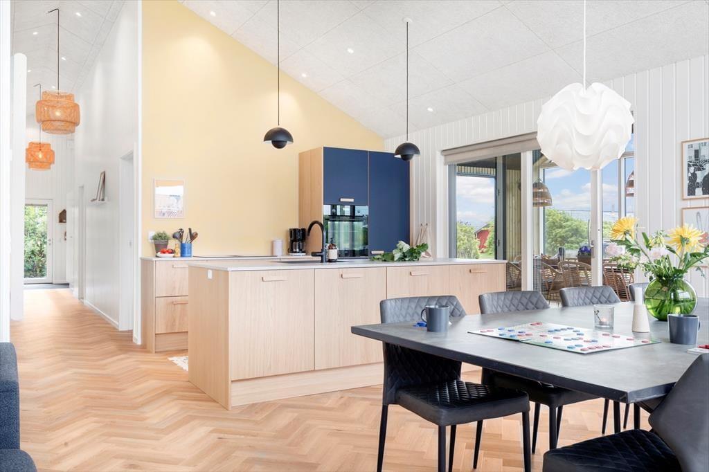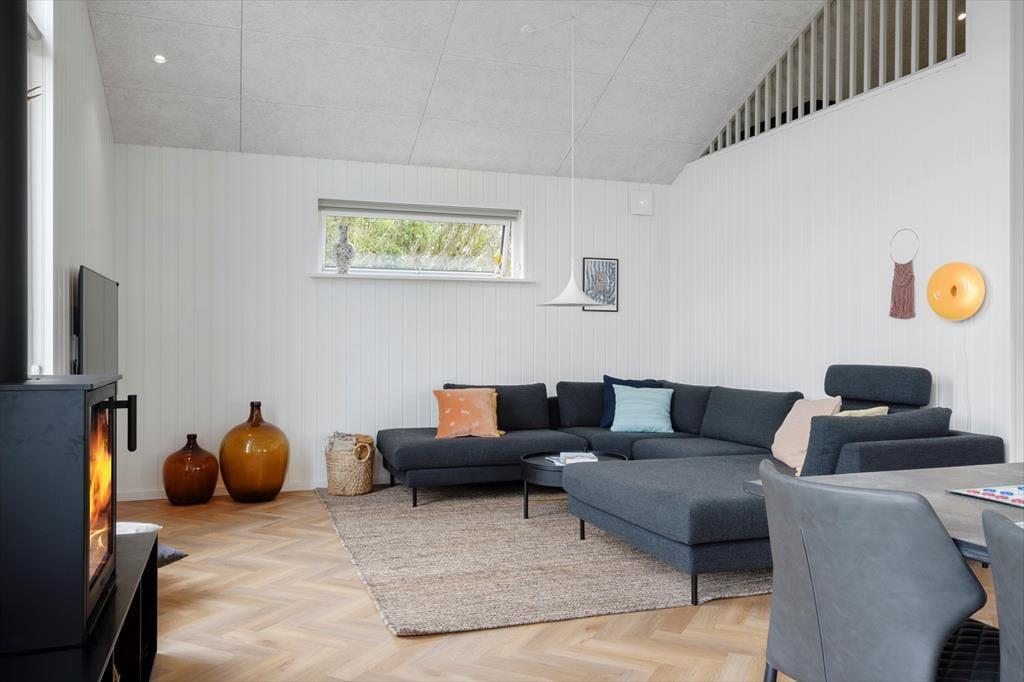 Sommerhuset emmer af moderne stil og komfort, og det er designet med tanke på hygge og samvær. Her kan du glæde dig til at samles i det store og åbne opholdsrum, hvor stue og køkken går op i en højere enhed. Med store vinduespartier, der lukker masser af lys ind, bliver stemningen lys og luftig, og du får samtidig en skøn udsigt til de smukke omgivelser. Den komfortable sofagruppe indbyder til hyggelige stunder foran brændeovnen, hvor I kan lade roen sænke sig efter en dag fyldt med aktiviteter. Huset byder også på tre rummelige soveværelser og to moderne badeværelser, hvilket gør det perfekt til både familier og vennegrupper, der ønsker at holde ferie sammen.