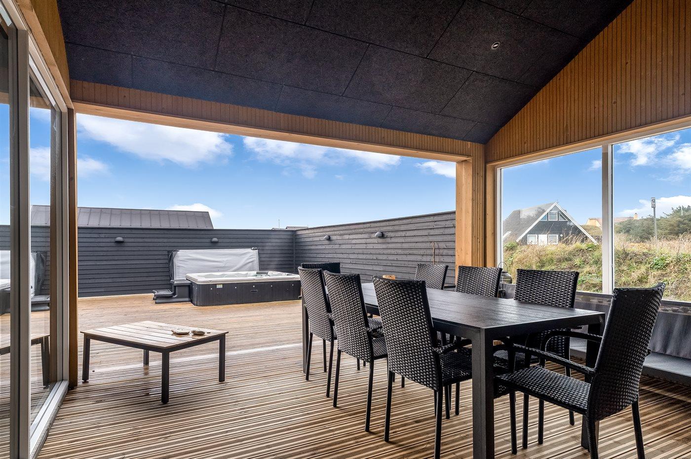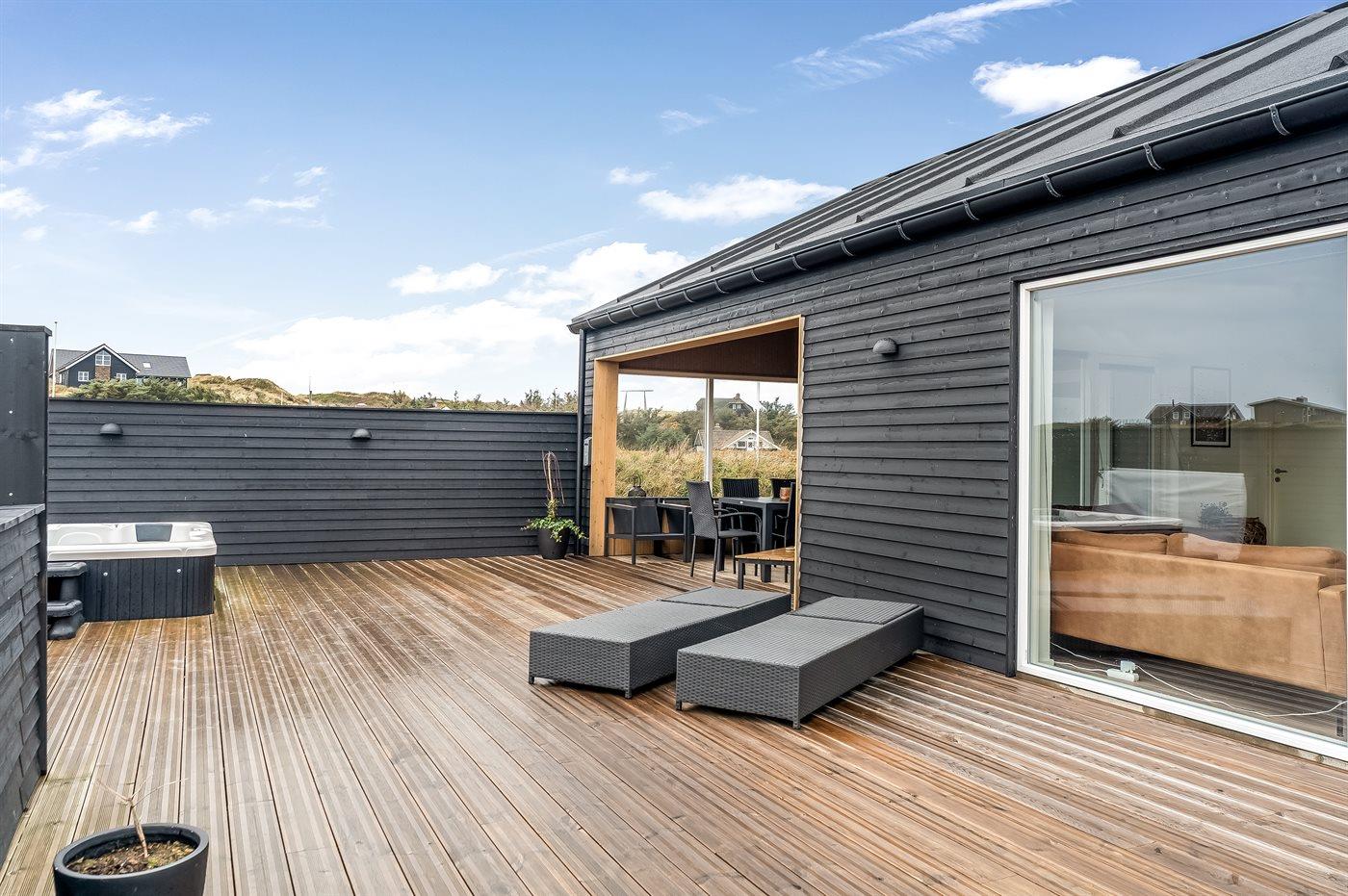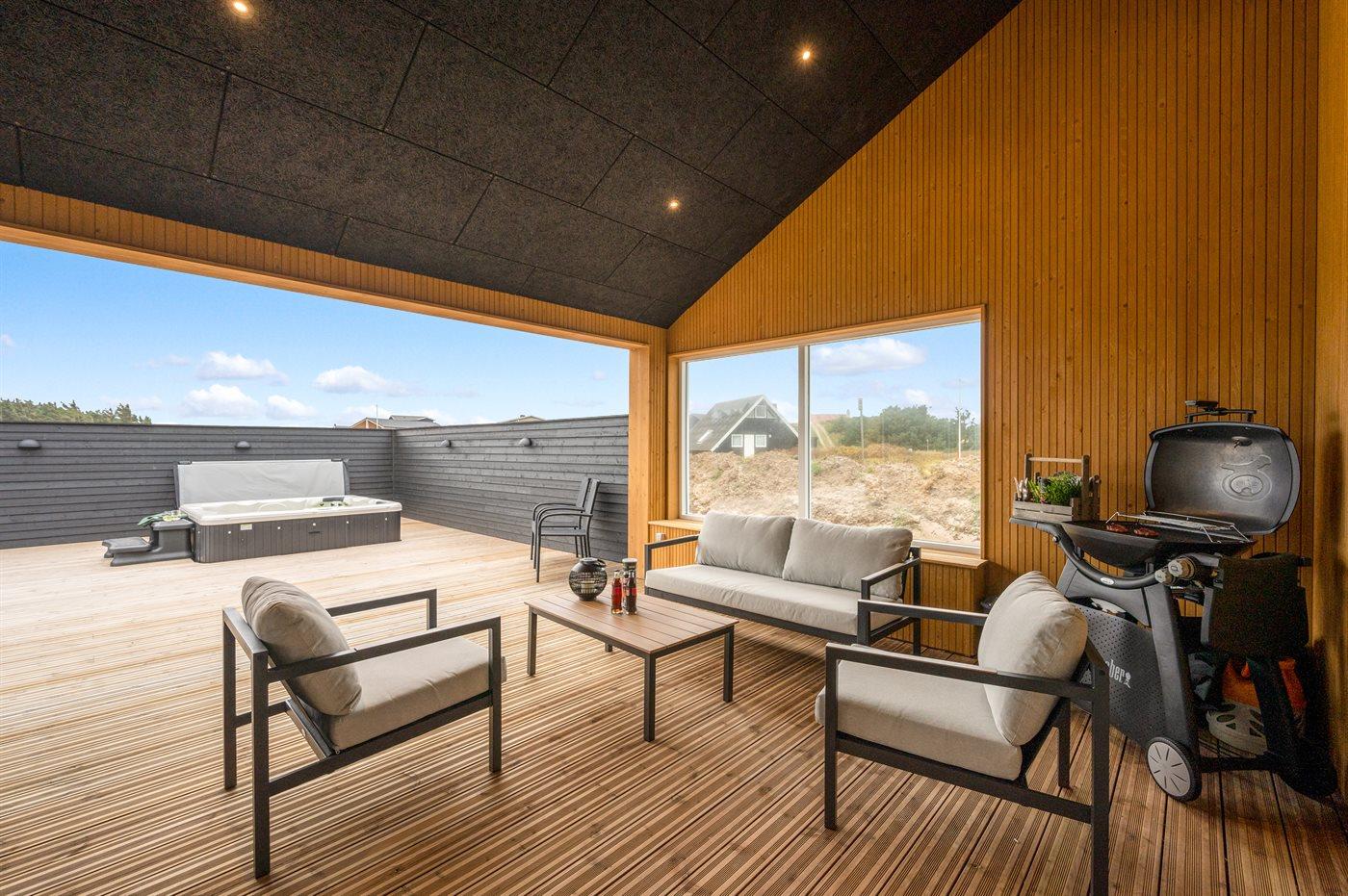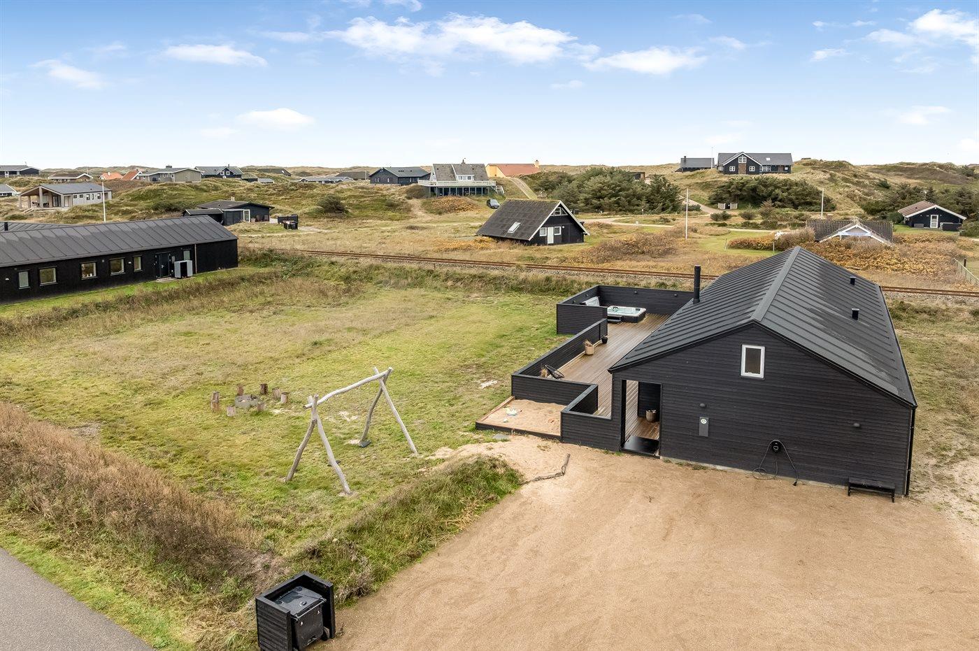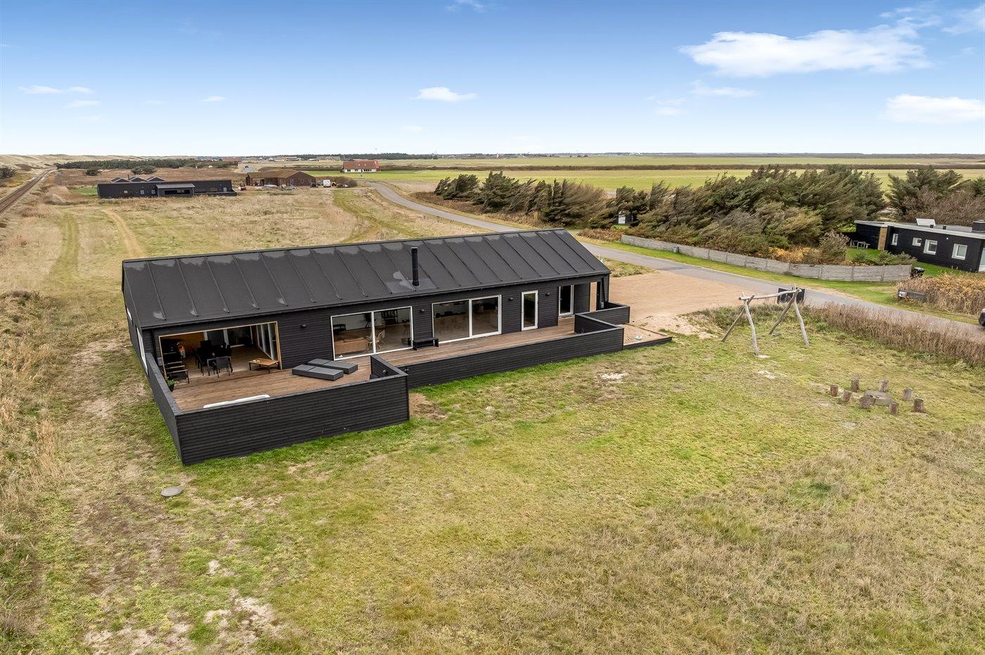 I dette feriehus får du et moderne og funktionelt hus, hvor der er fokus på rummelighed og æstetik. Med de store vinduespartier kommer der masser af lys ind i huset, og den overdækkede terrasse er en fantastisk oase selvom Vesterhavets susen kan mærkes. I dette hus har du nok også Vejlby Klits største sauna og i kombination med den lækre udendørs spa byder huset også på masser af wellness.