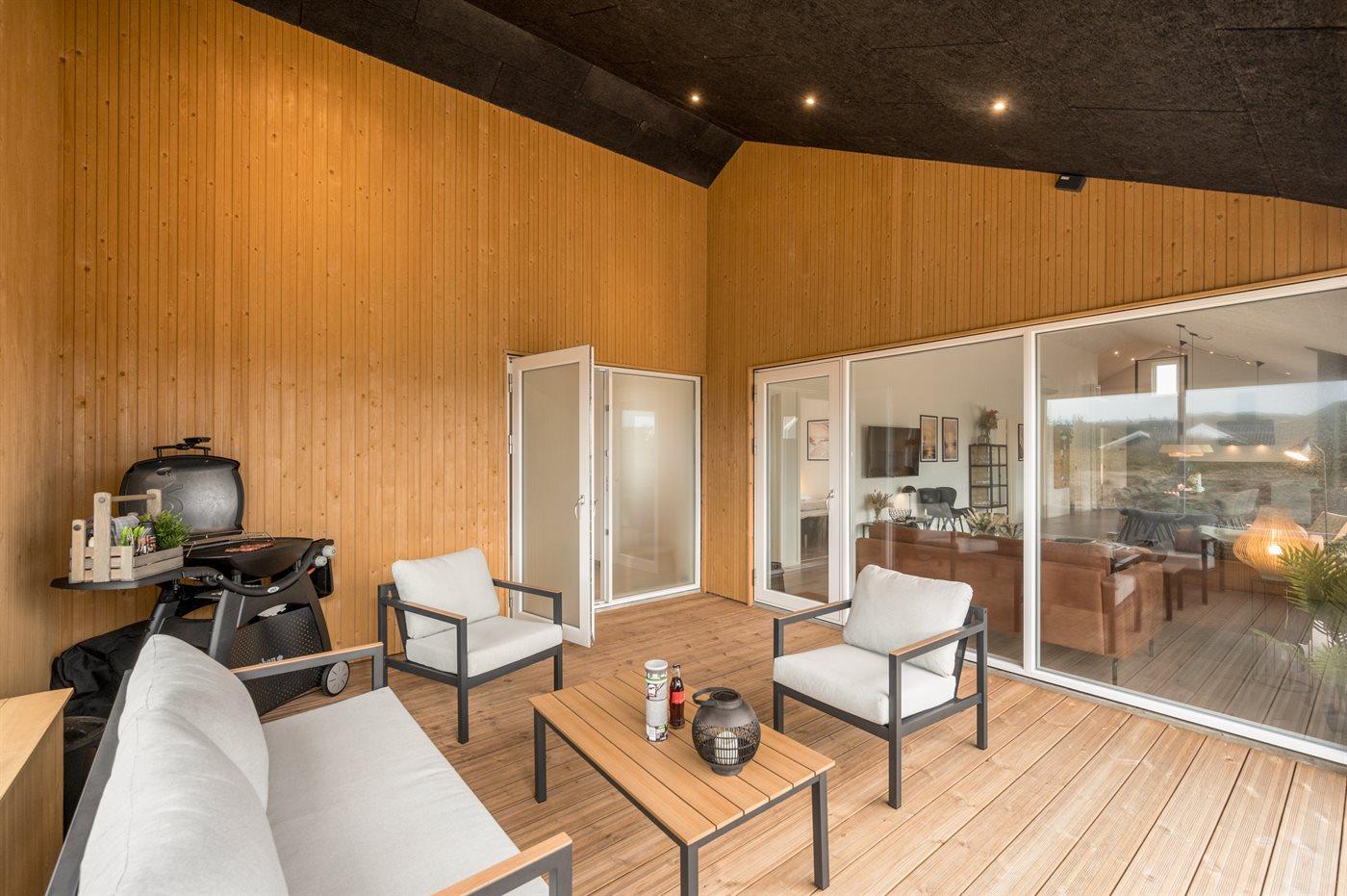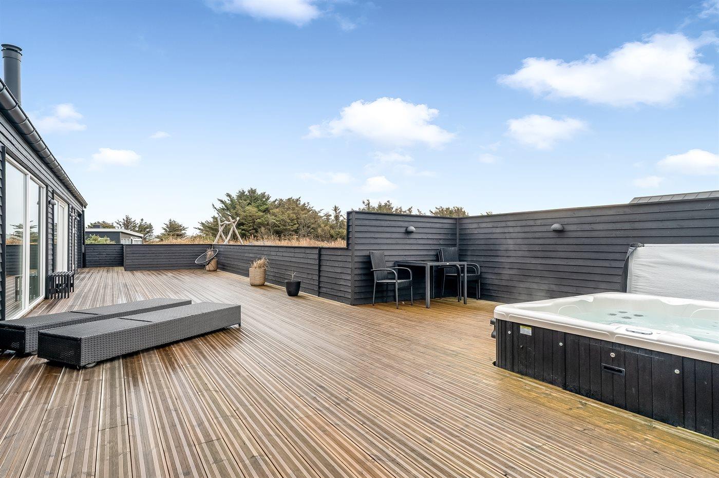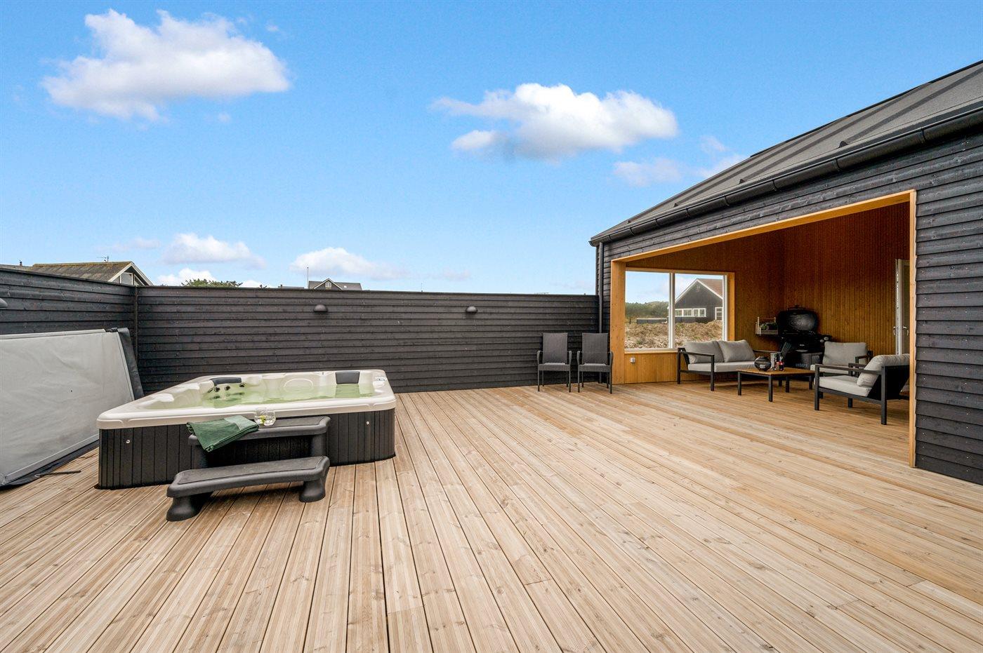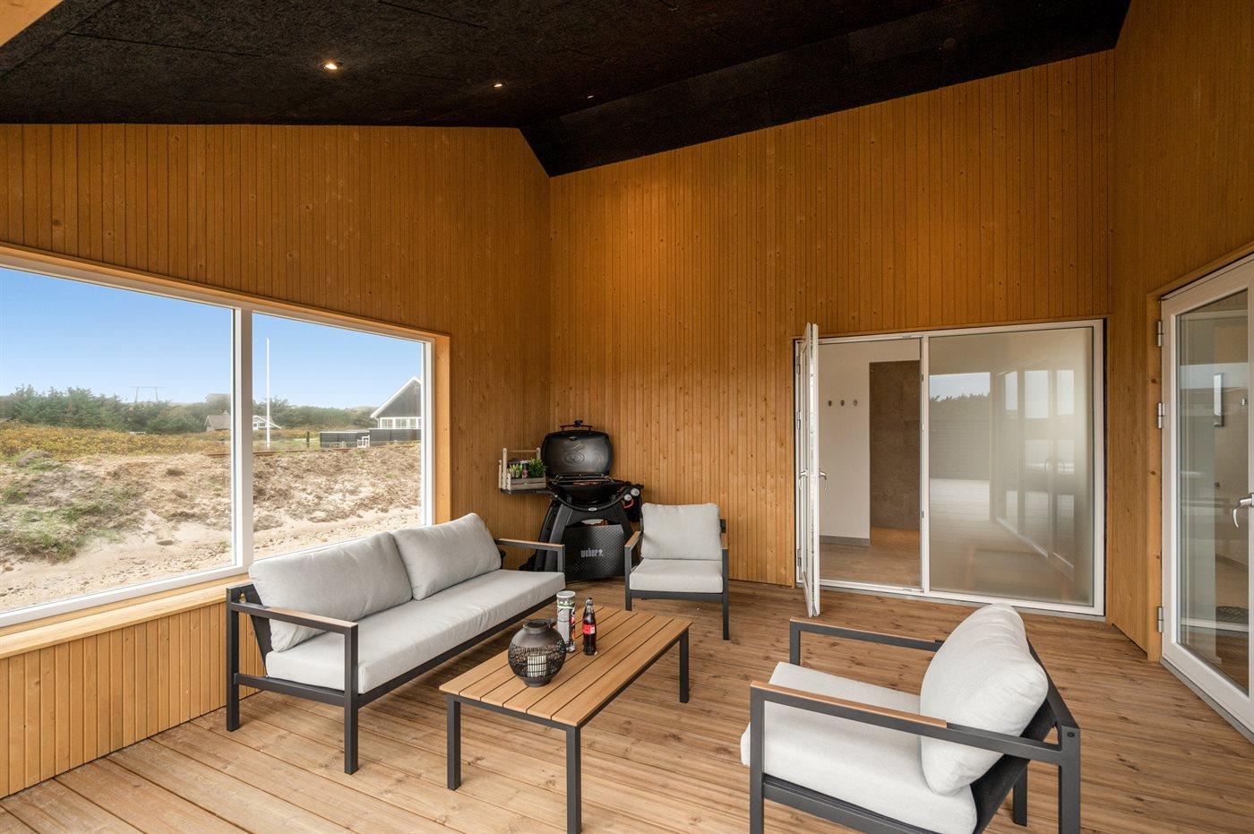 I dette feriehus får du et moderne og funktionelt hus, hvor der er fokus på rummelighed og æstetik. Med de store vinduespartier kommer der masser af lys ind i huset, og den overdækkede terrasse er en fantastisk oase selvom Vesterhavets susen kan mærkes. I dette hus har du nok også Vejlby Klits største sauna og i kombination med den lækre udendørs spa byder huset også på masser af wellness.