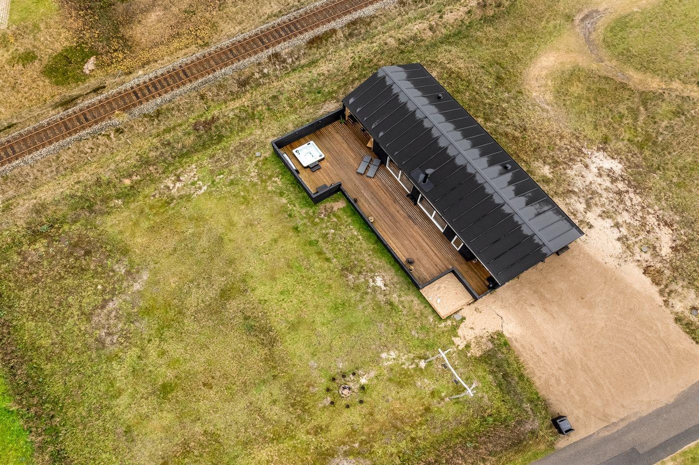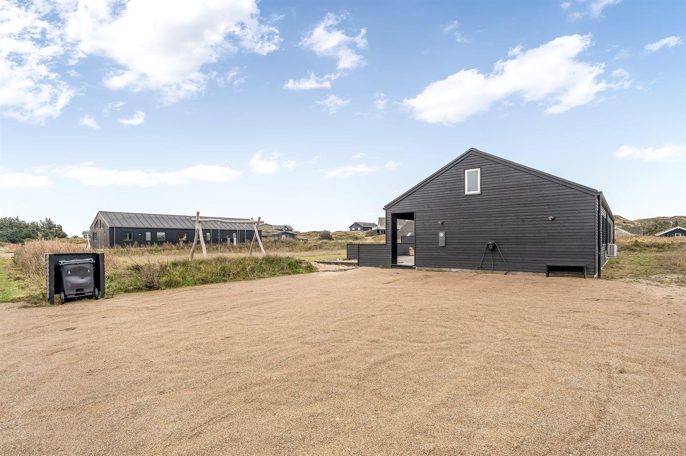 Ferieboligen er beliggende på en 2000 m² stor klitgrund. Der er 300 m til havet. Til ferieboligen hører åbent terrasseareal. Desuden er der overdækket terrasse. Gynge. Sandkasse. Der er installeret stik til opladning af elbil. Type 2 stik. Parkering ved ferieboligen.