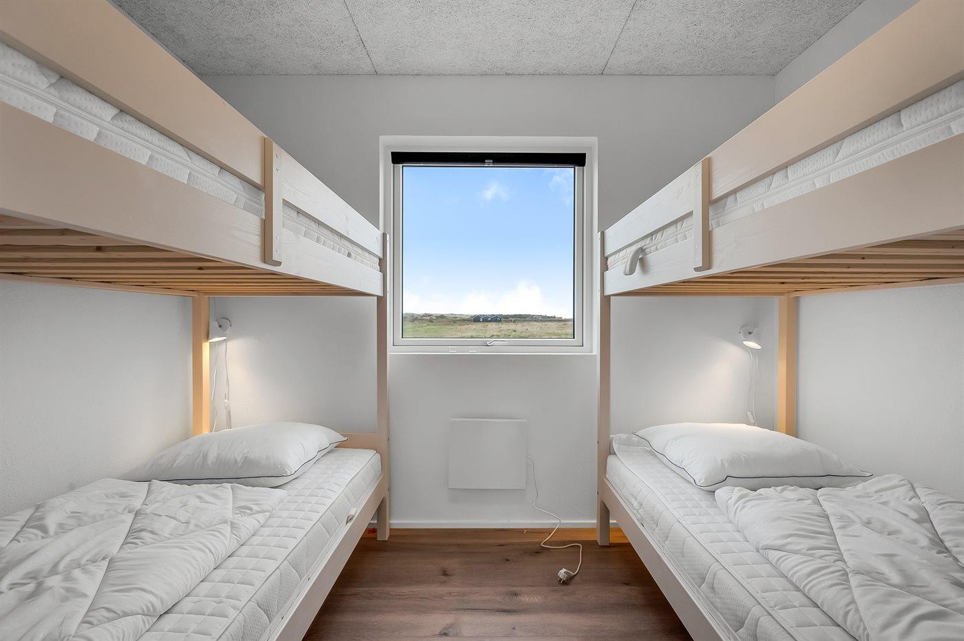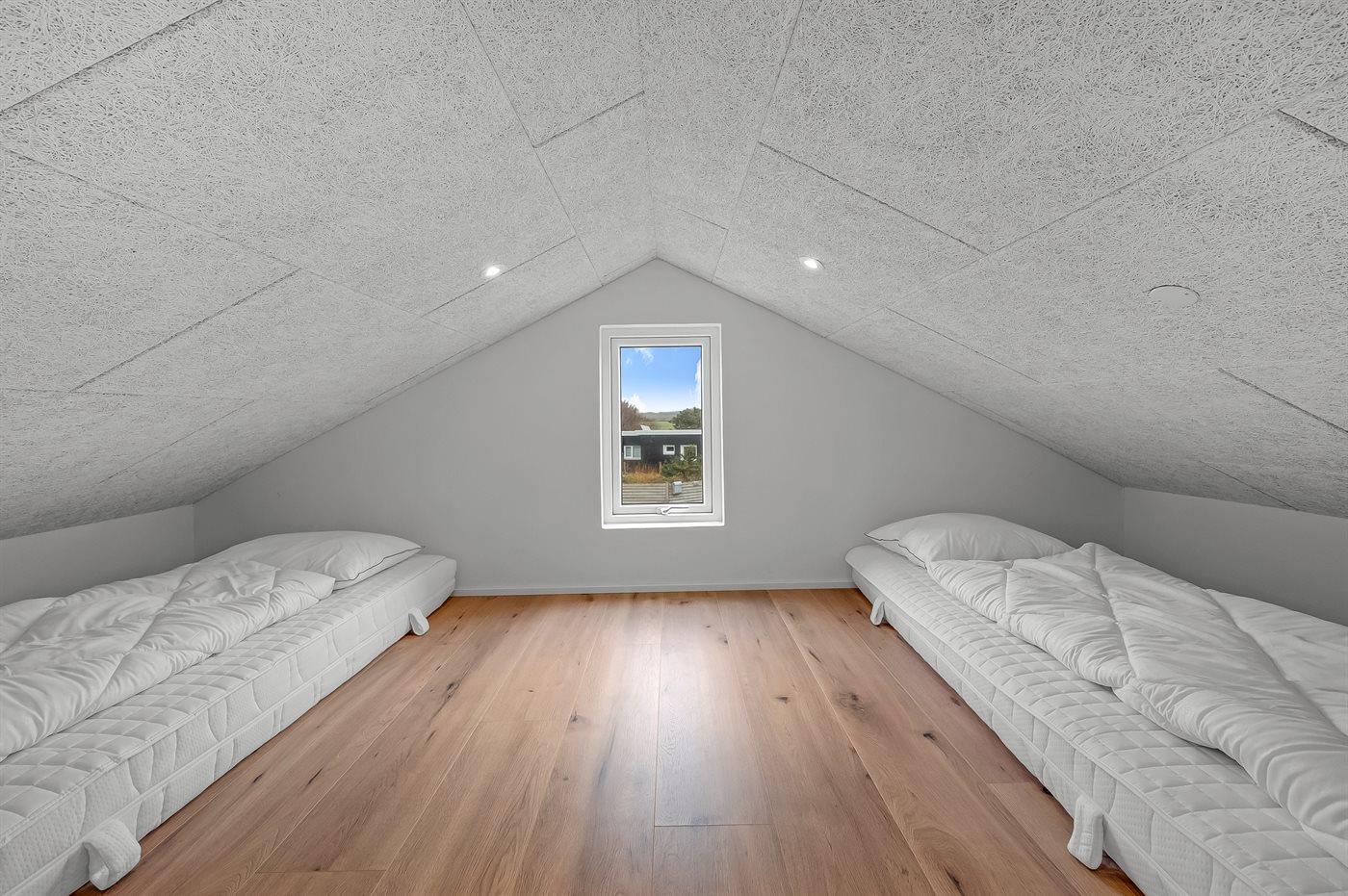 Der er i alt 4 soveværelser. Sovepladserne fordeler sig på: 6 sovepladser i dobbeltsenge. 4 sovepladser i køjesenge. 2 sovepladser på madrasser. 2 af disse sovepladser befinder sig på husets hems. Derudover er der 1 stk. barneseng.