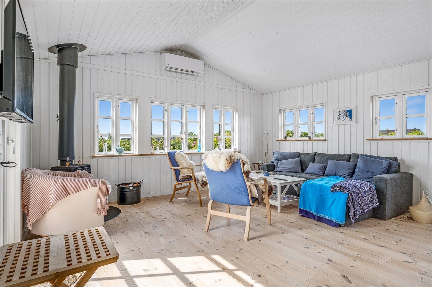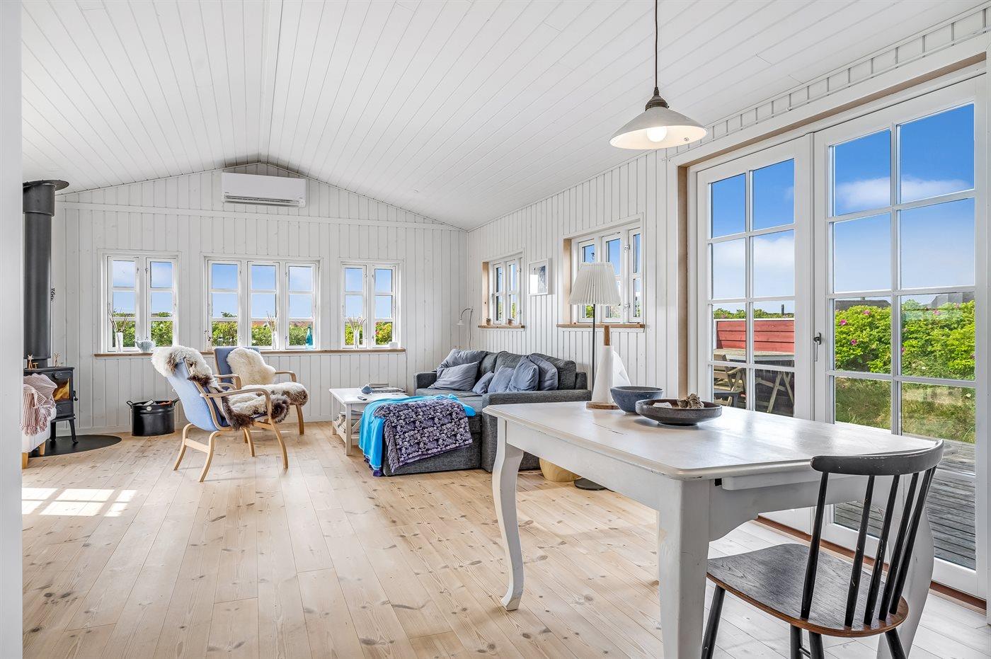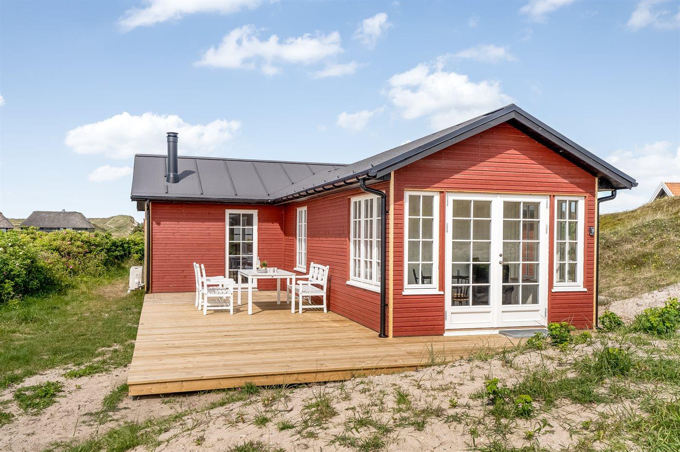 Hyggeligt og moderne feriehus i Vejlby Klit tæt på Vesterhavet med terrasse og brændeovn.