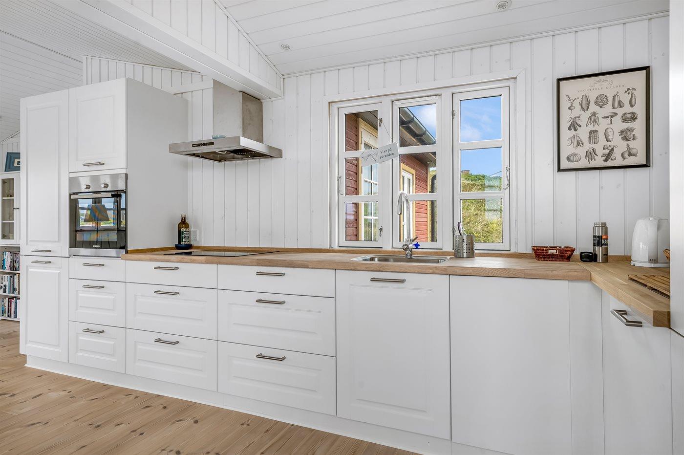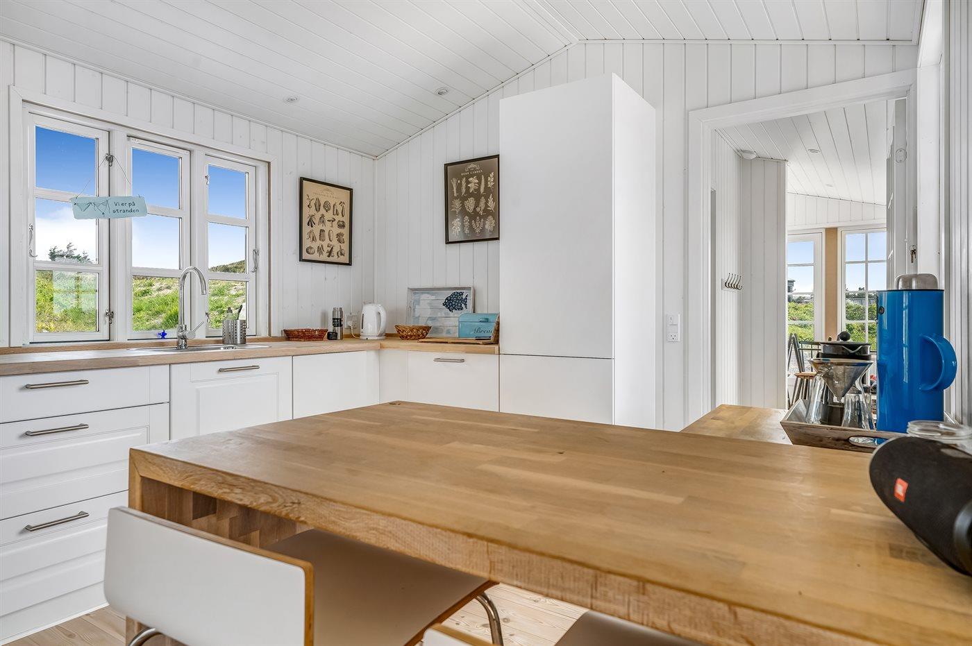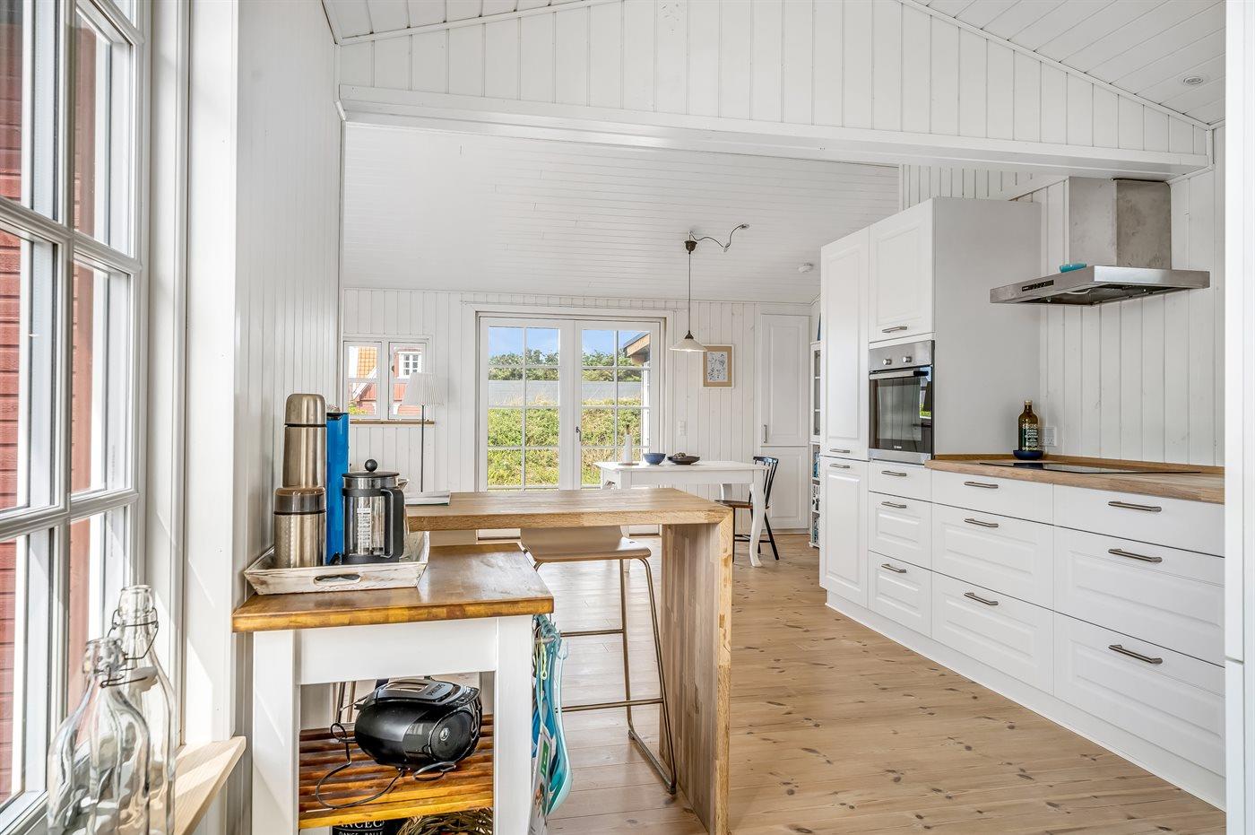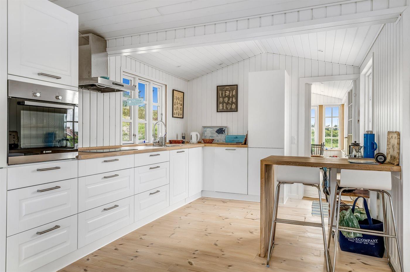 Køkkenet er udstyret med 1 køleskab. Der er 4 induktionskogeplader, varmluftovn, mikrobølgeovn samt opvaskemaskine.