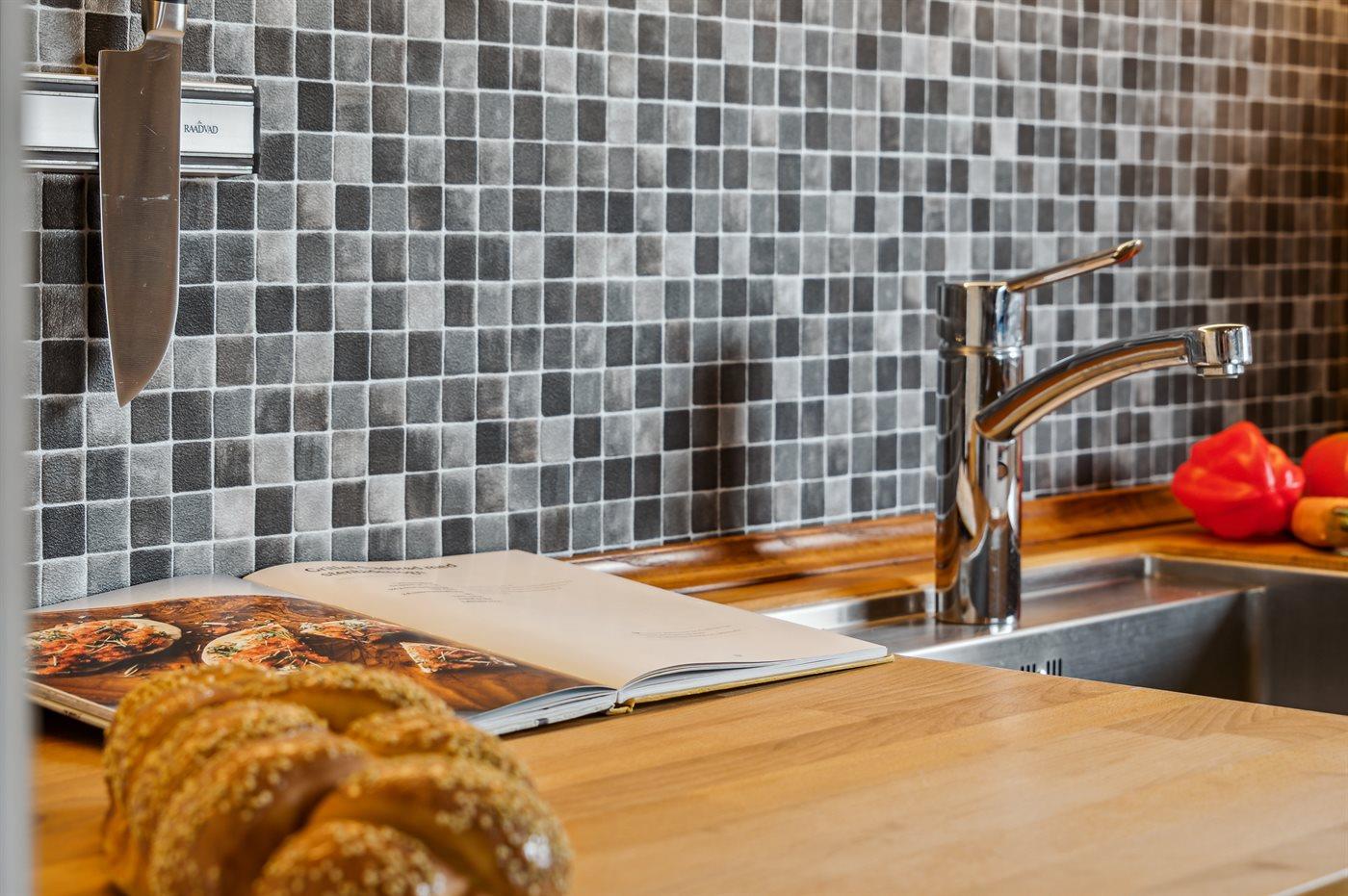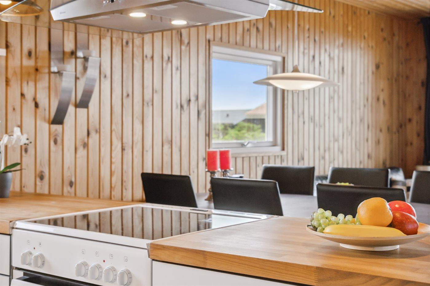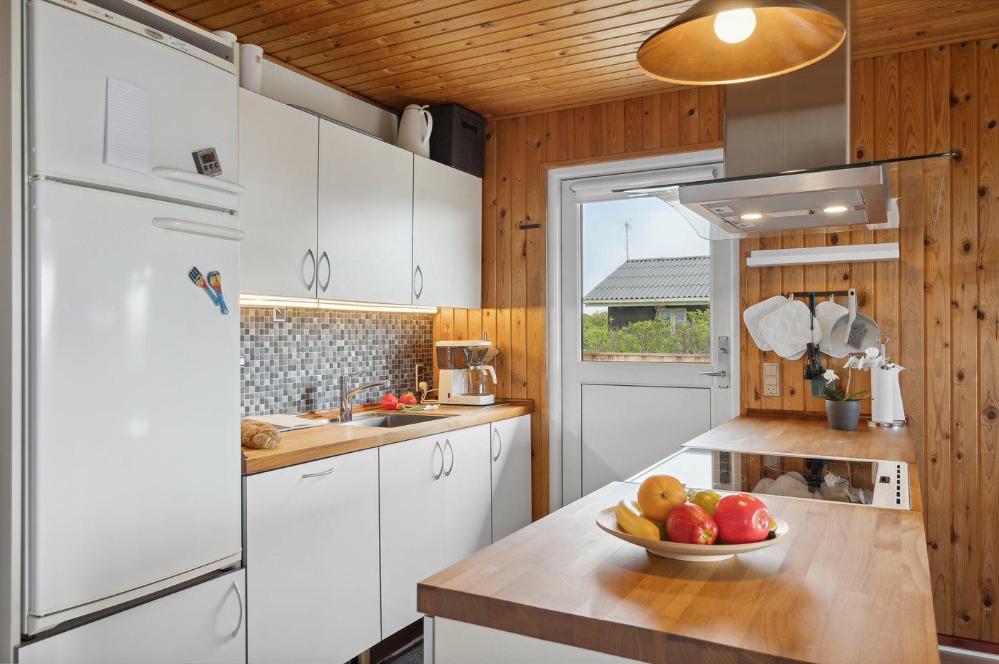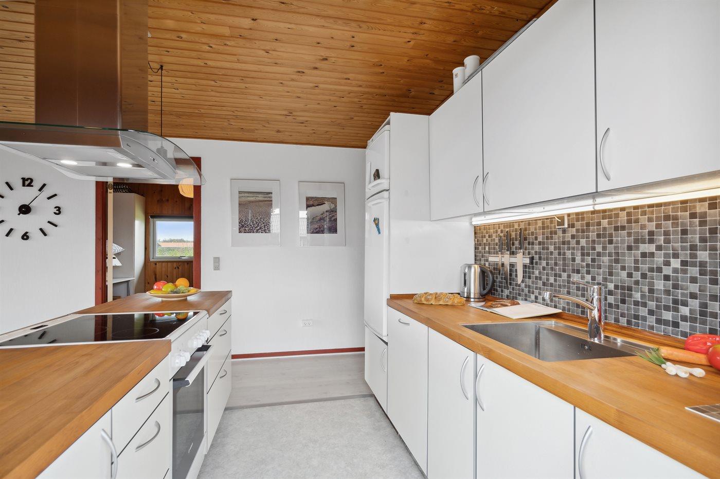 Køkkenet er udstyret med 1 køleskab. Der er 4 keramiske kogeplader, miniovn, varmluftovn, mikrobølgeovn samt opvaskemaskine.