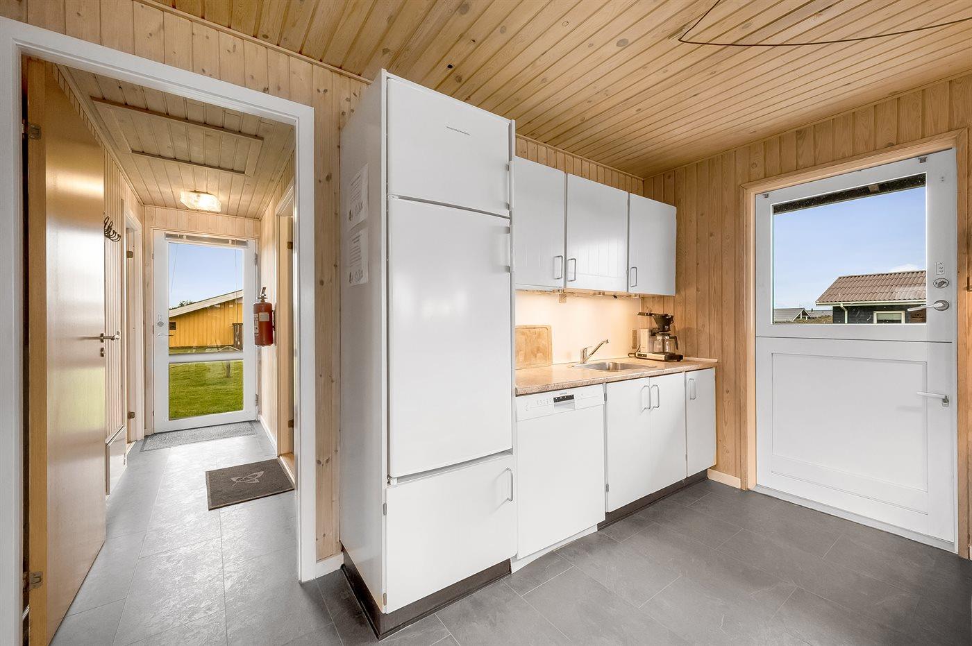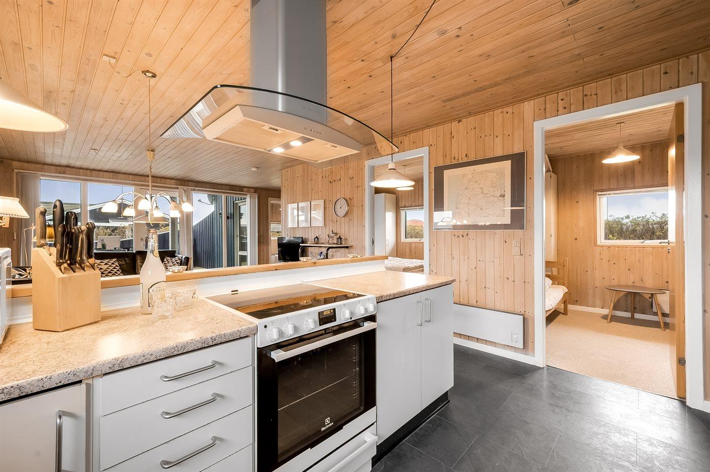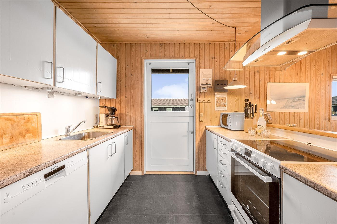 Køkkenet er udstyret med 1 køleskab. Der er 4 keramiske kogeplader, varmluftovn, mikrobølgeovn samt opvaskemaskine.