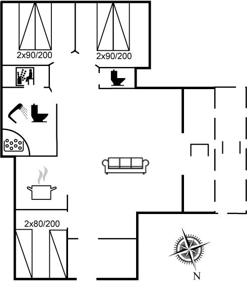 Der er i alt 3 soveværelser. Sovepladserne fordeler sig på: 4 sovepladser i dobbeltsenge. 2 sovepladser i enkeltsenge.