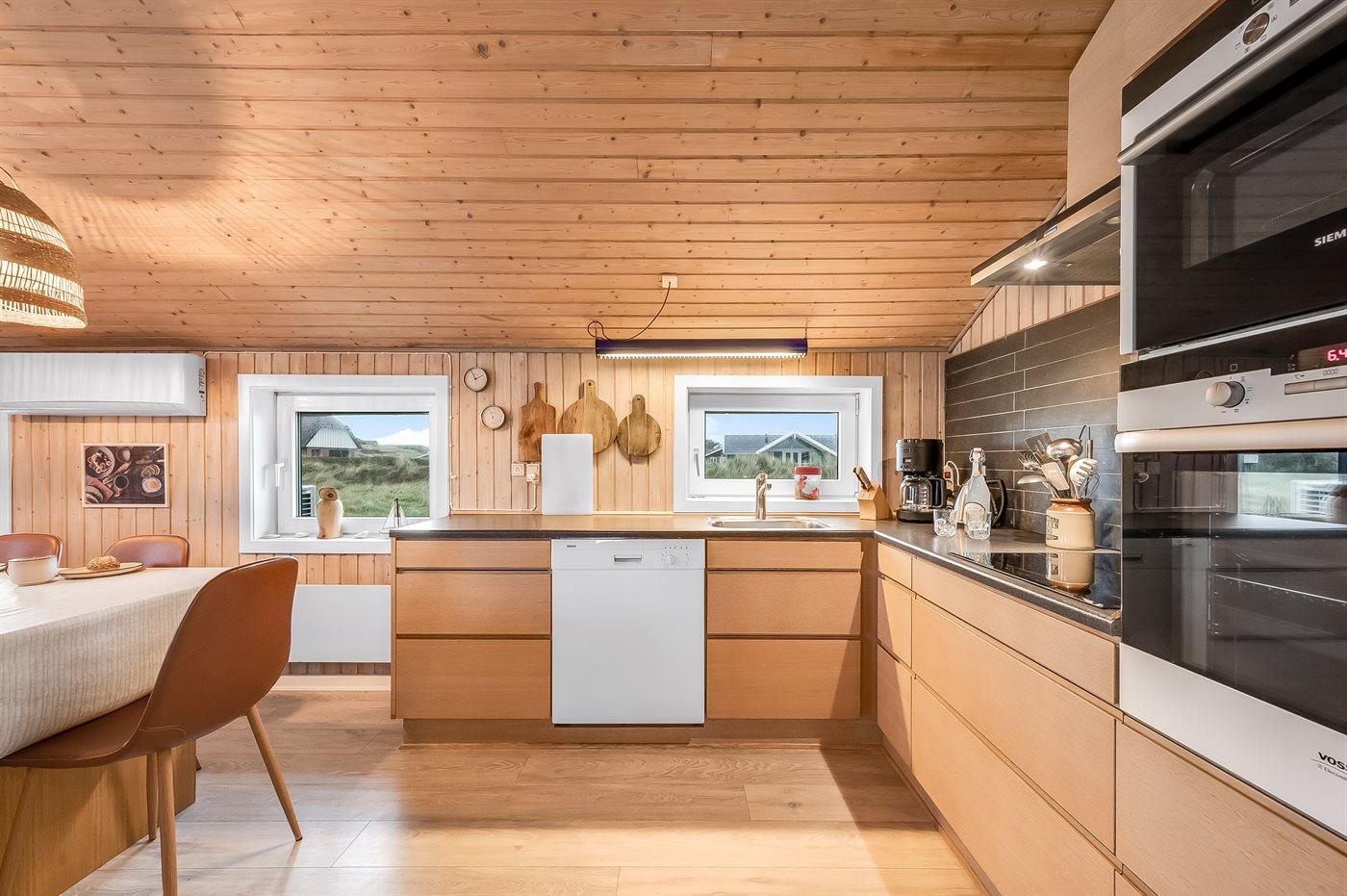 Køkkenet er udstyret med 1 køleskab. Der er 4 keramiske kogeplader, varmluftovn, mikrobølgeovn samt opvaskemaskine.