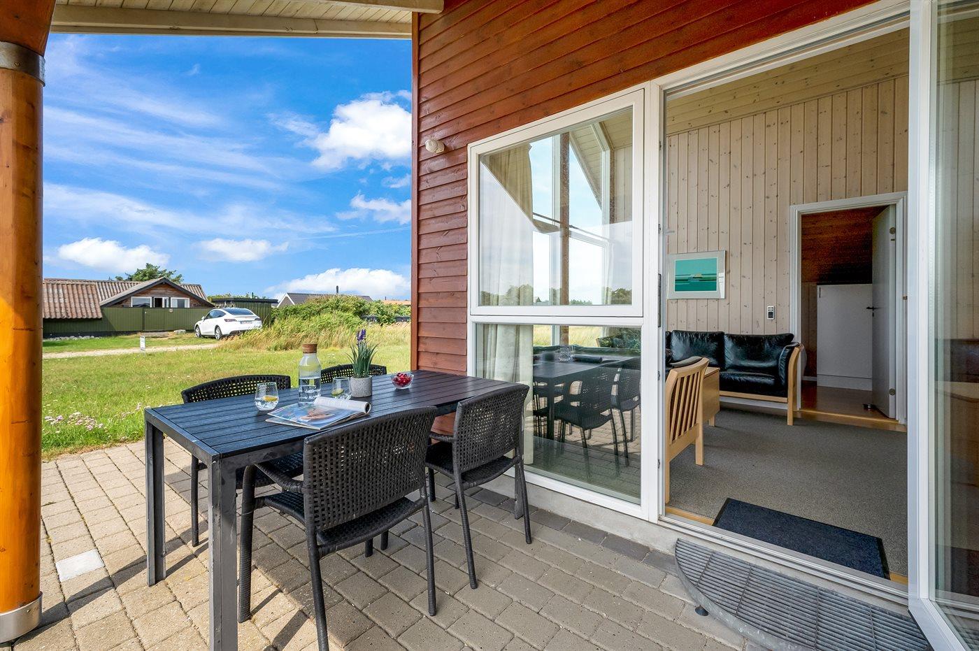 Hyggeligt sommerhus i træ nær Vesterhavet med sauna, spa og stor terrasse til afslapning.