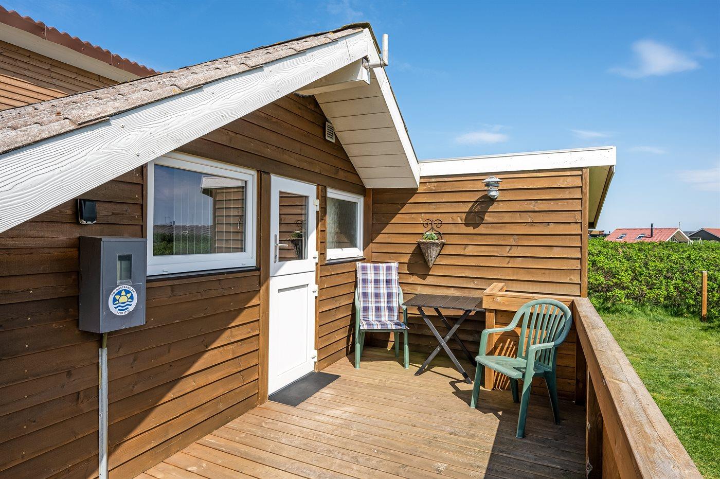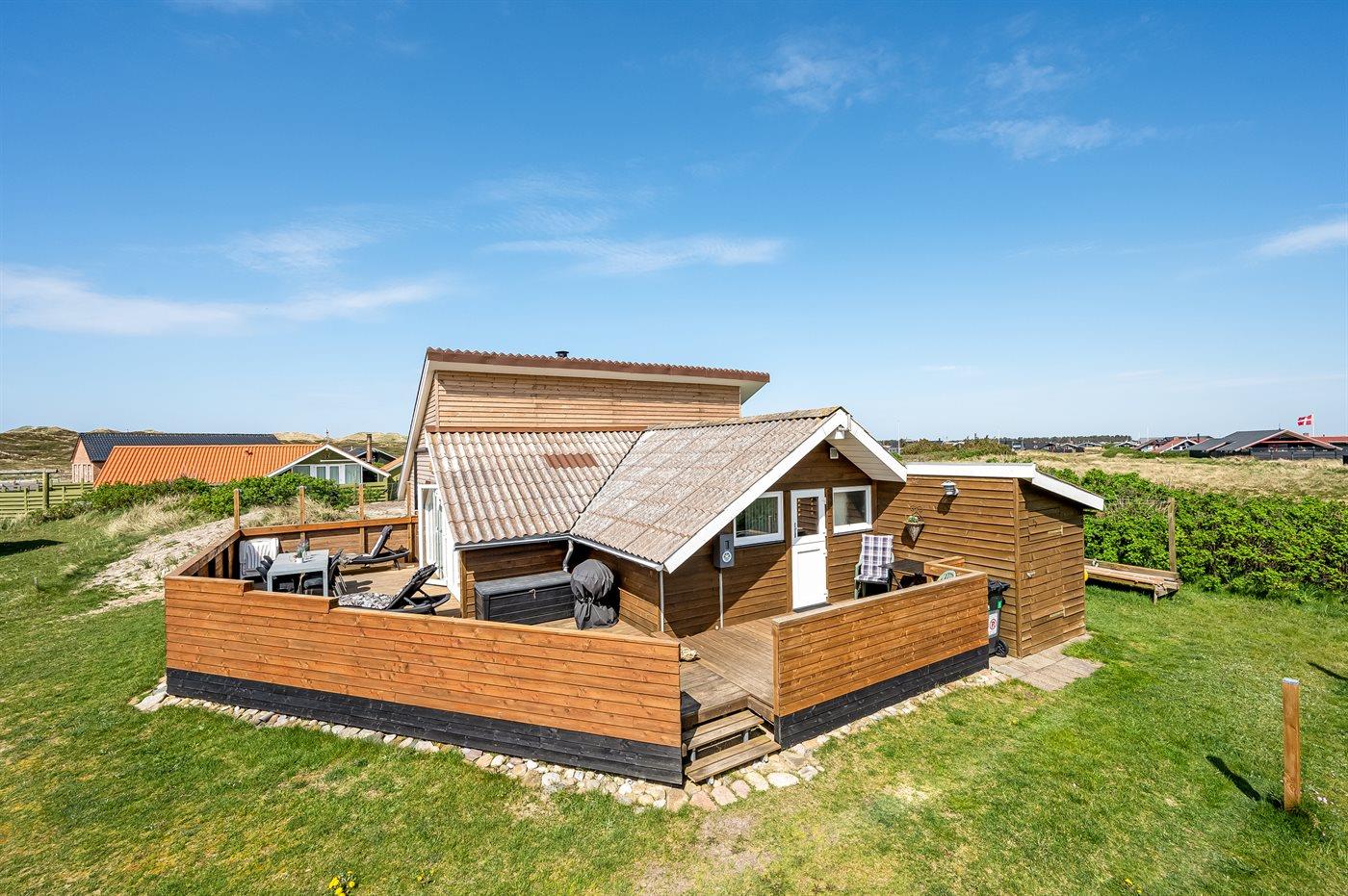 Hyggeligt sommerhus i Vejlby Klit med terrasse og kun 200 meter til vandet, perfekt til en afslappende ferie.