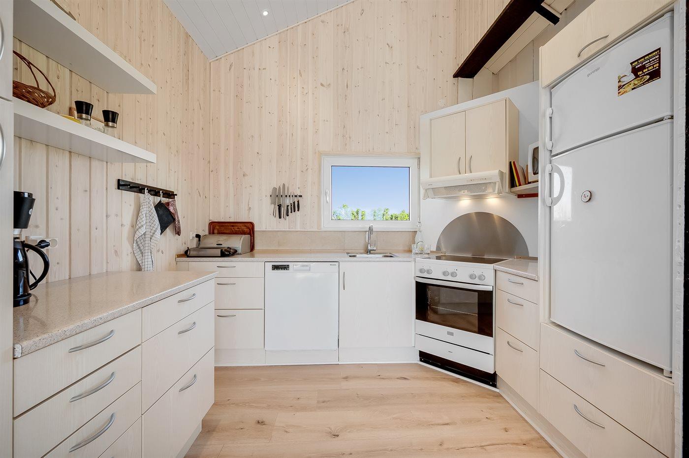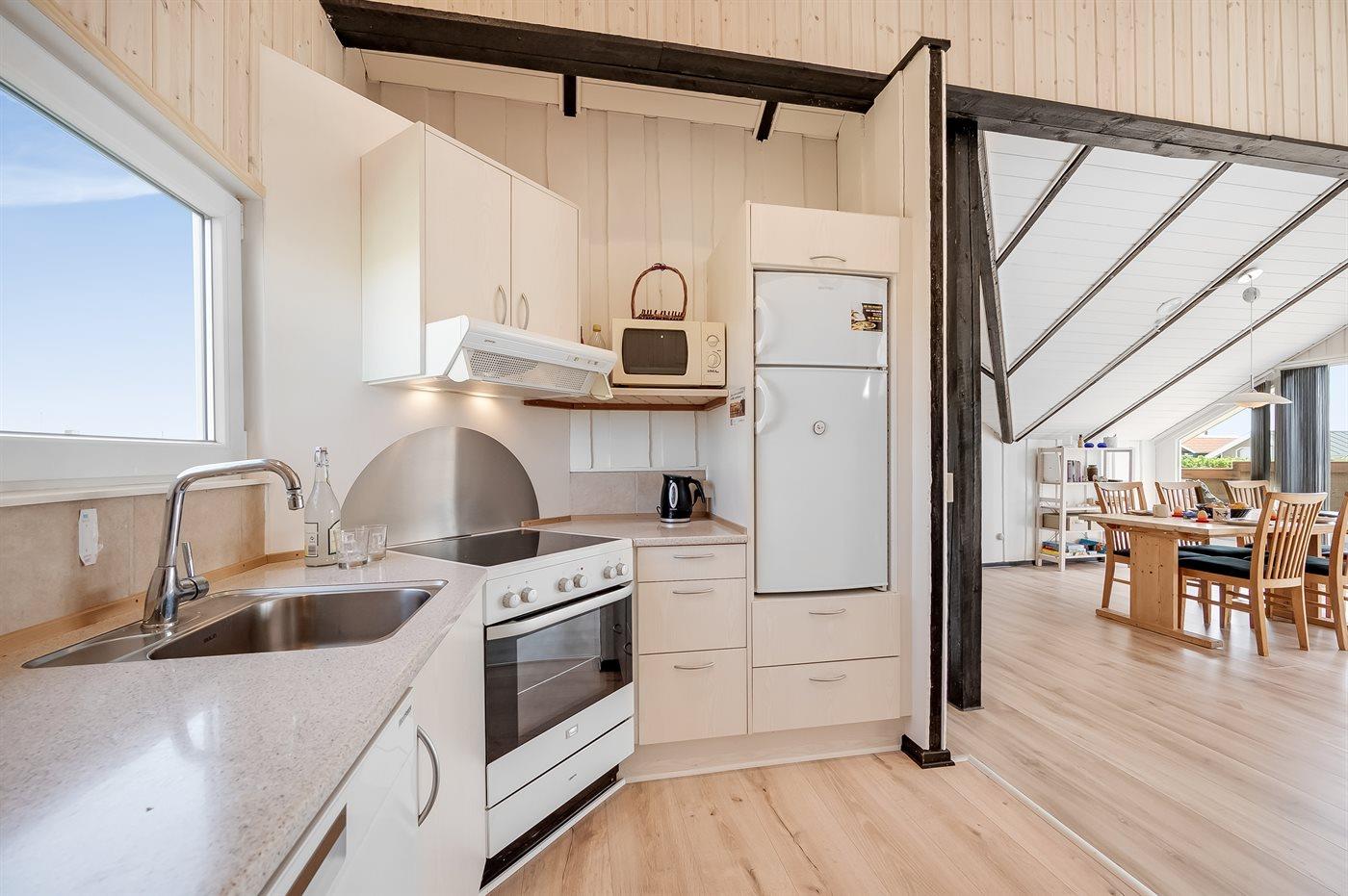 Køkkenet er udstyret med 1 køleskab. Der er 4 keramiske kogeplader, varmluftovn, mikrobølgeovn samt opvaskemaskine.