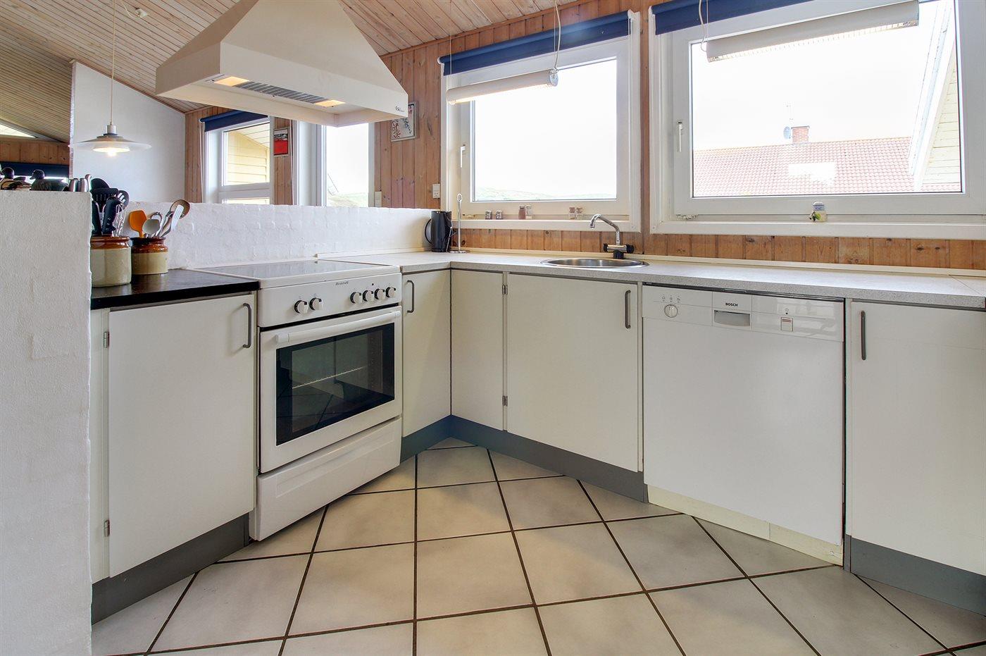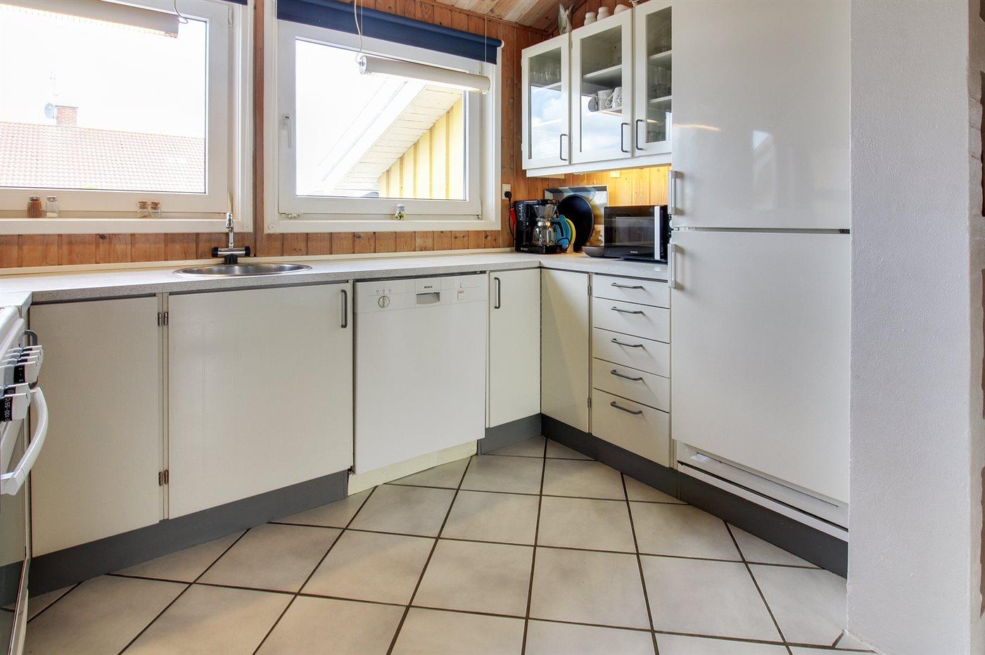 Køkkenet er udstyret med 1 køleskab. Der er 4 keramiske kogeplader, varmluftovn, mikrobølgeovn samt opvaskemaskine.