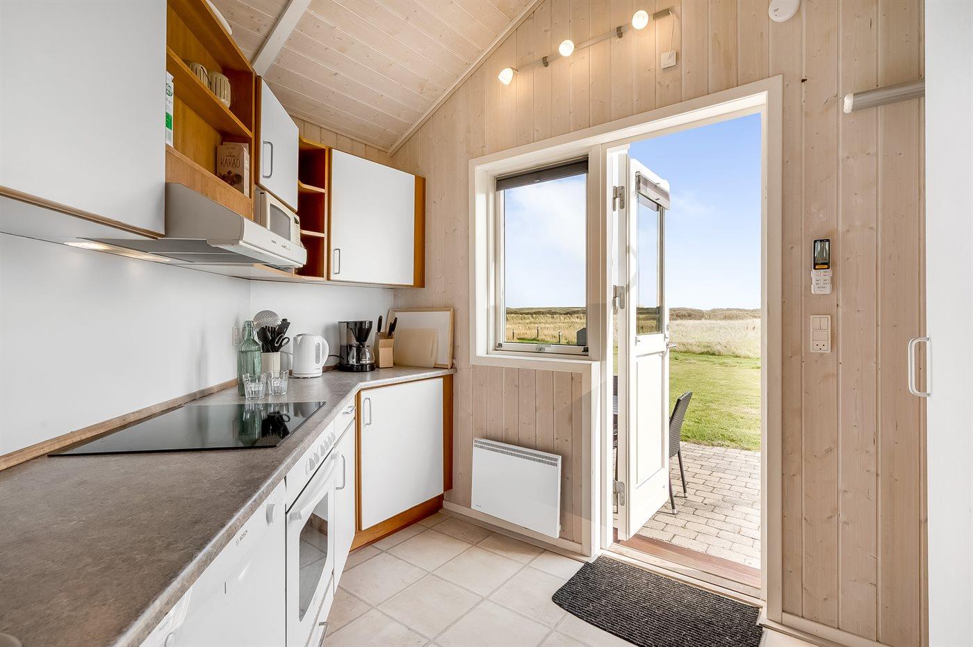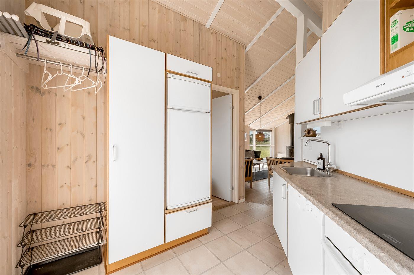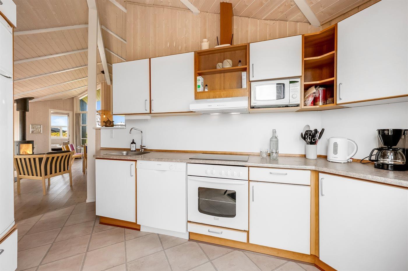 Køkkenet er udstyret med 1 køleskab. Der er 4 keramiske kogeplader, varmluftovn, mikrobølgeovn samt opvaskemaskine.