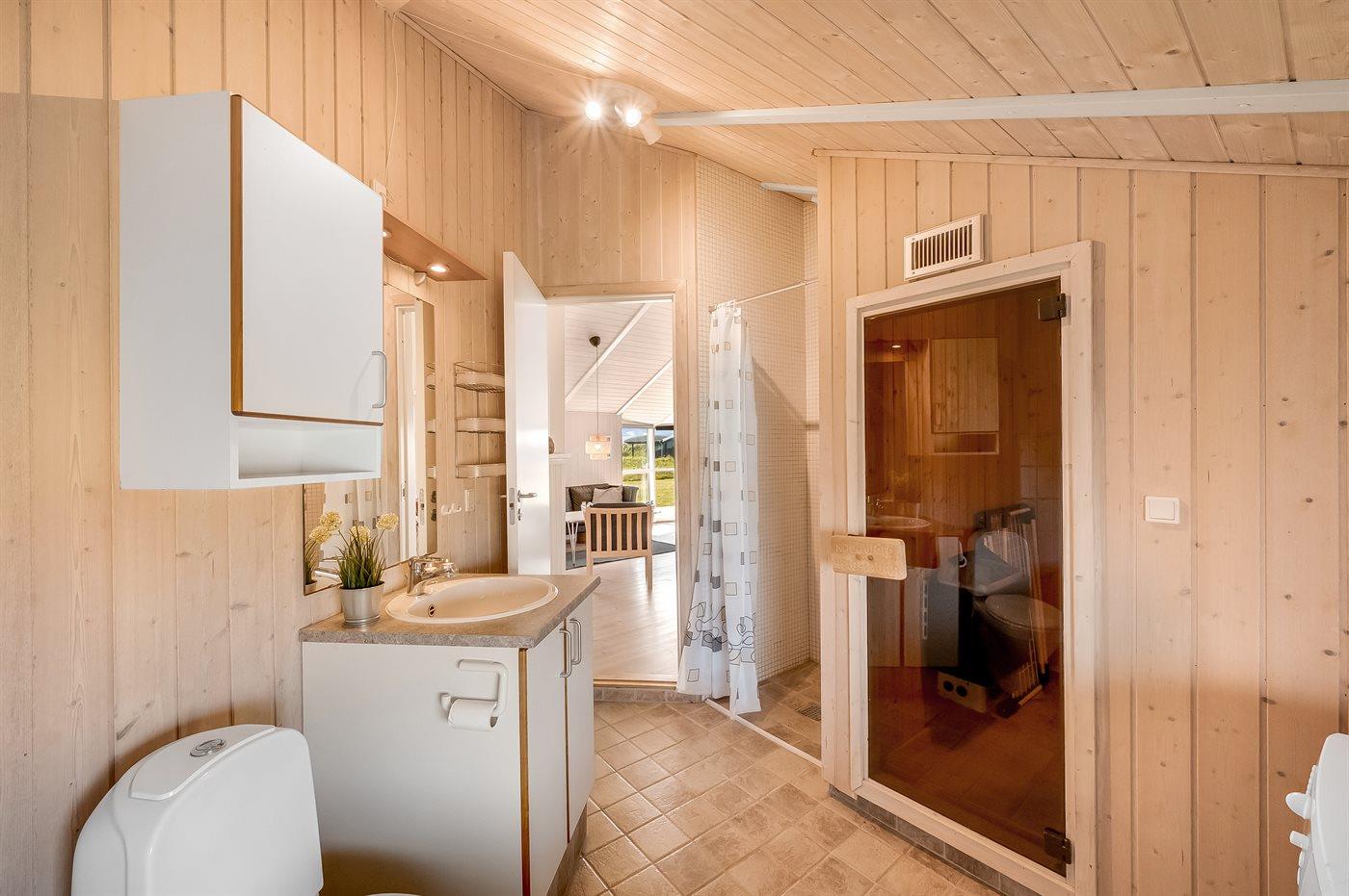 Der er 1 badeværelse med bruseniche og 1 toilet.. Der er gulvvarme på 1 badeværelse. I saunaen er der mulighed for afslapning.