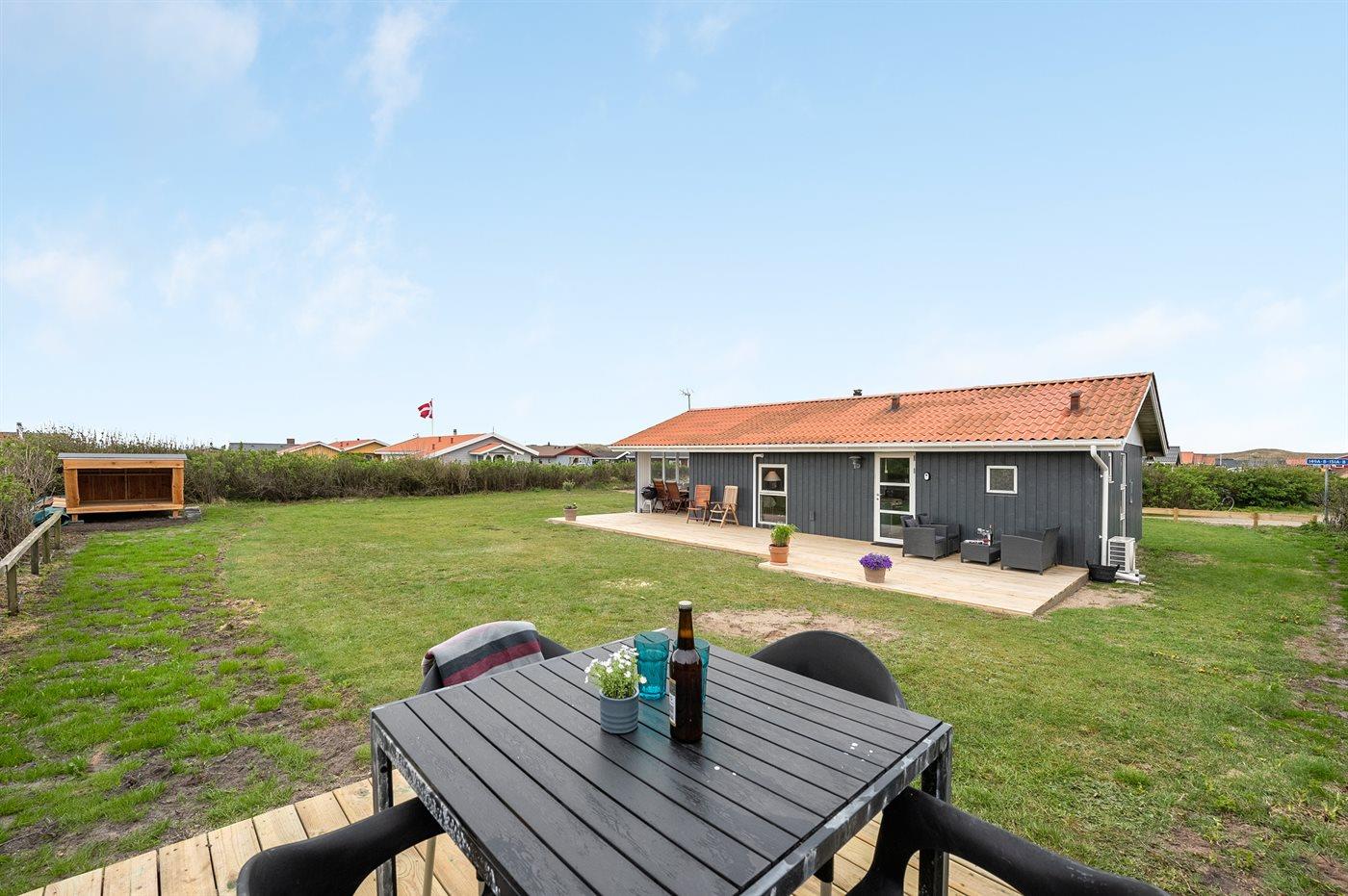 Hyggeligt sommerhus tæt på Vesterhavet med stor terrasse og legeplads for hele familien.