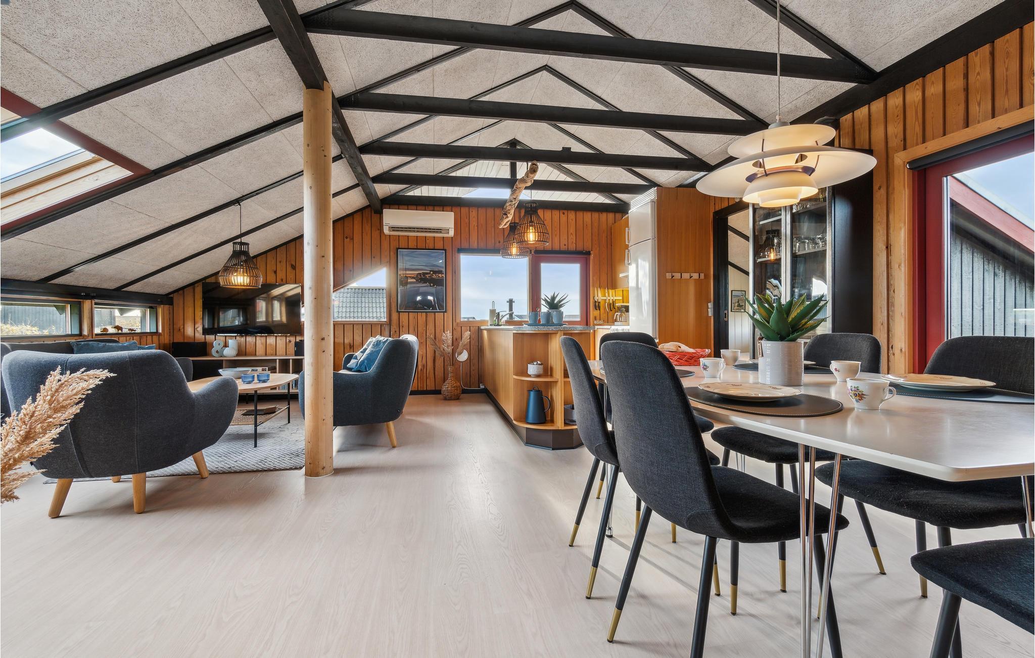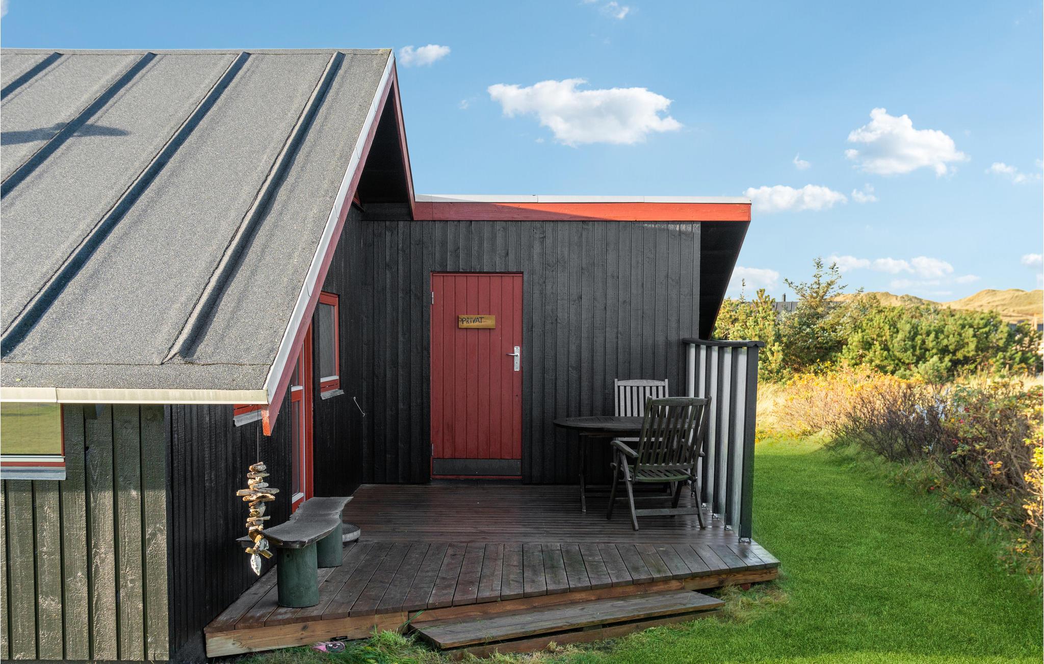 Velkommen til dette dejlige hus, som byder velkommen i et smukt klitlandskab i kort afstand til søen. Det mørke træ og de sorte bjælker danner sammen med den behagelige indretning en varm atmosfære, det rigtige sted at slappe af med familien. Uanset om I laver mad og spiser sammen eller sludrer tilbagelænet i sofaerne, kan I nyde jeres tid sammen i fulde drag. Det bliver endnu hyggeligere, når I tænder op i brændeovnen. I kan nyde solen på terrassen og glæde hele familien med lækre grillretter om aftenen. En aftengåtur til søen er en dejlig måde at runde en herlig feriedag af på.