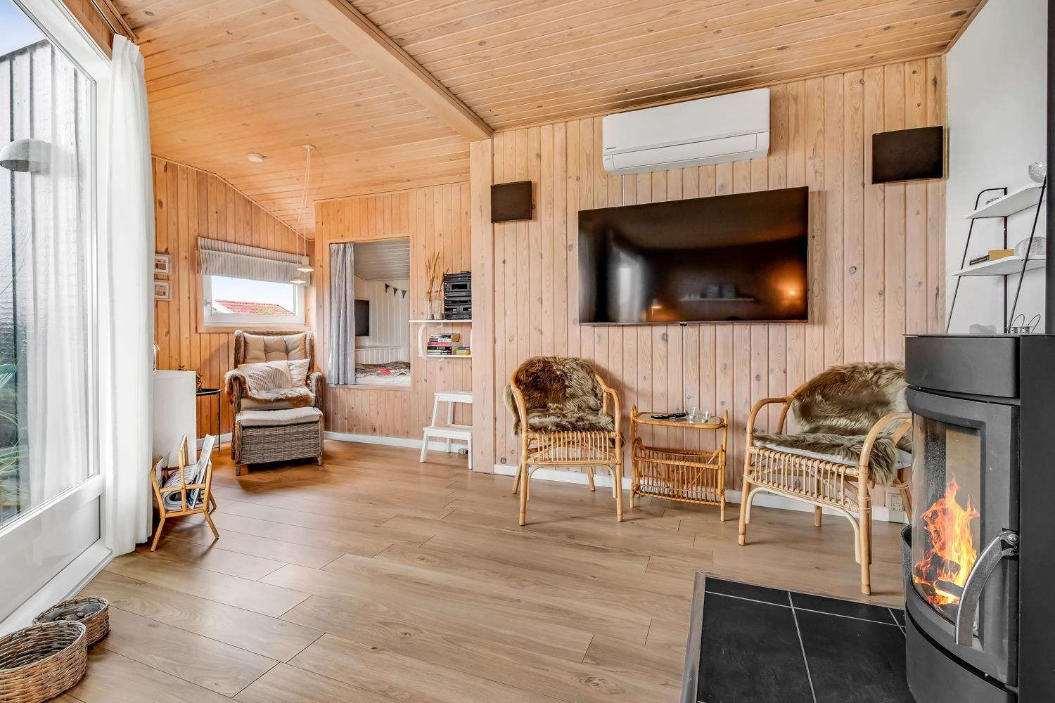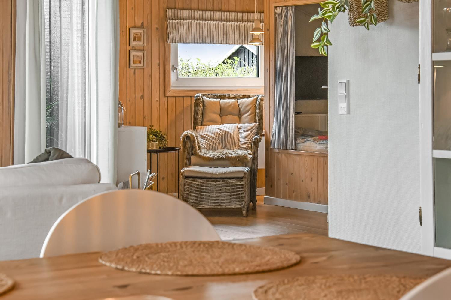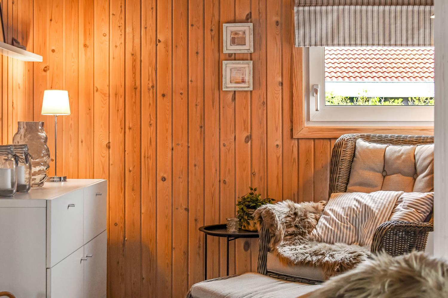 Huset er klassisk indrettet med den ene del af huset som et samlet rum af køkken og stue og resten af huset har badeværelse og soveværelser. Køkkenet har glaskeramisk komfur, mikrobølgeovn og køle-fryseskab. Hertil er der også en opvaskemaskine, som giver ekstra tid med sine gæster eller familien. Stuen har både sofagruppe, sofabord og spisebord. Slap af foran den knitrende brændeovn som sammen med varmepumpen hjælper med at reducere udgiften til varmeregningen. Her er også en fladskærm med både tysk og dansk tv - blandt andet TV, samt CD-afspiller, i stuen er der også en alkove med plads til 2 personer. Badeværelset byder på håndvask, bruser, toilet, gulvvarme og vaskemaskine samt adgang til sauna. Der er 3 soveværelser hvoraf 2 er med dobbeltsenge og en med 1 køjeseng.