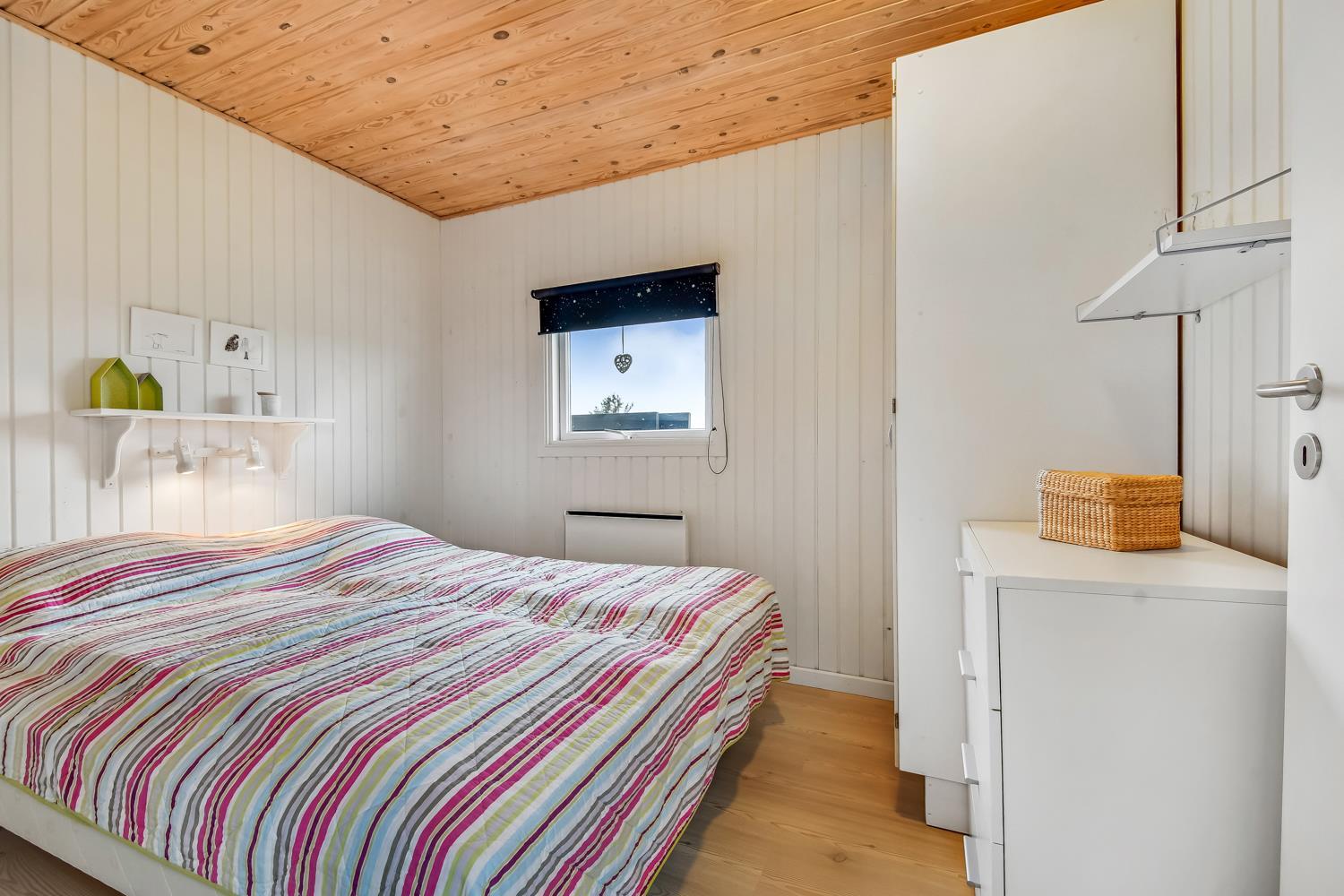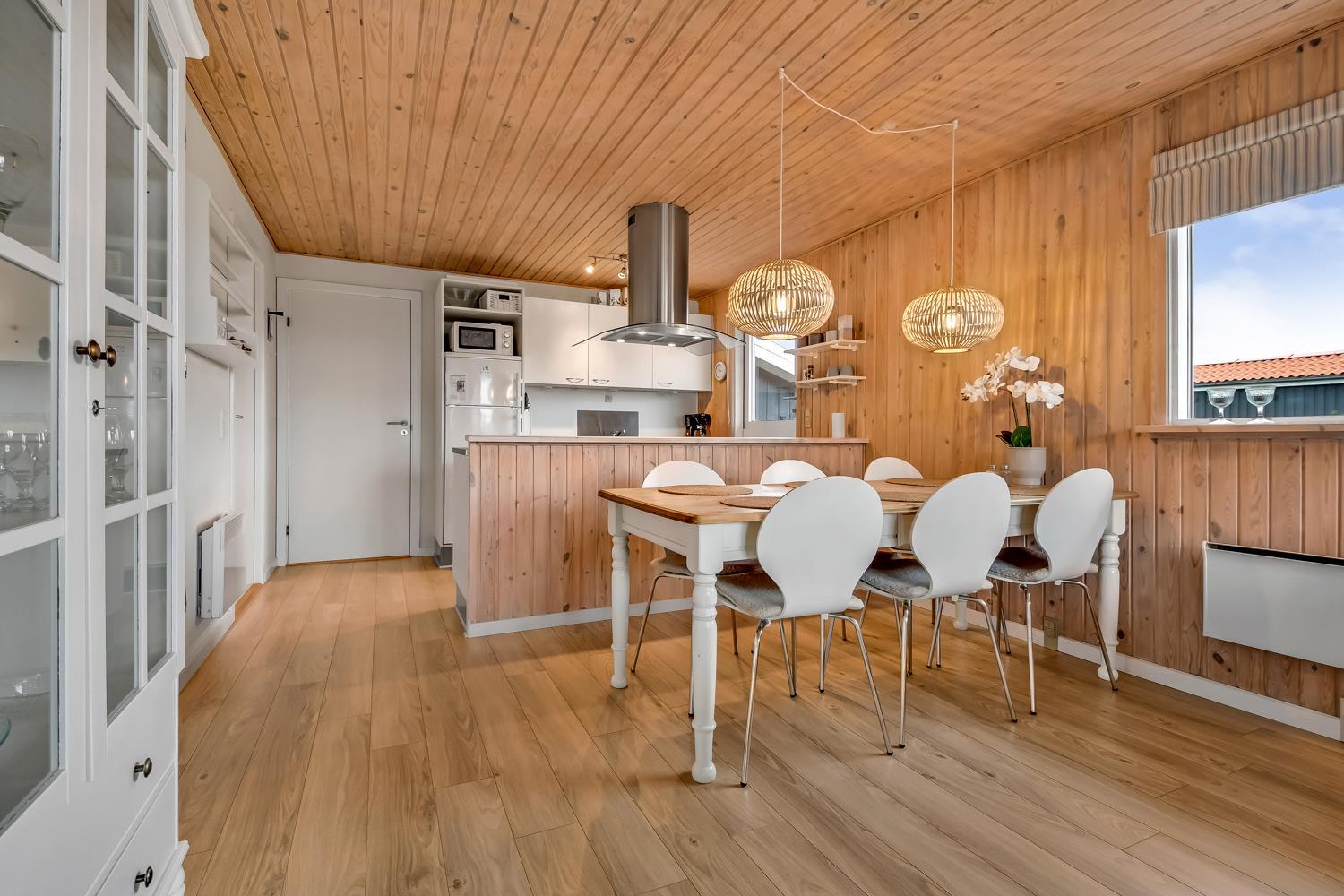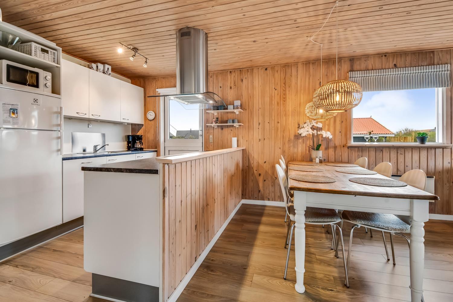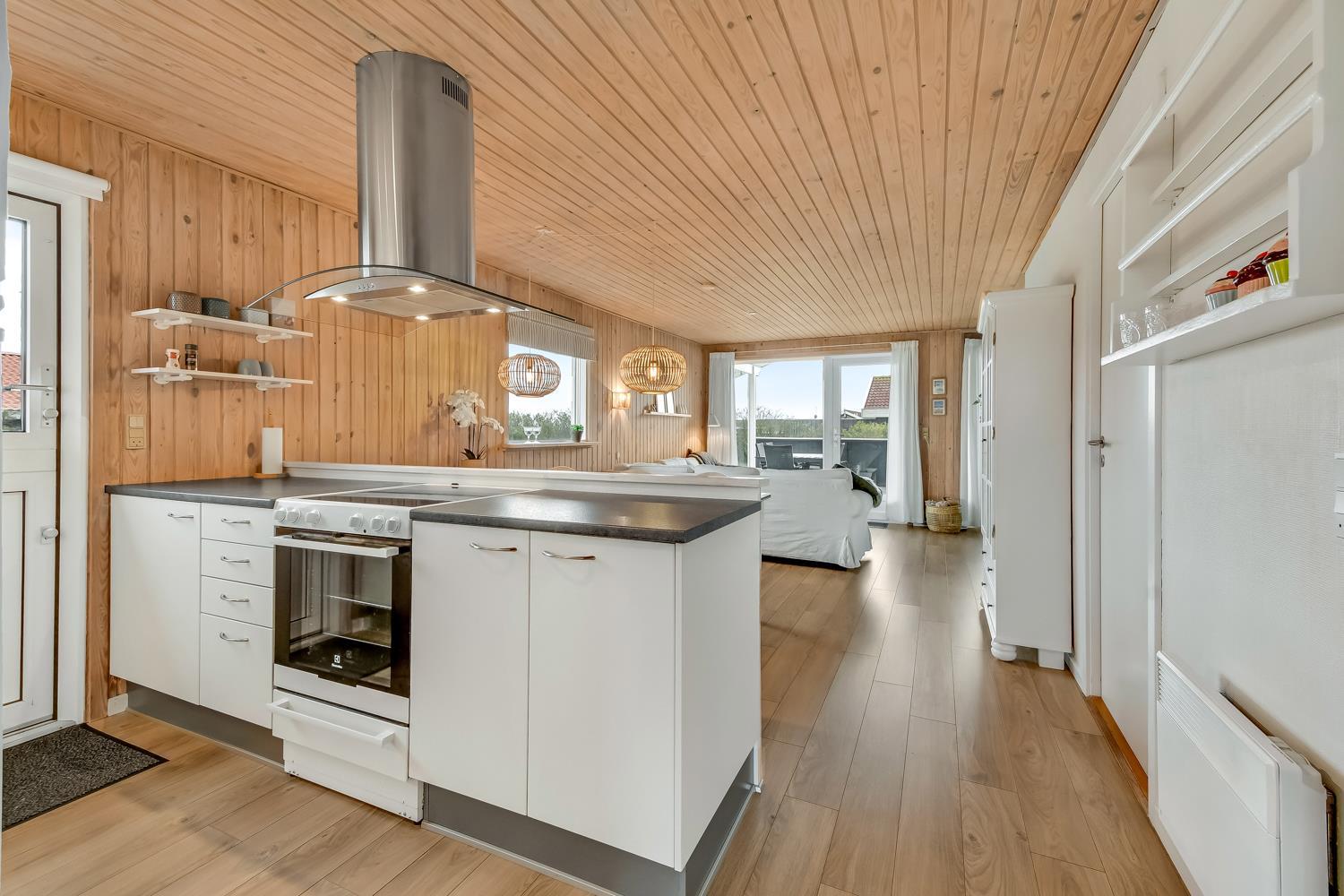 Huset er klassisk indrettet med den ene del af huset som et samlet rum af køkken og stue og resten af huset har badeværelse og soveværelser. Køkkenet har glaskeramisk komfur, mikrobølgeovn og køle-fryseskab. Hertil er der også en opvaskemaskine, som giver ekstra tid med sine gæster eller familien. Stuen har både sofagruppe, sofabord og spisebord. Slap af foran den knitrende brændeovn som sammen med varmepumpen hjælper med at reducere udgiften til varmeregningen. Her er også en fladskærm med både tysk og dansk tv - blandt andet TV, samt CD-afspiller, i stuen er der også en alkove med plads til 2 personer. Badeværelset byder på håndvask, bruser, toilet, gulvvarme og vaskemaskine samt adgang til sauna. Der er 3 soveværelser hvoraf 2 er med dobbeltsenge og en med 1 køjeseng.