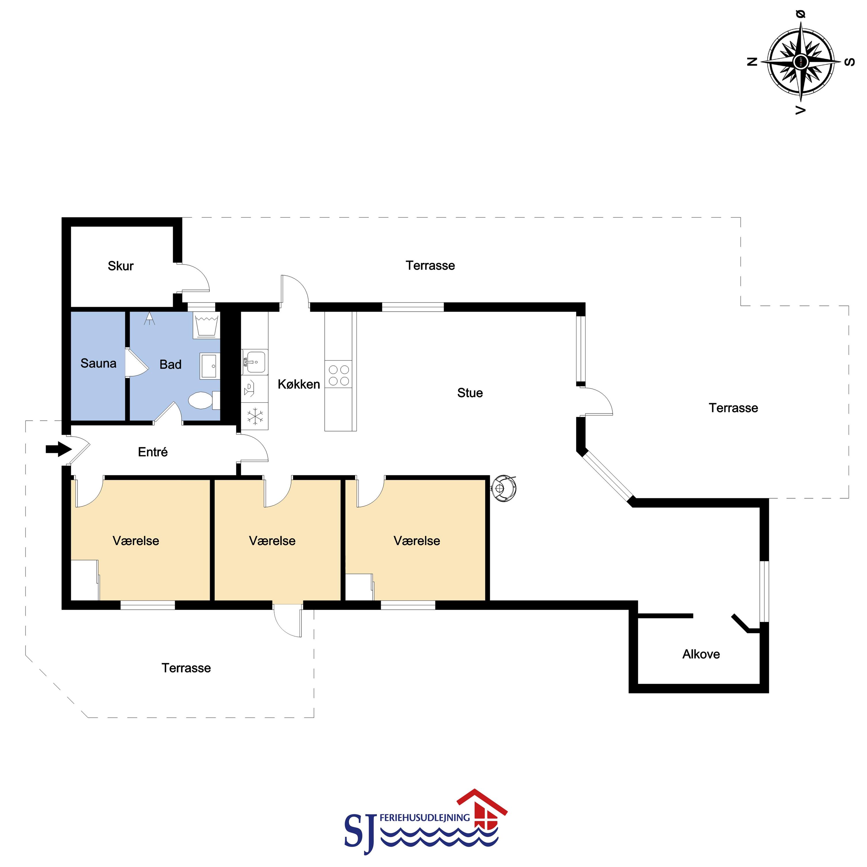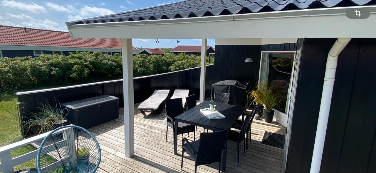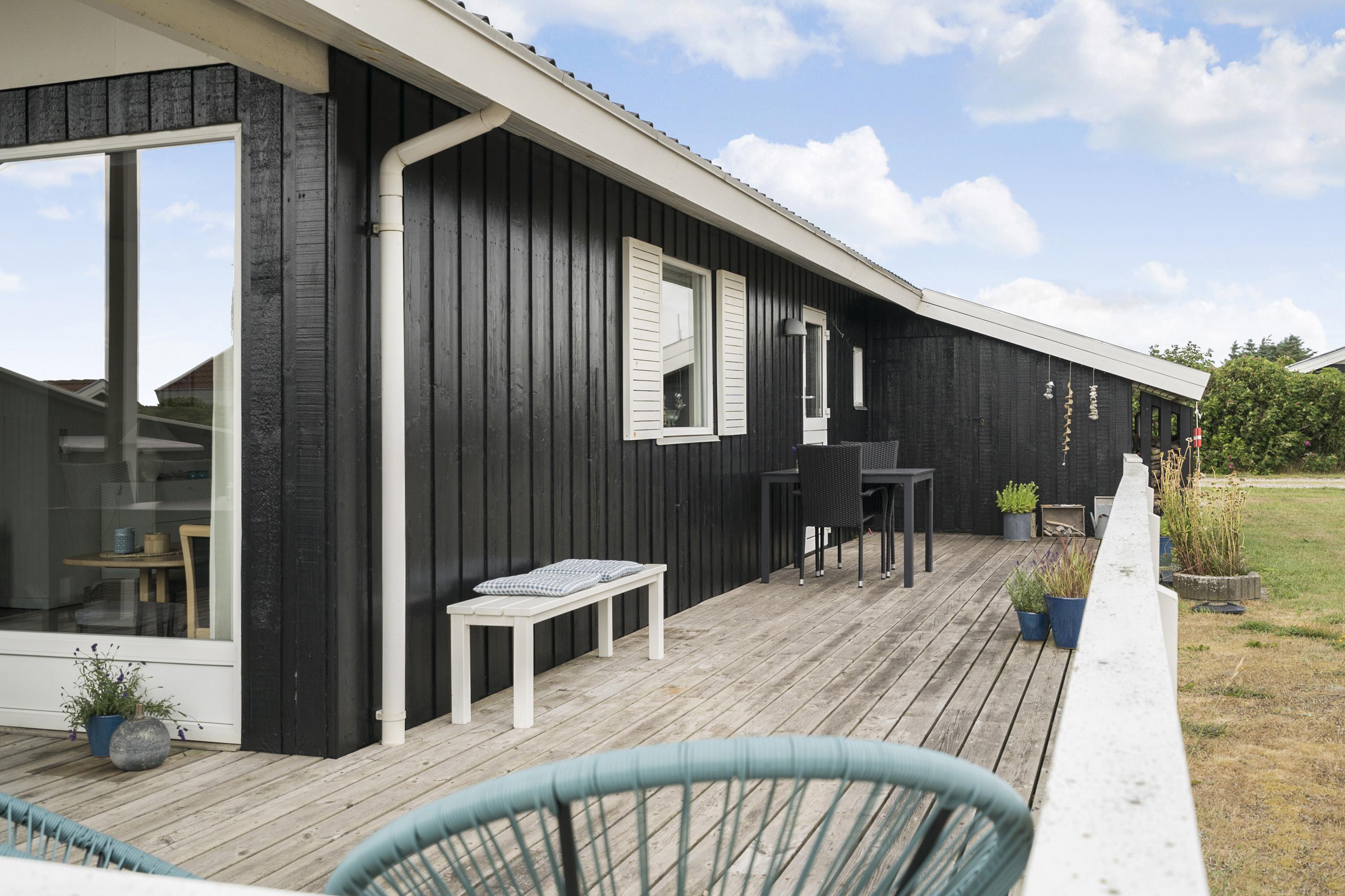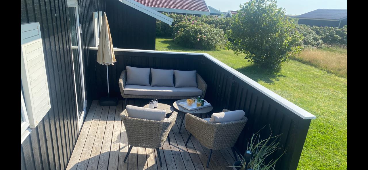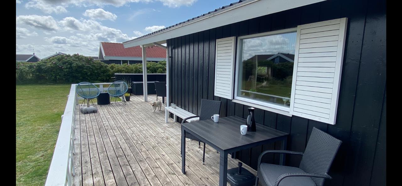 Fra stue og køkkenrummet er der 2 udgange til terrasseanlægget. Terrassen har både havemøbler, grill og 2 solvogne, så her er udstyret i orden til mange hyggelige afslappende timer. Der er kun 300 meter til Vejlby Torv med købmanden og Cafe John Wayne, så dette gør kun ferien endnu mere komfortabel. Vejlby Klit er omgivet af vand på begge sider med Vesterhavet mod vest som altid er et besøg værd. Her kan man bade, lave sandslotte, fiske, flyve med drage eller ganske enkelt blot gå een lang tur og nyde ensomheden eller familiens nærvær. Det samme gælder iøvrigt den tætte beliggenhed til Ferring Sø hvor der går en vandrerute rundt om.
