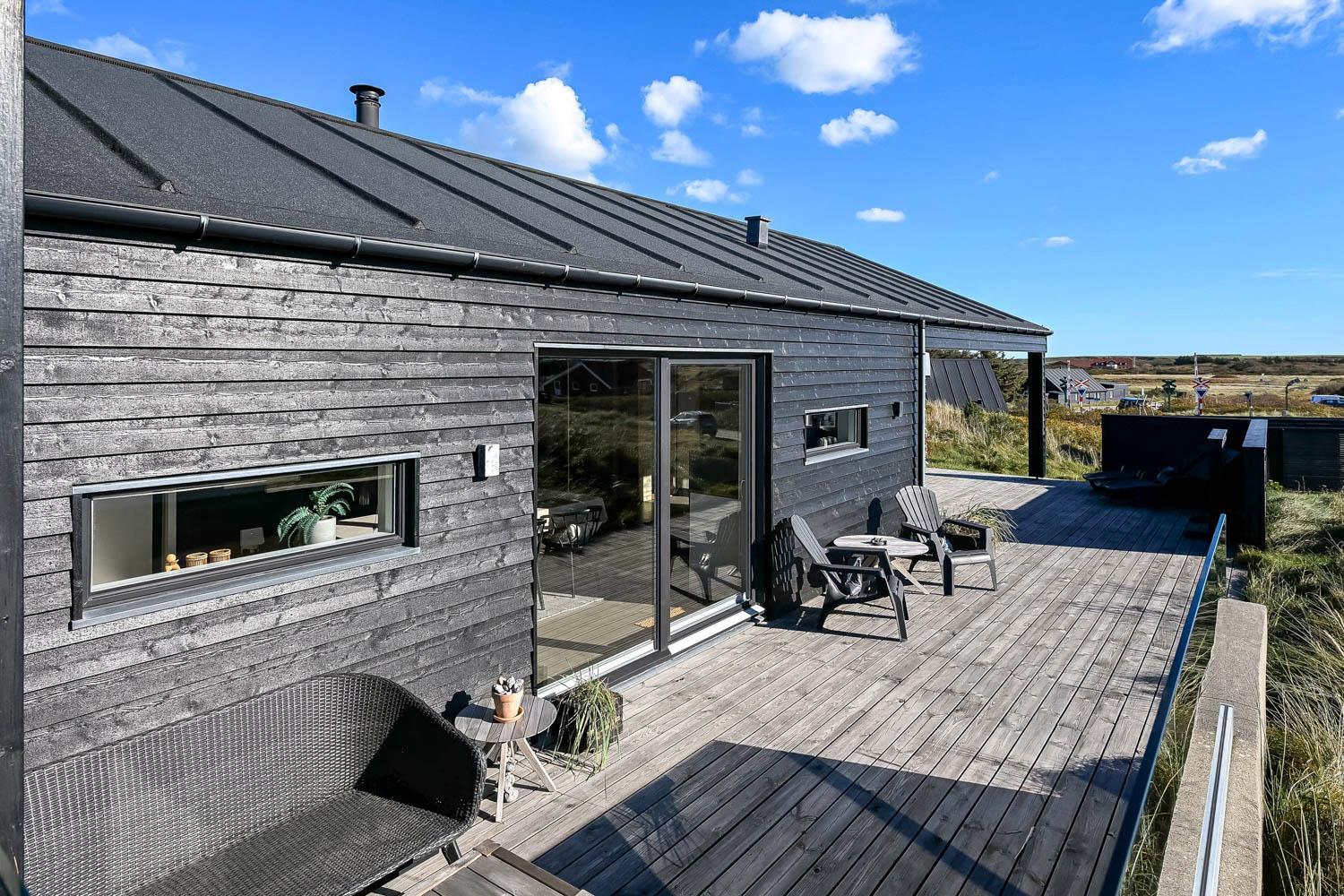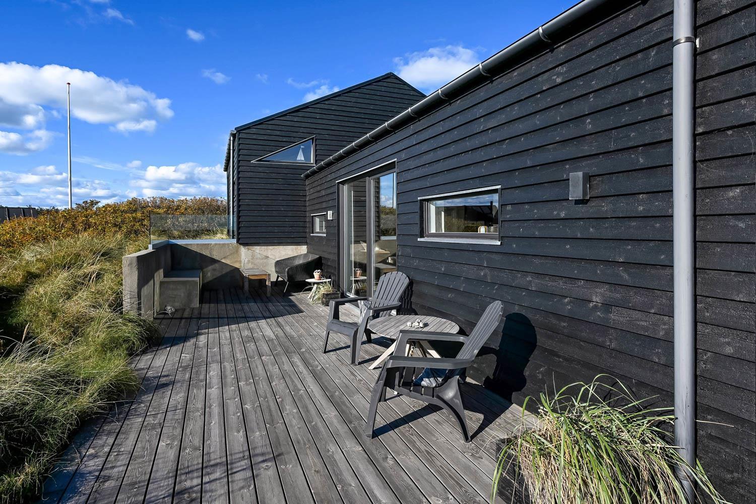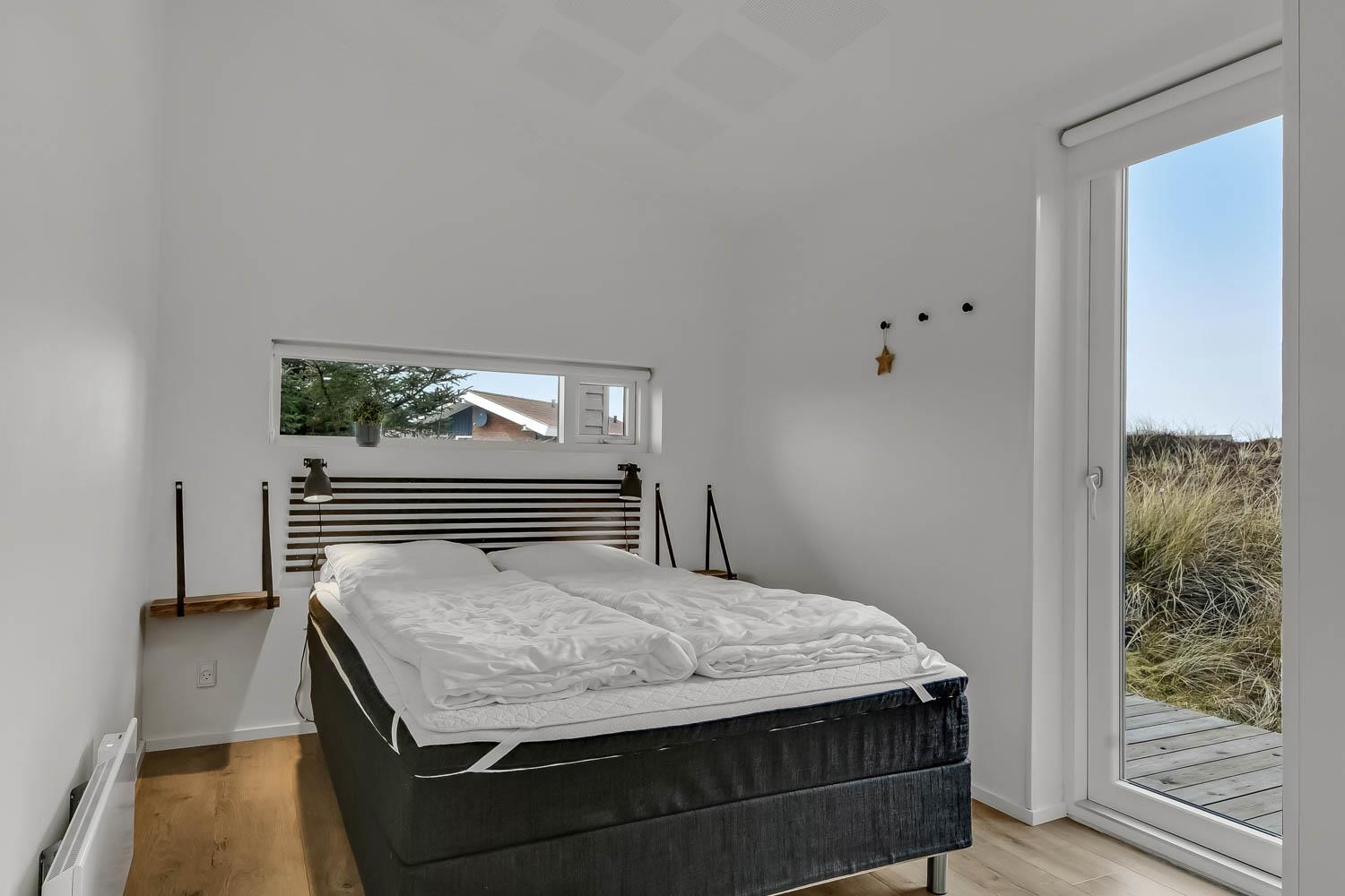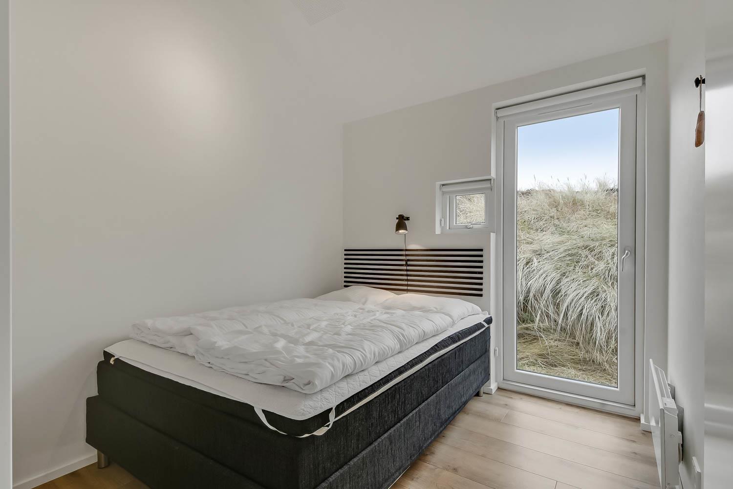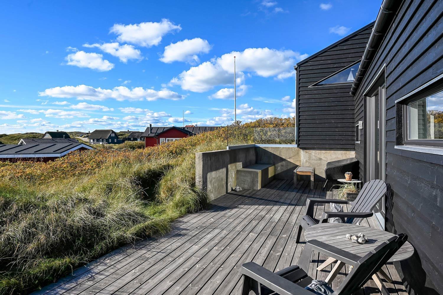 På en 2500 m2 dejlig, kuperet naturgrund med en fantastisk udsigt til klitterne, og kun 200 m fra Vesterhavet, ligger dette pragtfulde feriehus på 125 m2 + redskabsrum. Huset er minimalistisk i sit udtryk og praktisk indrettet. En flot entrè byder velkommen indeholdende skabe samt vaskemaskine og tørretumbler. Køkken alrummet er med loft til kip og betongulv. Her findes der en brændeovn, og køkkenet indeholder opvaskemaskine, keramisk kogeplade, ovn, køl og frys samt vinkøleskab. Fra køkken alrummet er der en opgang til opholdsstuen, hvor der ligeledes er loft til kip samt parketgulv. Heroppe findes der er et fladskærms-TV med danske og tyske kanaler samt chromecast. Chromecast gør det muligt via mobiltelefonen eller tablet at se film eller streaming på fladskærmen. Herudover er der en bluetooth-højtaler som også gør det muligt at høre radio eller musik via egen mobiltelefon. Huset indeholder stort badeværelse med toilet, håndvask, spa, sauna, bruseniche og gulvvarme samt udgang til ugeneret udendørsbruser et plus når man lige kommer fra stranden. Der er et mindre badeværelse med bruseniche toilet, håndvask og gulvvarme. Huset har 3 fine soveværelser med parketgulve og skabe (1DS, 1DS,, 1DS). Der er gratis trådløs internetadgang. Der findes varmeluftpumpe, som reducerer varmeforbruget. Rygning eller husdyr er ikke tilladt.