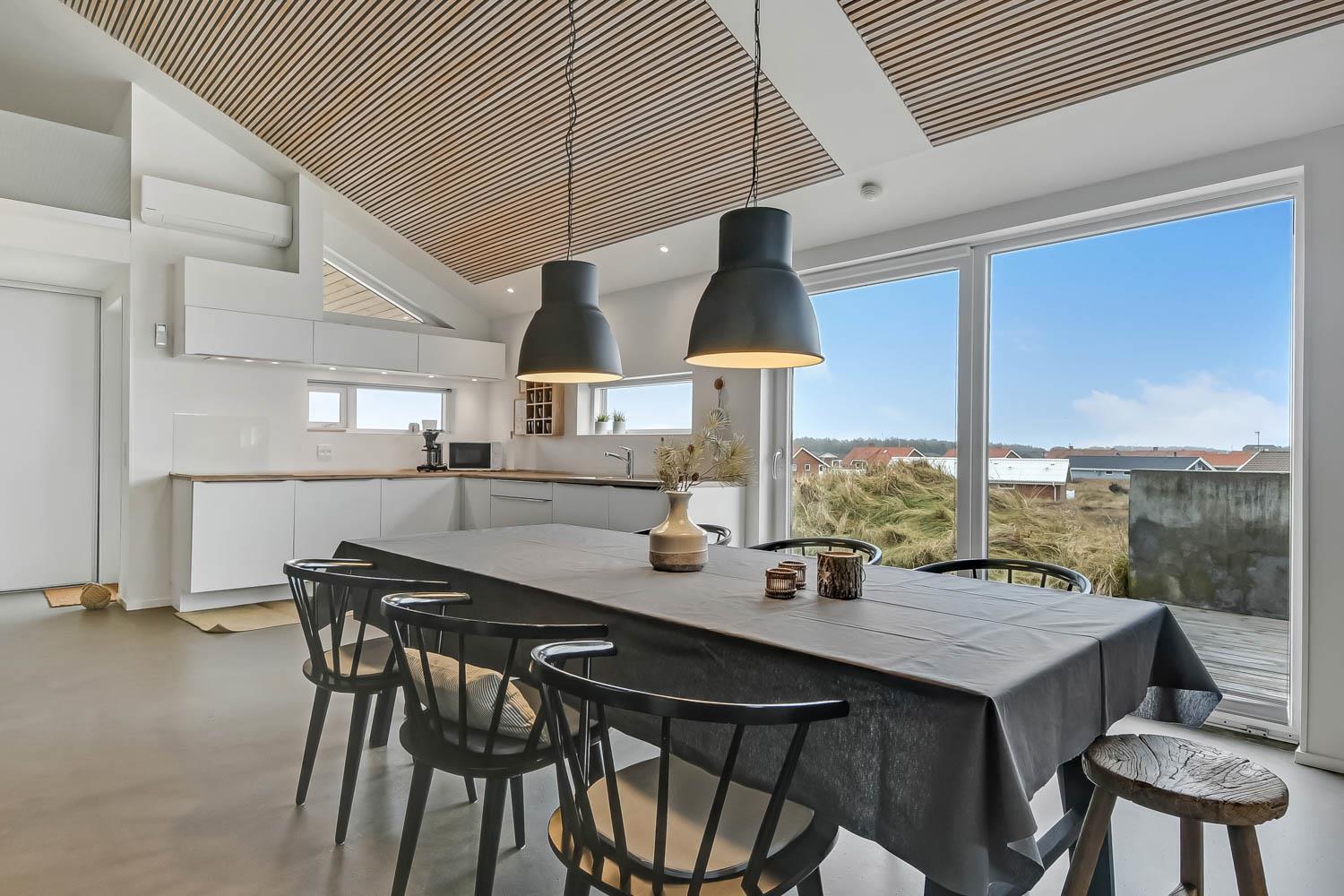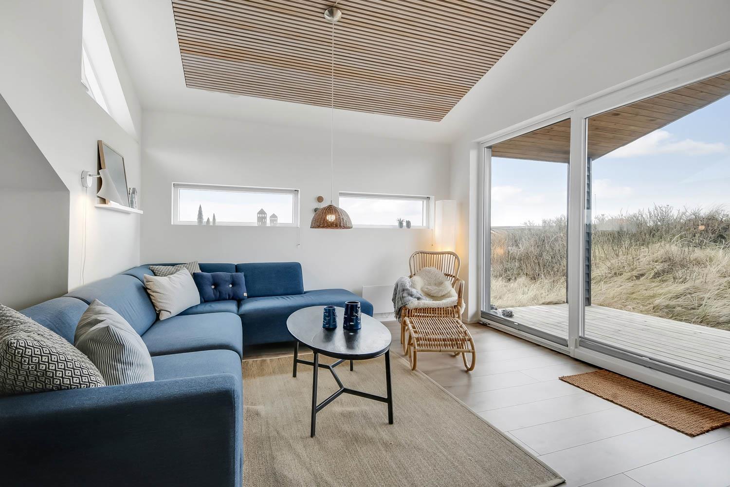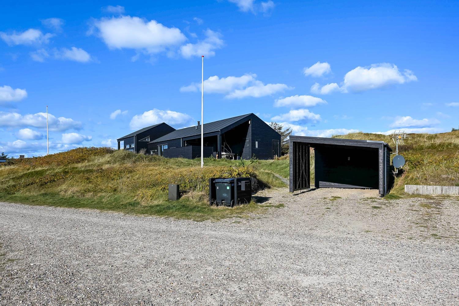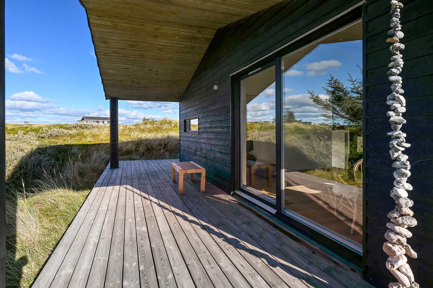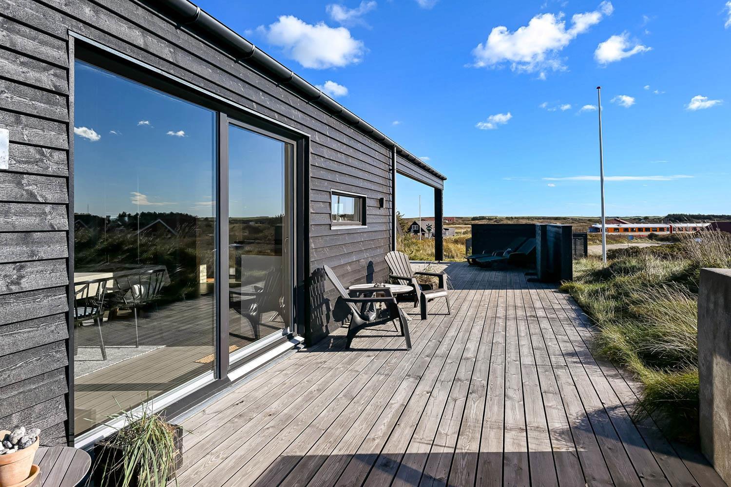 På en 2500 m2 dejlig, kuperet naturgrund med en fantastisk udsigt til klitterne, og kun 200 m fra Vesterhavet, ligger dette pragtfulde feriehus på 125 m2 + redskabsrum. Huset er minimalistisk i sit udtryk og praktisk indrettet. En flot entrè byder velkommen indeholdende skabe samt vaskemaskine og tørretumbler. Køkken alrummet er med loft til kip og betongulv. Her findes der en brændeovn, og køkkenet indeholder opvaskemaskine, keramisk kogeplade, ovn, køl og frys samt vinkøleskab. Fra køkken alrummet er der en opgang til opholdsstuen, hvor der ligeledes er loft til kip samt parketgulv. Heroppe findes der er et fladskærms-TV med danske og tyske kanaler samt chromecast. Chromecast gør det muligt via mobiltelefonen eller tablet at se film eller streaming på fladskærmen. Herudover er der en bluetooth-højtaler som også gør det muligt at høre radio eller musik via egen mobiltelefon. Huset indeholder stort badeværelse med toilet, håndvask, spa, sauna, bruseniche og gulvvarme samt udgang til ugeneret udendørsbruser et plus når man lige kommer fra stranden. Der er et mindre badeværelse med bruseniche toilet, håndvask og gulvvarme. Huset har 3 fine soveværelser med parketgulve og skabe (1DS, 1DS,, 1DS). Der er gratis trådløs internetadgang. Der findes varmeluftpumpe, som reducerer varmeforbruget. Rygning eller husdyr er ikke tilladt.