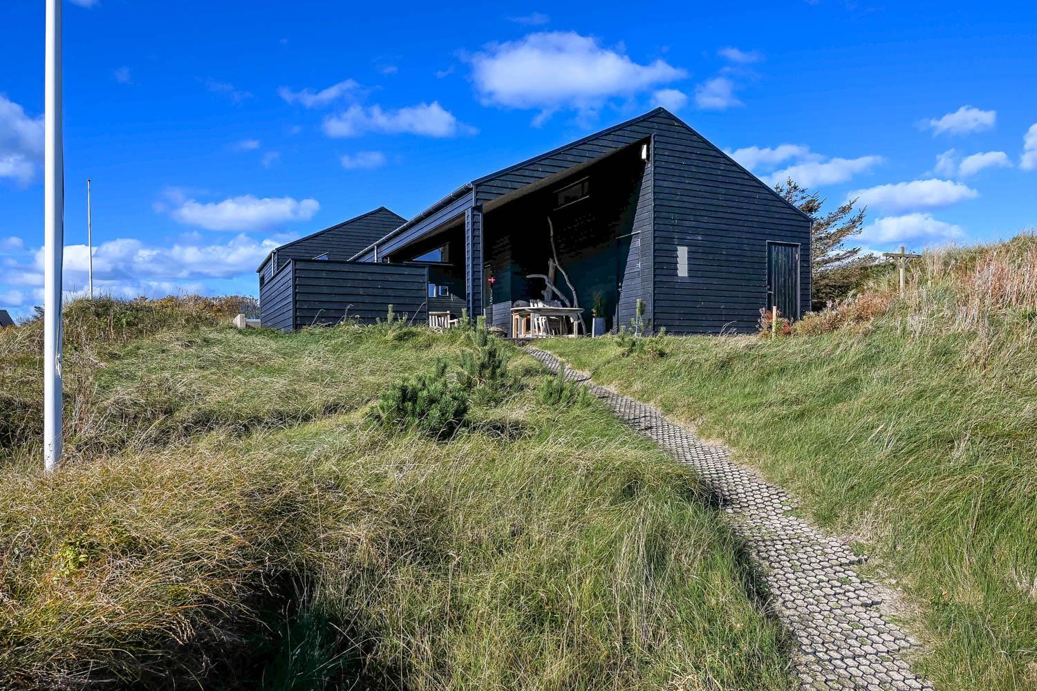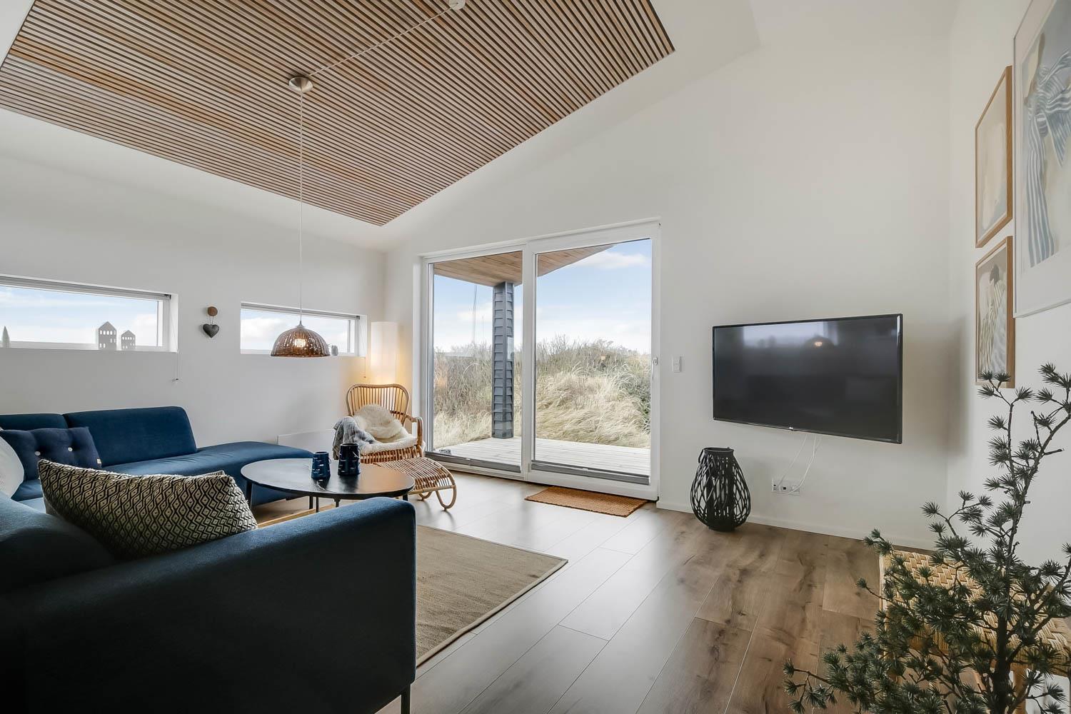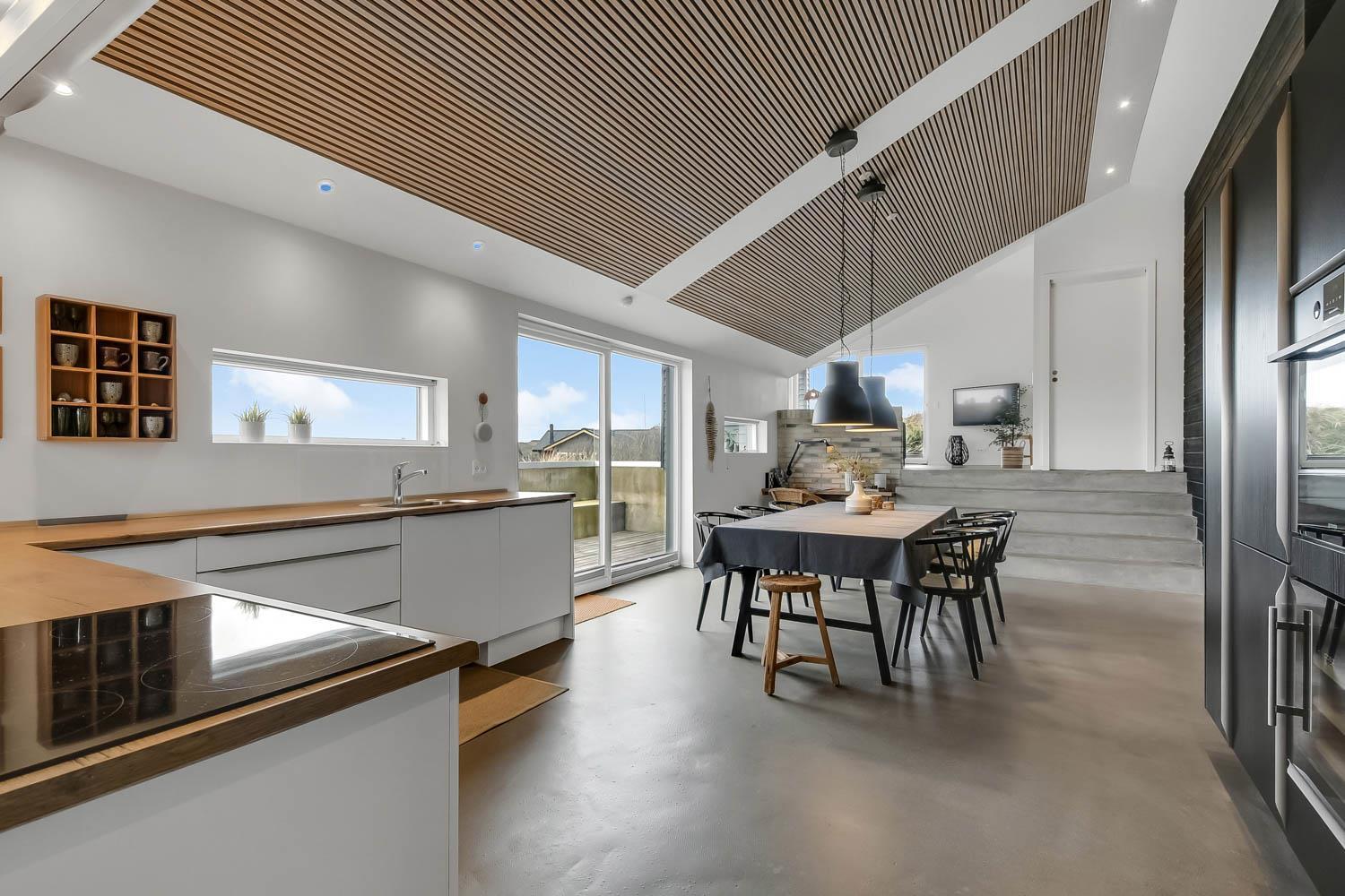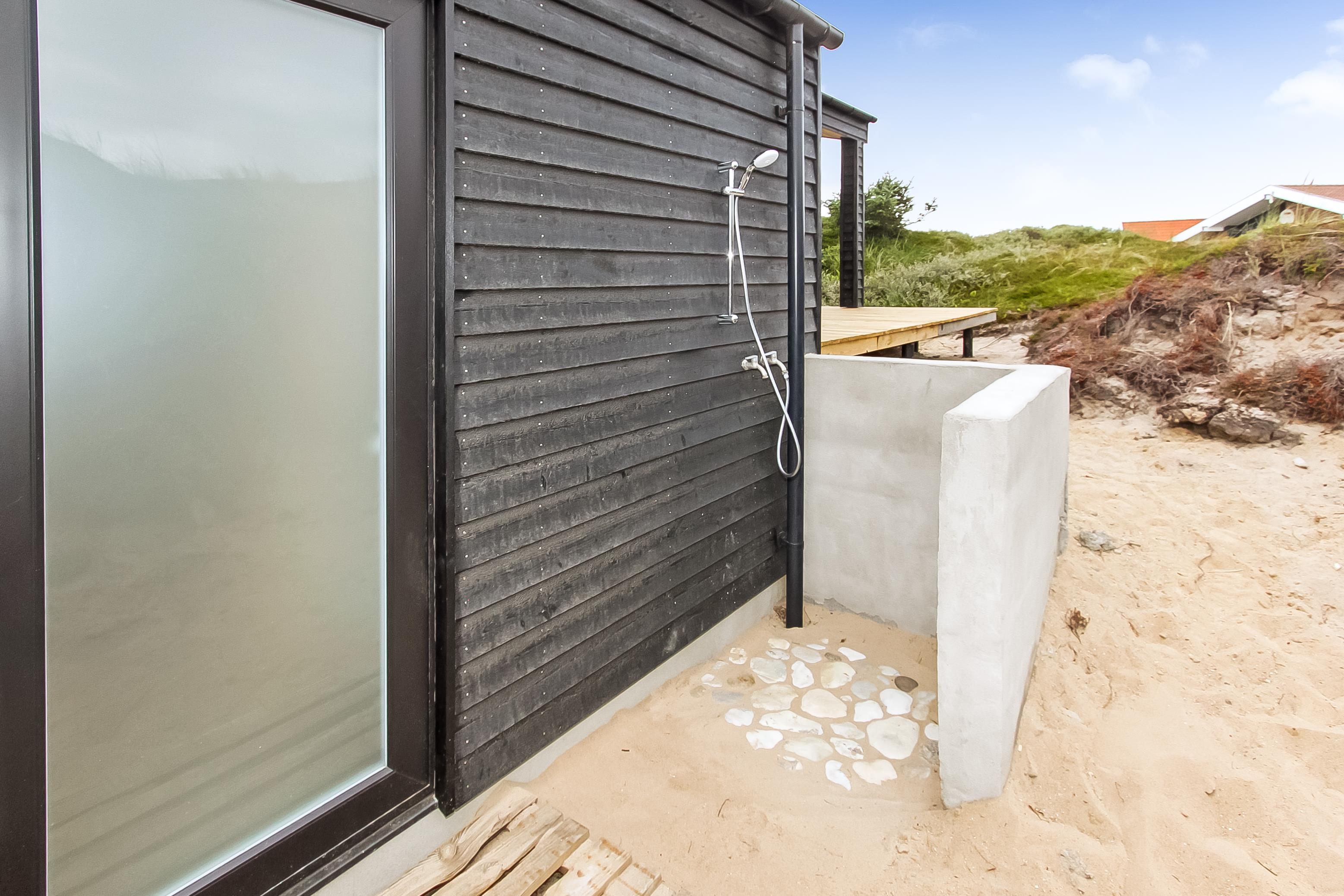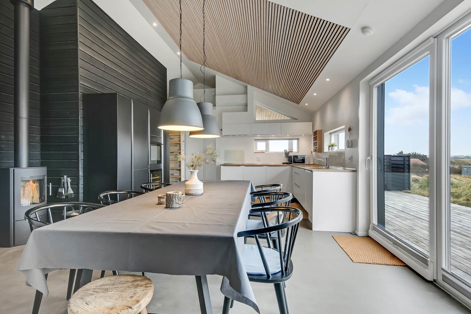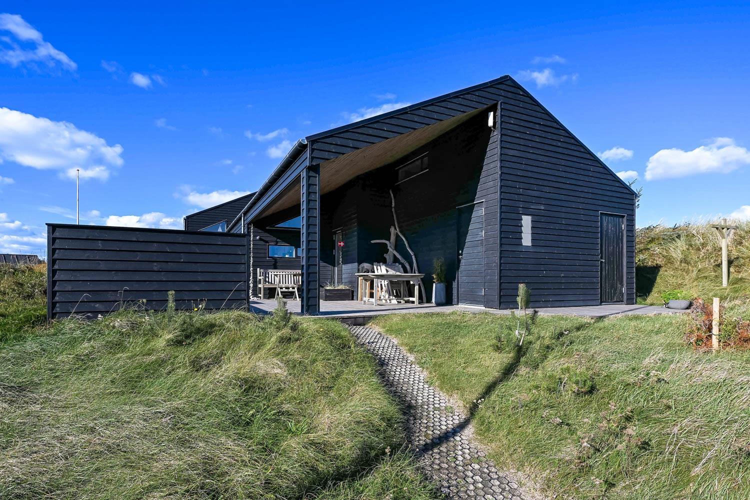 På en 2500 m2 dejlig, kuperet naturgrund med en fantastisk udsigt til klitterne, og kun 200 m fra Vesterhavet, ligger dette pragtfulde feriehus på 125 m2 + redskabsrum. Huset er minimalistisk i sit udtryk og praktisk indrettet. En flot entrè byder velkommen indeholdende skabe samt vaskemaskine og tørretumbler. Køkken alrummet er med loft til kip og betongulv. Her findes der en brændeovn, og køkkenet indeholder opvaskemaskine, keramisk kogeplade, ovn, køl og frys samt vinkøleskab. Fra køkken alrummet er der en opgang til opholdsstuen, hvor der ligeledes er loft til kip samt parketgulv. Heroppe findes der er et fladskærms-TV med danske og tyske kanaler samt chromecast. Chromecast gør det muligt via mobiltelefonen eller tablet at se film eller streaming på fladskærmen. Herudover er der en bluetooth-højtaler som også gør det muligt at høre radio eller musik via egen mobiltelefon. Huset indeholder stort badeværelse med toilet, håndvask, spa, sauna, bruseniche og gulvvarme samt udgang til ugeneret udendørsbruser et plus når man lige kommer fra stranden. Der er et mindre badeværelse med bruseniche toilet, håndvask og gulvvarme. Huset har 3 fine soveværelser med parketgulve og skabe (1DS, 1DS,, 1DS). Der er gratis trådløs internetadgang. Der findes varmeluftpumpe, som reducerer varmeforbruget. Rygning eller husdyr er ikke tilladt.