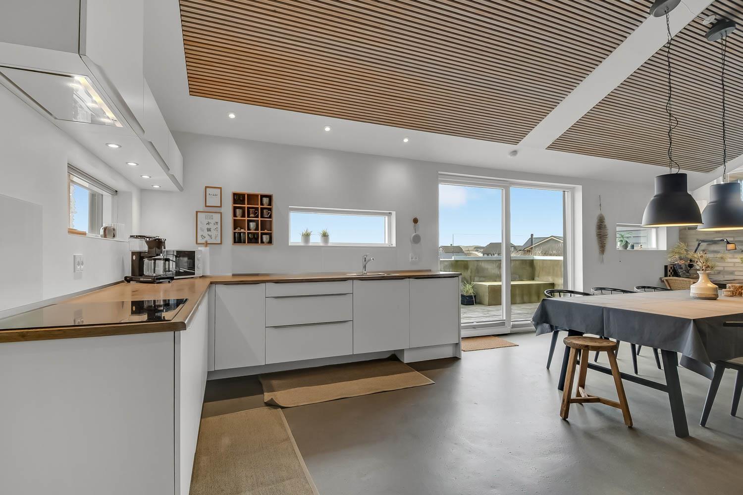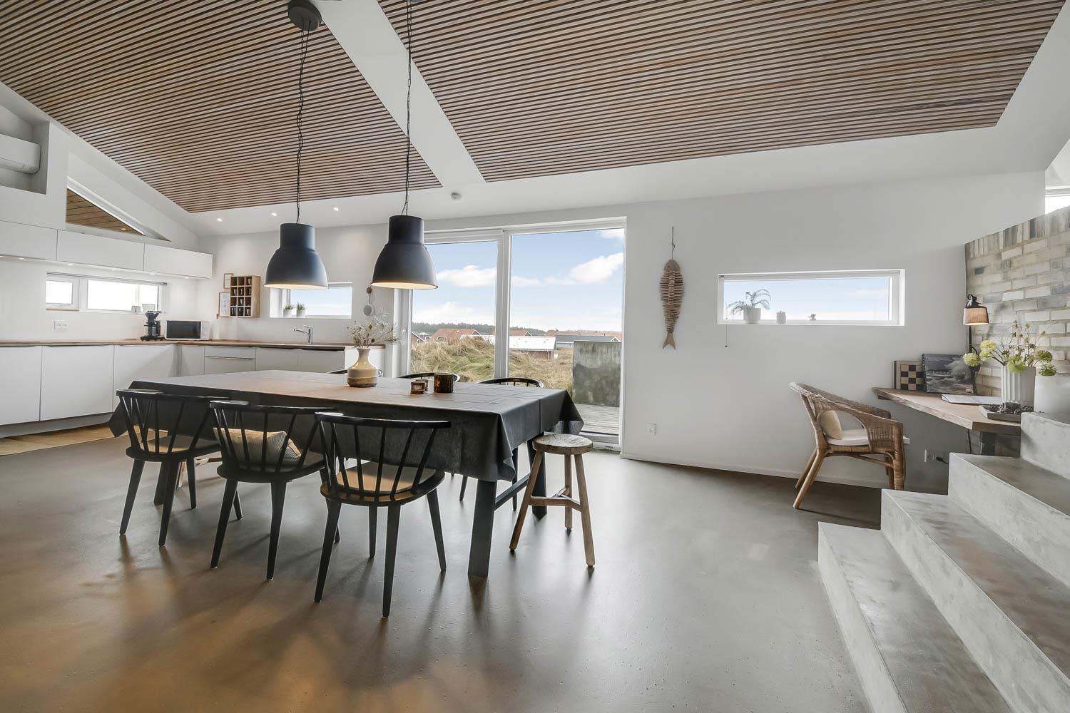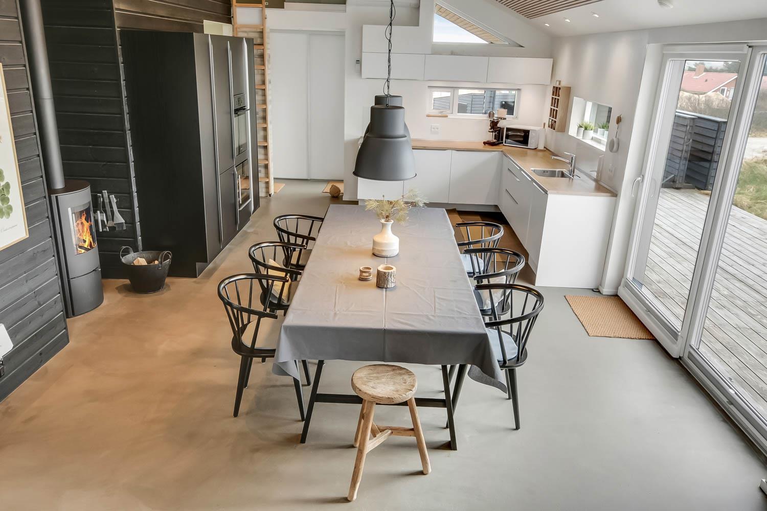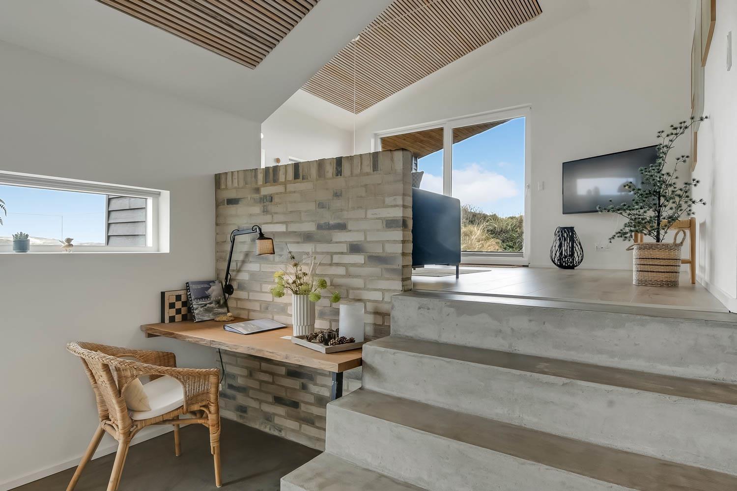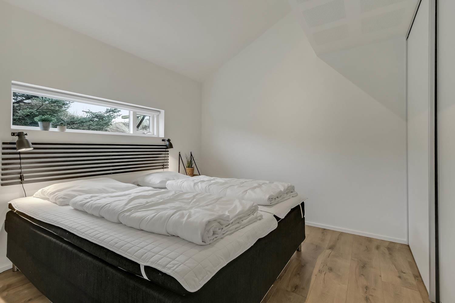 På en 2500 m2 dejlig, kuperet naturgrund med en fantastisk udsigt til klitterne, og kun 200 m fra Vesterhavet, ligger dette pragtfulde feriehus på 125 m2 + redskabsrum. Huset er minimalistisk i sit udtryk og praktisk indrettet. En flot entrè byder velkommen indeholdende skabe samt vaskemaskine og tørretumbler. Køkken alrummet er med loft til kip og betongulv. Her findes der en brændeovn, og køkkenet indeholder opvaskemaskine, keramisk kogeplade, ovn, køl og frys samt vinkøleskab. Fra køkken alrummet er der en opgang til opholdsstuen, hvor der ligeledes er loft til kip samt parketgulv. Heroppe findes der er et fladskærms-TV med danske og tyske kanaler samt chromecast. Chromecast gør det muligt via mobiltelefonen eller tablet at se film eller streaming på fladskærmen. Herudover er der en bluetooth-højtaler som også gør det muligt at høre radio eller musik via egen mobiltelefon. Huset indeholder stort badeværelse med toilet, håndvask, spa, sauna, bruseniche og gulvvarme samt udgang til ugeneret udendørsbruser et plus når man lige kommer fra stranden. Der er et mindre badeværelse med bruseniche toilet, håndvask og gulvvarme. Huset har 3 fine soveværelser med parketgulve og skabe (1DS, 1DS,, 1DS). Der er gratis trådløs internetadgang. Der findes varmeluftpumpe, som reducerer varmeforbruget. Rygning eller husdyr er ikke tilladt.