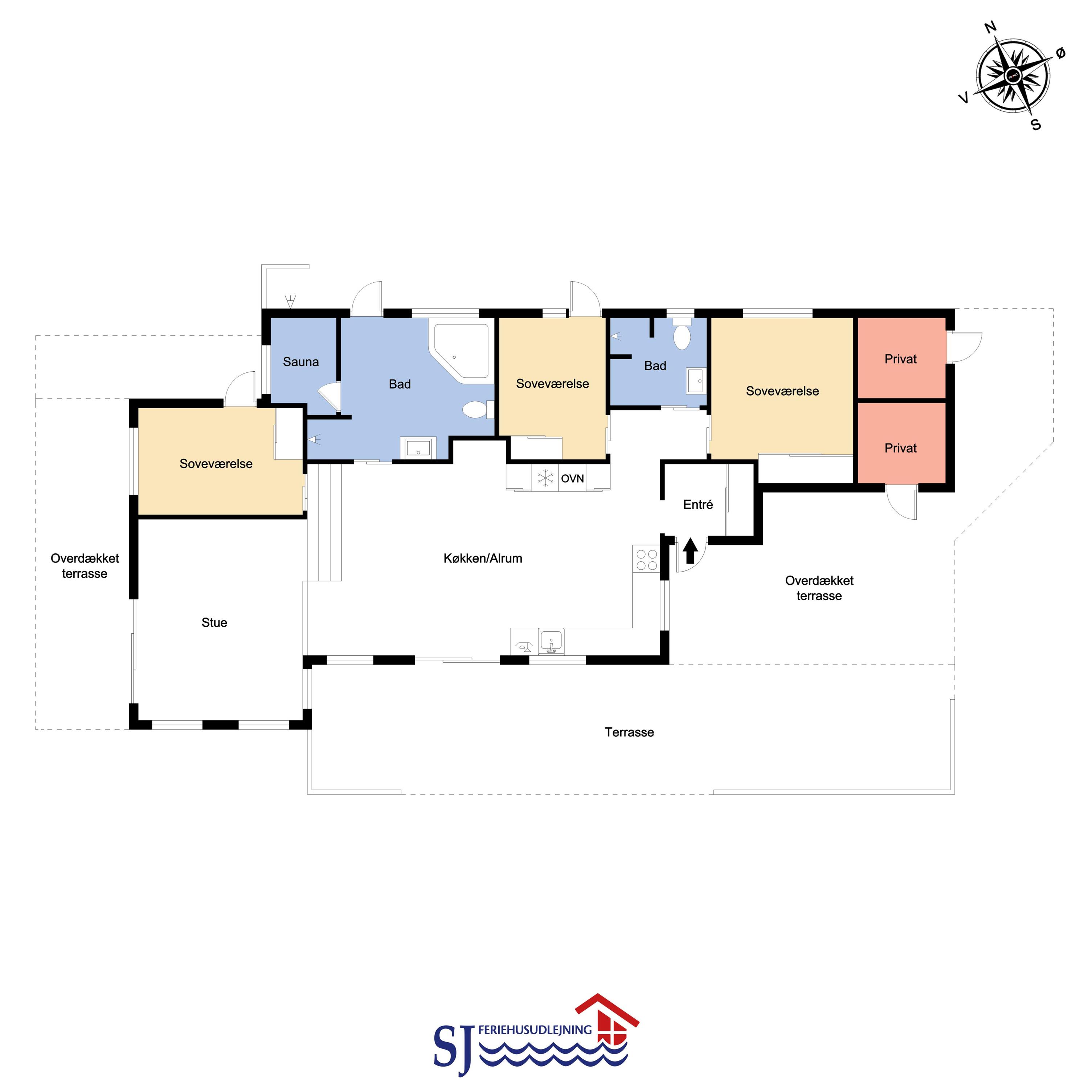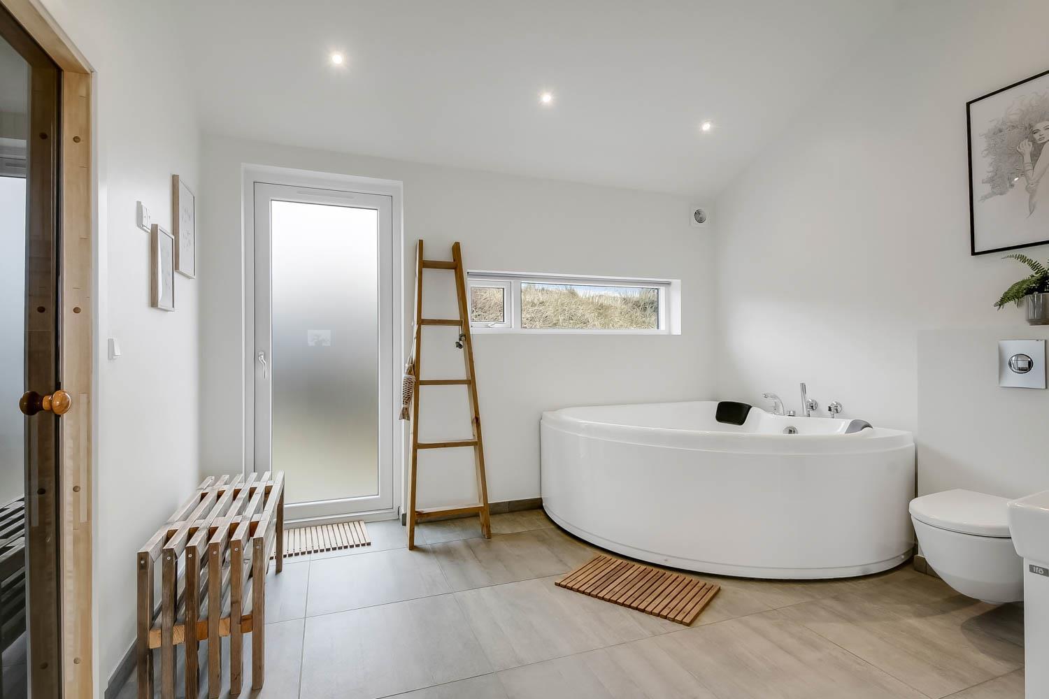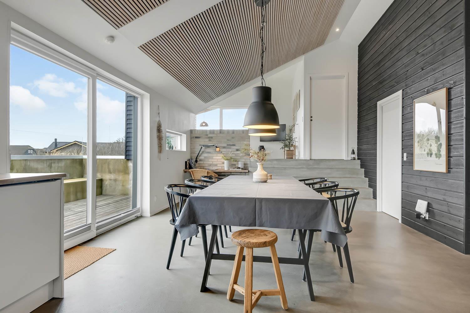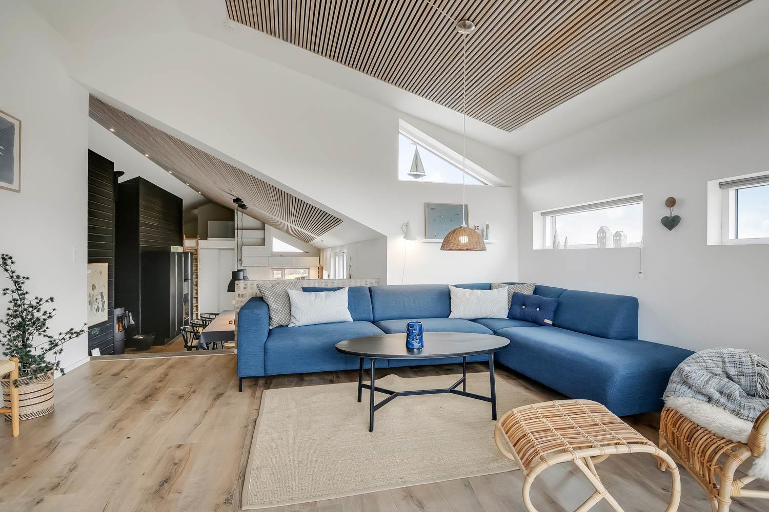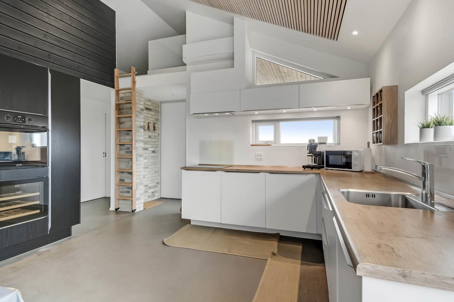 På en 2500 m2 dejlig, kuperet naturgrund med en fantastisk udsigt til klitterne, og kun 200 m fra Vesterhavet, ligger dette pragtfulde feriehus på 125 m2 + redskabsrum. Huset er minimalistisk i sit udtryk og praktisk indrettet. En flot entrè byder velkommen indeholdende skabe samt vaskemaskine og tørretumbler. Køkken alrummet er med loft til kip og betongulv. Her findes der en brændeovn, og køkkenet indeholder opvaskemaskine, keramisk kogeplade, ovn, køl og frys samt vinkøleskab. Fra køkken alrummet er der en opgang til opholdsstuen, hvor der ligeledes er loft til kip samt parketgulv. Heroppe findes der er et fladskærms-TV med danske og tyske kanaler samt chromecast. Chromecast gør det muligt via mobiltelefonen eller tablet at se film eller streaming på fladskærmen. Herudover er der en bluetooth-højtaler som også gør det muligt at høre radio eller musik via egen mobiltelefon. Huset indeholder stort badeværelse med toilet, håndvask, spa, sauna, bruseniche og gulvvarme samt udgang til ugeneret udendørsbruser et plus når man lige kommer fra stranden. Der er et mindre badeværelse med bruseniche toilet, håndvask og gulvvarme. Huset har 3 fine soveværelser med parketgulve og skabe (1DS, 1DS,, 1DS). Der er gratis trådløs internetadgang. Der findes varmeluftpumpe, som reducerer varmeforbruget. Rygning eller husdyr er ikke tilladt.