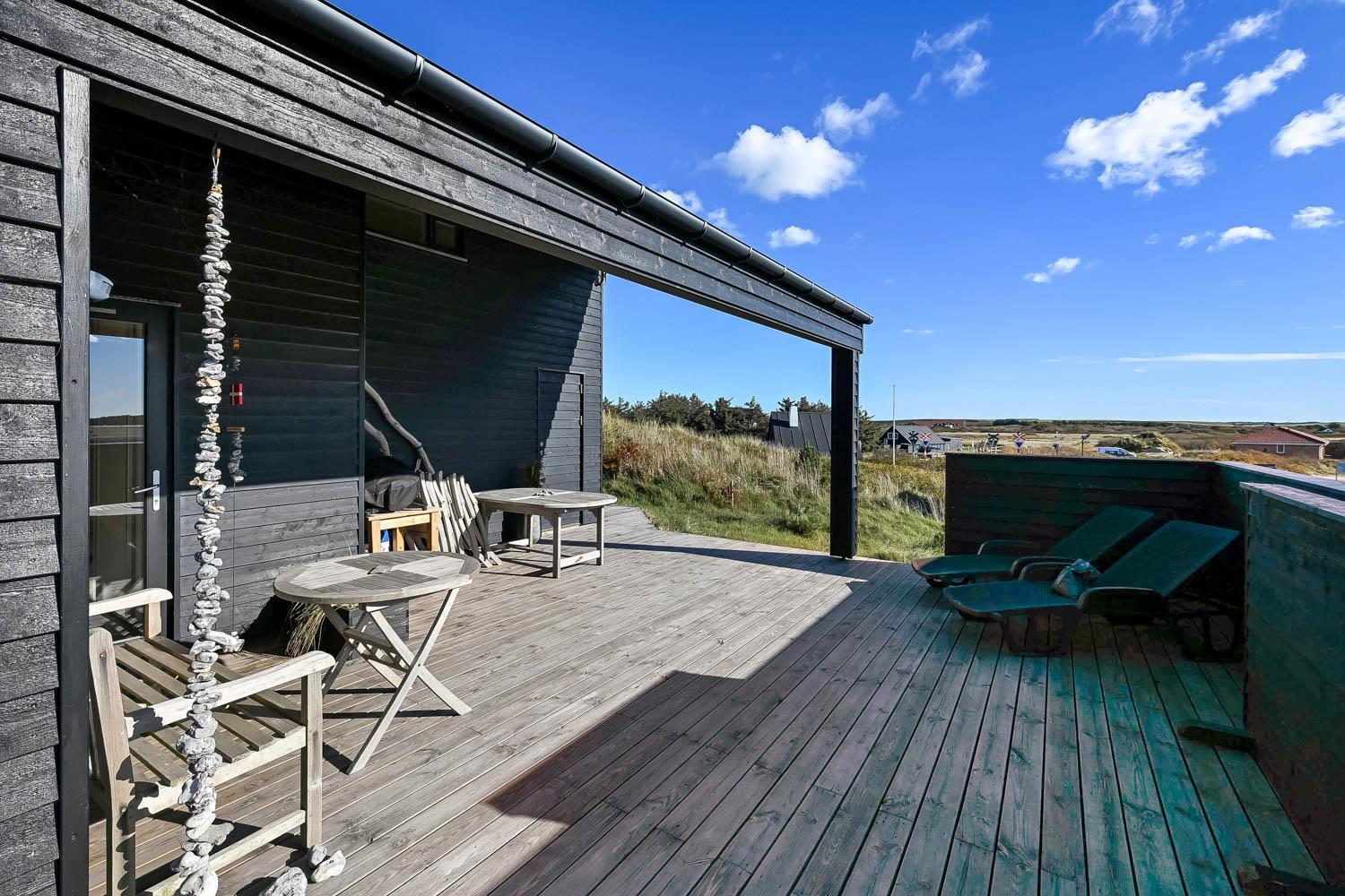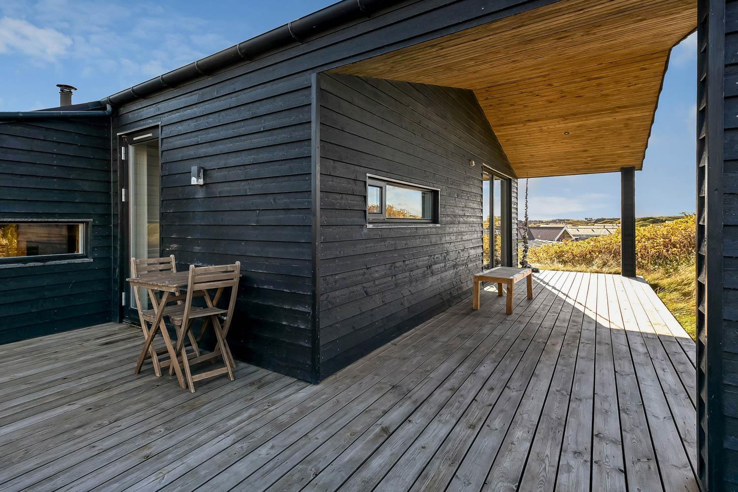 Huset har udgang til 2 overdækkede træterrasser på i alt 40 m2 samt yderligere 35 m2 træterrasse, der vender mod syd, og det er derfor altid muligt at finde en plads i solen. Der er havemøbler samt grill til rådighed. Huset har egen carport. Ud over de kun 200 m til havet, er der 600 m til indkøbsmuligheder og 500 m til nærmeste restaurant.
