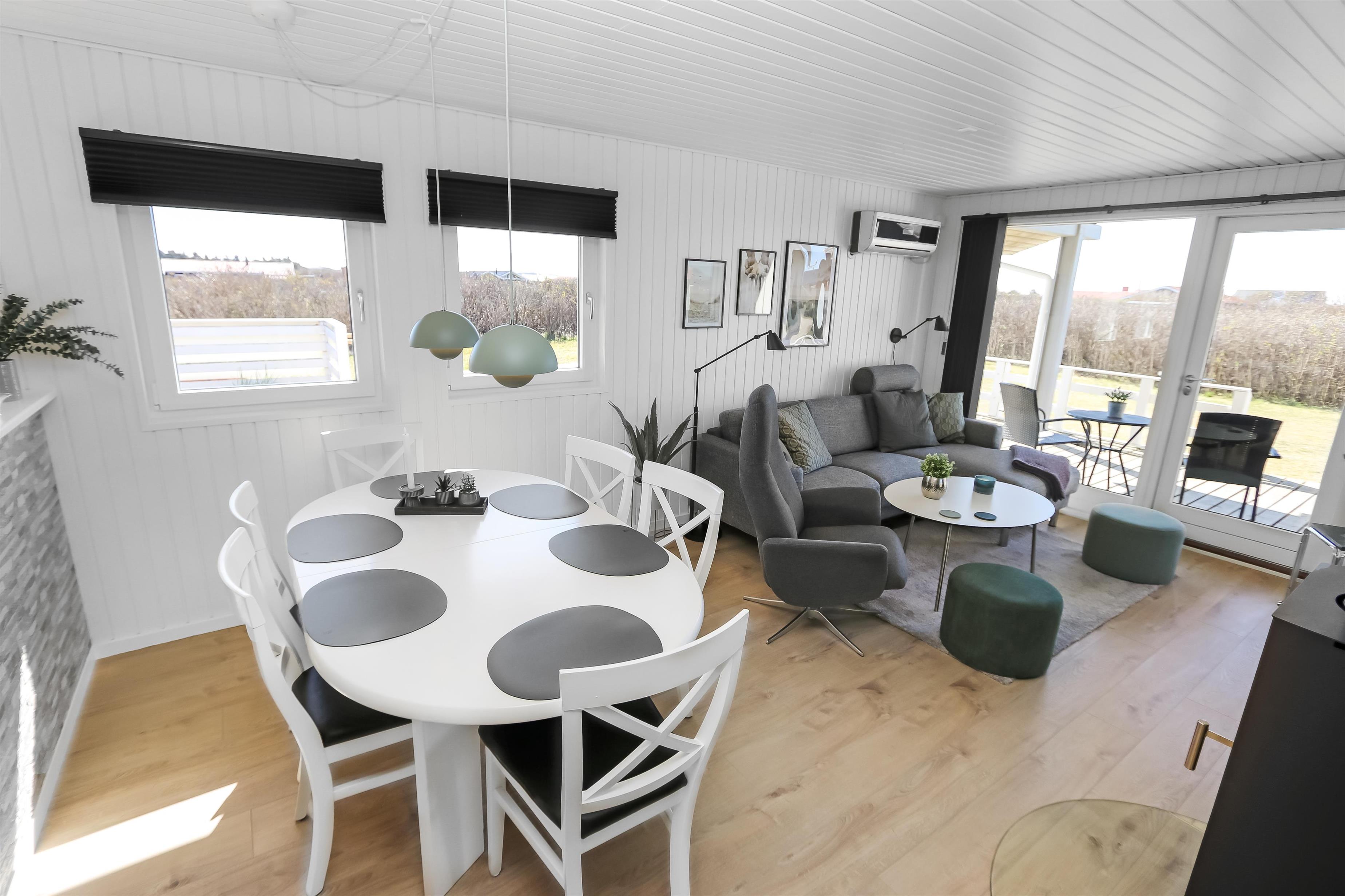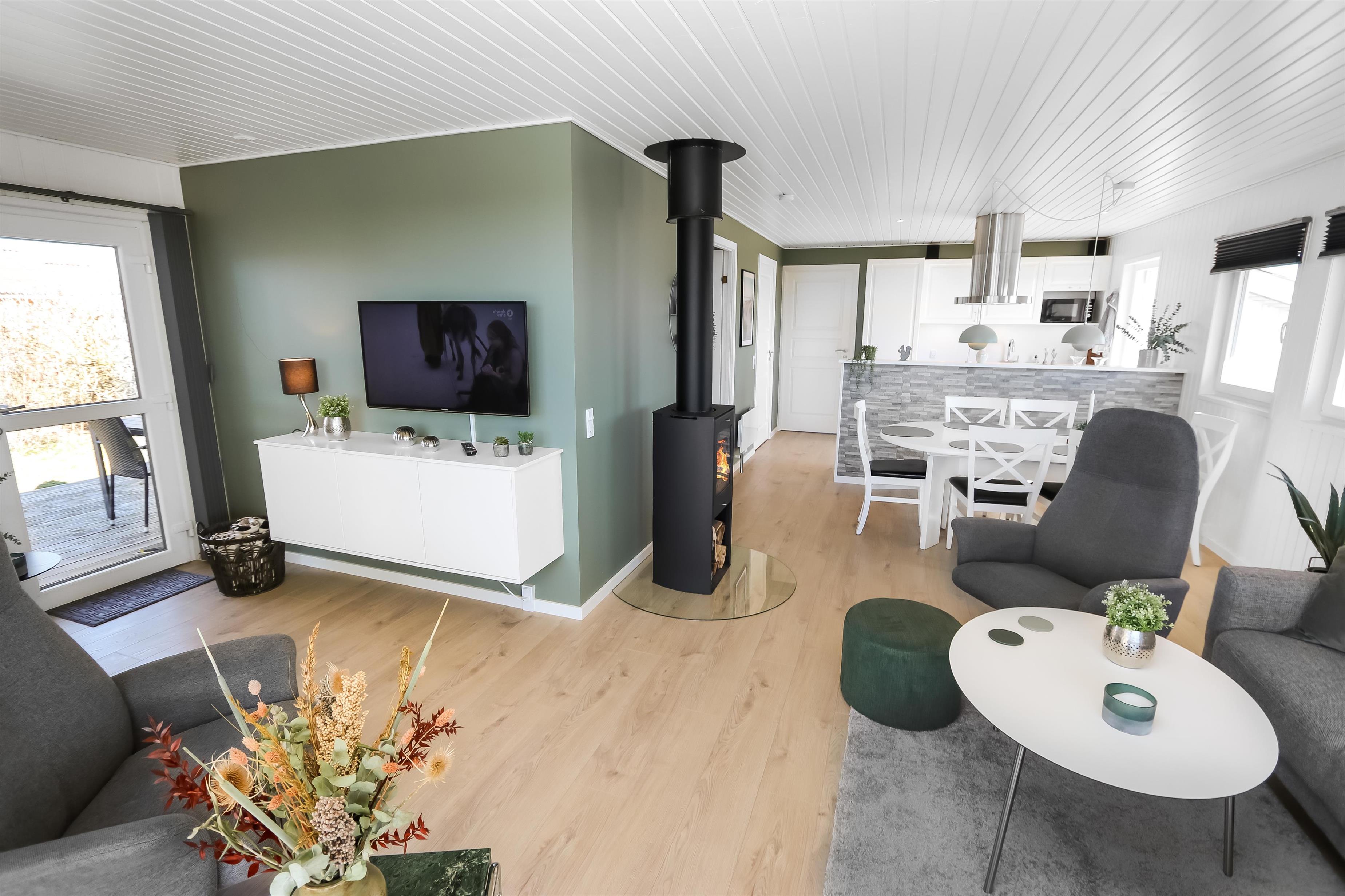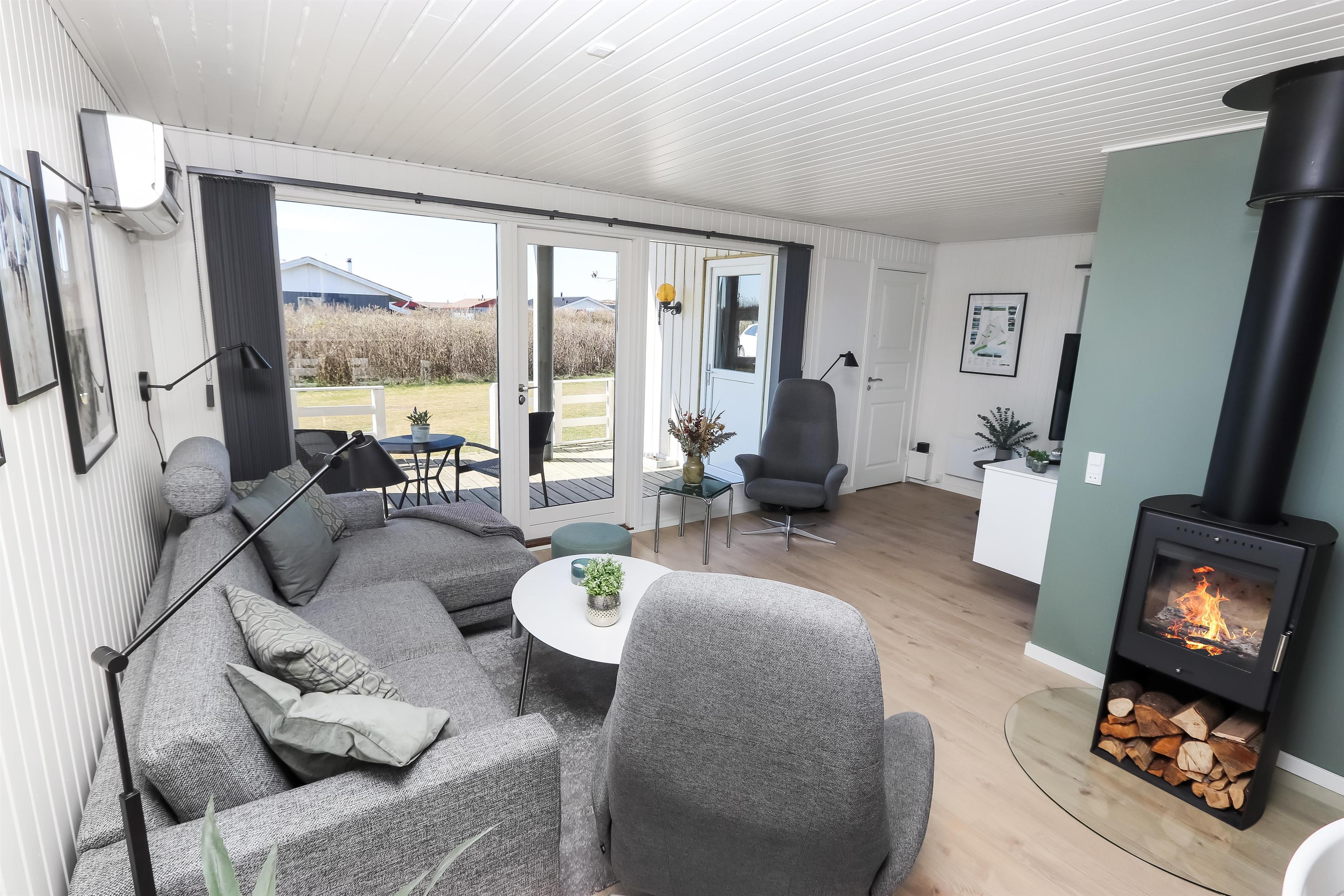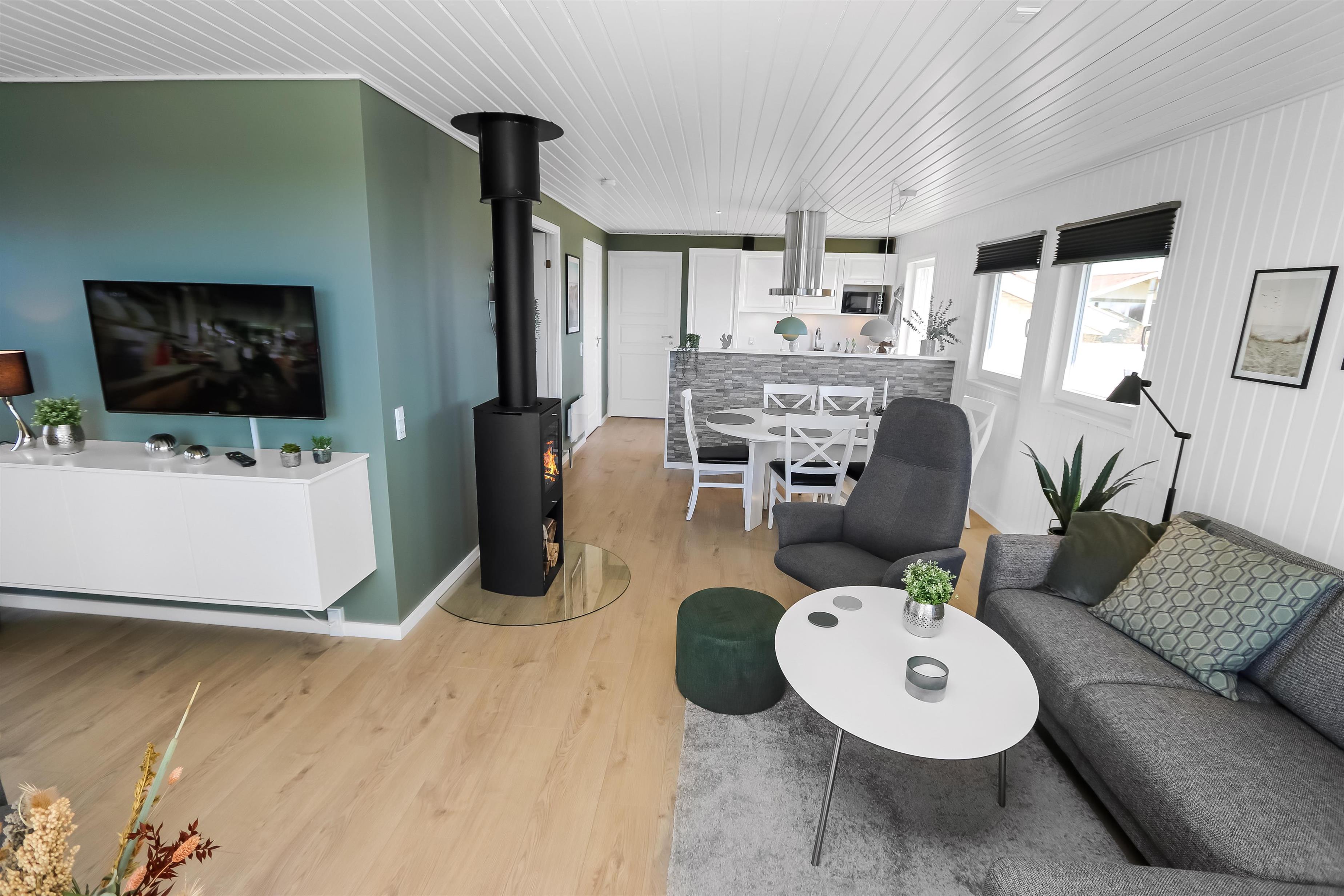 Husets stue og køkken er i samme rum og fra stuen er der direkte adgang til det store terrasseanlæg, som vender mod syd ved indgangen til stuen. Køkkenet har glaskeramisk komfur med emhætte, køle-fryseskab, mikrobølgeovn og en opvaskemaskine. Mellem stuen og køkkenet står spisebordet med stole og i enden af huset ligger selve stuen. Her er der sofagruppe med stuebord. Brændeovn og varmepumpe søger for at alle kan holde varmen året rundt og samtidig kan spare på forbruget. Der er ligeledes et smart-tv med mulighed for at se tysk og dansk TV, DVD-afspiller samt streaming af TV, radio og apps via Chromecast. Herudover er der også CD-adspiller og radio hvis man for eksempel ønsker noget baggrundsmusik til hyggen. Badeværelset med klinkegulv med gulvvarme, bruser, vaskemaskine, tørretumbler, toilet, håndvask. Der er 3 soveværelser i huset (1DS, 1DS, 1DS). Ikke-ryger hus. Husdyr ikke tilladt.
