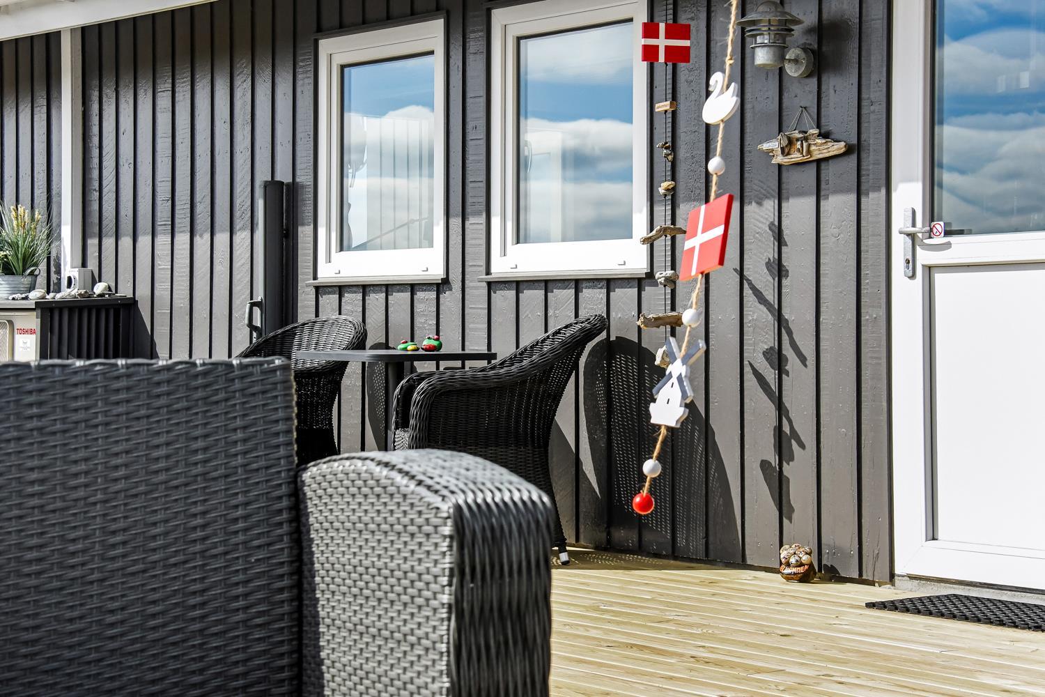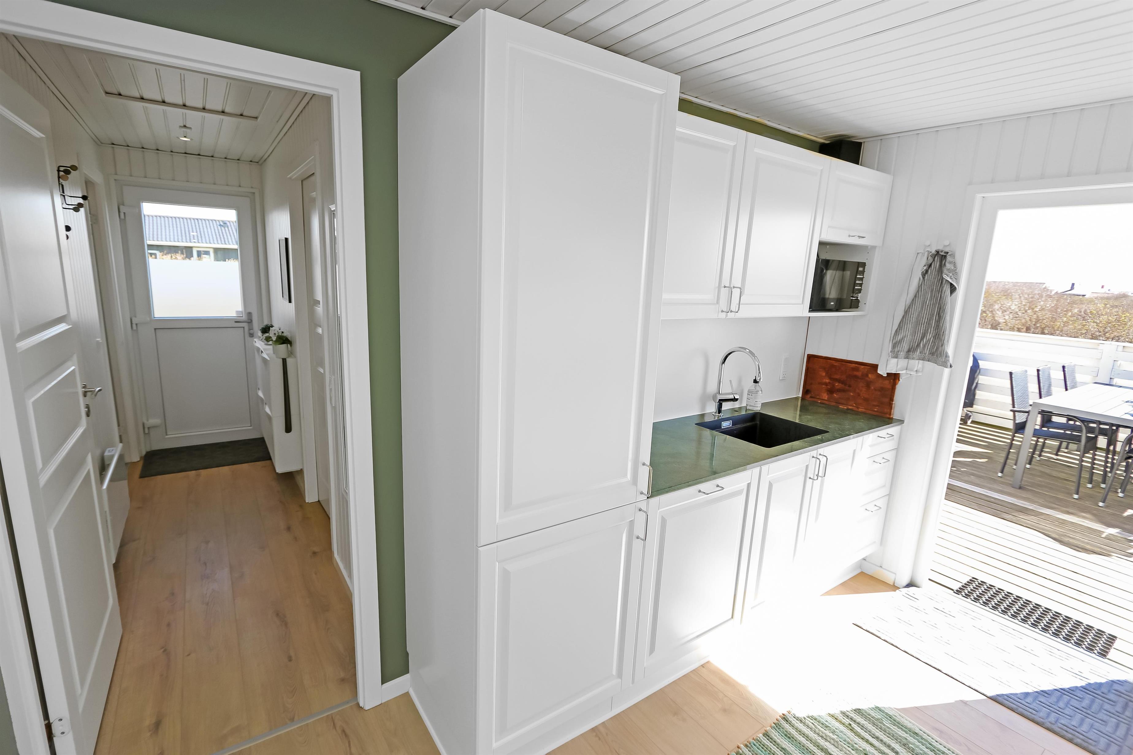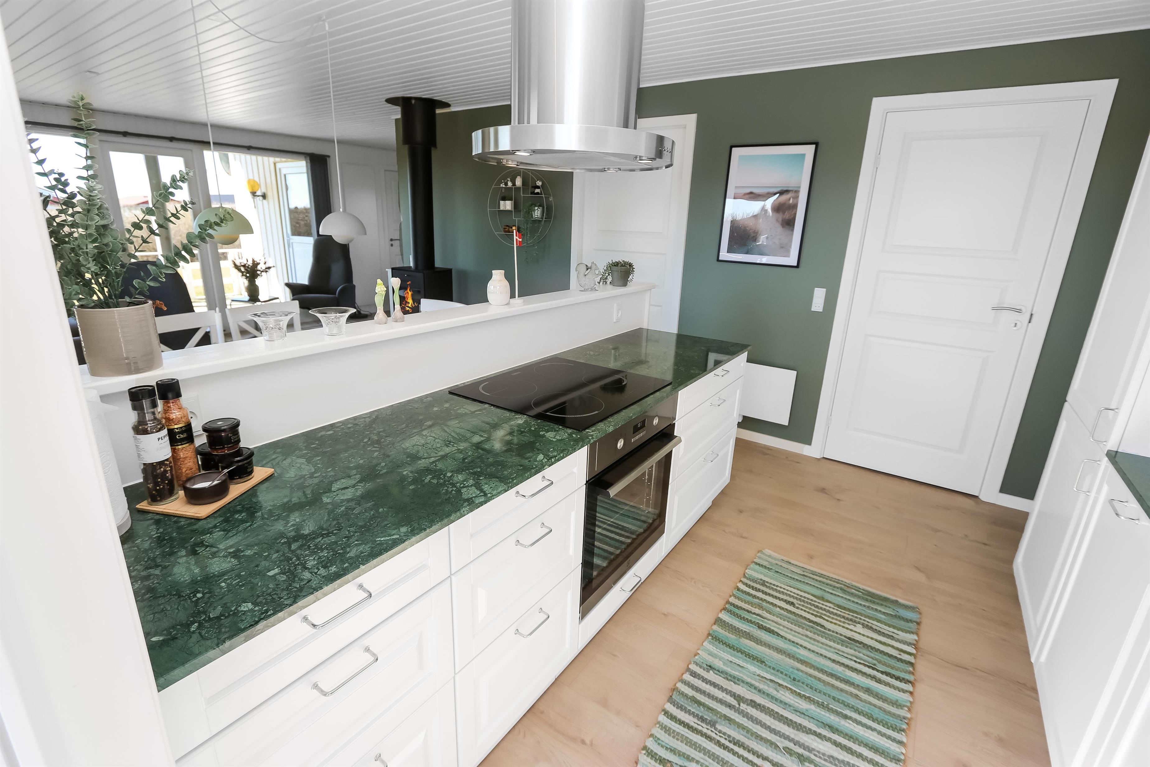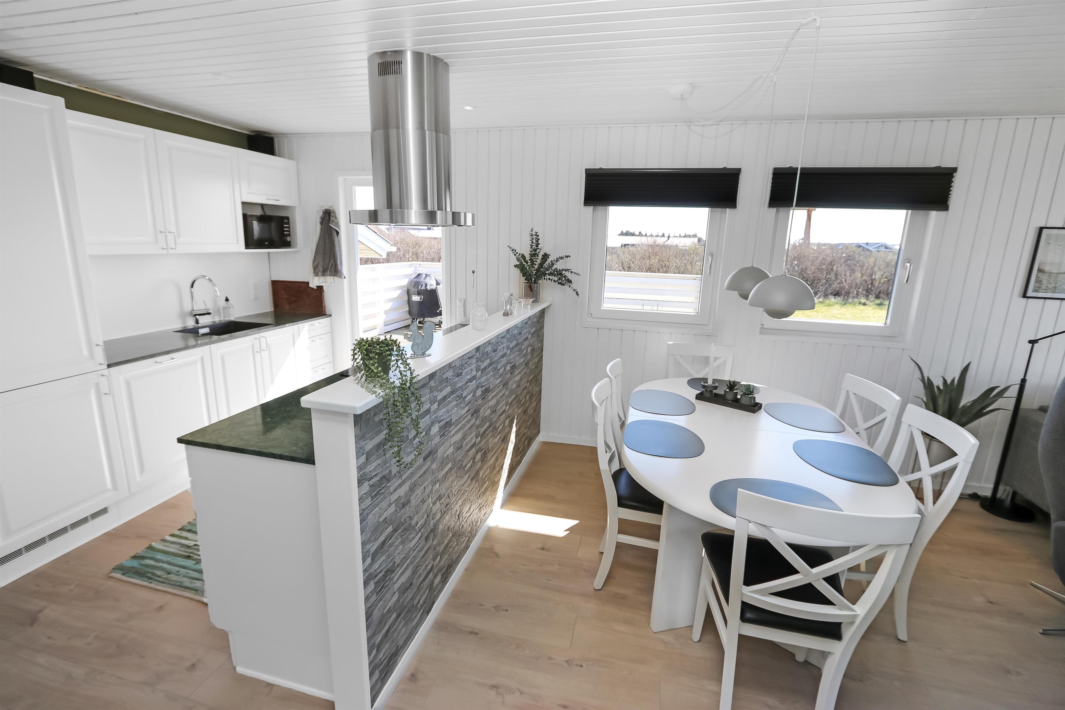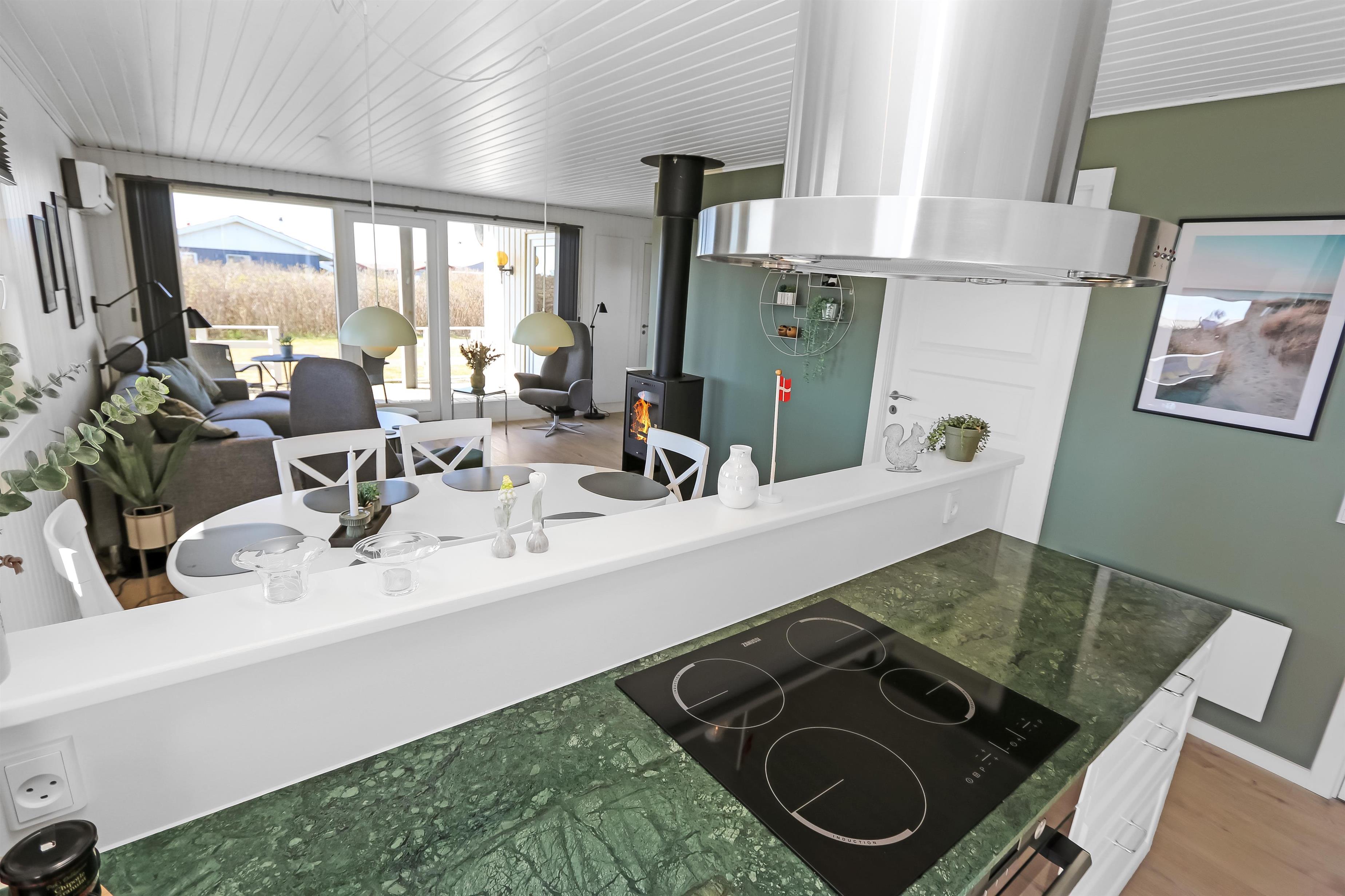 Husets stue og køkken er i samme rum og fra stuen er der direkte adgang til det store terrasseanlæg, som vender mod syd ved indgangen til stuen. Køkkenet har glaskeramisk komfur med emhætte, køle-fryseskab, mikrobølgeovn og en opvaskemaskine. Mellem stuen og køkkenet står spisebordet med stole og i enden af huset ligger selve stuen. Her er der sofagruppe med stuebord. Brændeovn og varmepumpe søger for at alle kan holde varmen året rundt og samtidig kan spare på forbruget. Der er ligeledes et smart-tv med mulighed for at se tysk og dansk TV, DVD-afspiller samt streaming af TV, radio og apps via Chromecast. Herudover er der også CD-adspiller og radio hvis man for eksempel ønsker noget baggrundsmusik til hyggen. Badeværelset med klinkegulv med gulvvarme, bruser, vaskemaskine, tørretumbler, toilet, håndvask. Der er 3 soveværelser i huset (1DS, 1DS, 1DS). Ikke-ryger hus. Husdyr ikke tilladt.