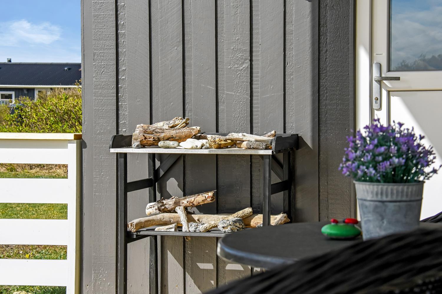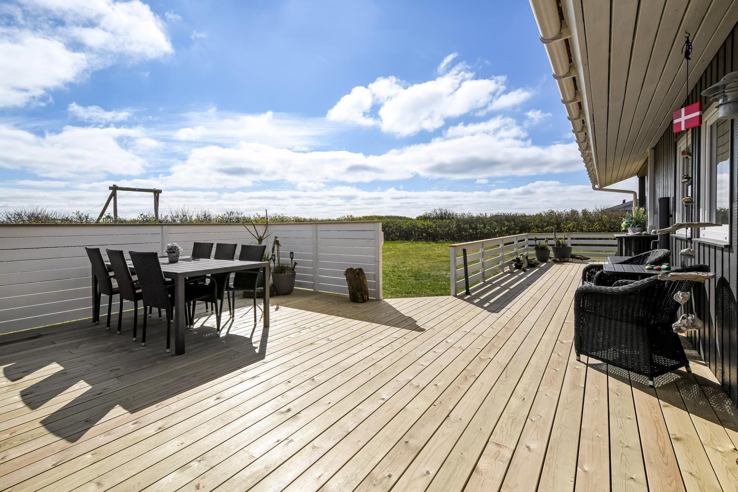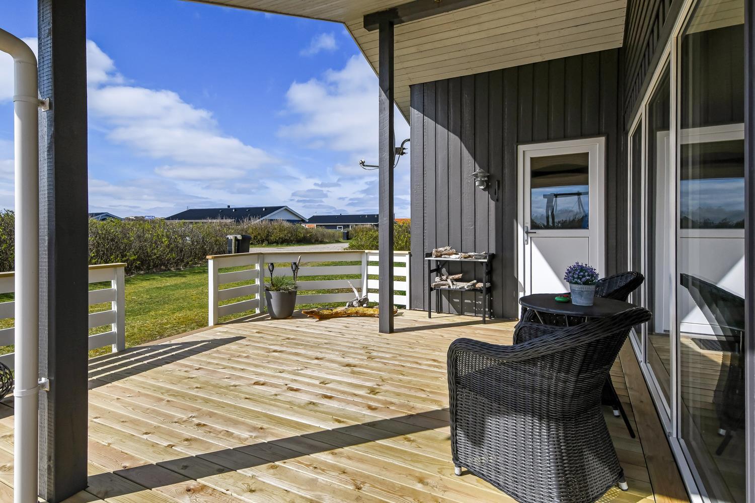 Feriehuset ligger på ca. 900 kvadratmeter åben naturgrund kun 350 m fra Vesterhavet. Huset har et åben og delvis overdækket terrasseanlæg hvor der både er grill, havemøbler og solvogne. I redskabsrummet er der ekstra afliggeplads. Huset direkte ved siden af en af områdets legepladser. Der er kun 150 meter til Vejlby Torv hvor der findes en købmand der har åbent fra påske til og med oktober. Går man videre herfra er man hurtigt oppe ved Vesterhavet, som kan passeres via en overgang for gangbesværede, som også er god hvis man skal have en trækvogn eller klapvogn med på stranden. Umiddelbart cirka 600 meter syd for huset ligger Ferring Sø, hvor man kan foretage mange vandreture. Det pefekte og særdeles samgfuldt indrettet til både par og den lille familie.