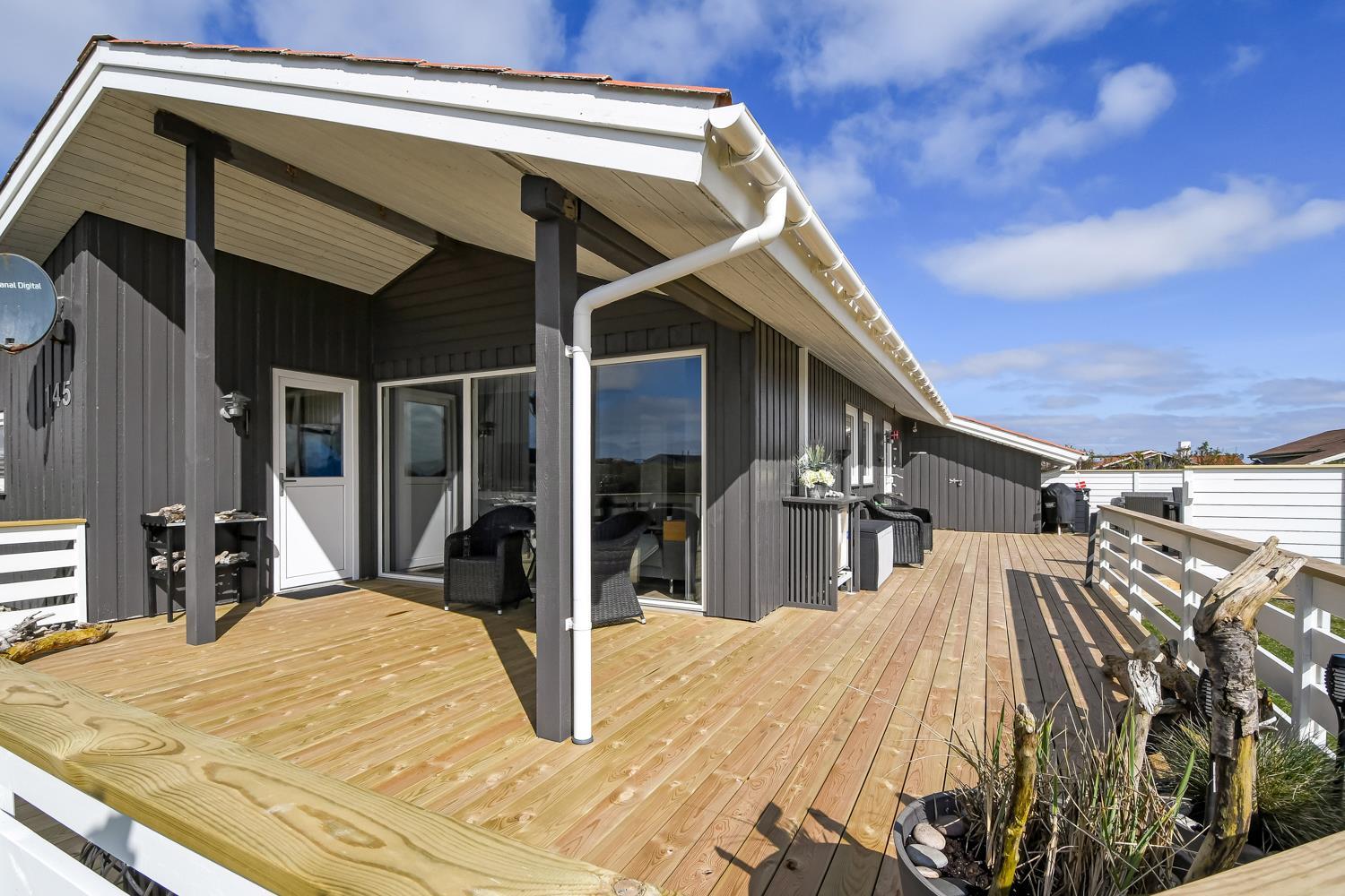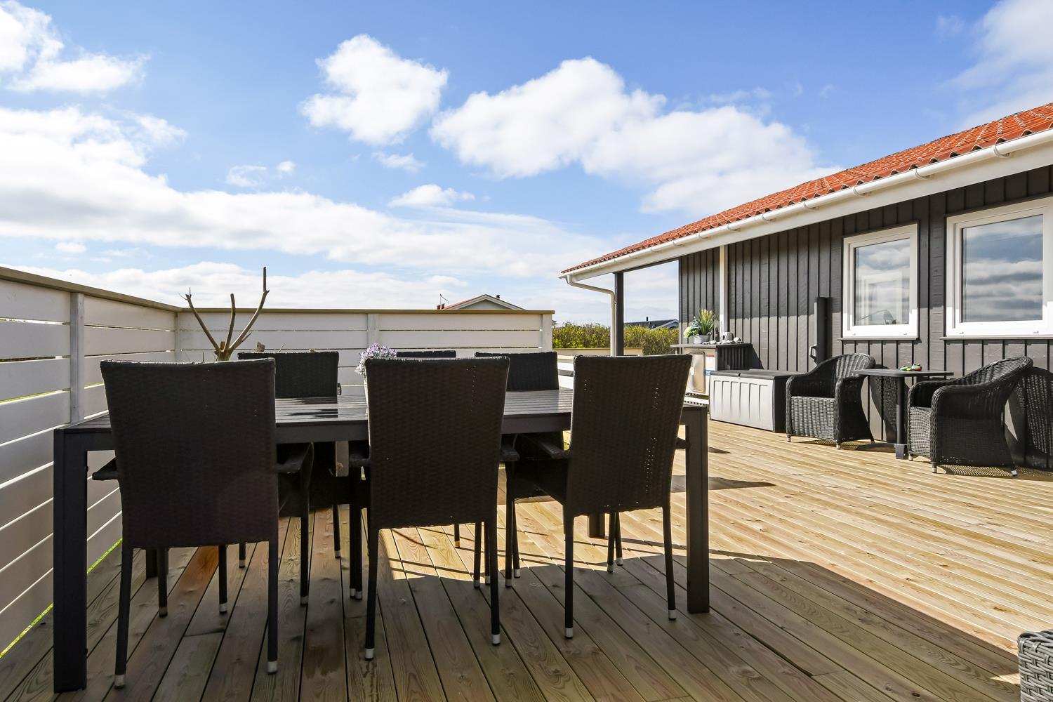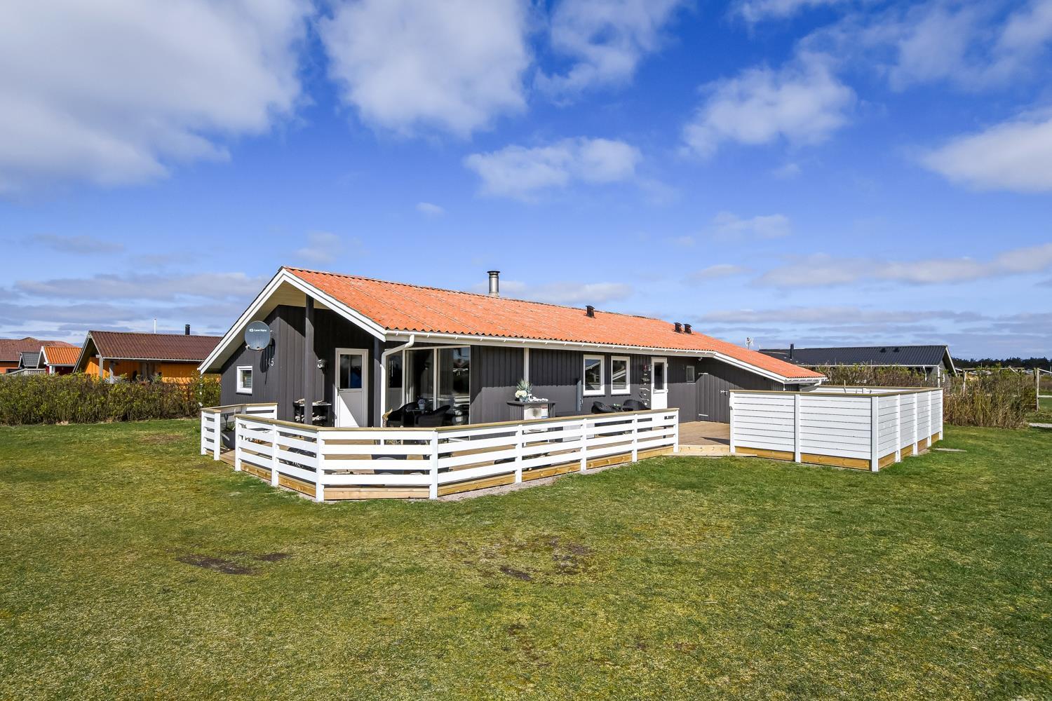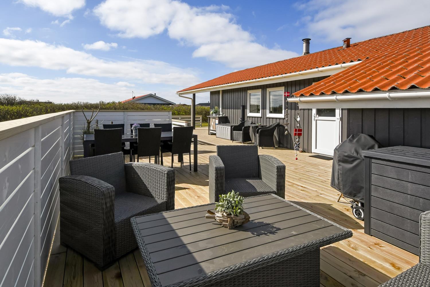 Feriehuset ligger på ca. 900 kvadratmeter åben naturgrund kun 350 m fra Vesterhavet. Huset har et åben og delvis overdækket terrasseanlæg hvor der både er grill, havemøbler og solvogne. I redskabsrummet er der ekstra afliggeplads. Huset direkte ved siden af en af områdets legepladser. Der er kun 150 meter til Vejlby Torv hvor der findes en købmand der har åbent fra påske til og med oktober. Går man videre herfra er man hurtigt oppe ved Vesterhavet, som kan passeres via en overgang for gangbesværede, som også er god hvis man skal have en trækvogn eller klapvogn med på stranden. Umiddelbart cirka 600 meter syd for huset ligger Ferring Sø, hvor man kan foretage mange vandreture. Det pefekte og særdeles samgfuldt indrettet til både par og den lille familie.