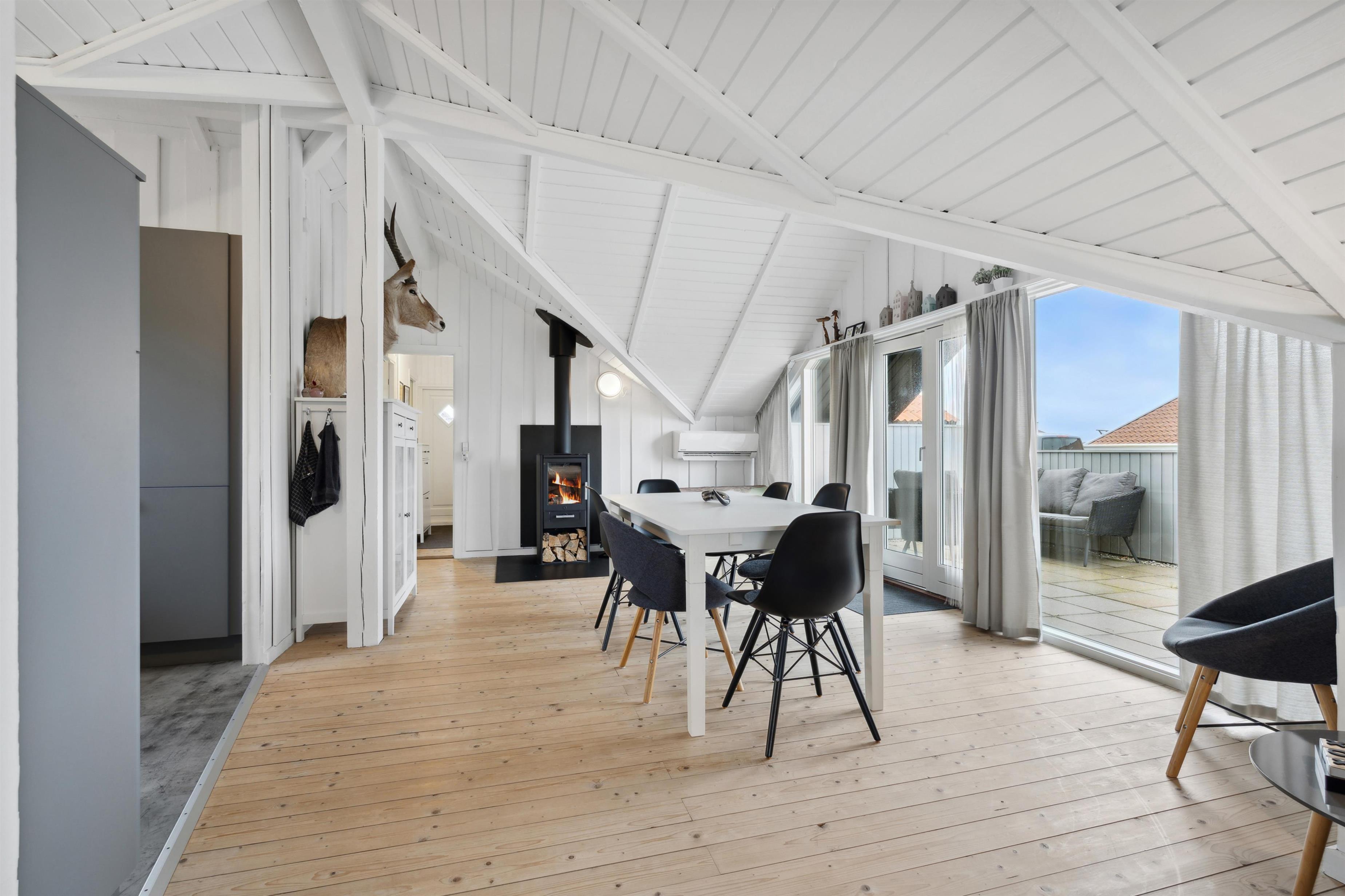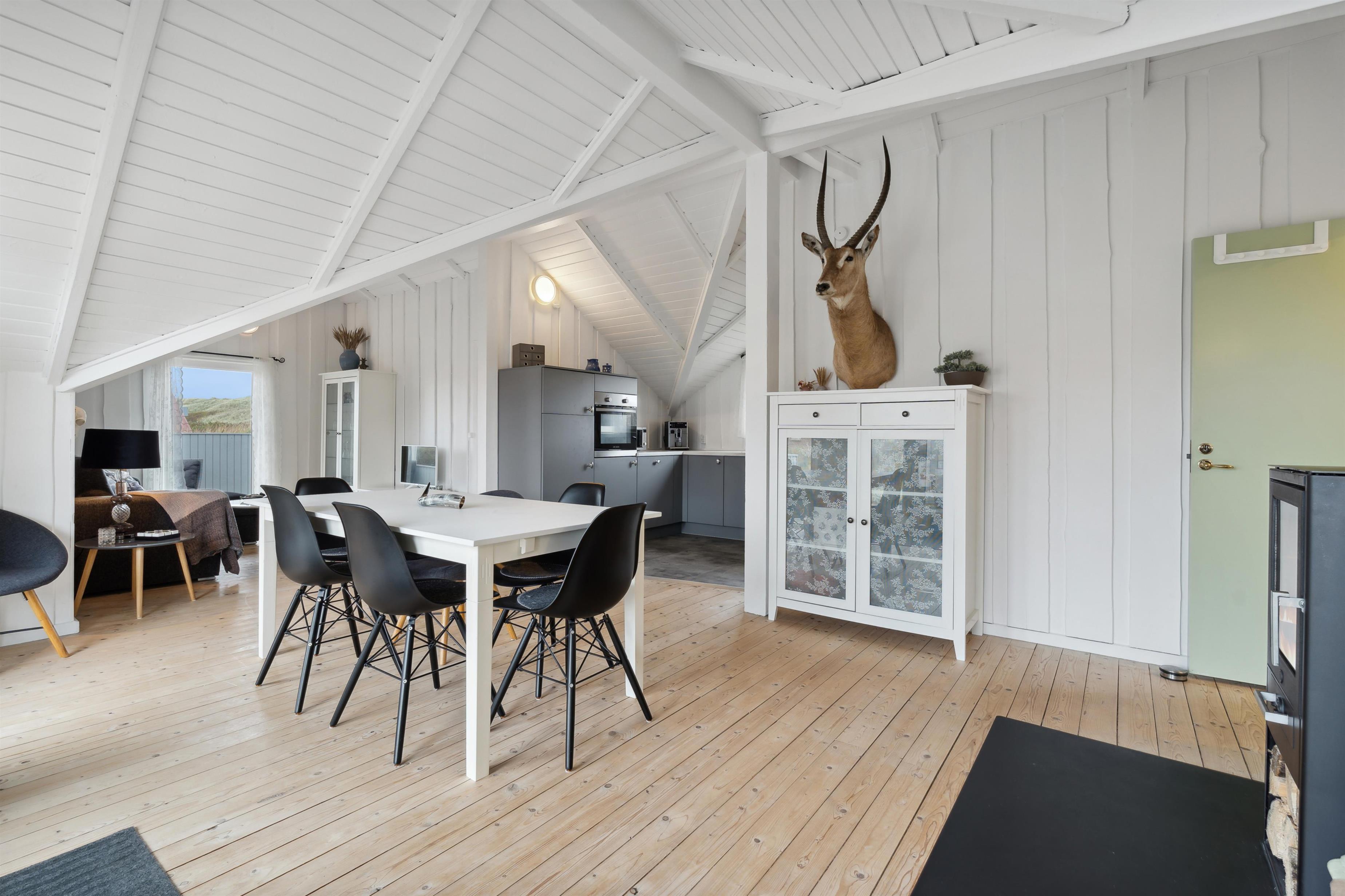 Feriehuset er 75 m2 stort og særdeles velholdt. Opholdsrummet er lyst og luftigt med loft til kip, smukke trægulve og en behagelig, nordisk atmosfære. I stuen kan I nyde varme og hygge fra brændeovnen, mens varmepumpen sikrer et behageligt indeklima året rundt. Der er fibernet-TV, Fiber-Internet og gode polstermøbler, som giver mulighed for ægte afslapning efter en aktiv dag i området. Opholdsrummet ligger i åben forbindelse med det funktionelle køkken, der er udstyret med el-keramiske kogeplader, opvaskemaskine. Indbygningsovn og køle-/fryseskab, så I kan tilberede og nyde feriens måltider i rolige omgivelser.