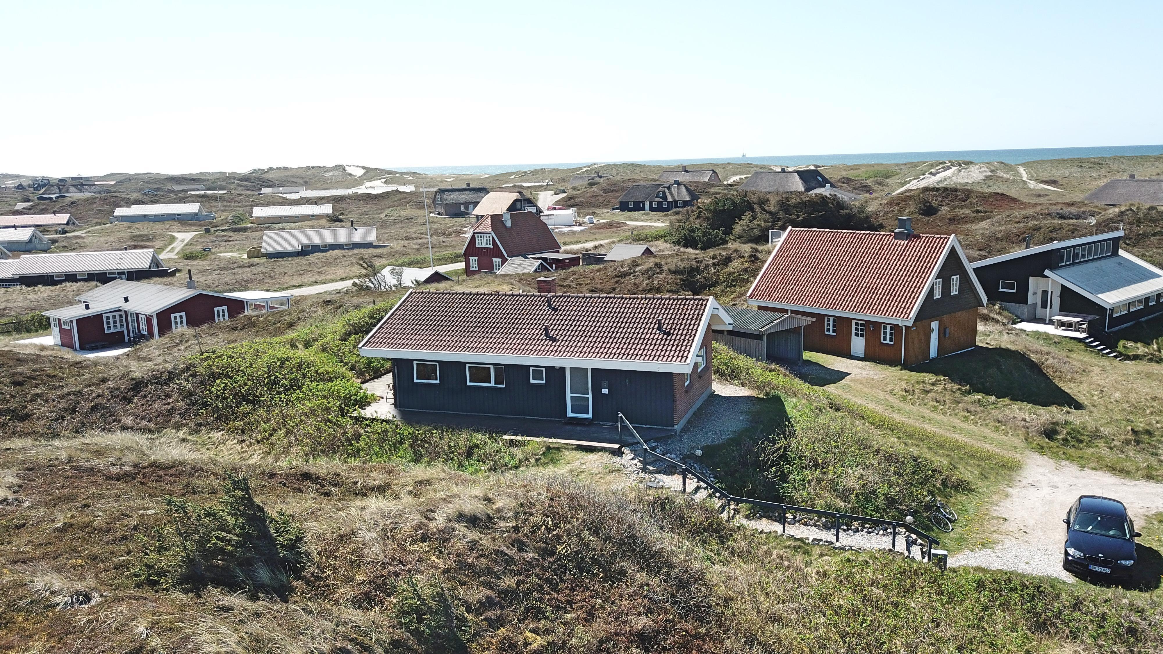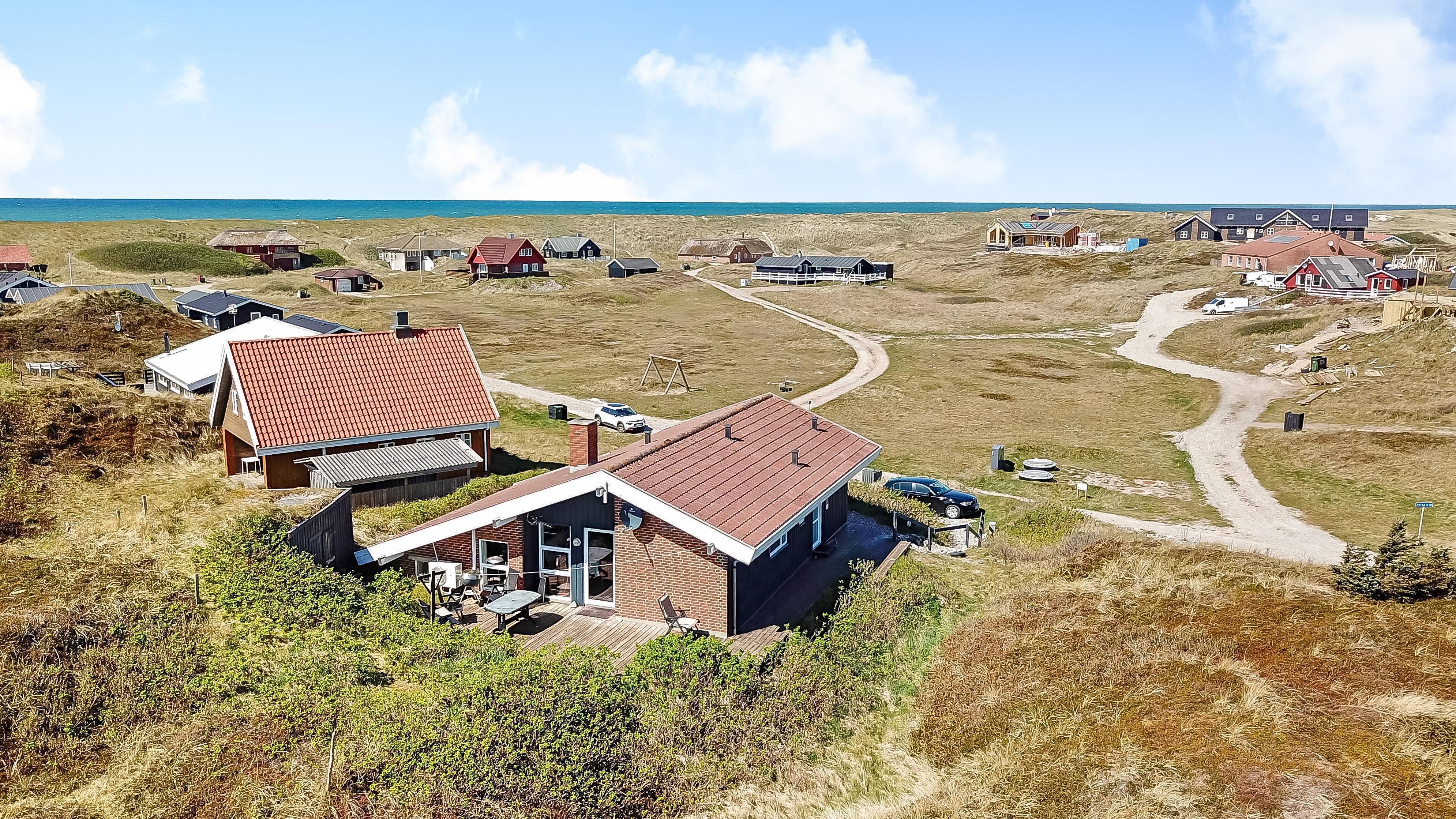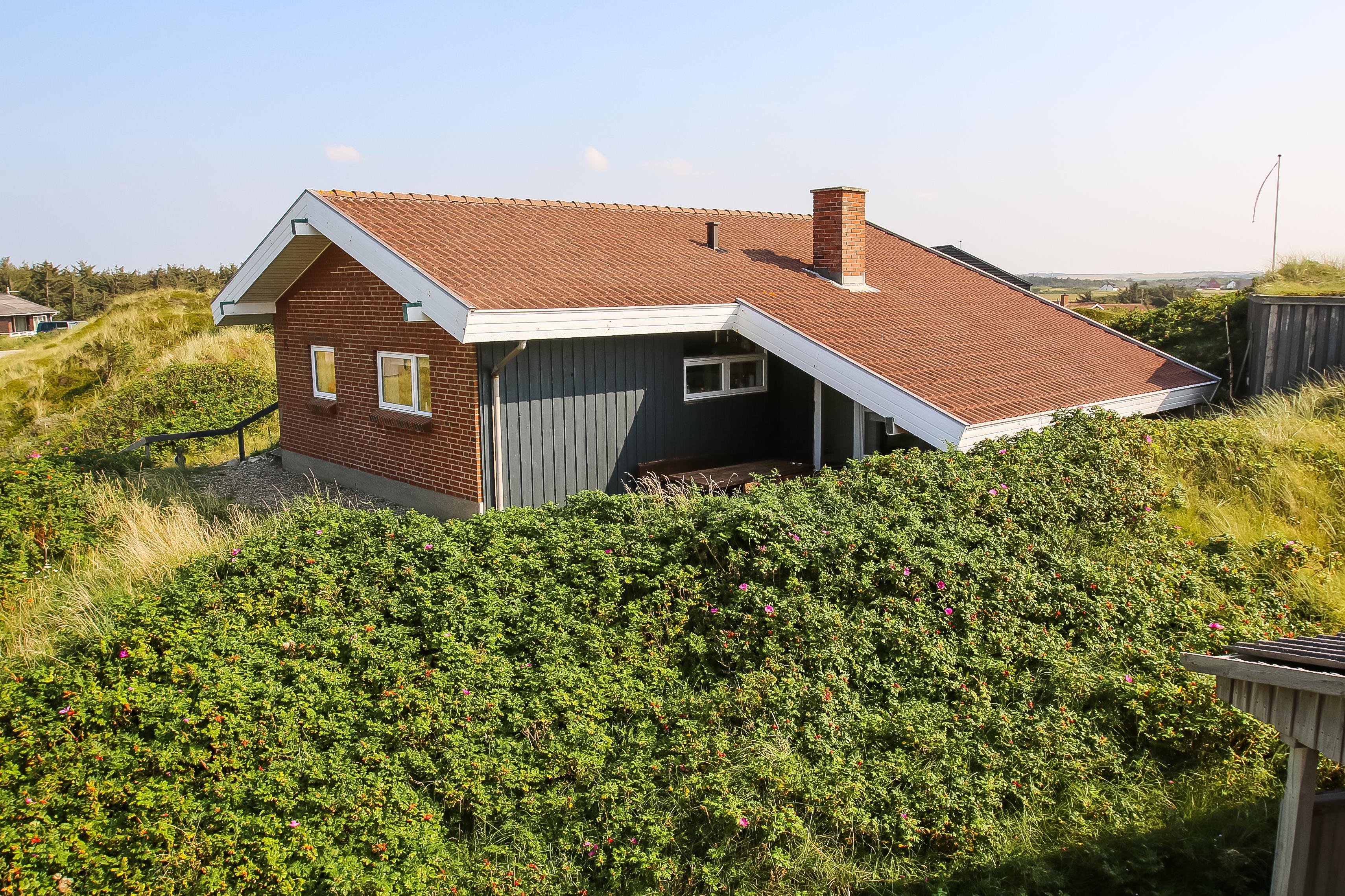 Feriehuset ligger direkte i klitten på en 2600 kvadratmeter højtliggende grund. Husets sydvendte terrasse ligger godt beskyttet af klitten til den ene side og selve huset til nordsiden. Her er plads til 6 personer fordelt på 4 soverum. Vesterhavet ligger blot 170 meter fra huset, så her når man hen til solnedgangen indenfor få minutter.