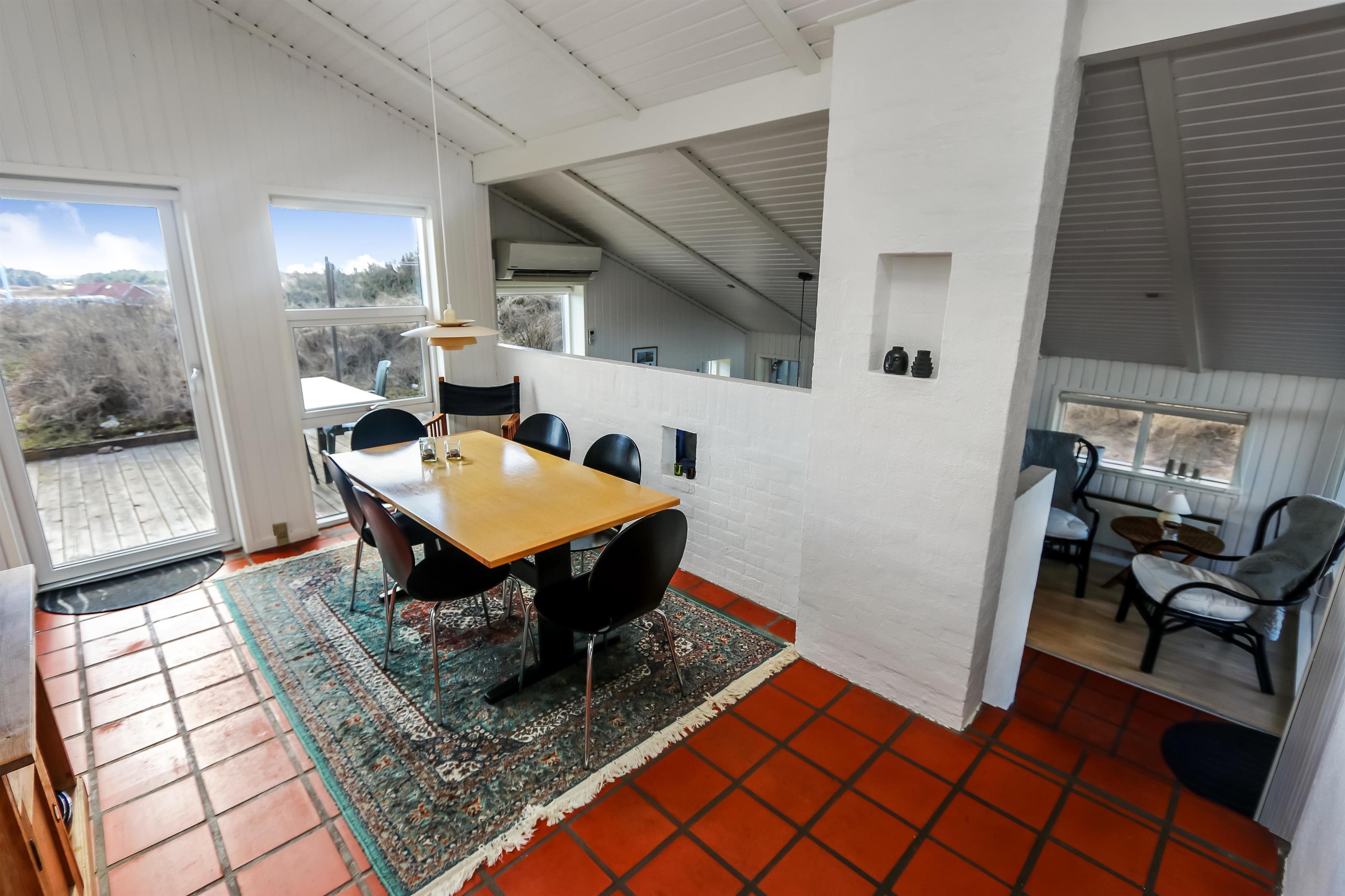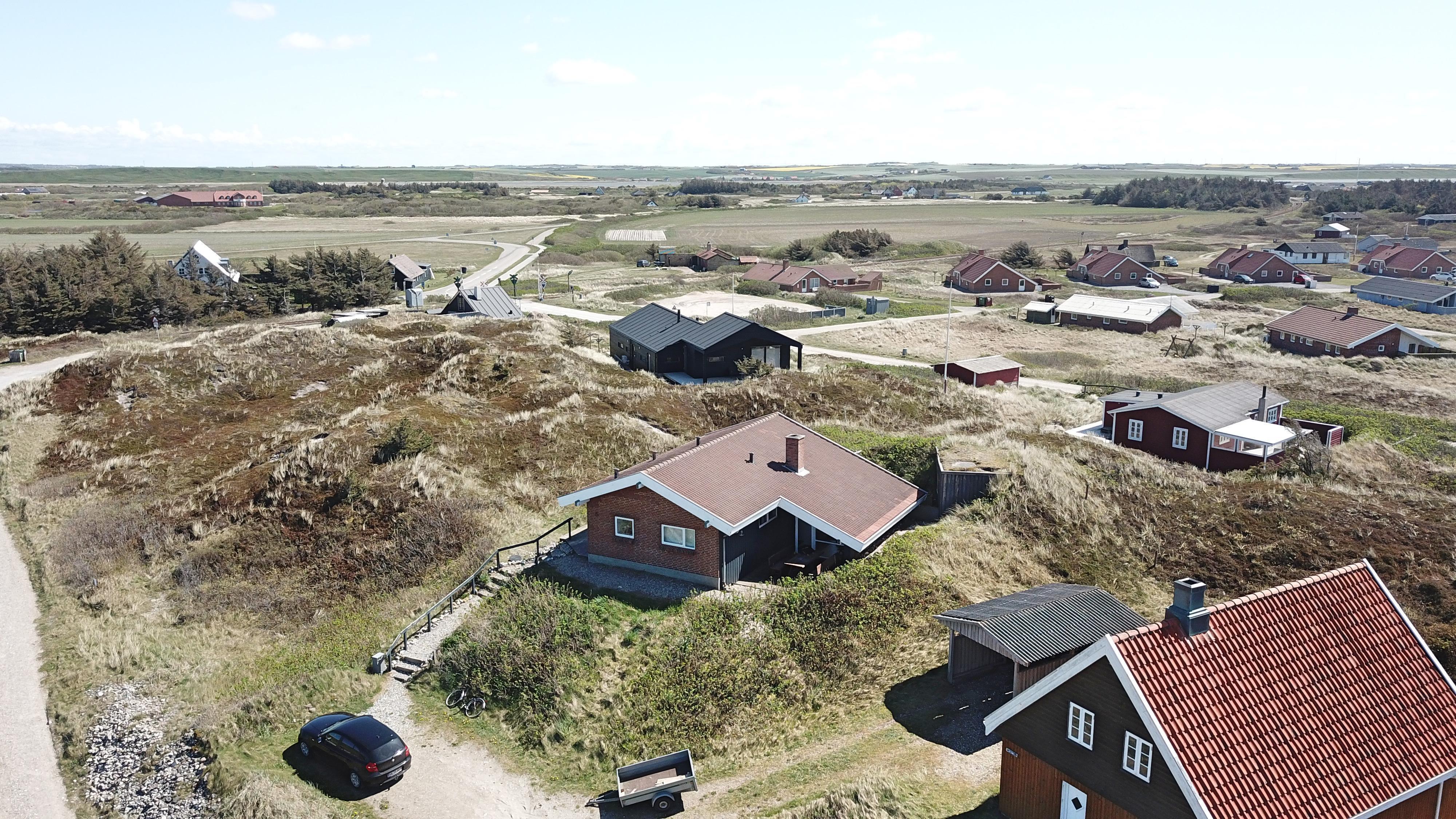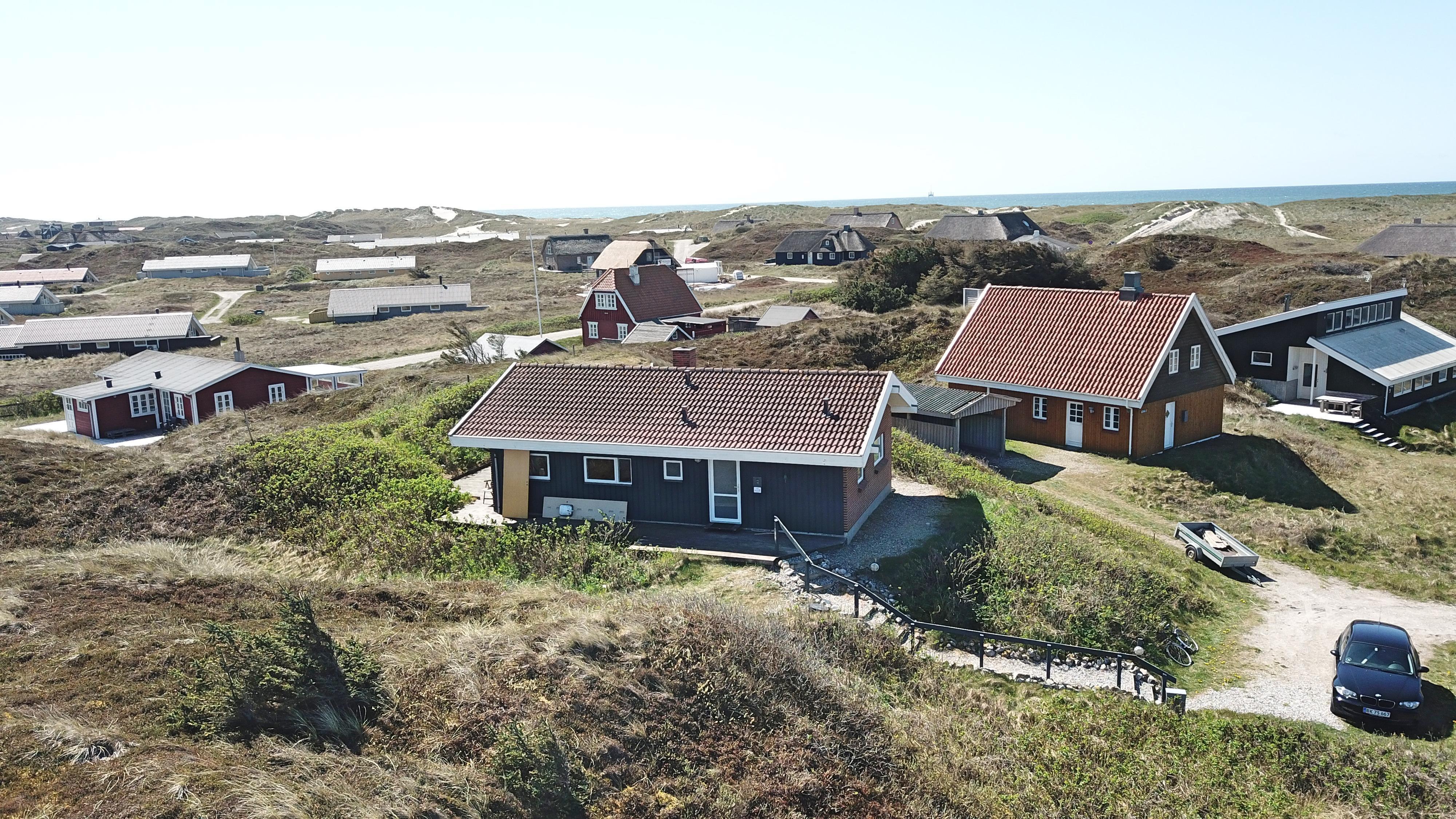 Feriehuset ligger direkte i klitten på en 2600 kvadratmeter højtliggende grund. Husets sydvendte terrasse ligger godt beskyttet af klitten til den ene side og selve huset til nordsiden. Her er plads til 6 personer fordelt på 4 soverum. Vesterhavet ligger blot 170 meter fra huset, så her når man hen til solnedgangen indenfor få minutter.