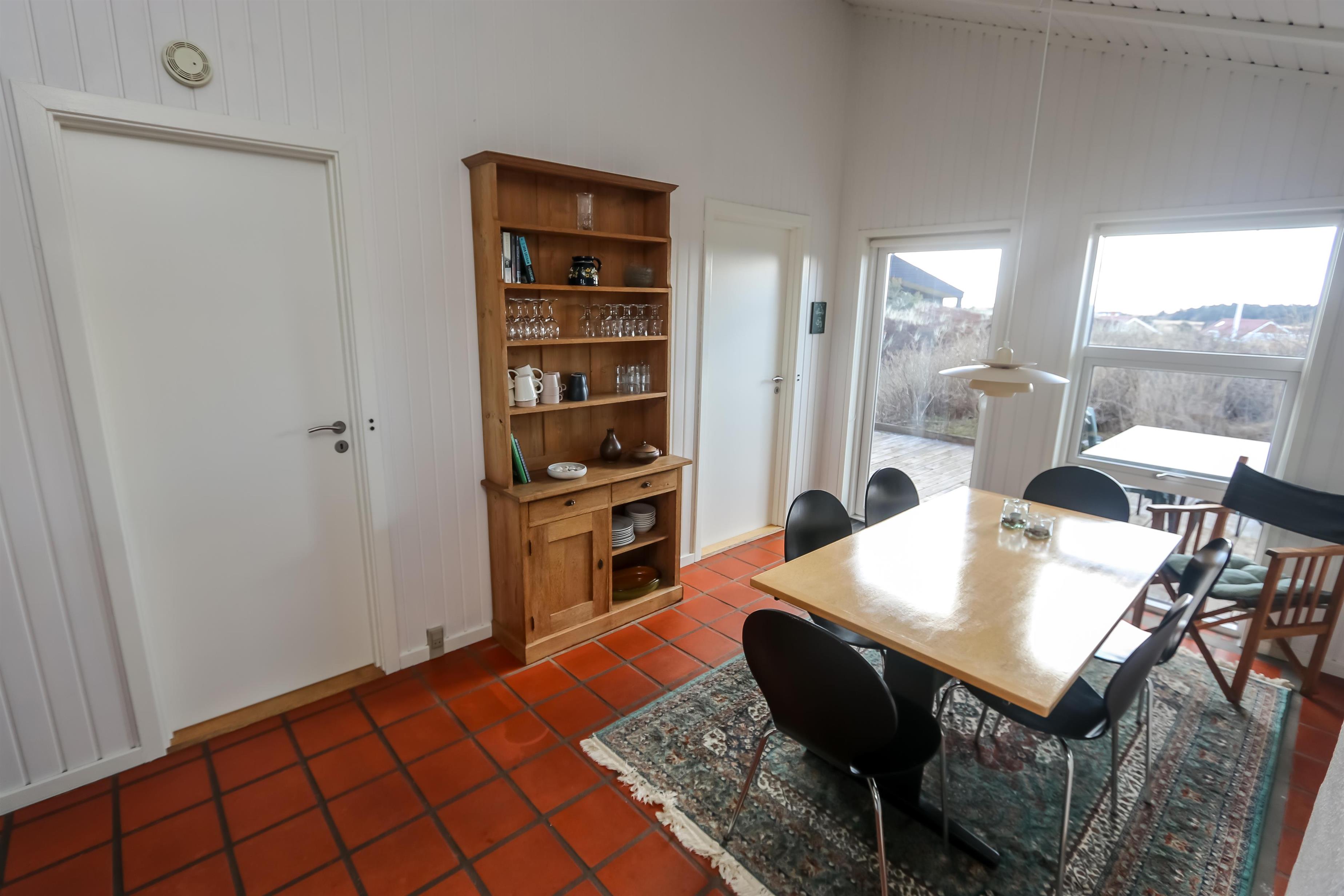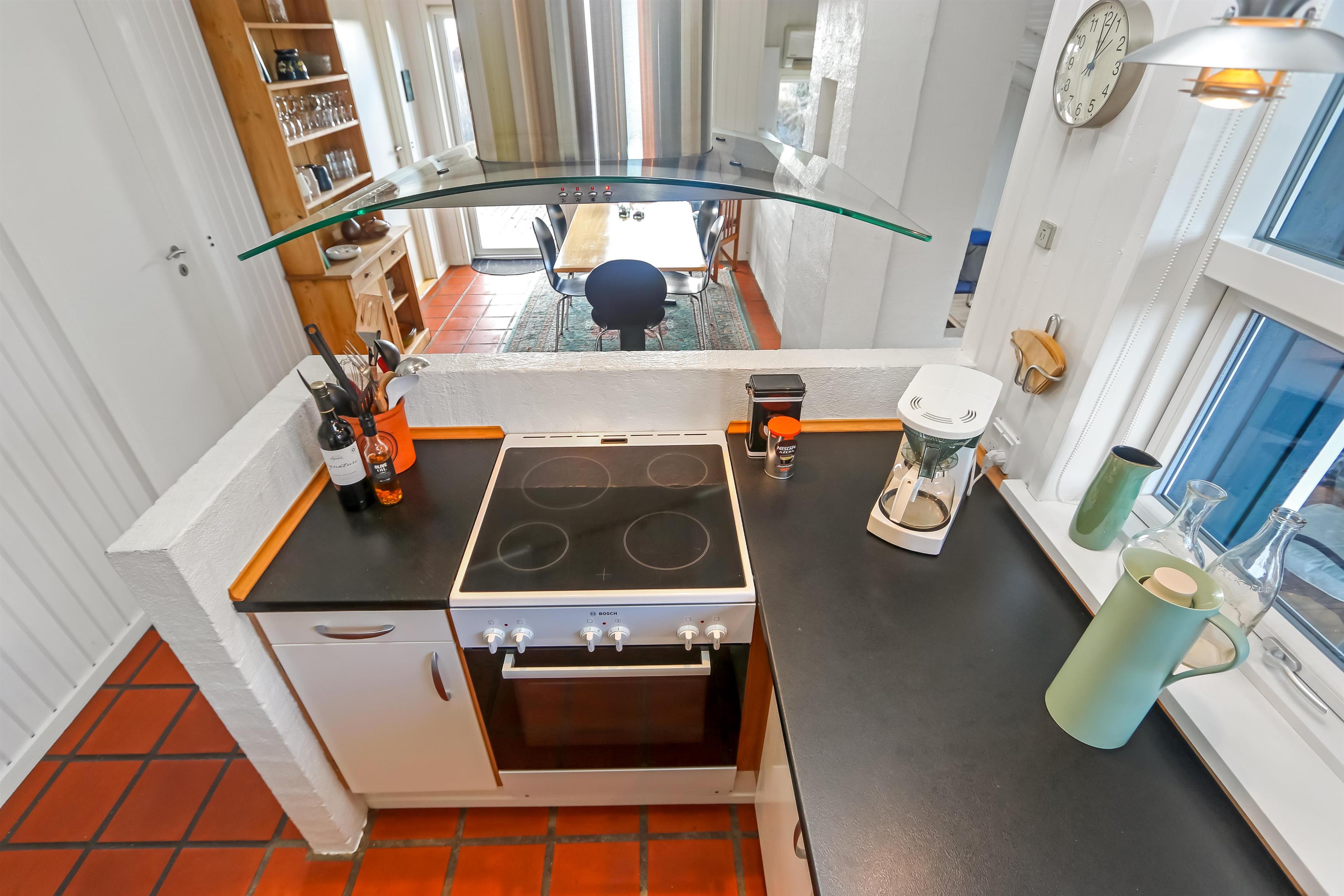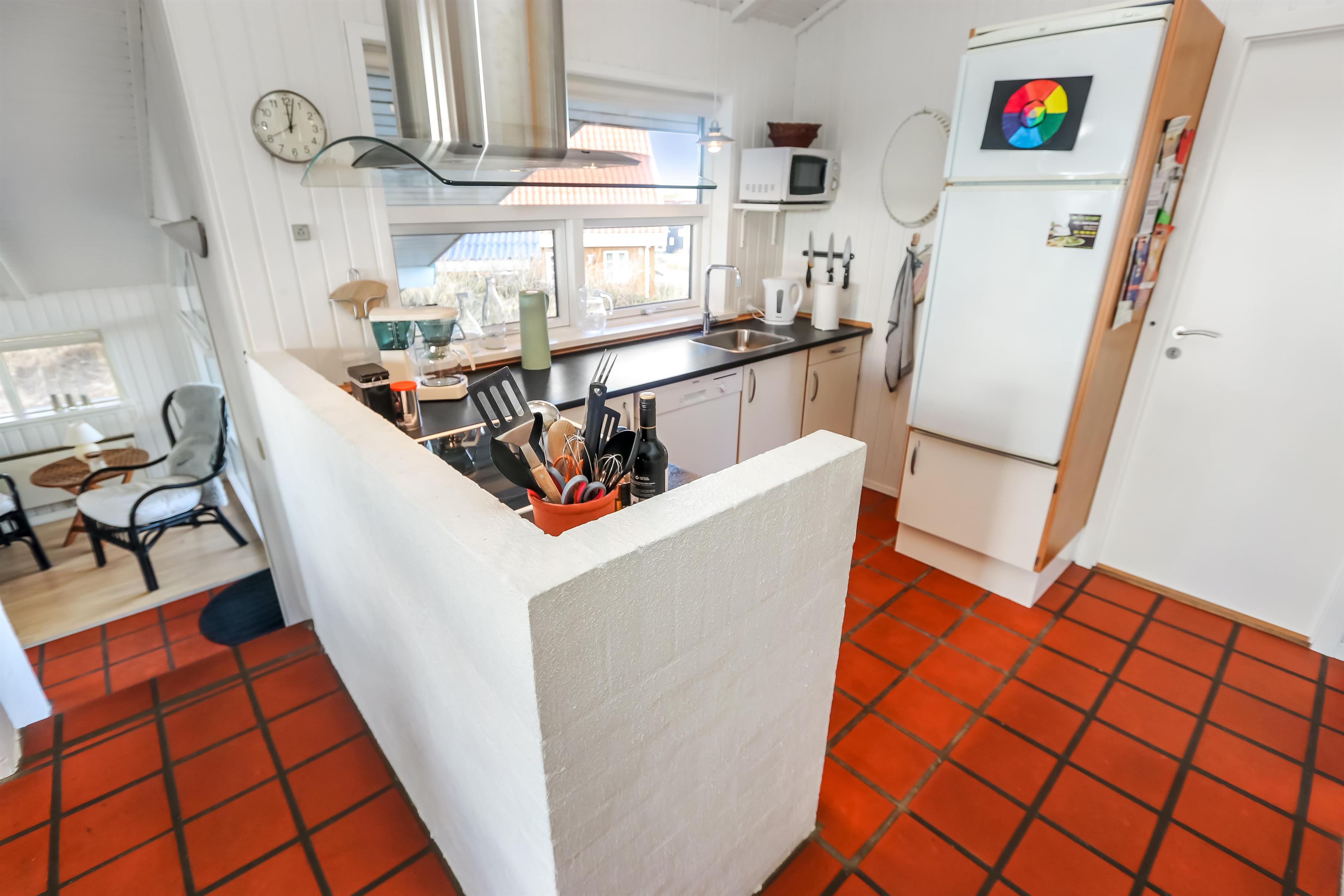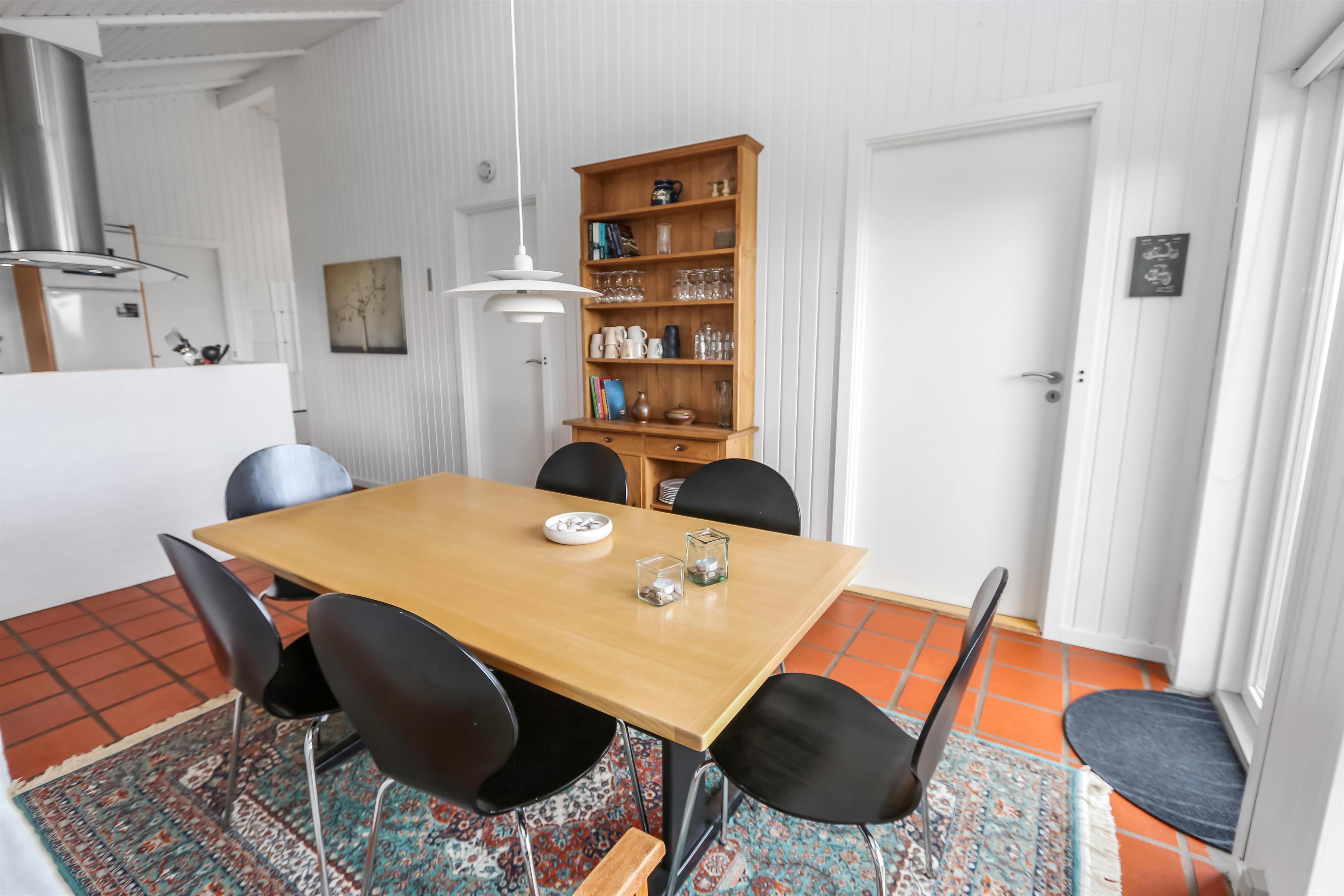 Køkkenet går sammen med et alrum hvor spisebordet står. Selve køkkenet har det man har brug for: Emhætte, glaskeramisk komfur, køle-/fryseskab, mikrobølgeovn samt opvaskemaskine og separat fryser på 35 liter. Herfra køkken-alrummet kan man gå direkte ud på den sydvendte terrasse om man vil. Man kan også gå et plateau ned via nogle få trappetrin til selve stuen, som har et hyggeligt møblement man hygge sig i. Her er brændeovn, fjernsyn med parabol(tyske kanaler på parabolen) og DVD-afspiller. Fra stuen er der udgang til den delvist overdækkede nordvestvendte terrasse. Der er 4 soveværelser hvor der er 2 med dobbeltsenge og 2 med en enkeltseng i hver. Så det er et af de sjældnere huse hvor man kan få eneværelse hvis nogle ønsker dette. Fra entreen kan man gå ind på badeværelset som indeholder bruser, toilet og håndvask. Herudover er der en sauna med elektrisk ovn. Der er gratis trådløst internetadgang i huset og varmepumpe installeret i stuen.