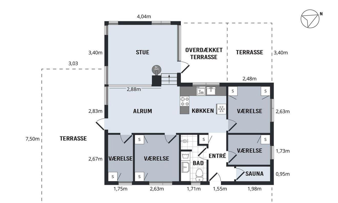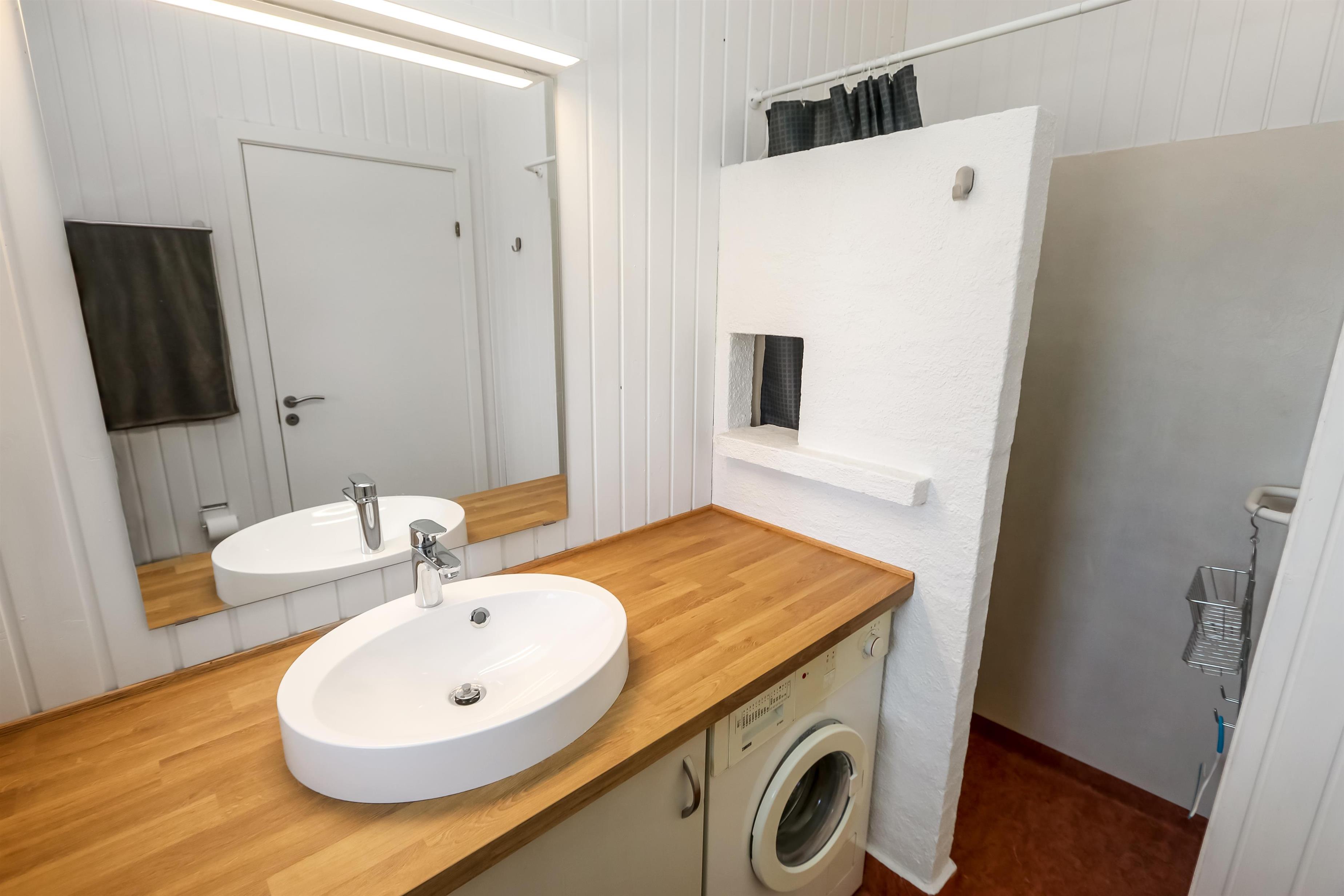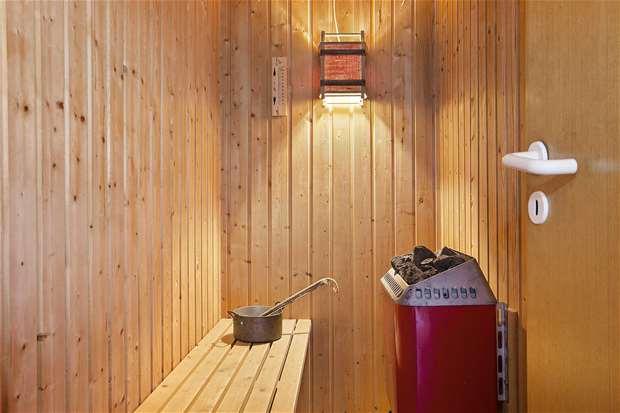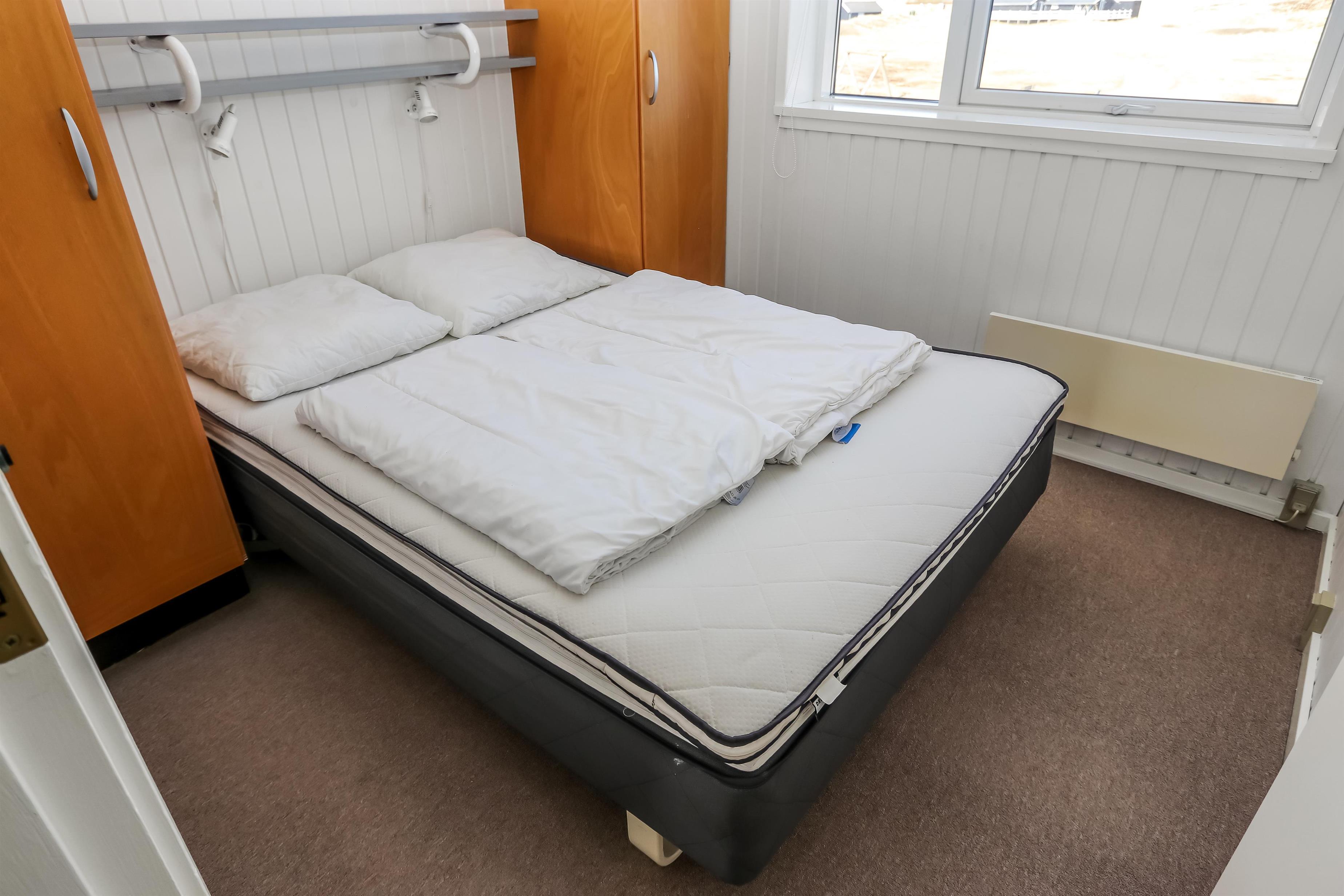 Køkkenet går sammen med et alrum hvor spisebordet står. Selve køkkenet har det man har brug for: Emhætte, glaskeramisk komfur, køle-/fryseskab, mikrobølgeovn samt opvaskemaskine og separat fryser på 35 liter. Herfra køkken-alrummet kan man gå direkte ud på den sydvendte terrasse om man vil. Man kan også gå et plateau ned via nogle få trappetrin til selve stuen, som har et hyggeligt møblement man hygge sig i. Her er brændeovn, fjernsyn med parabol(tyske kanaler på parabolen) og DVD-afspiller. Fra stuen er der udgang til den delvist overdækkede nordvestvendte terrasse. Der er 4 soveværelser hvor der er 2 med dobbeltsenge og 2 med en enkeltseng i hver. Så det er et af de sjældnere huse hvor man kan få eneværelse hvis nogle ønsker dette. Fra entreen kan man gå ind på badeværelset som indeholder bruser, toilet og håndvask. Herudover er der en sauna med elektrisk ovn. Der er gratis trådløst internetadgang i huset og varmepumpe installeret i stuen.