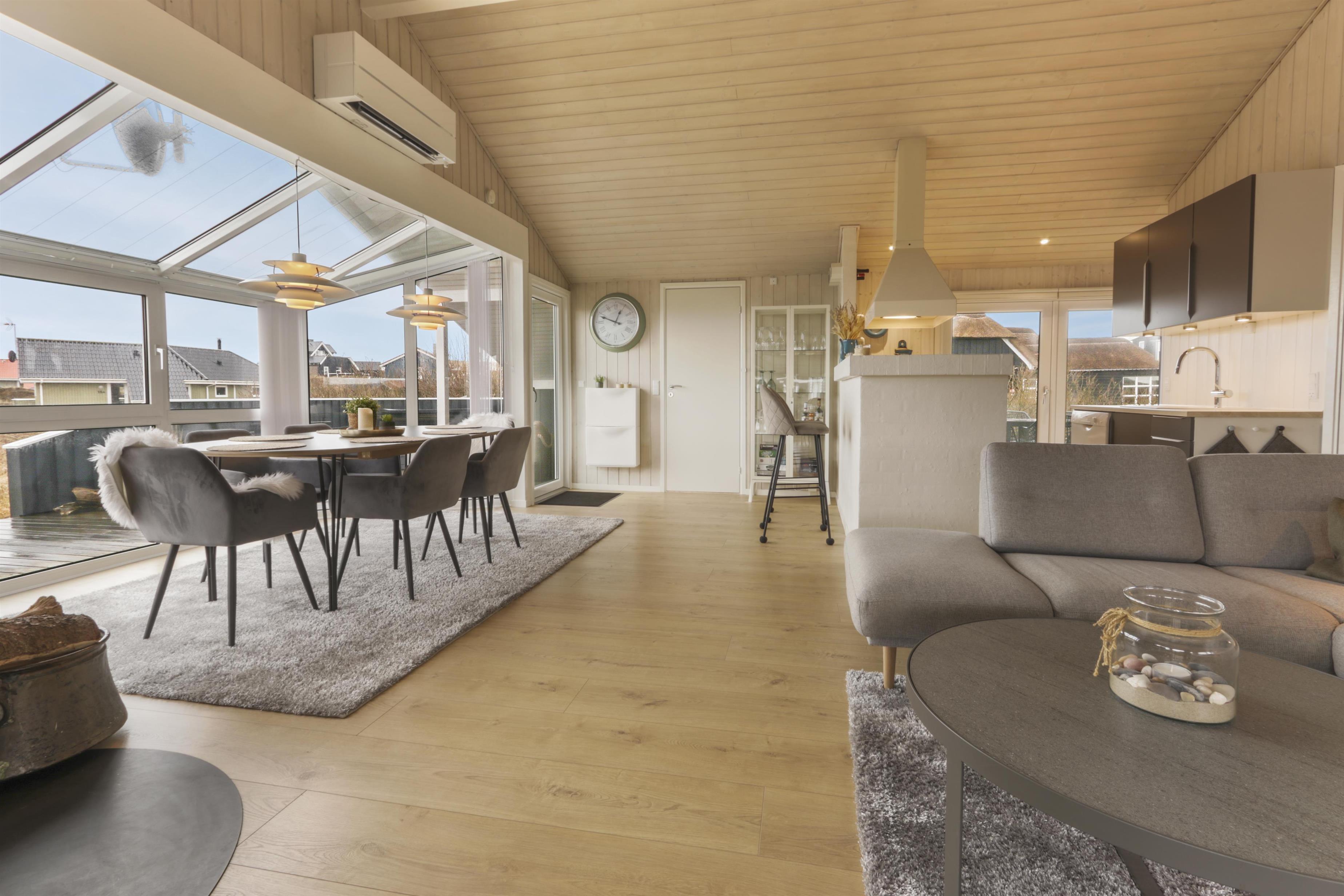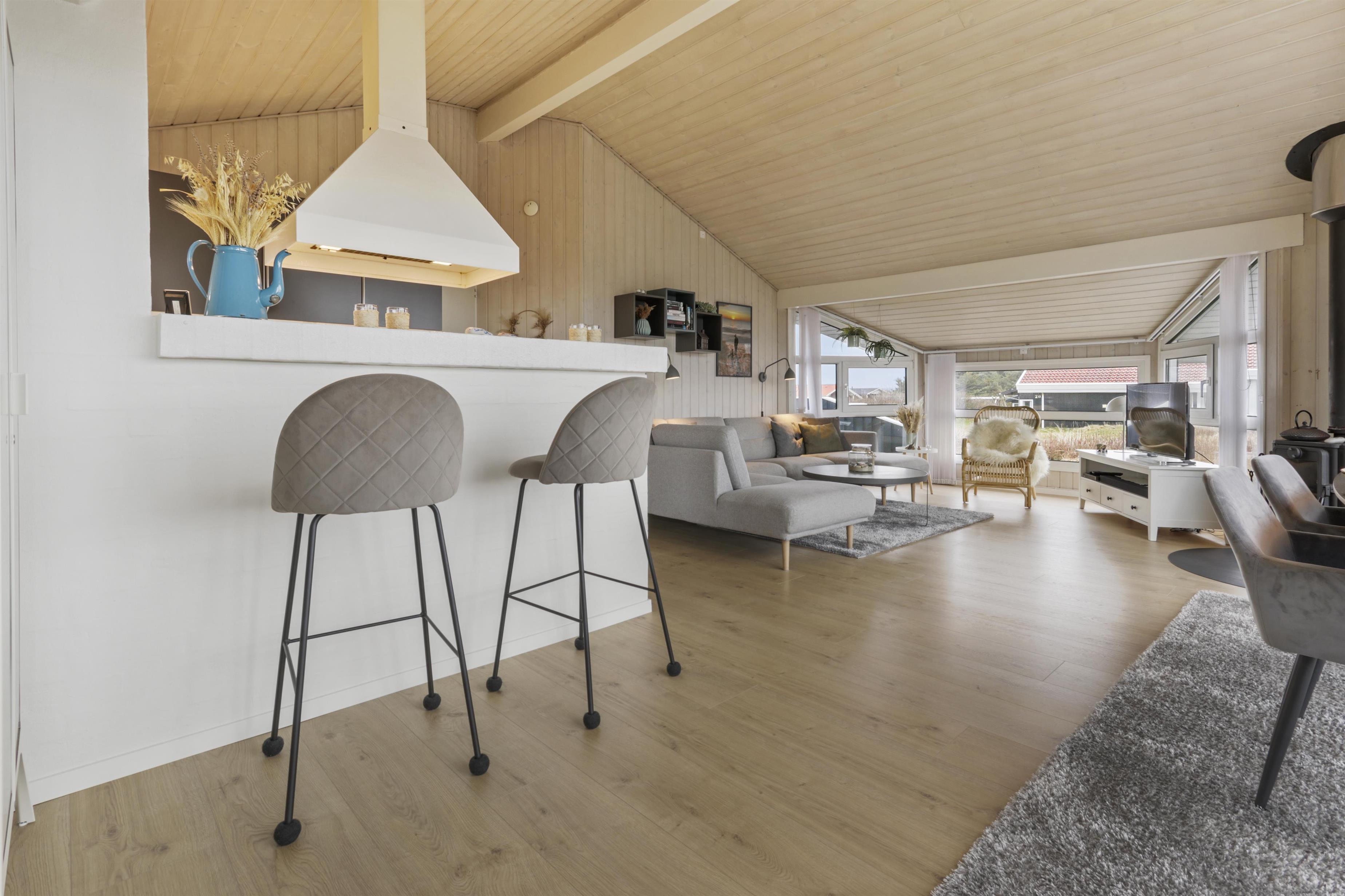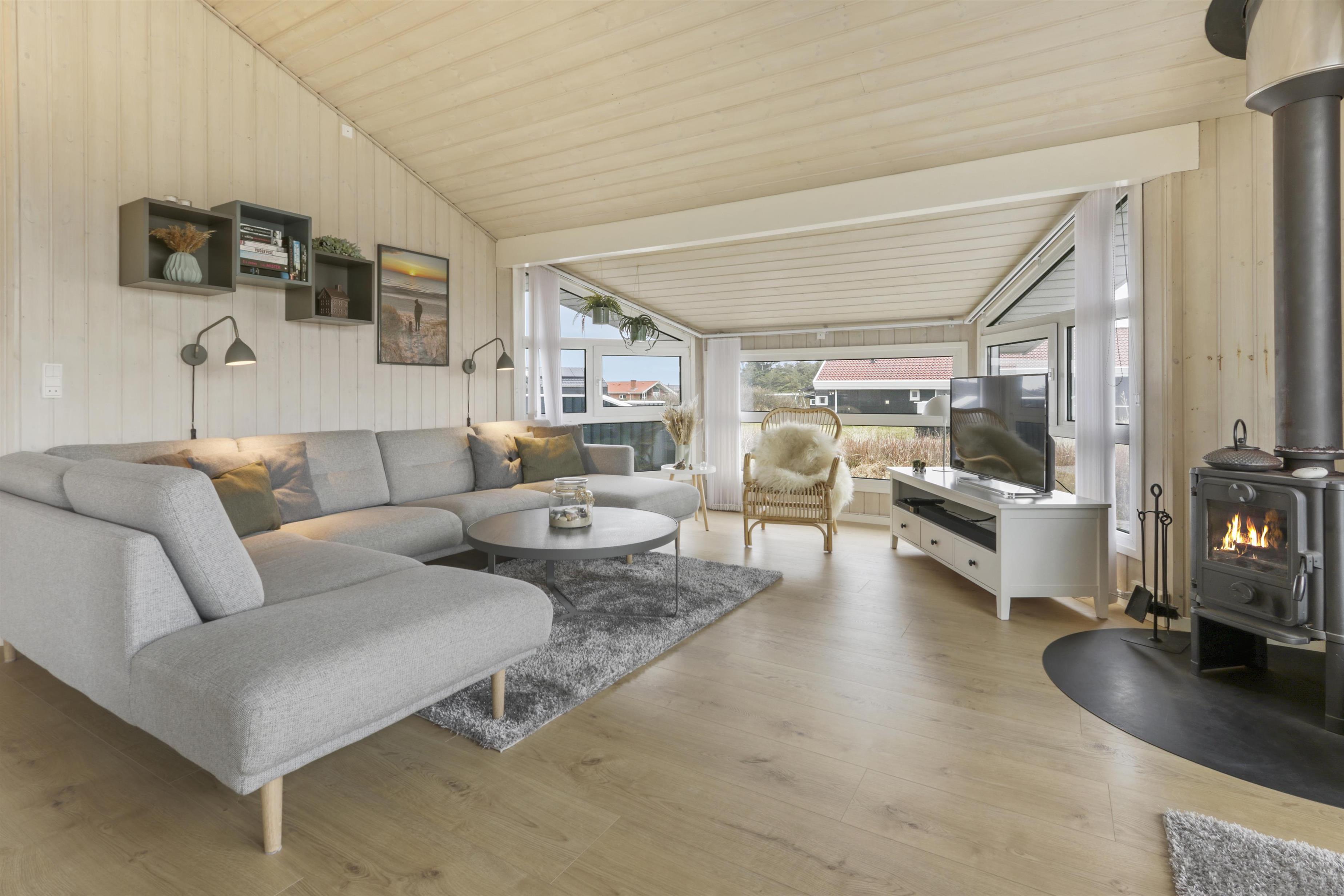 Huset har store vinduespartier og det gør derfor huset særdeles lyst og venligt. Køkken og stue er i samme rum og køkkenet har induktionsplade, ovn, opvaskemaskine, mikrobølgeovn, køleskab (204 liter) og fryser (96 liter). Stuedelen er dejlig rumlig og indeholder spisebord, hjørnesofa med sofabord, brændeovn samt fladskærm med DR1, Chromecast samt tyske TV-kanaler. Endvidere er der en DVD-afspiller og Bluetooth lydsystem, hvis man ønsker baggrundsmusik til hyggen.