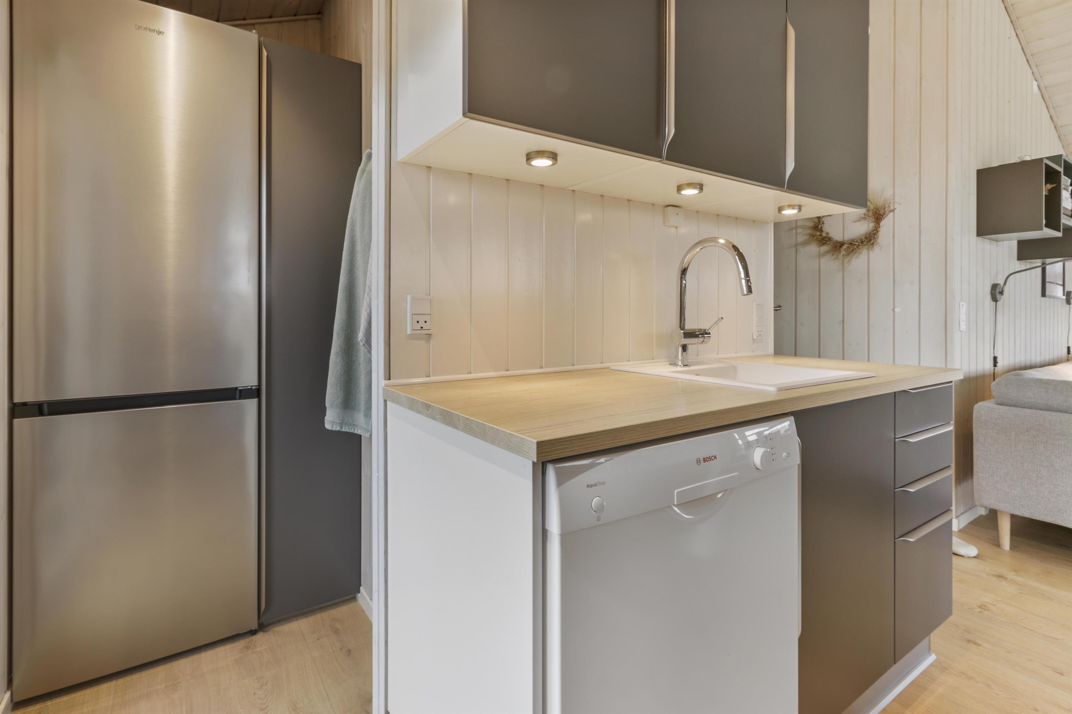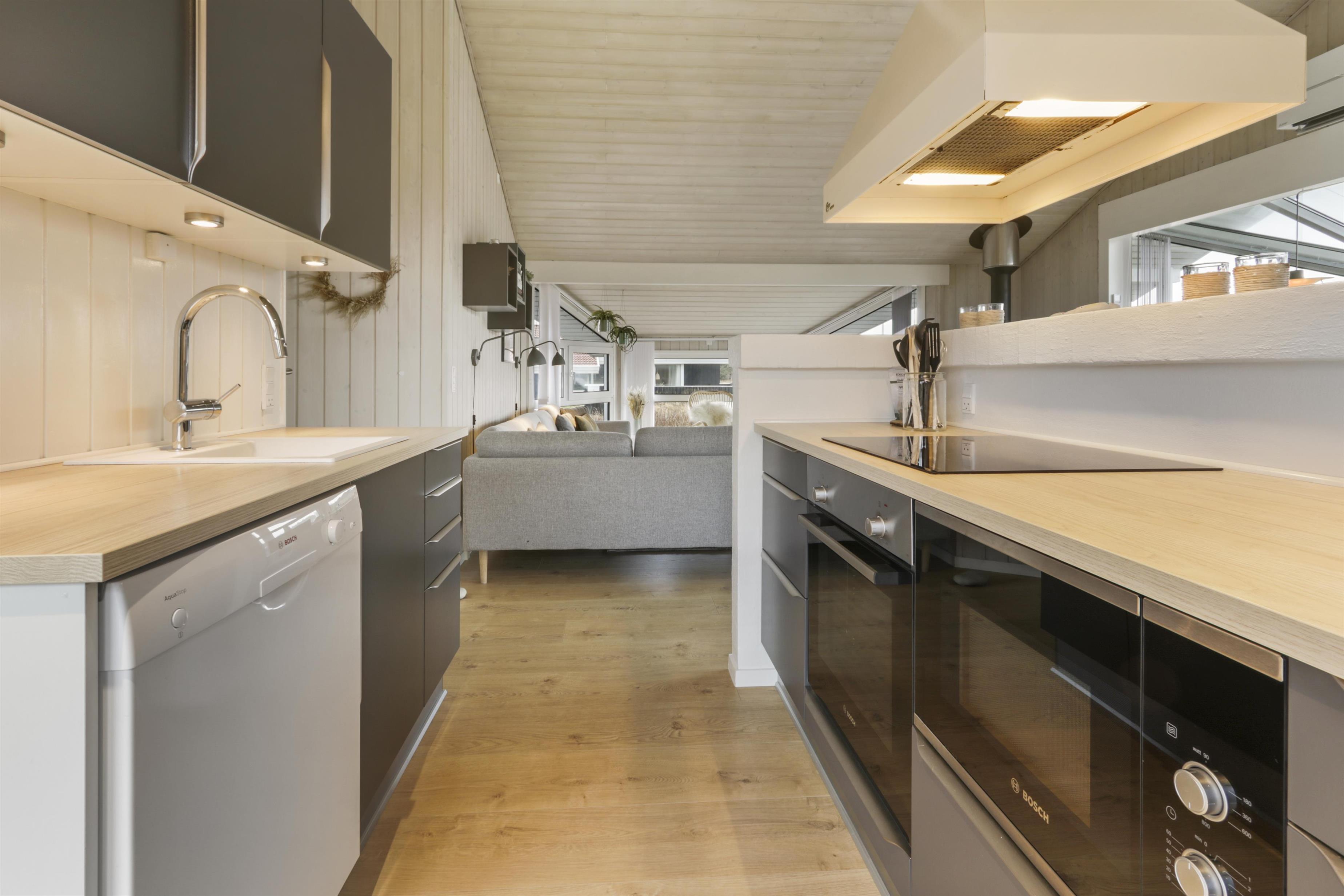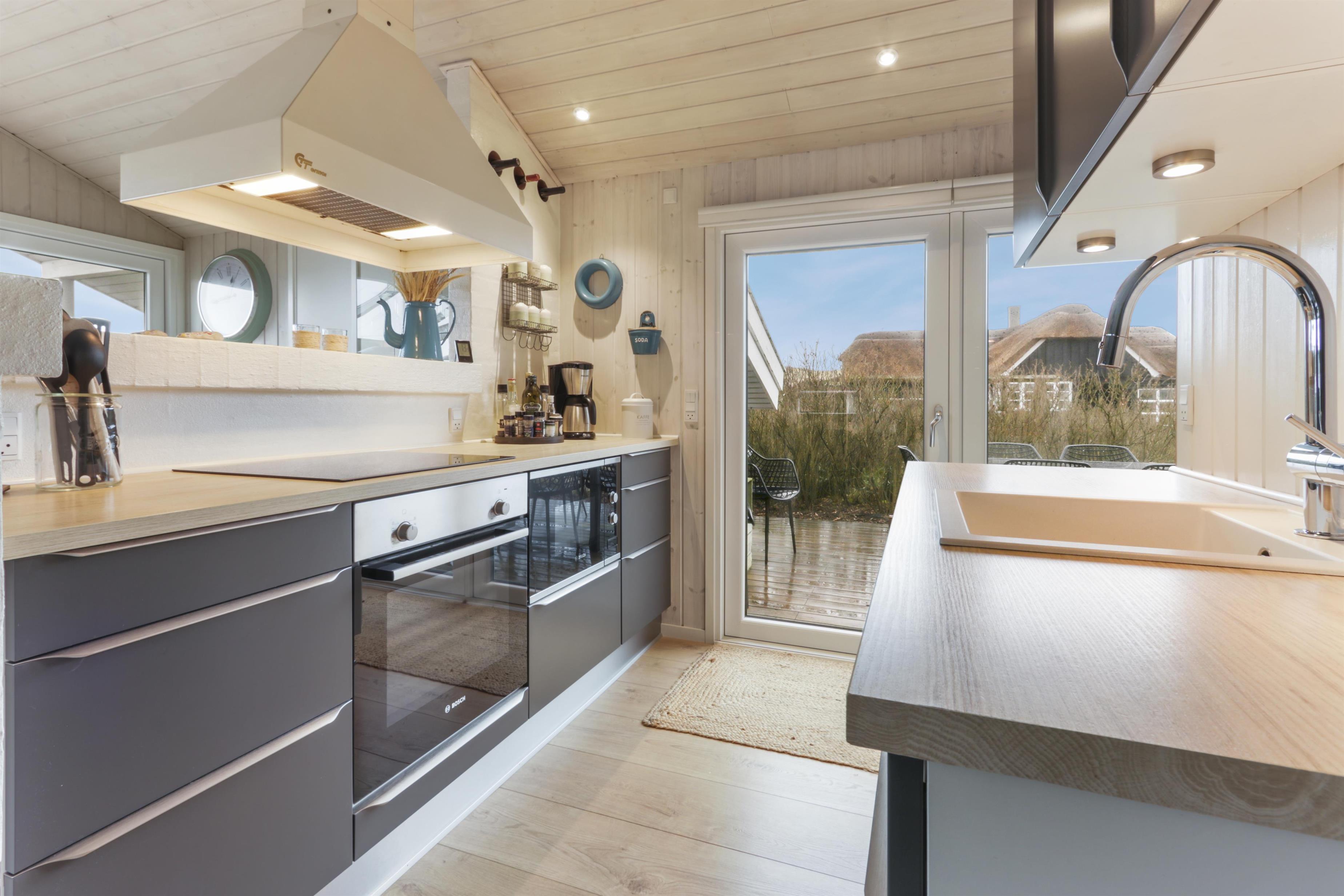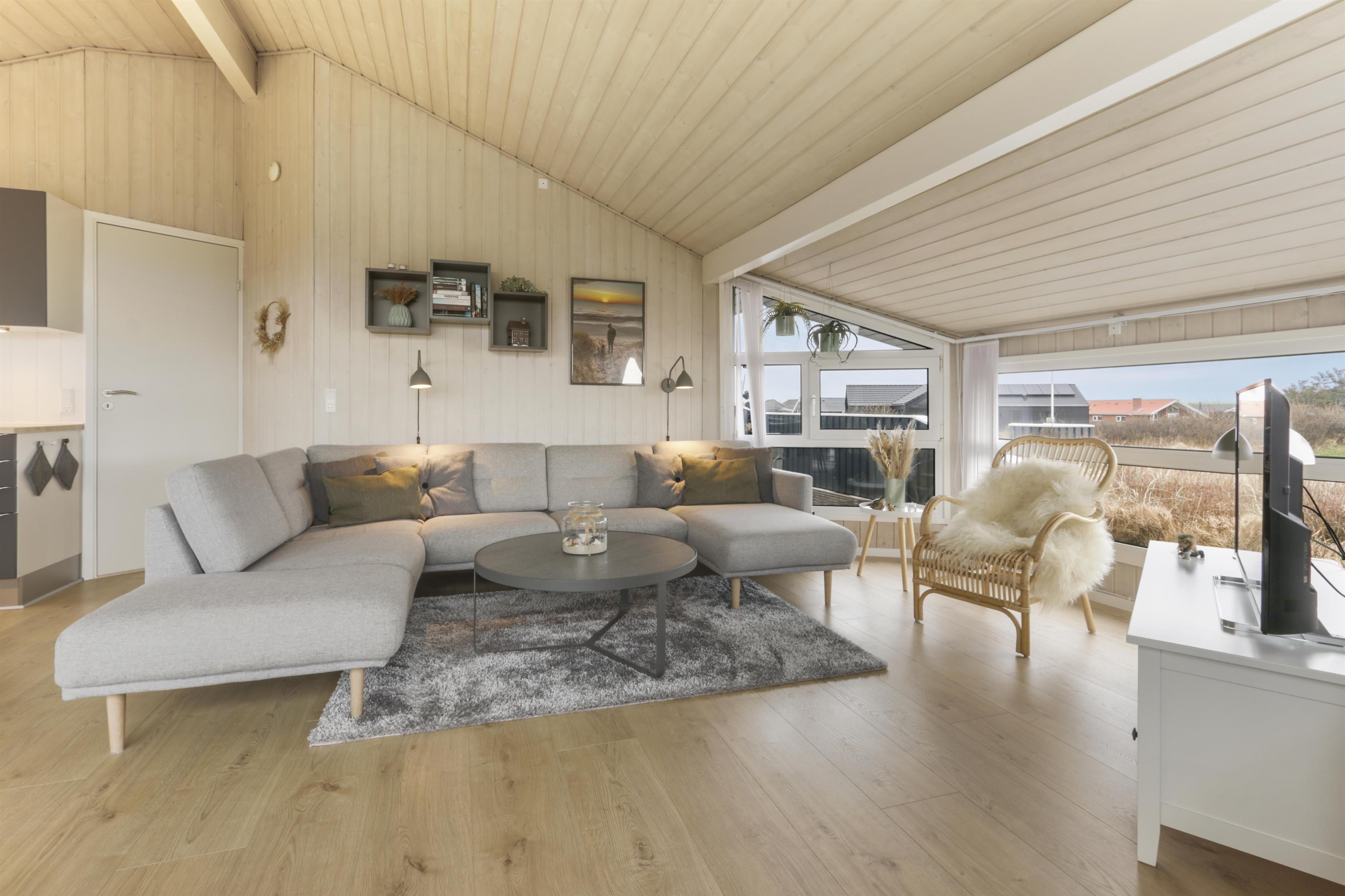 Huset har store vinduespartier og det gør derfor huset særdeles lyst og venligt. Køkken og stue er i samme rum og køkkenet har induktionsplade, ovn, opvaskemaskine, mikrobølgeovn, køleskab (204 liter) og fryser (96 liter). Stuedelen er dejlig rumlig og indeholder spisebord, hjørnesofa med sofabord, brændeovn samt fladskærm med DR1, Chromecast samt tyske TV-kanaler. Endvidere er der en DVD-afspiller og Bluetooth lydsystem, hvis man ønsker baggrundsmusik til hyggen.
