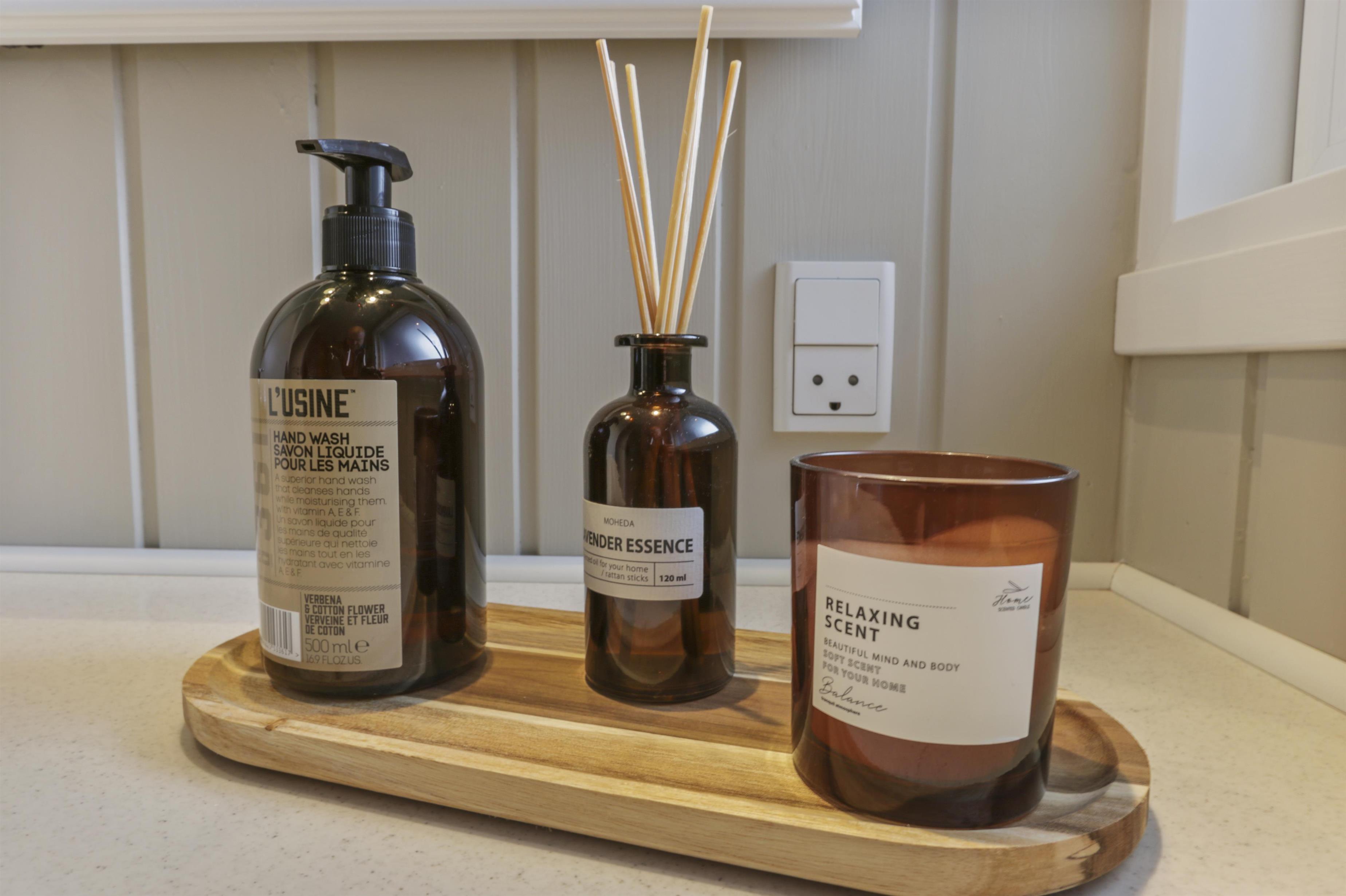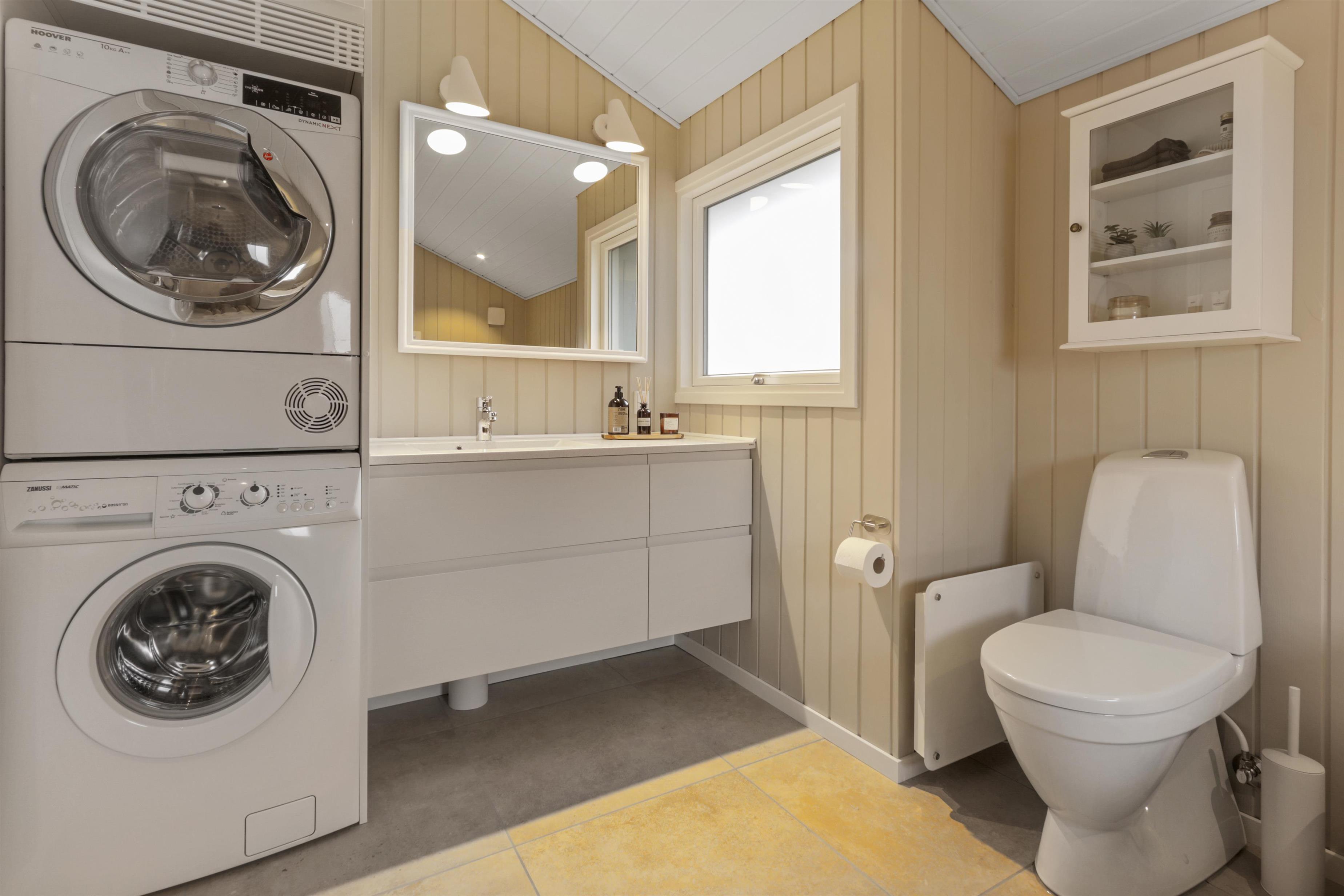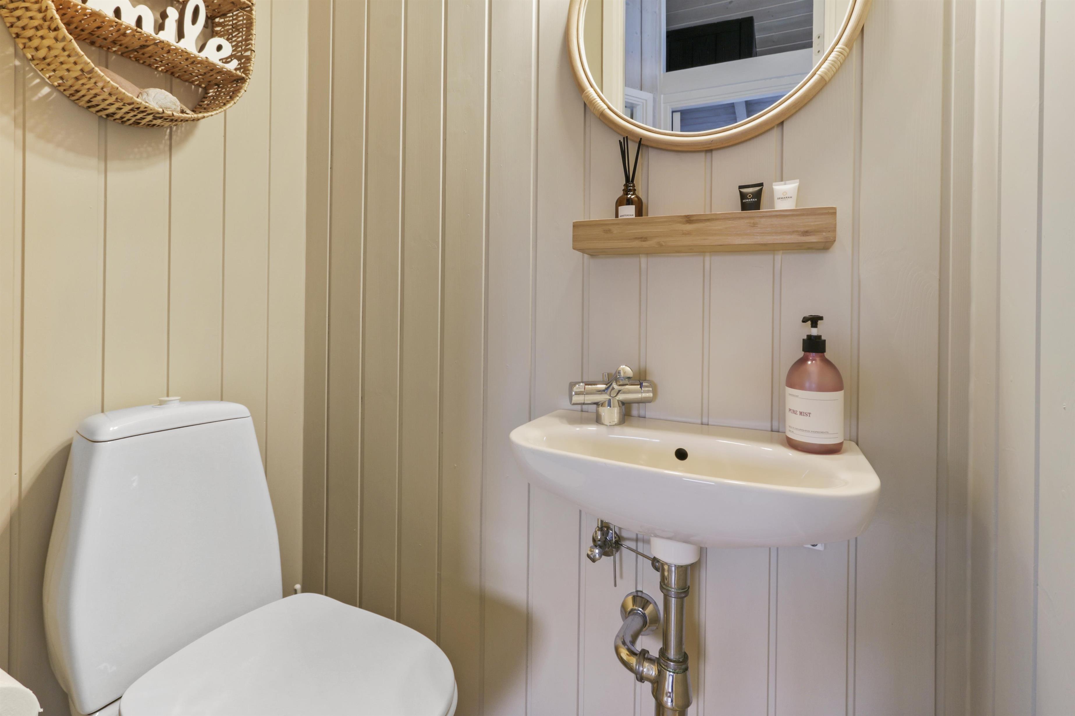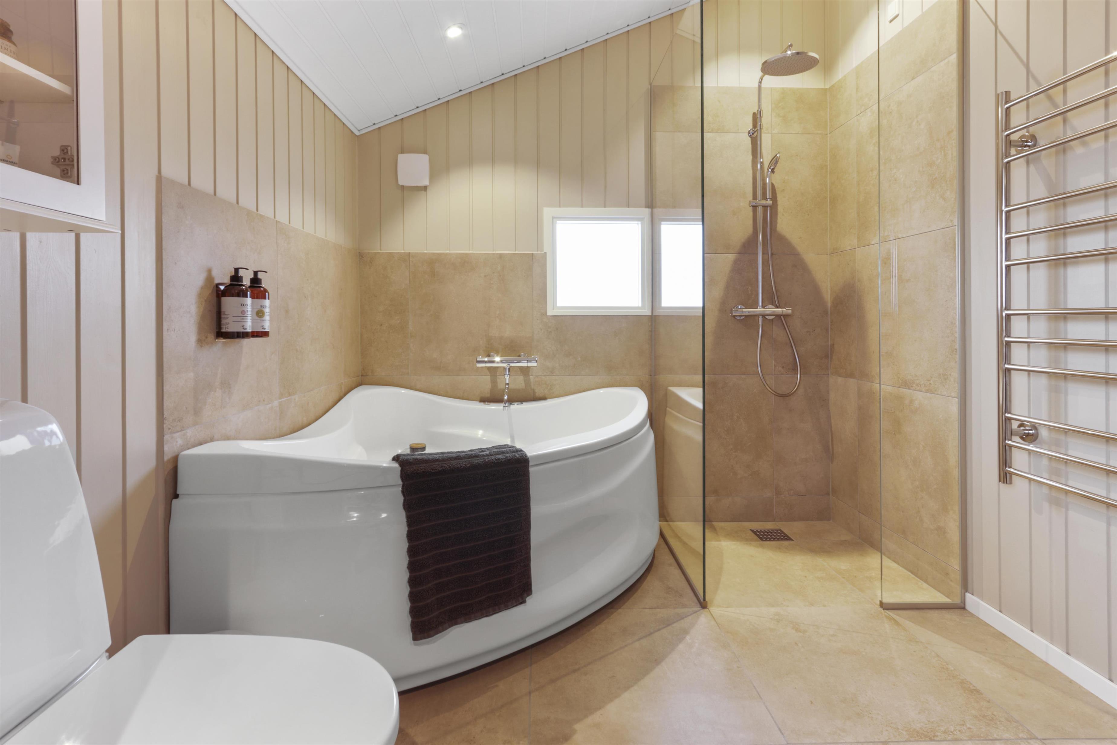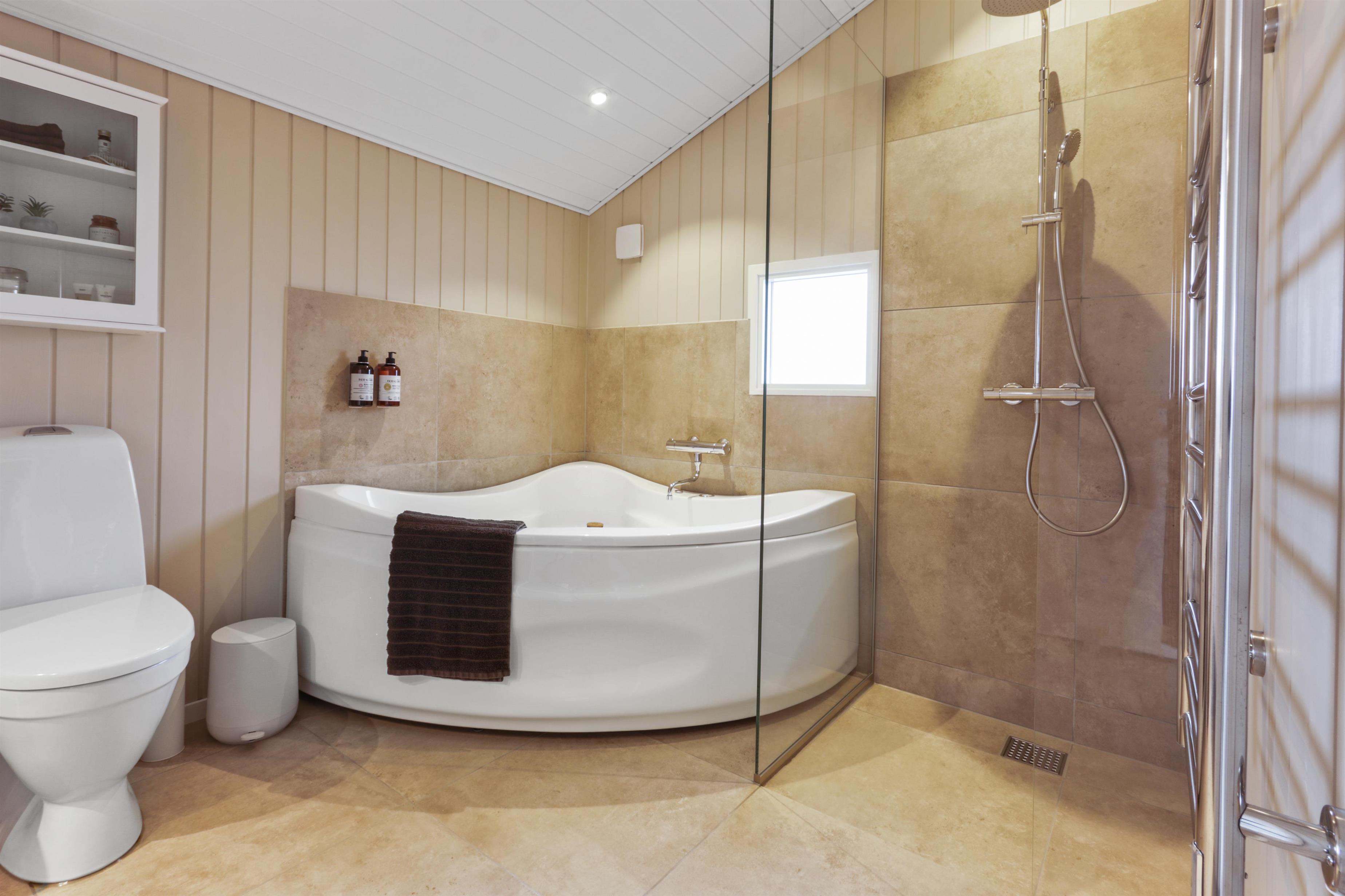 Badeværelset er indbydende og har gulvvarme, håndvask, bruser og spabad. Der er tilmed et ekstra badeværelse med toilet og håndvask og det er ofte en luksus man sætter pris på om morgenen.