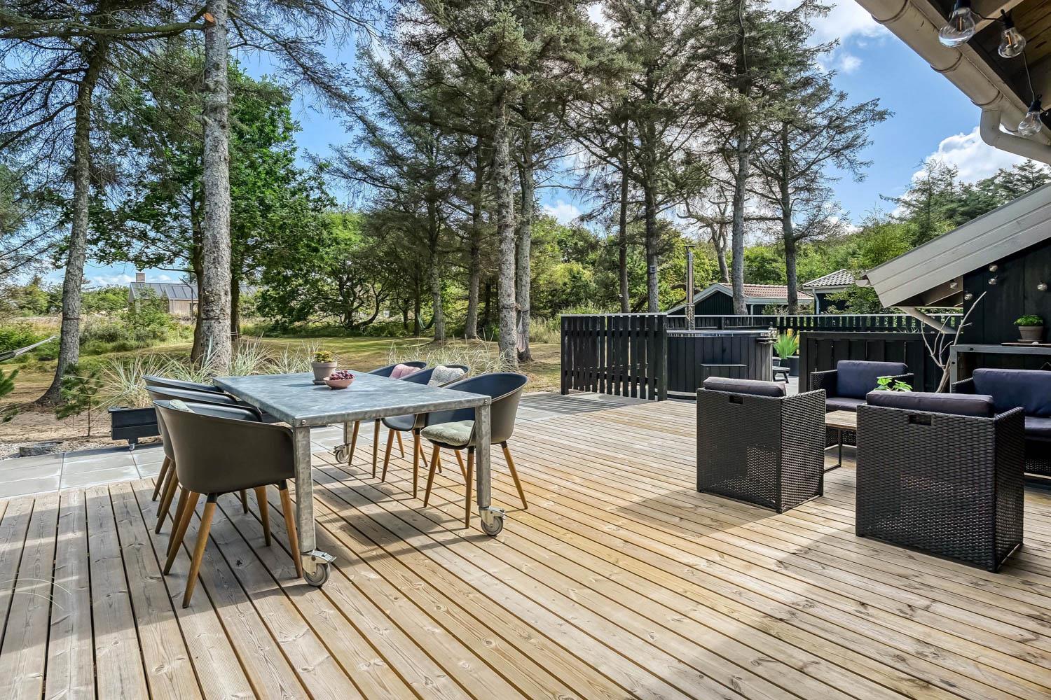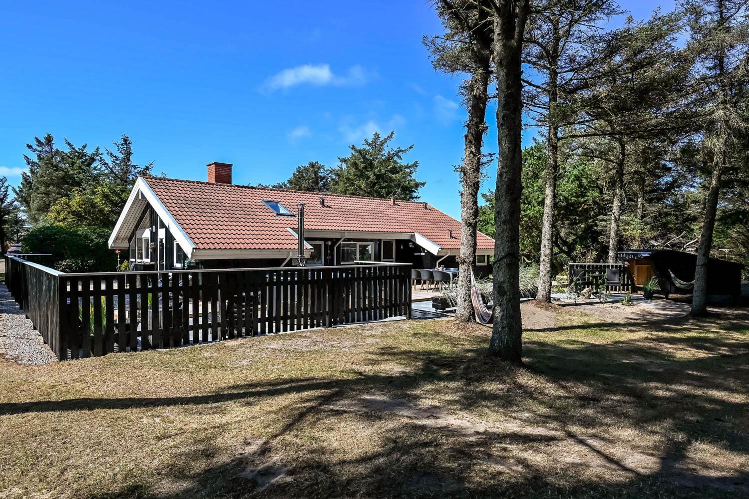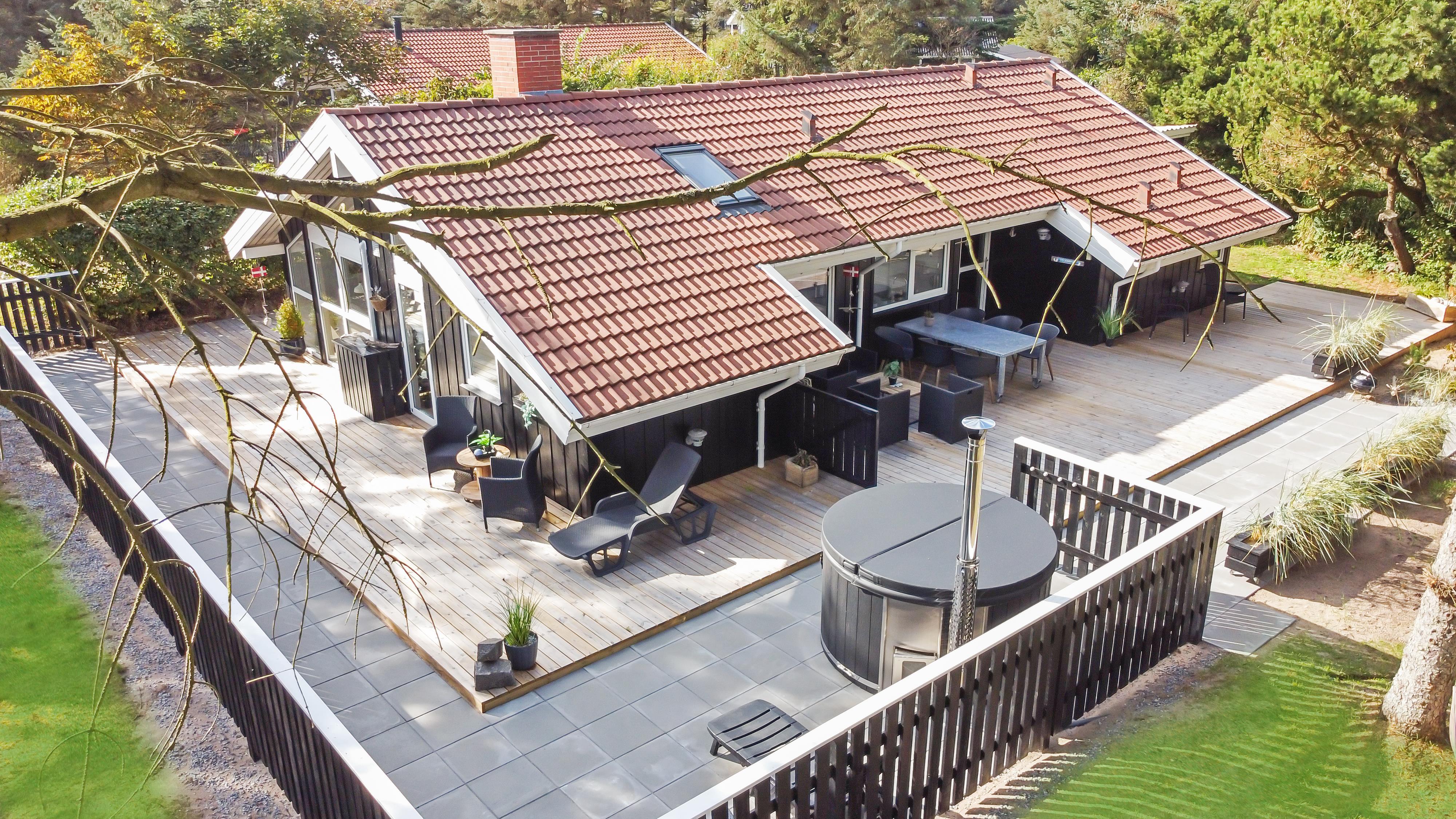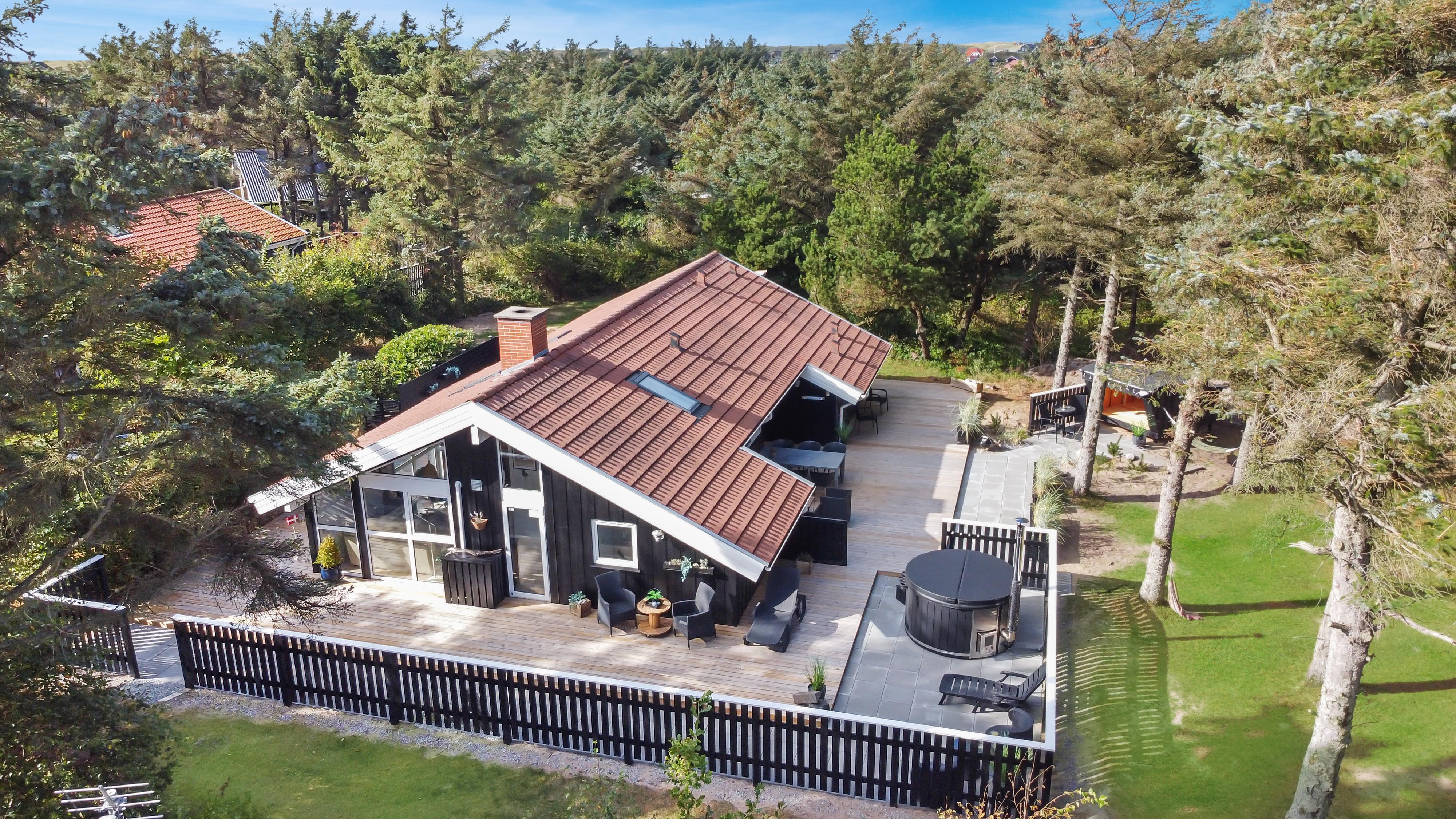 Dette skønne feriehus er beliggende på en fantastisk sydvendt grund på ca. 1.200 m2 med mange solkroge og mulighed for læ. Der er kun 350 meter fra Vesterhavet i det populære område Viktoriavej. Der er en stor terrasse med havemøbler, solvogne og grill, og det er altid muligt at finde en plads i solen. Som noget ganske specielt er der på den private grund også en wellnessafdeling udenfor med et udendørs vildmarksbad, som opvarmes med brænde. Få meter fra terrassen står den hyggelige shelter med plads til fire personer.