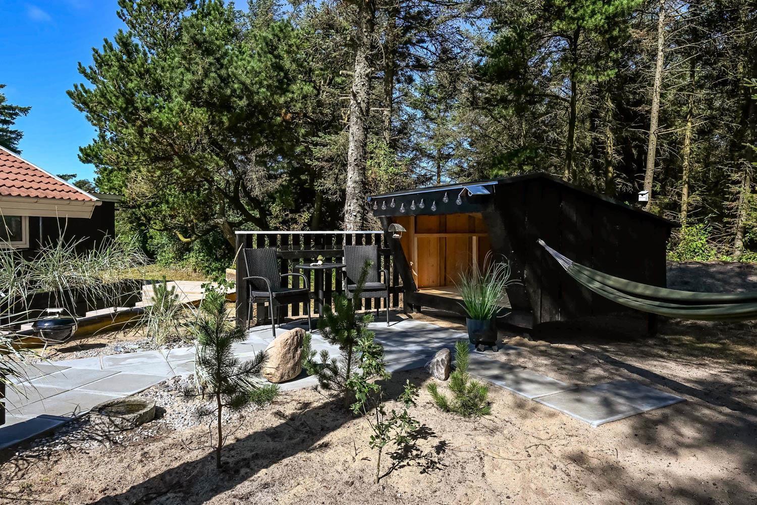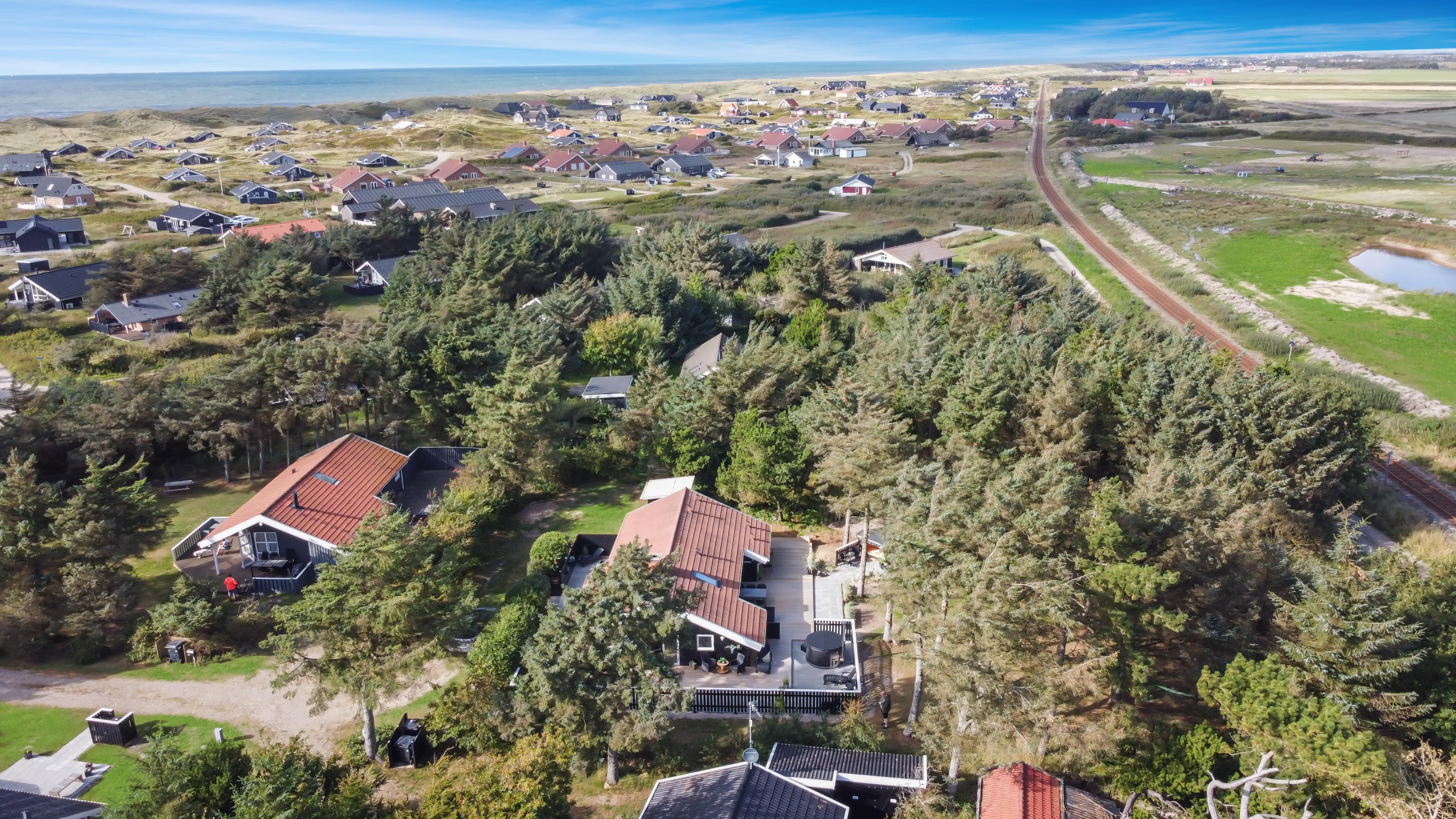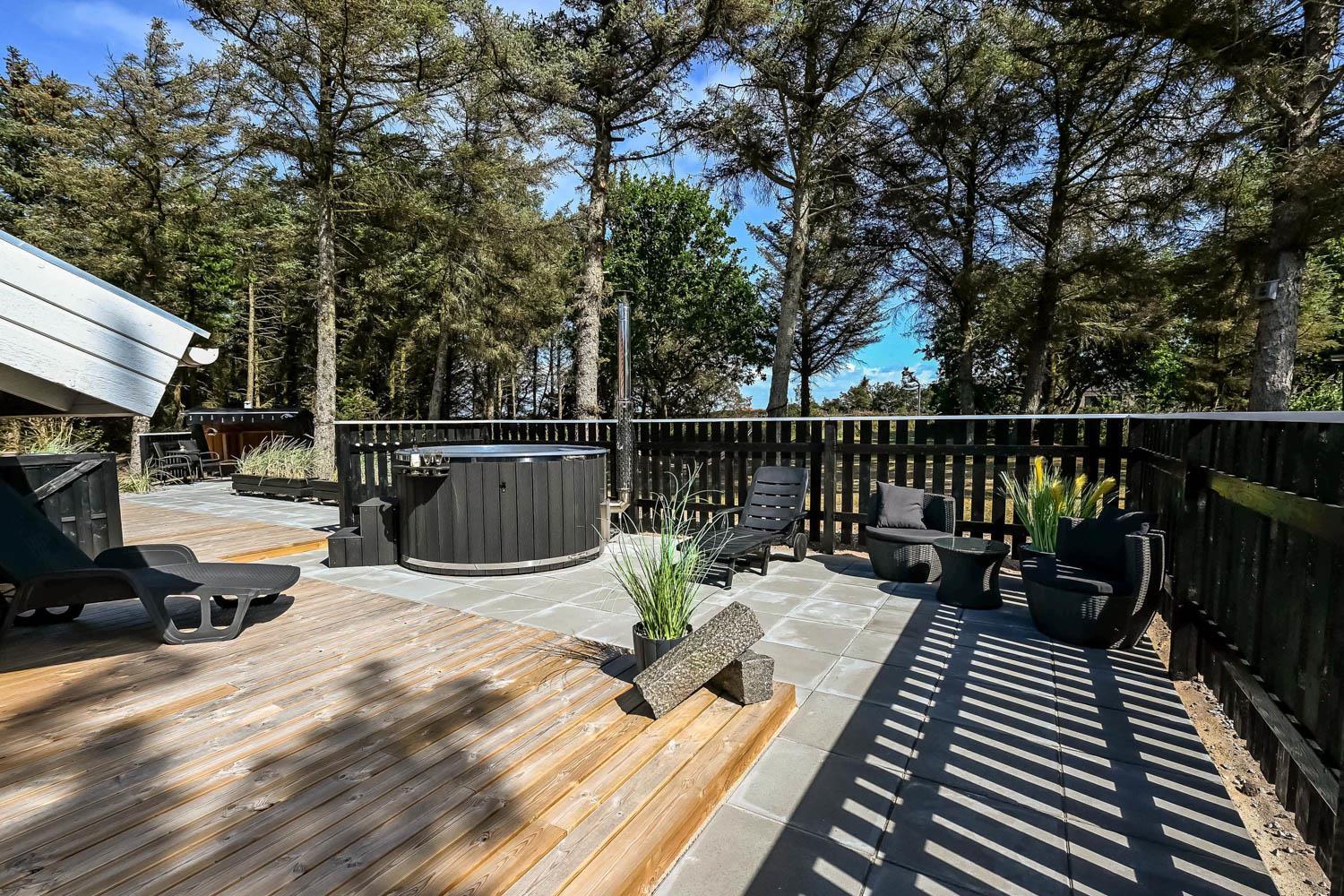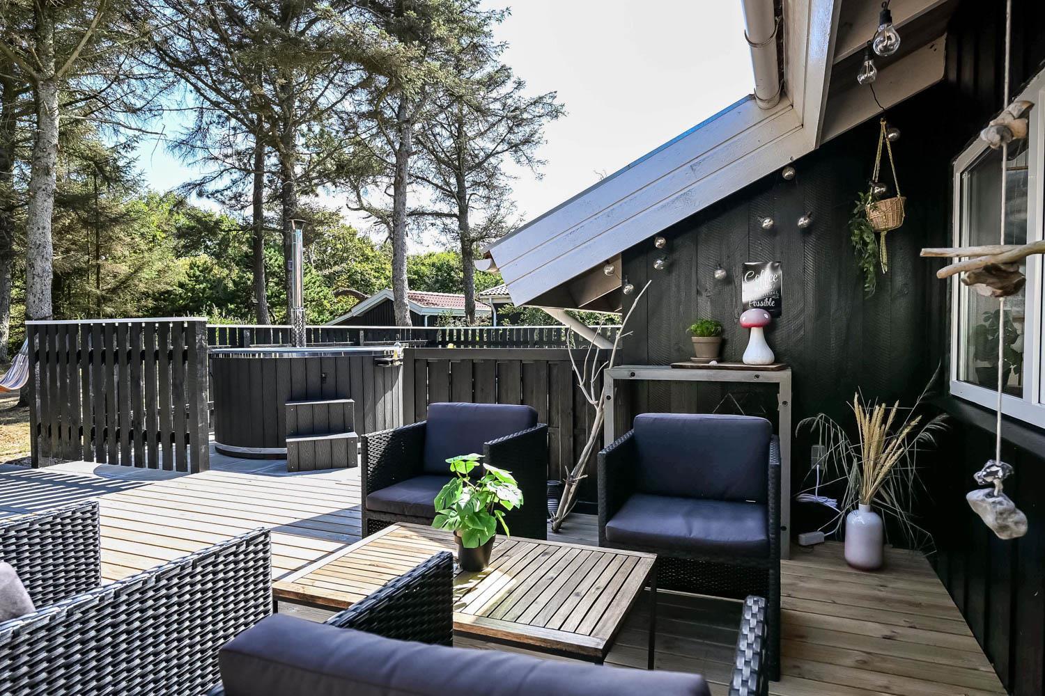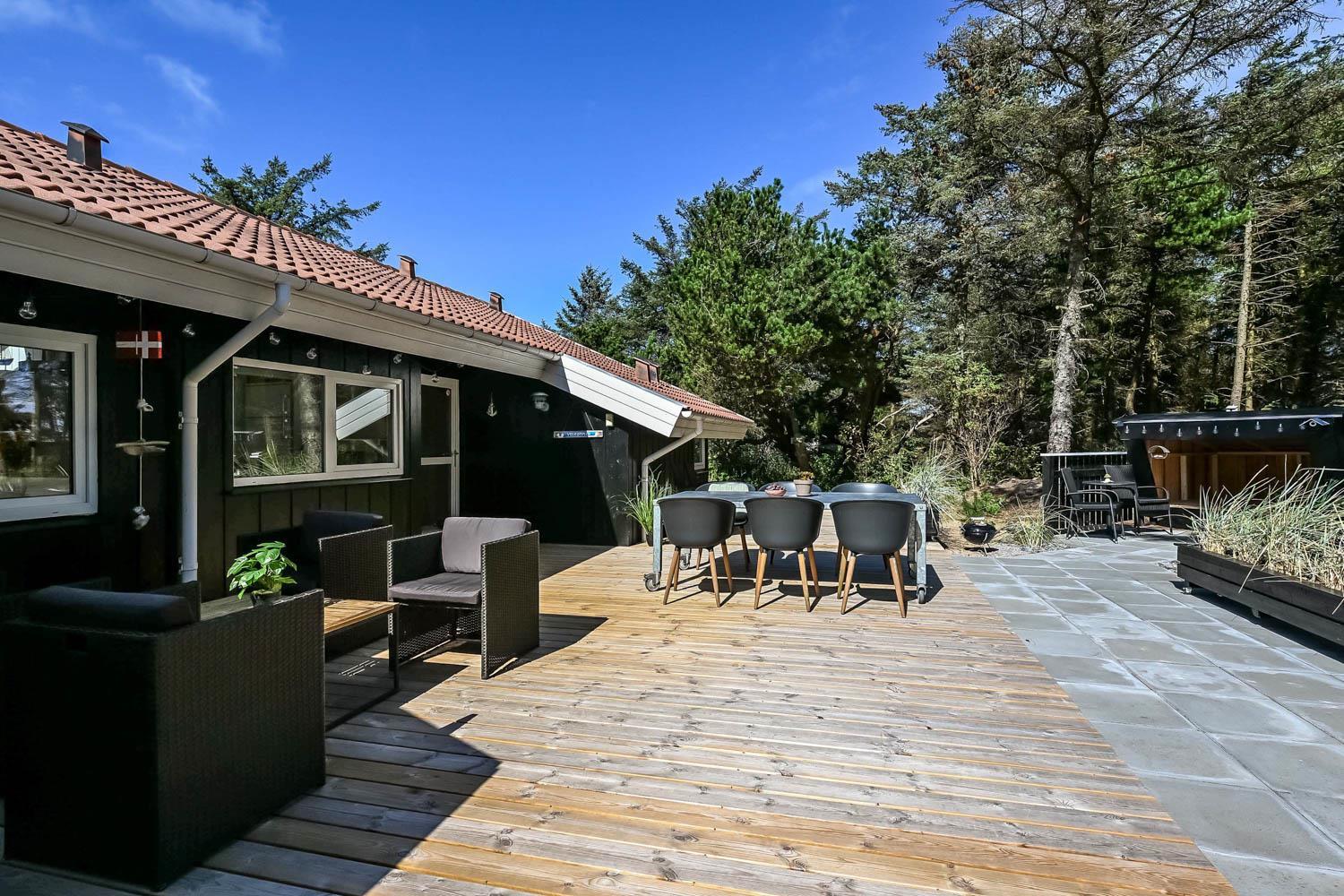 Dette skønne feriehus er beliggende på en fantastisk sydvendt grund på ca. 1.200 m2 med mange solkroge og mulighed for læ. Der er kun 350 meter fra Vesterhavet i det populære område Viktoriavej. Der er en stor terrasse med havemøbler, solvogne og grill, og det er altid muligt at finde en plads i solen. Som noget ganske specielt er der på den private grund også en wellnessafdeling udenfor med et udendørs vildmarksbad, som opvarmes med brænde. Få meter fra terrassen står den hyggelige shelter med plads til fire personer.