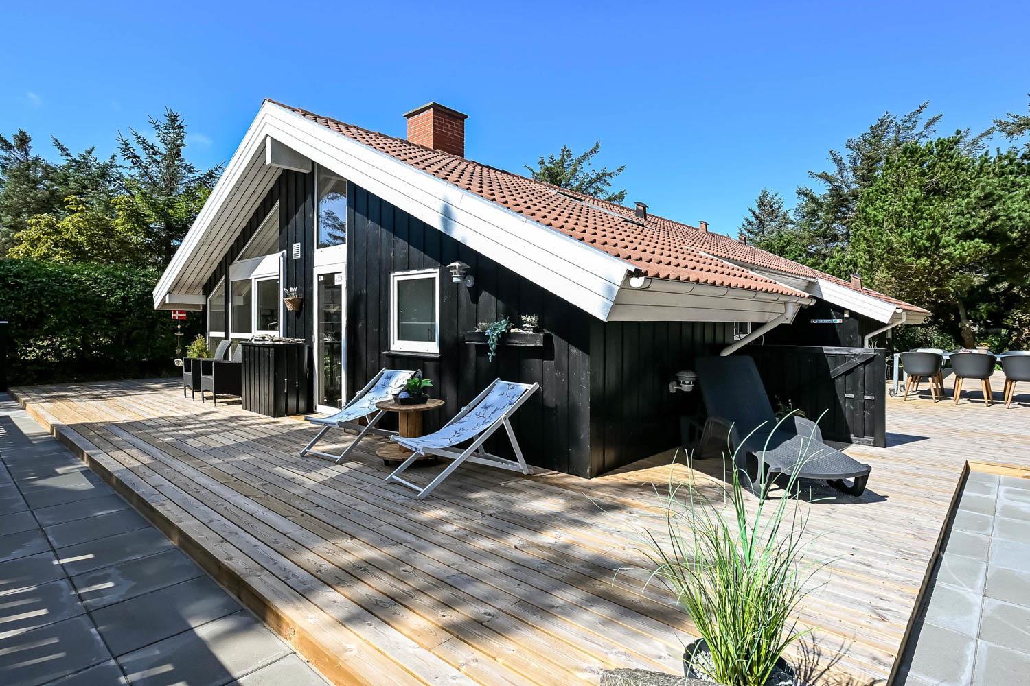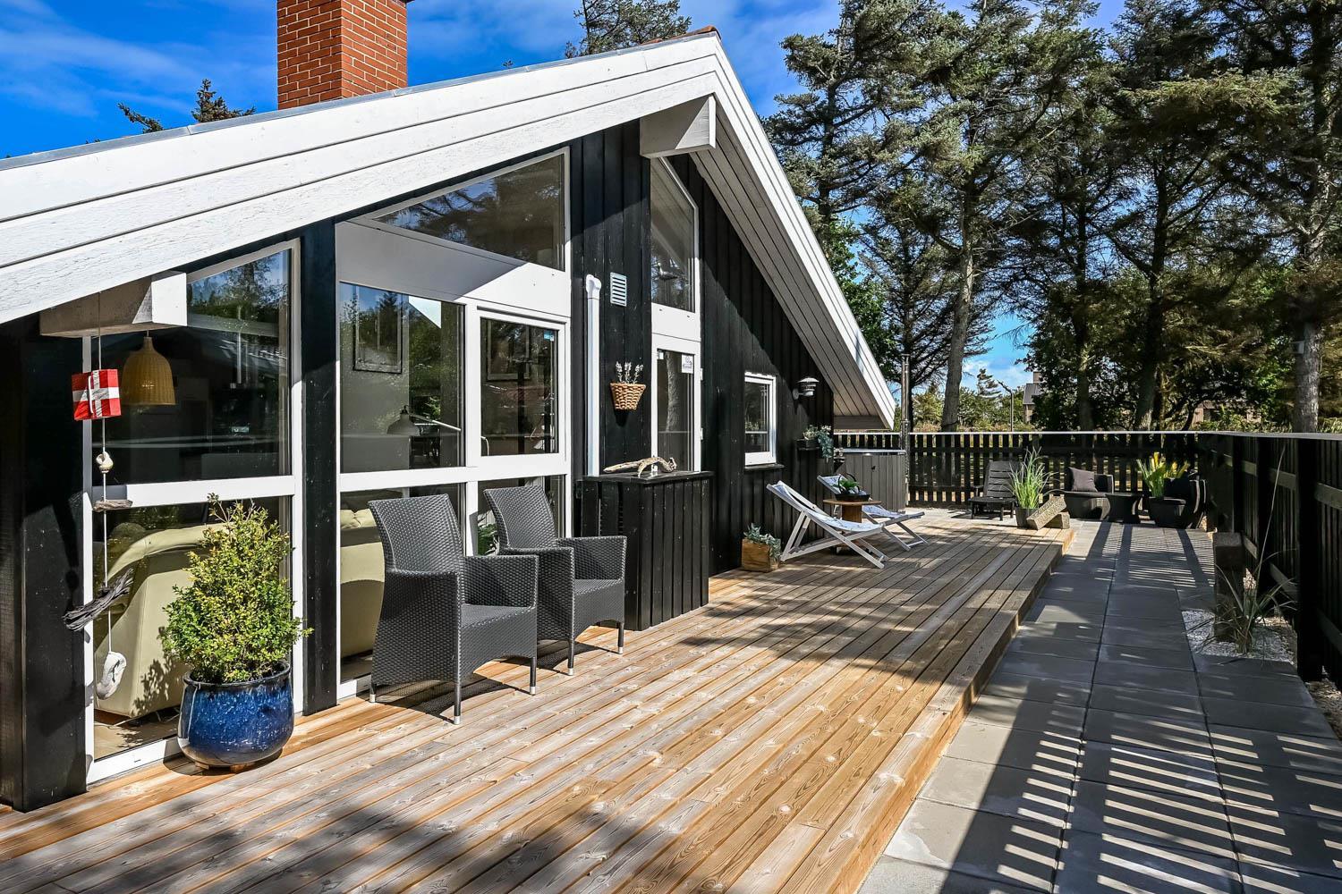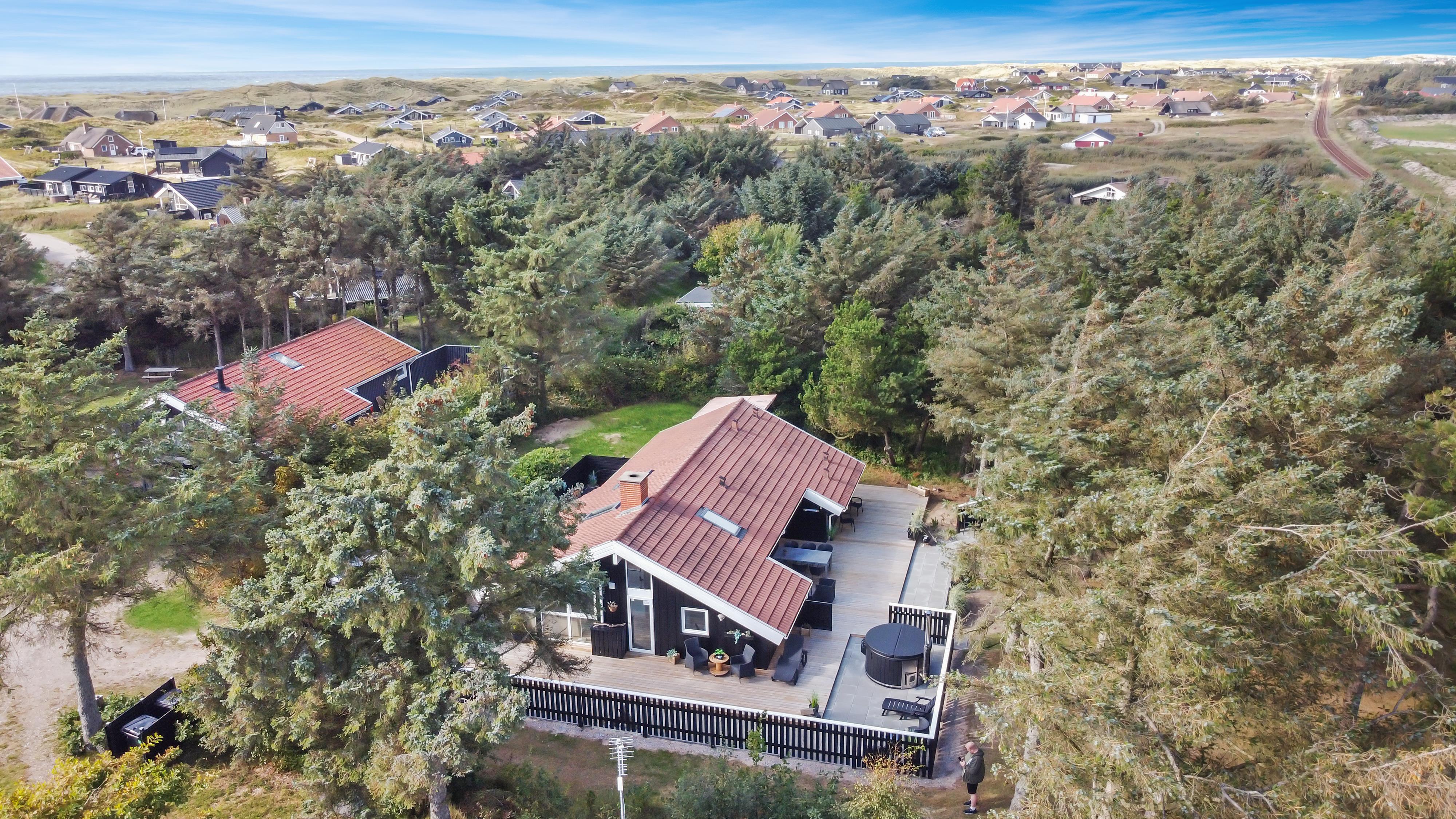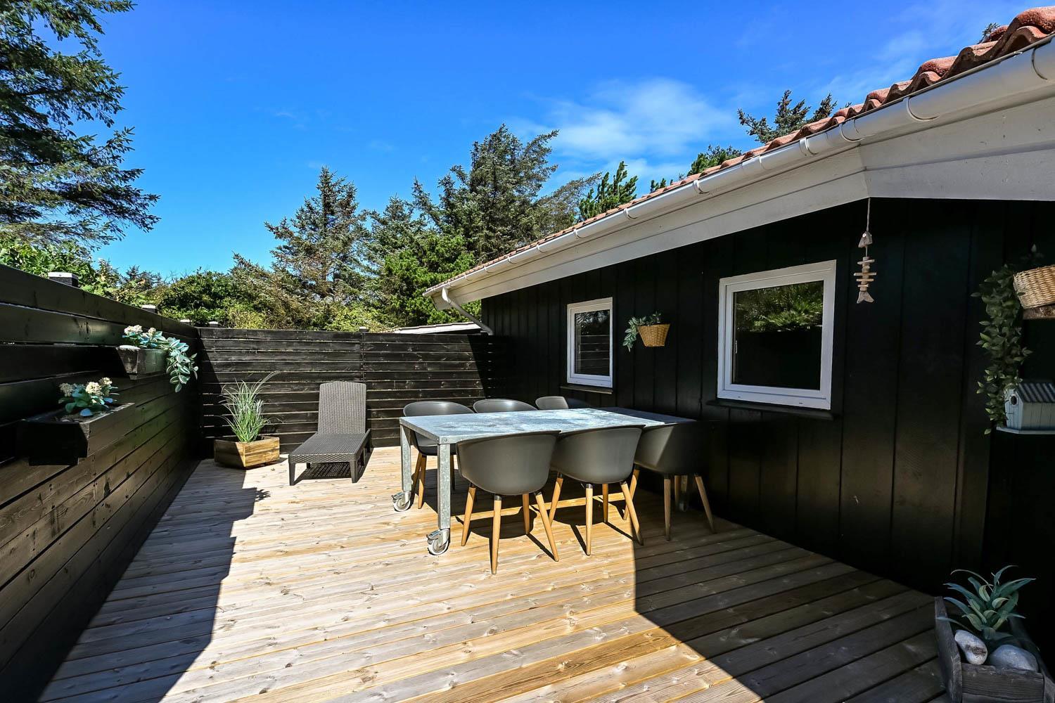 Dette skønne feriehus er beliggende på en fantastisk sydvendt grund på ca. 1.200 m2 med mange solkroge og mulighed for læ. Der er kun 350 meter fra Vesterhavet i det populære område Viktoriavej. Der er en stor terrasse med havemøbler, solvogne og grill, og det er altid muligt at finde en plads i solen. Som noget ganske specielt er der på den private grund også en wellnessafdeling udenfor med et udendørs vildmarksbad, som opvarmes med brænde. Få meter fra terrassen står den hyggelige shelter med plads til fire personer.