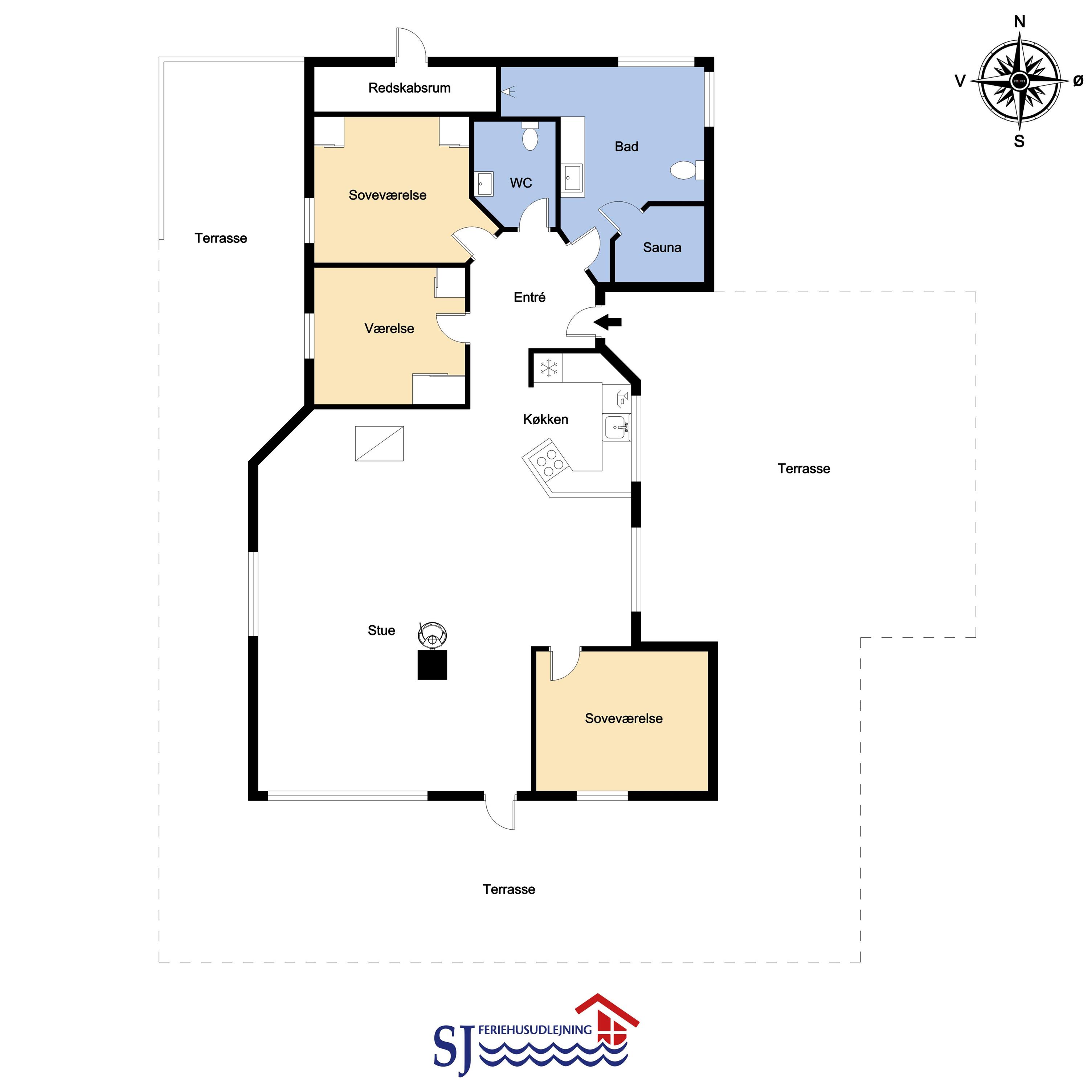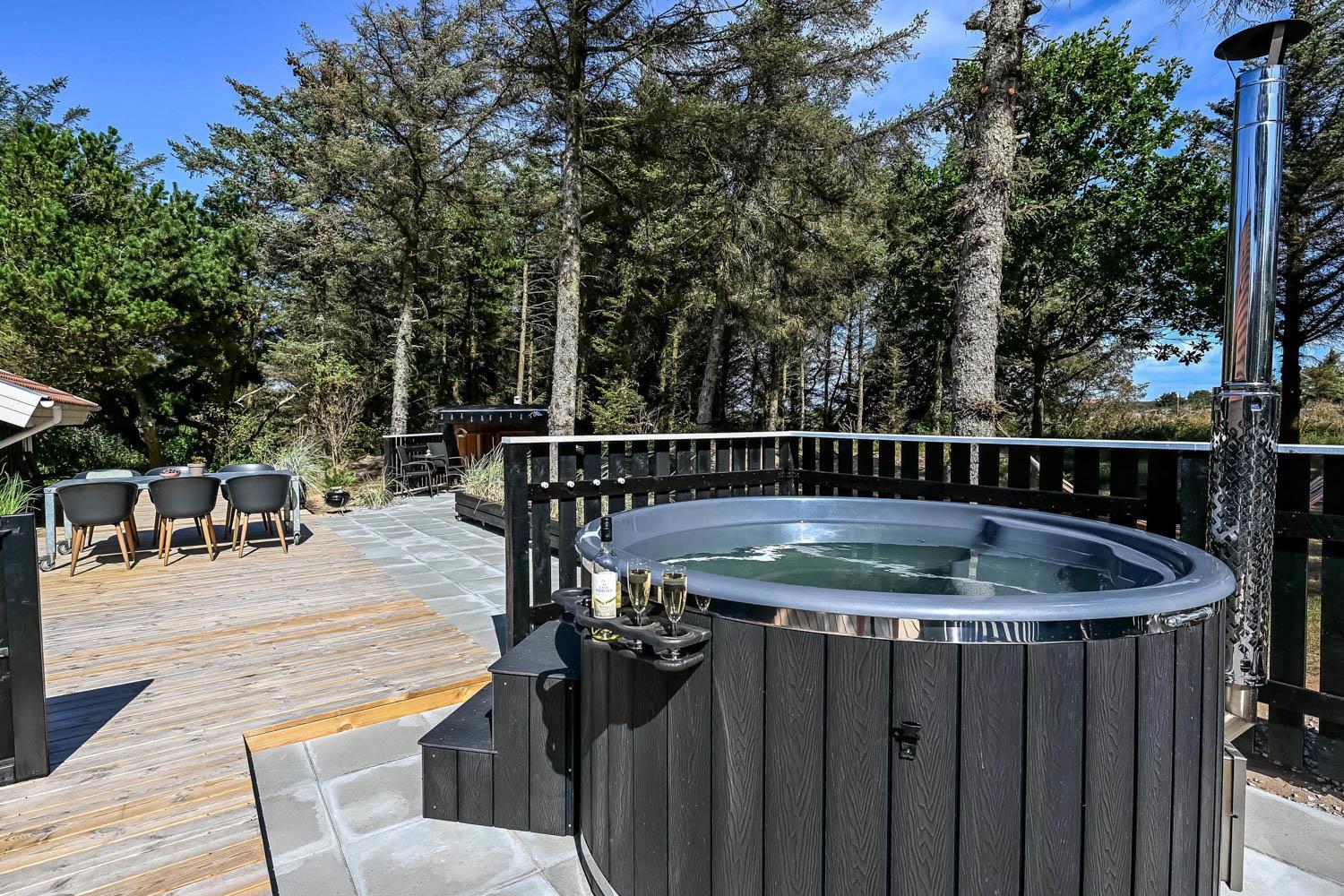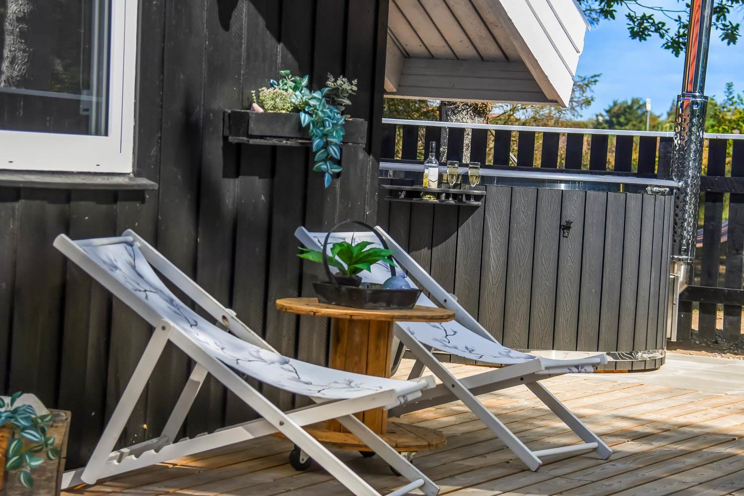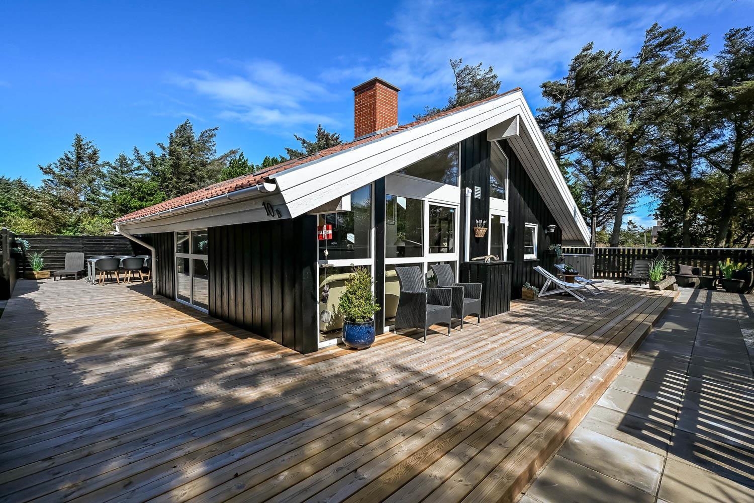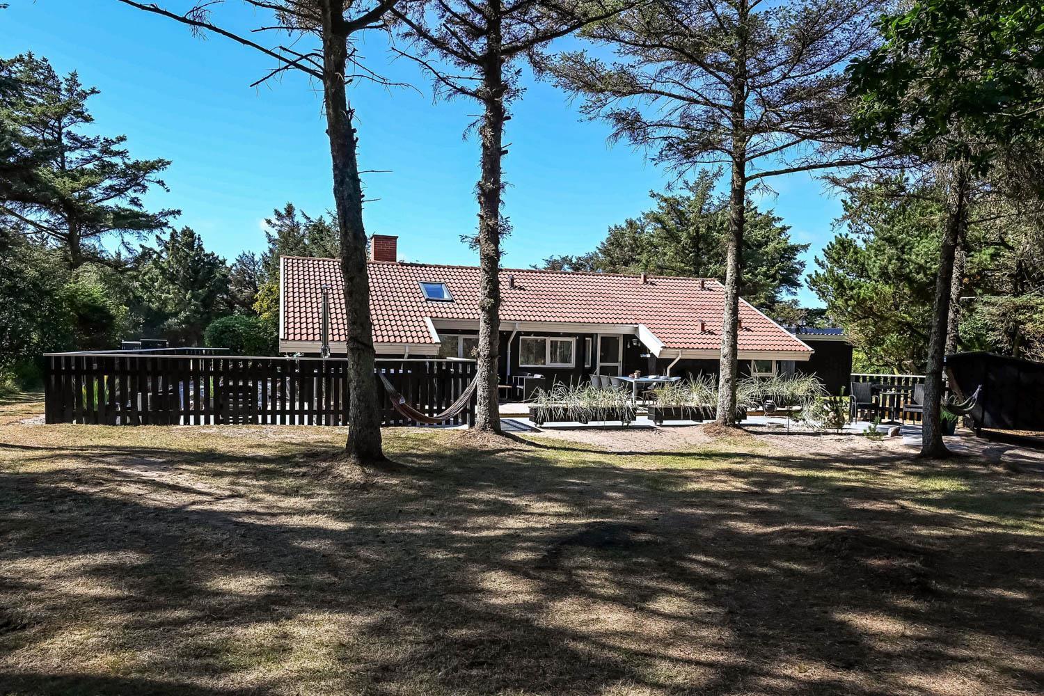 Dette skønne feriehus er beliggende på en fantastisk sydvendt grund på ca. 1.200 m2 med mange solkroge og mulighed for læ. Der er kun 350 meter fra Vesterhavet i det populære område Viktoriavej. Der er en stor terrasse med havemøbler, solvogne og grill, og det er altid muligt at finde en plads i solen. Som noget ganske specielt er der på den private grund også en wellnessafdeling udenfor med et udendørs vildmarksbad, som opvarmes med brænde. Få meter fra terrassen står den hyggelige shelter med plads til fire personer.