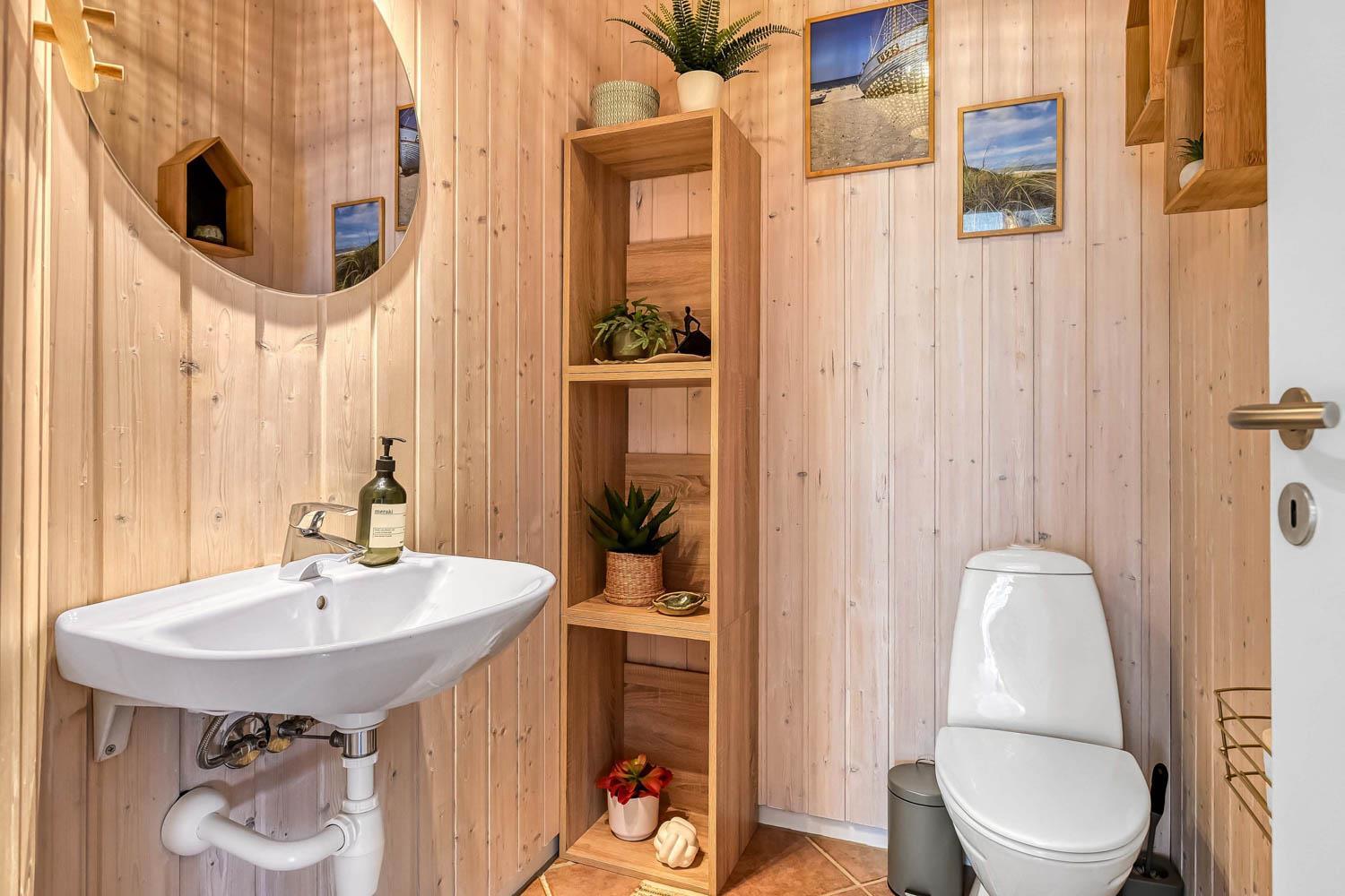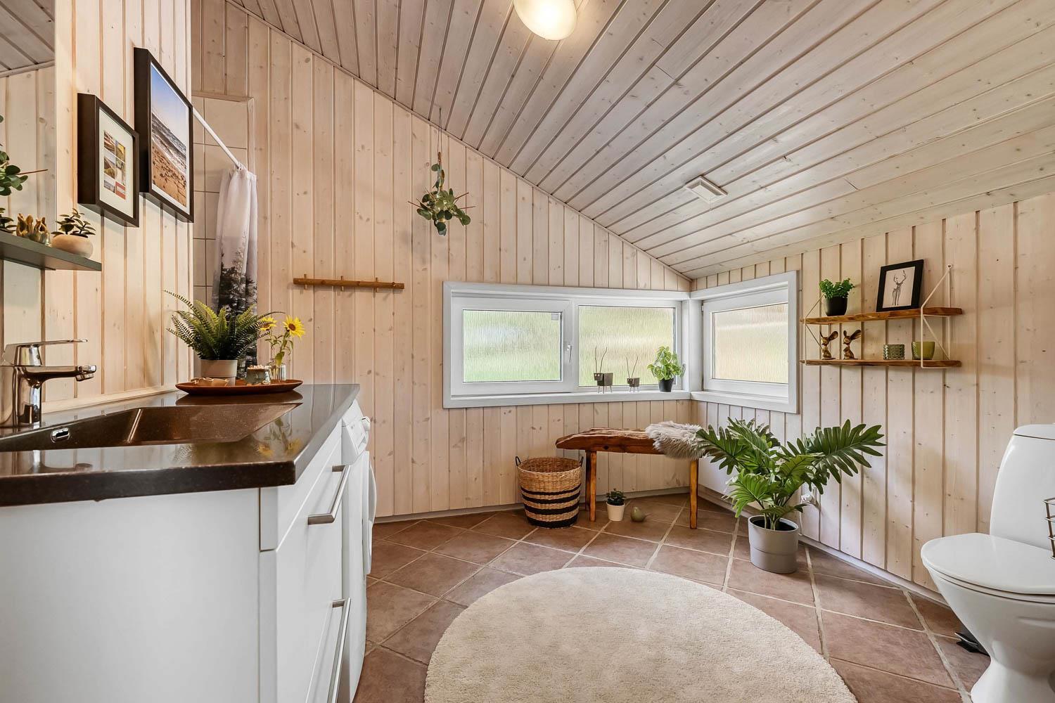 Der er to hyggelig indrettede badeværelser i huset. Det store er udstyret med toilet, bruser og gulvvarme, og direkte adgang til sauna. I hele huset er der praktiske og rengøringsvenlige gulve.