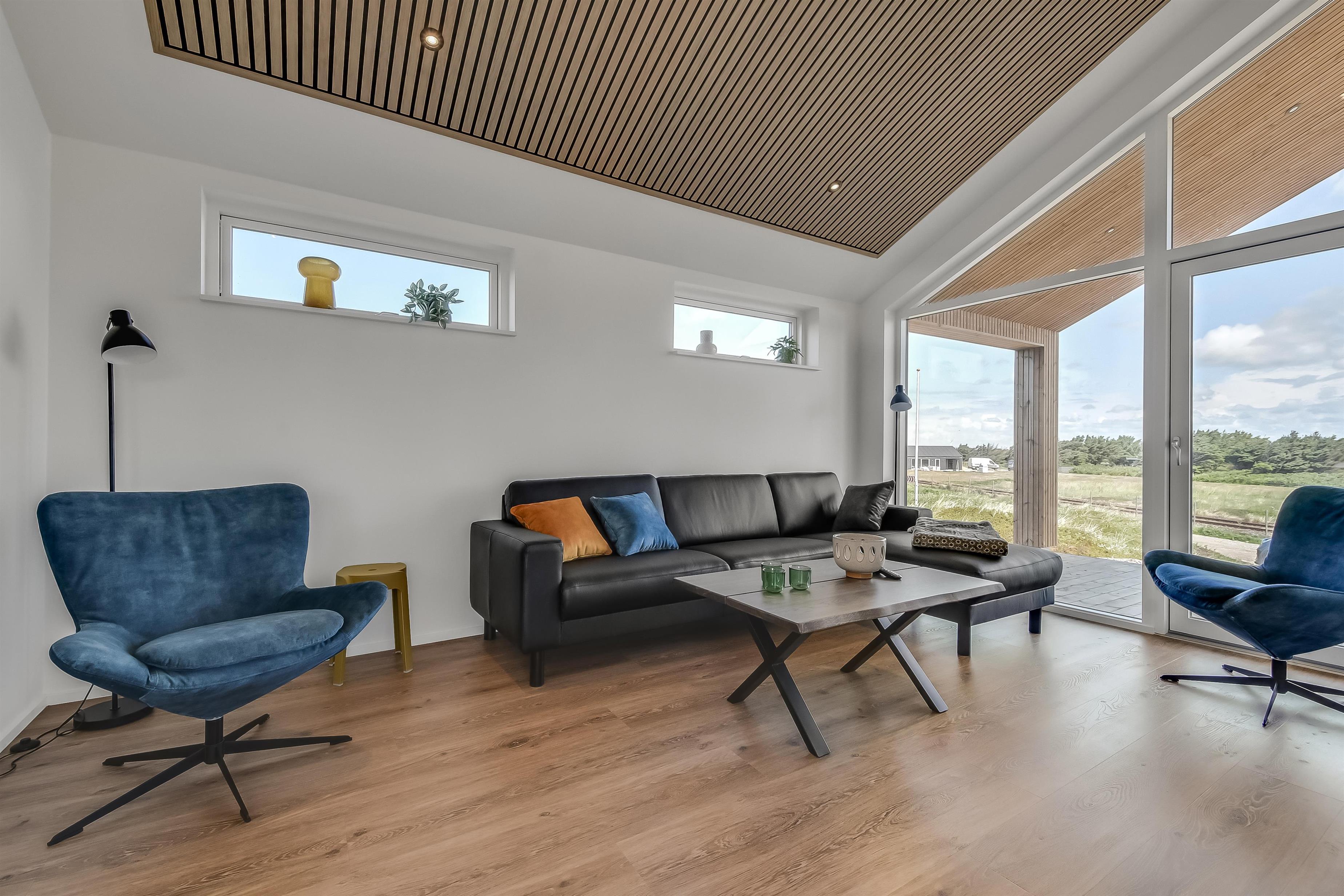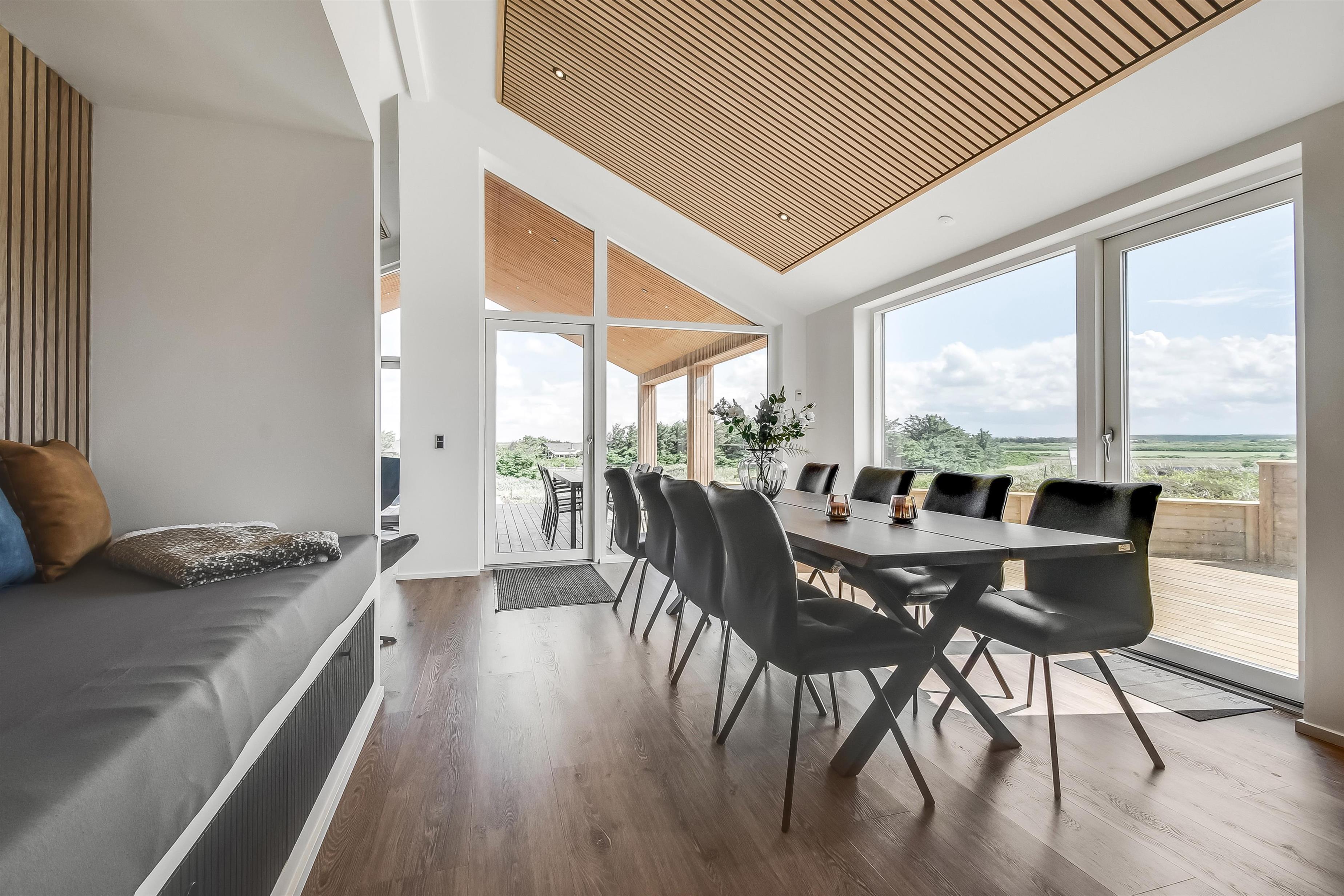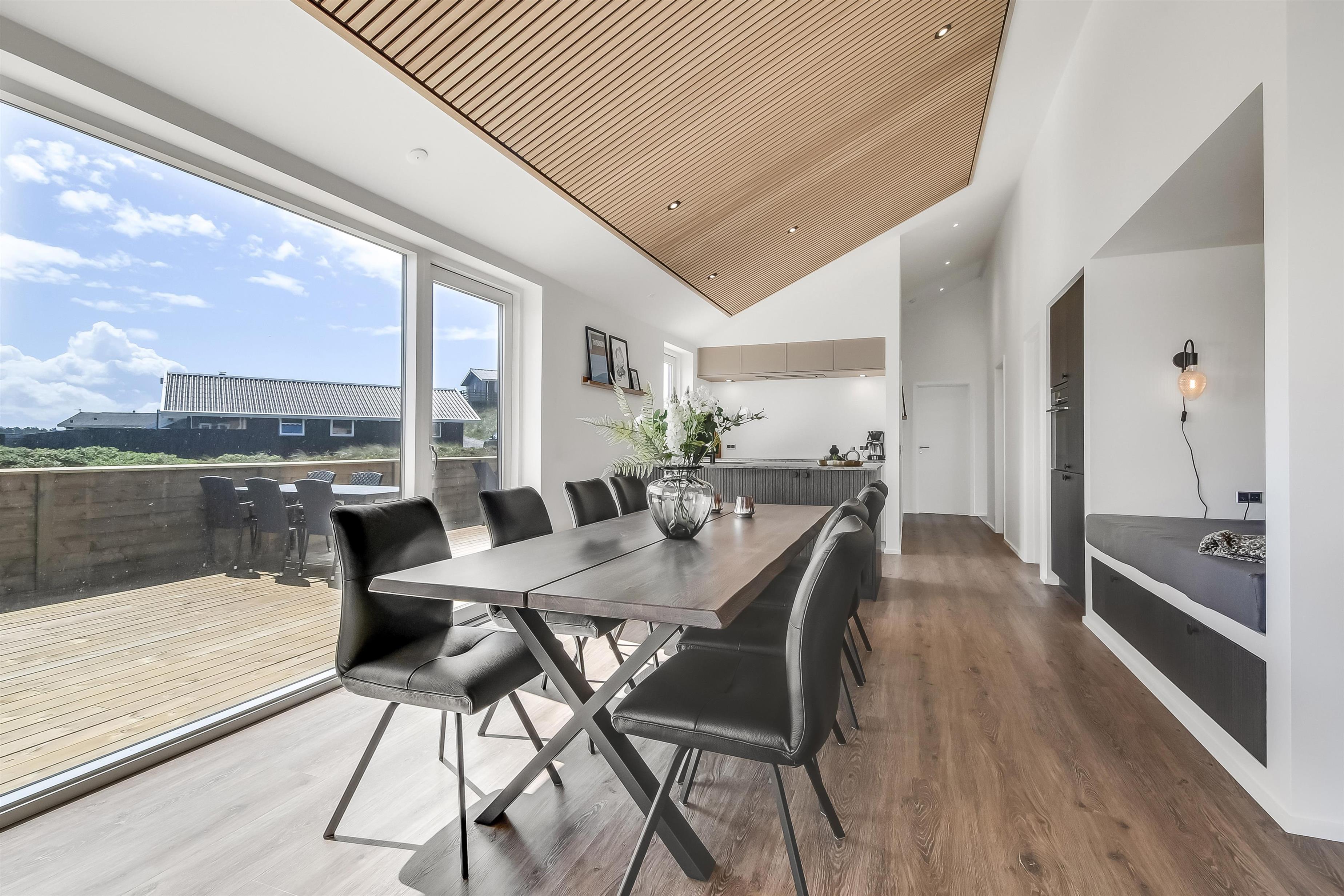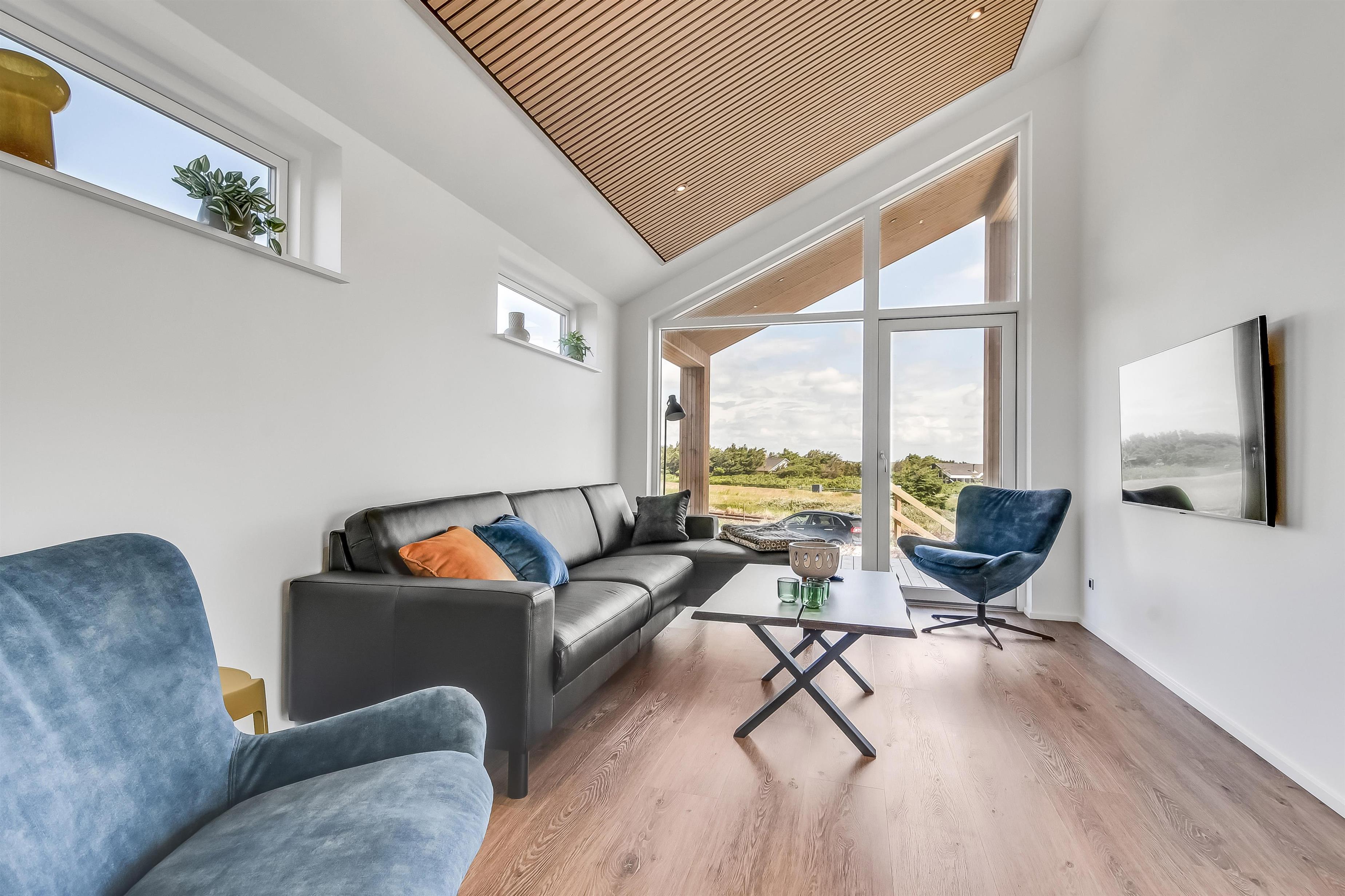 På en 1.134 m2 dejlig, kuperet naturgrund med en fantastisk udsigt til klitterne, og kun 200 m fra Vesterhavet, ligger dette pragtfulde feriehus på 113 m2. En flot entrè indeholdende skabe, ekstra af liggeplads byder velkommen. Køkken / alrummet er med loft til kip og trægulv med gulvvarme. Fra opholdsstuen er der udsigt til klitterne ved Vesterhavet og den er indrettet med smart-TV, med mulig for streaming af TV / radio / Apps, nye lædermøbler og spisebord. Gulvevarmeanlæg med sensor i hvert rum sørger for god varme i huset og gør huset særdeles energivenligt og bevirker også, at der er særdeles billigt at opvarme, selv i koldere perioder. I stuen er dejlig også en hyggelig alkove til stor glæde for børn og barnlige sjæle. Dejligt køkkenhjørne med alt i service og køkkengrej, opvaskemaskine, keramisk kogeplade, indbygningsovn, emhætte, køleskab med fryseboks og mikroovn. Stort, lækkert badeværelse med bruseniche, håndvask, toilet og klinkegulv med gulvvarme. Ekstra badeværelse med bruser, toilet, håndvask og klinkegulv med gulvvarme. Huset har 4 flotte soveværelser med trægulve, gulvvarme og skabe (1DS, 1DS, 1DS, 1DS). Vaskemaskine og tørretumbler er en selvfølge. Huset lejes ikke ud til ungdomsgrupper. Har man el-bil eller en Plug-in hybrid, så er der lade boks til Type 2 lade stik, der kan lade op til 11 kWh. Ikke ryger hus. Max. 1 hund tilladt.