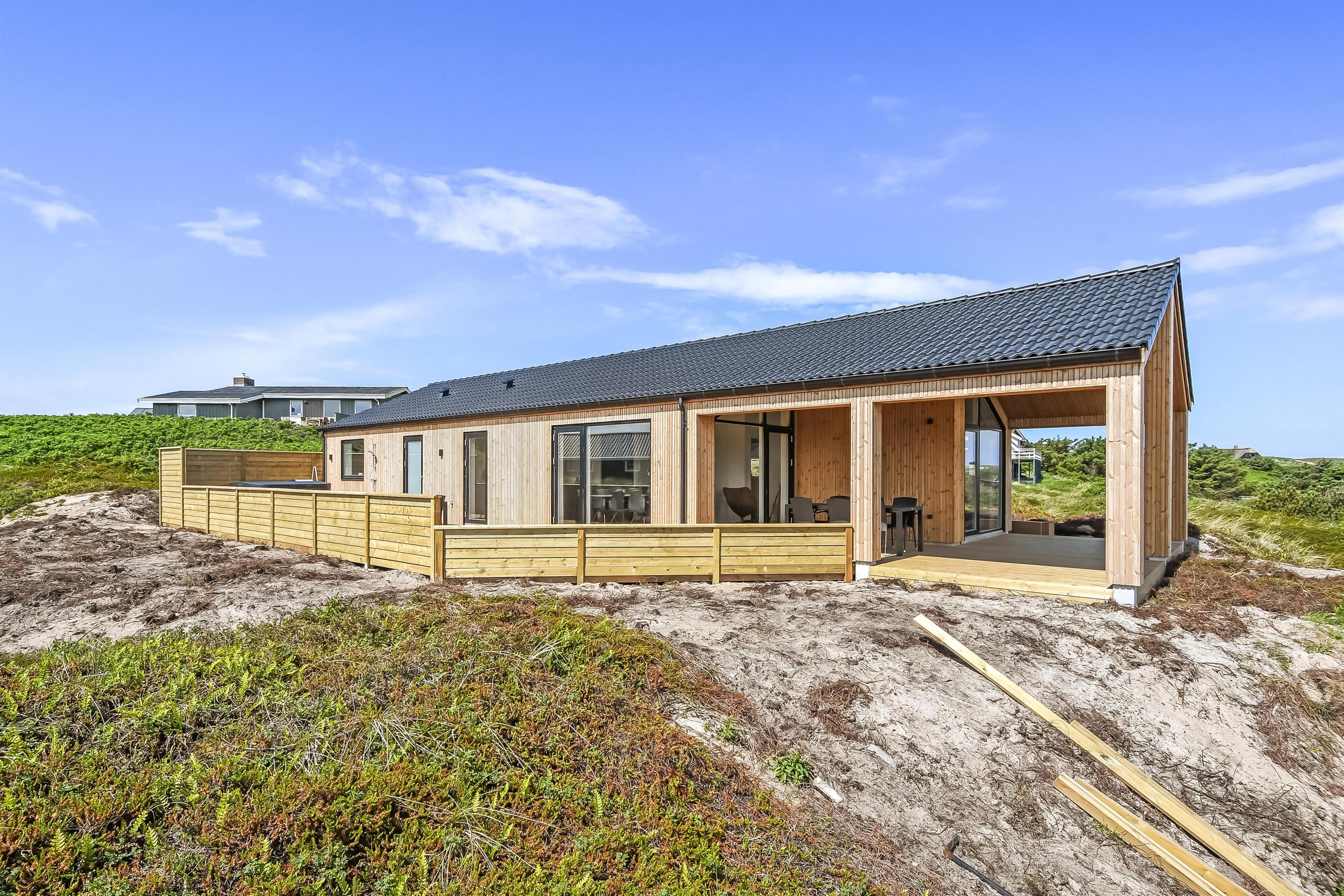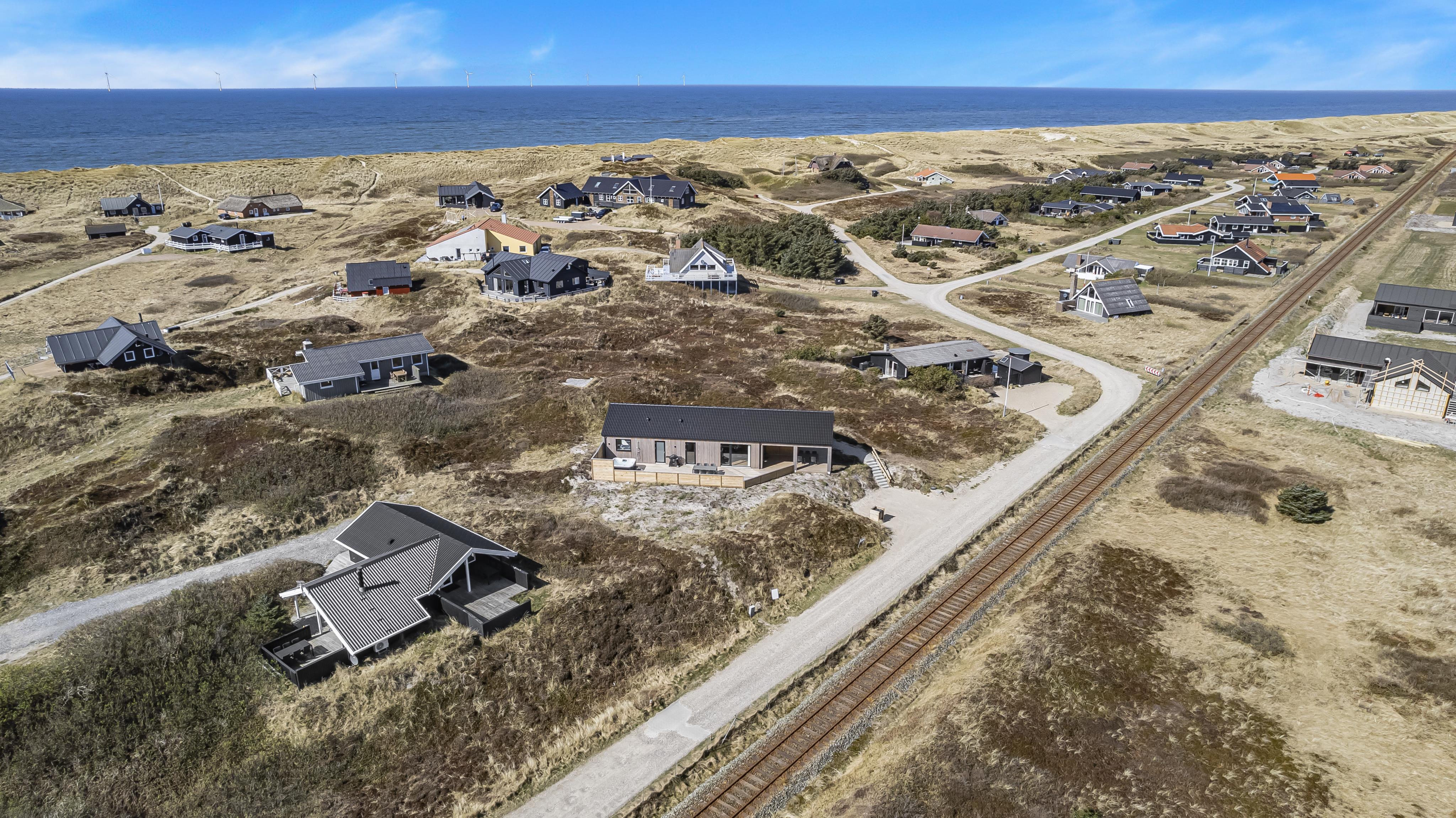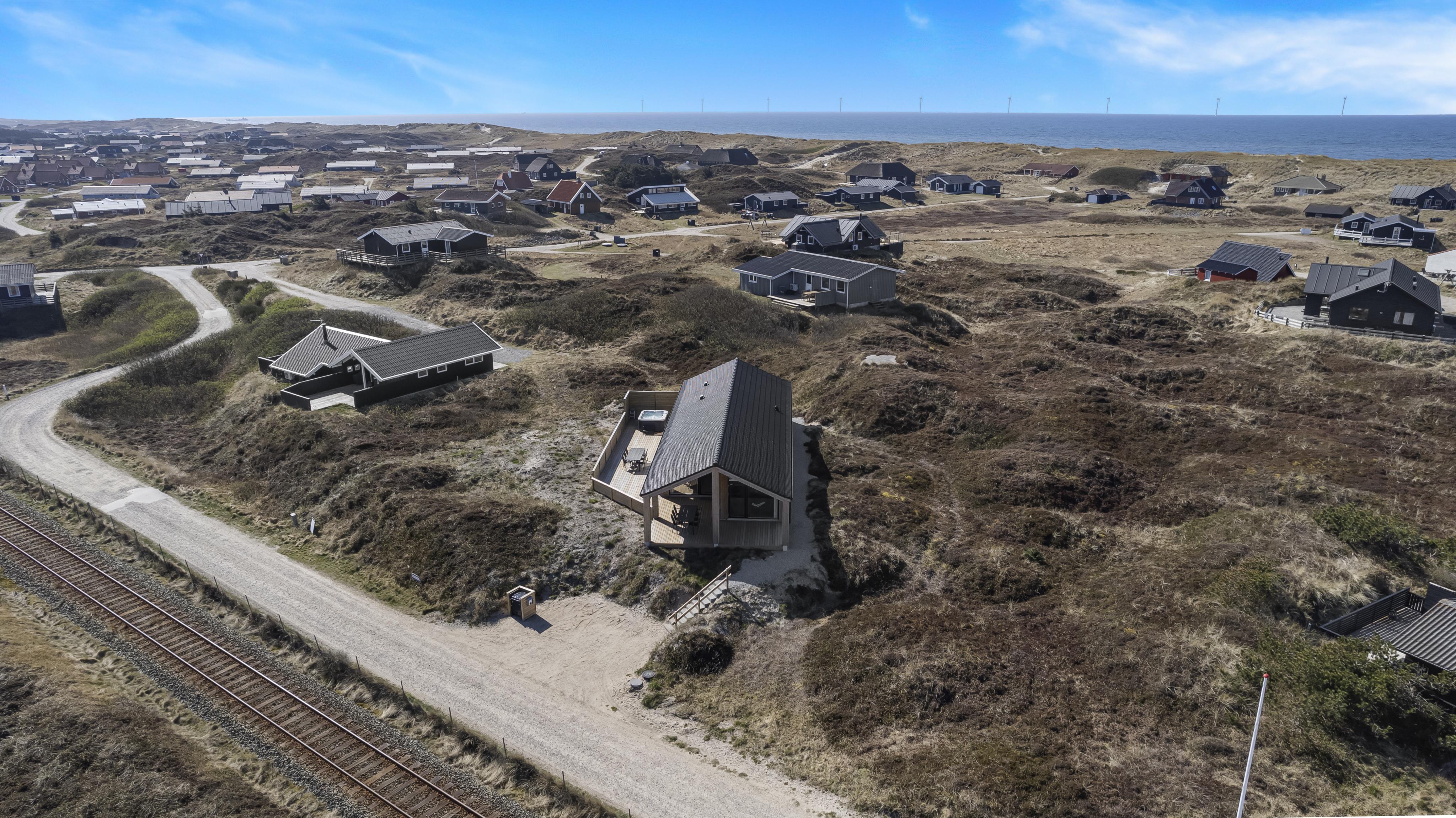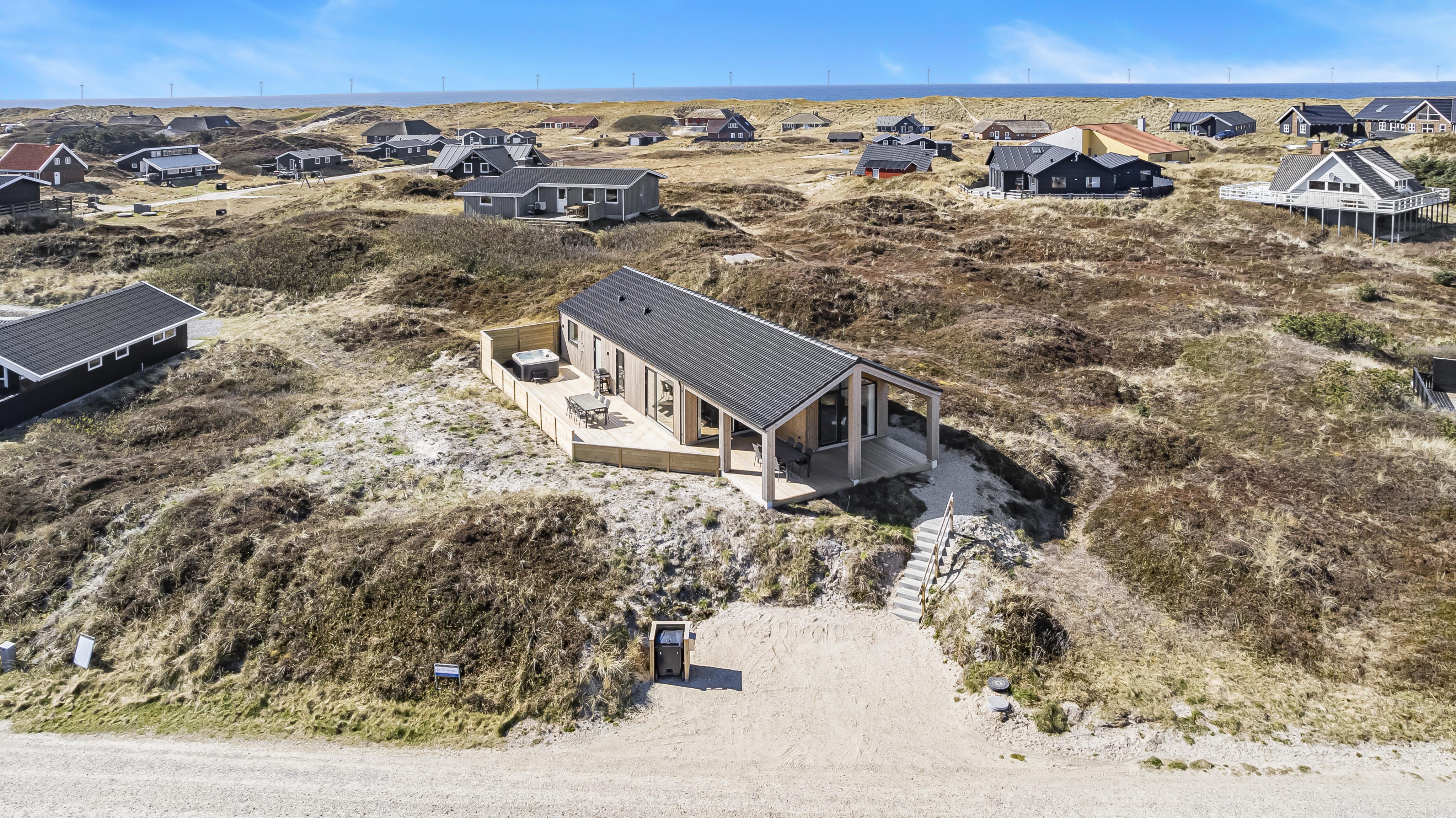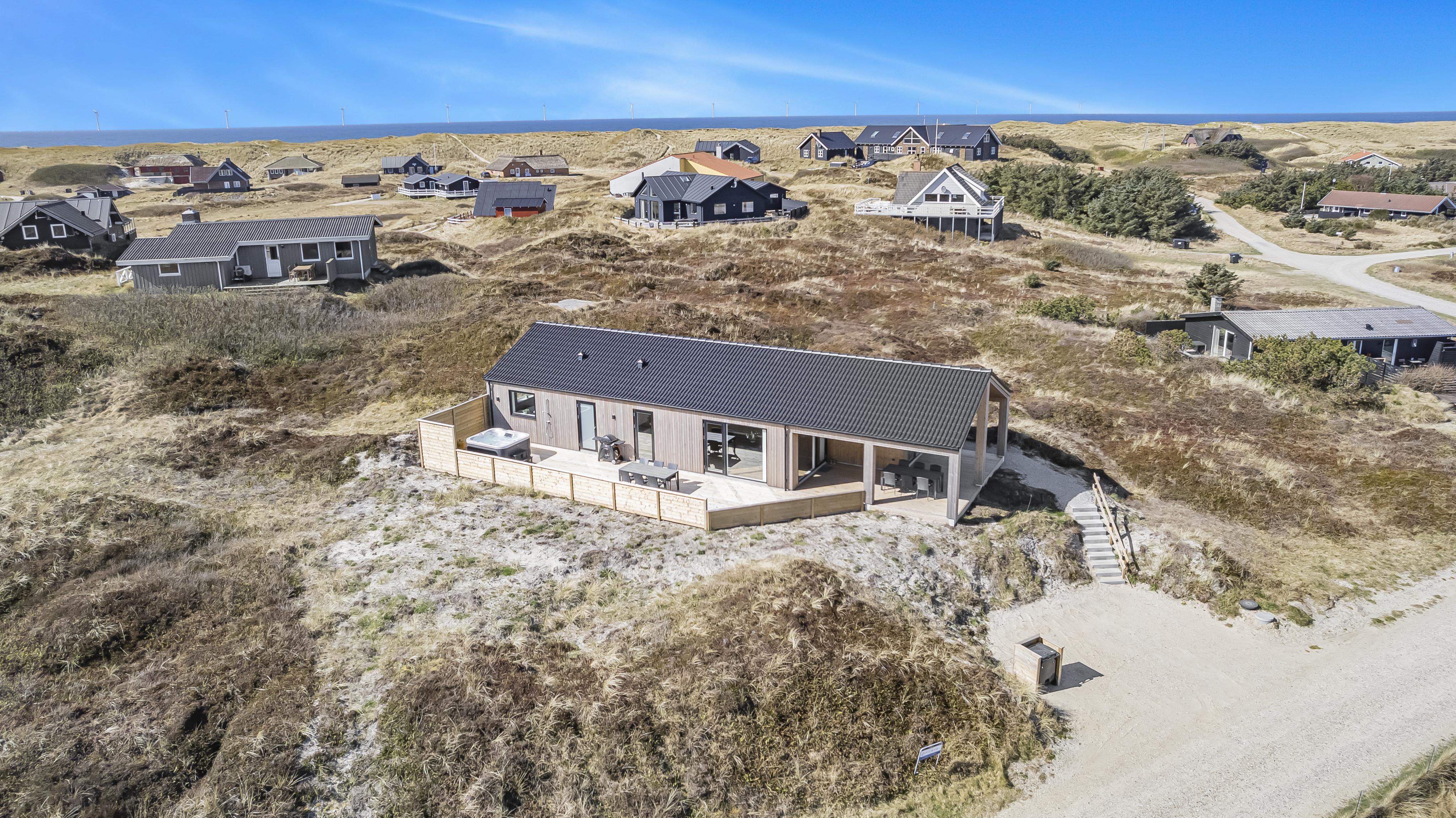 Huset er beliggende på en ca. 1.134 m2 stor kuperet, naturgrund kun 200 m fra Vesterhavet. Der er udgang til et fantastisk terrasseanlæg med stakit. Havemøbler, solvogne og gasgrill som kan flyttes rundt efter behag. Der er masser af læ kroge og fantastiske og masser af muligheder for at nyde den fantastiske udsigt. En tur i den udendørs spa gør oplevelsen unik og specielt på de mørke aftener med den klare stjernehimmel. En unik oplevelse som er ren terapi for sjæl og krop. Fra grunden kan man via grusstier nemt gå til direkte over klitten til Vesterhavet. Således er der ikke langt til strandfornøjelser som badning, drageflyvning, lystfiskeri eller vandreture i den friske luft hvor man til tider kan blive blæst helt igennem. Vesterhavets vandkant ligger blot 200 meter fra huset. Et utrolig dejligt hus, hvor der er tænkt på det meste og med masser af muligheder. 5 - 10 min fra huset ligger Vesterhavet, der altid inviterer til en frisk gå- eller løbetur. Områdets købmand har sæsonåbent og ligger ca. 1.500 m fra huset og som i sæsonen byder på frisk morgenbrød. Her kan de daglige indkøb også klares. Også området madsted ligger ca. 1.500 fra huset. Inden for 25-30 minutter kan flere aktiviteter og shopping muligheder nås. Så hvad enten I er til aktiv ferie eller total afslapning, danner dette flotte, nybygget feriehus en dejlig ramme både hvad angår hus, beliggenhed og omgivelser.