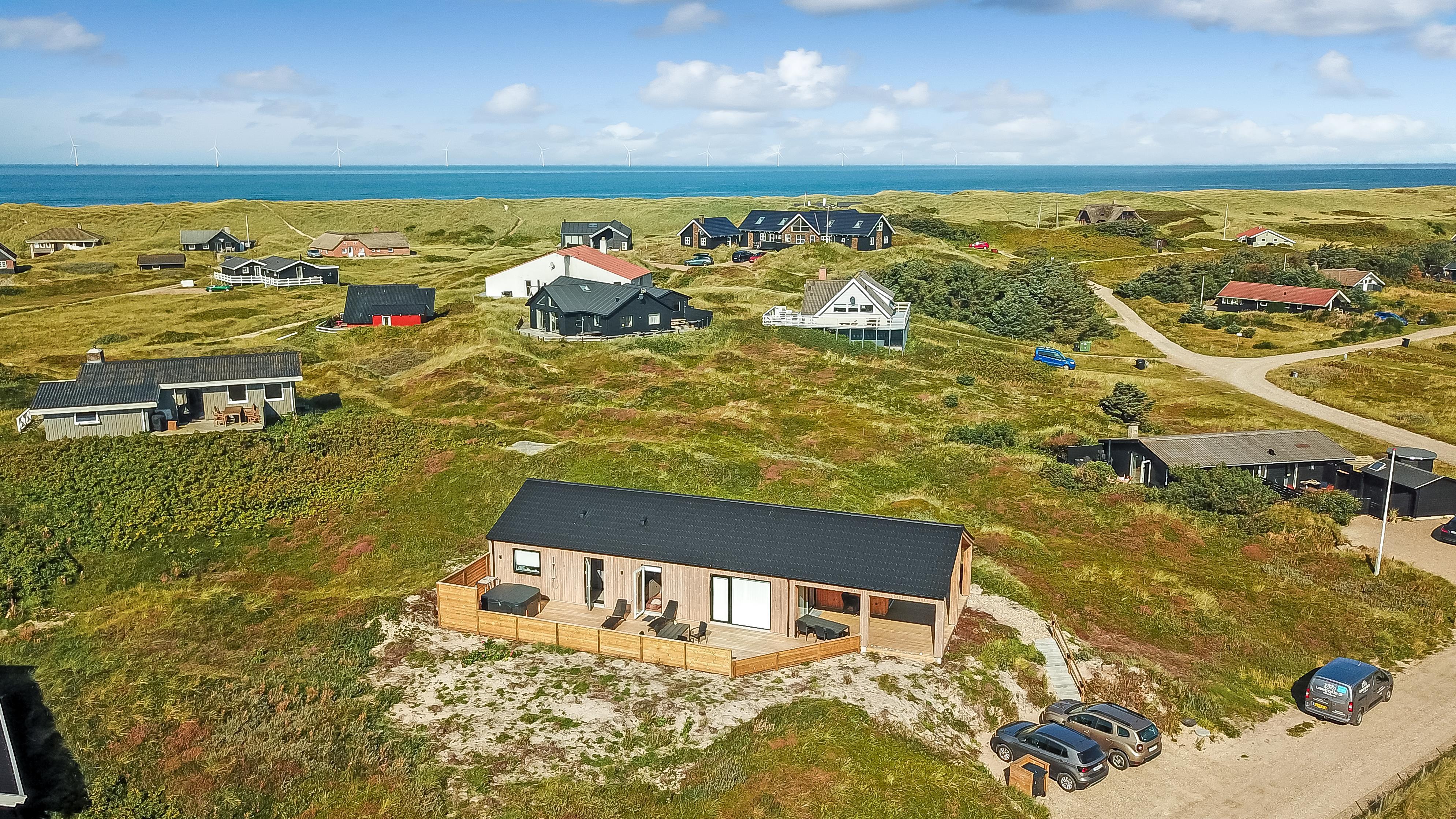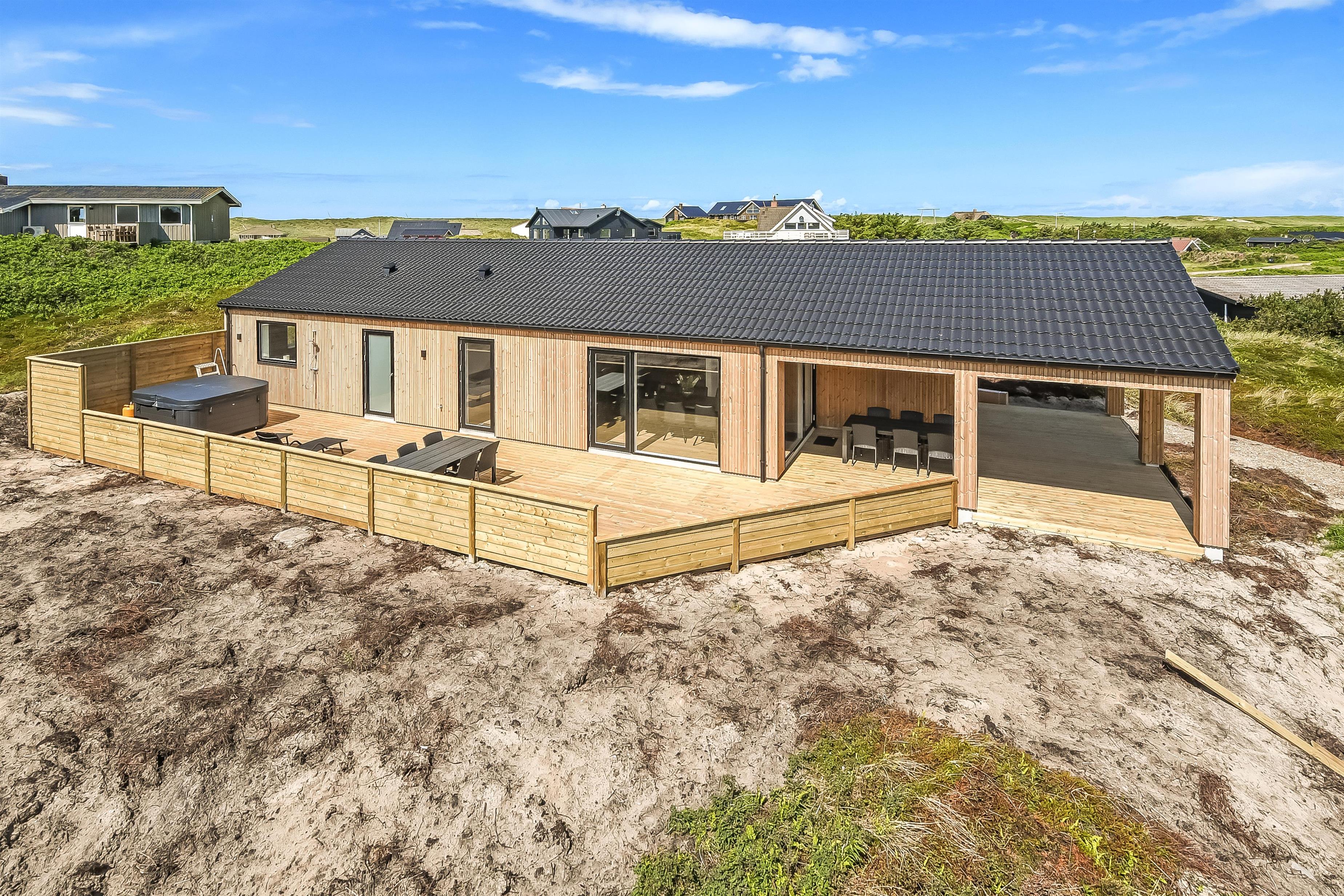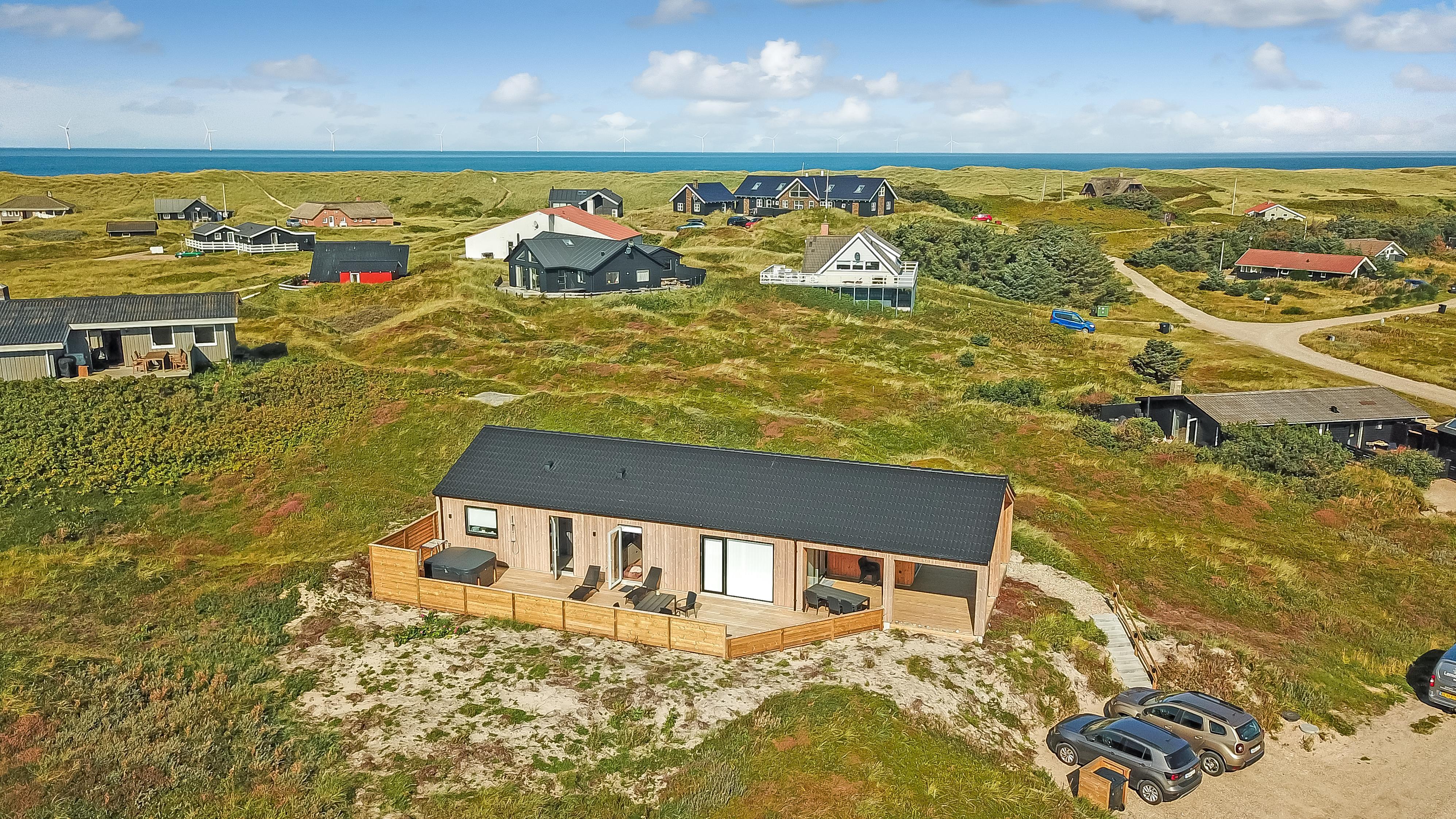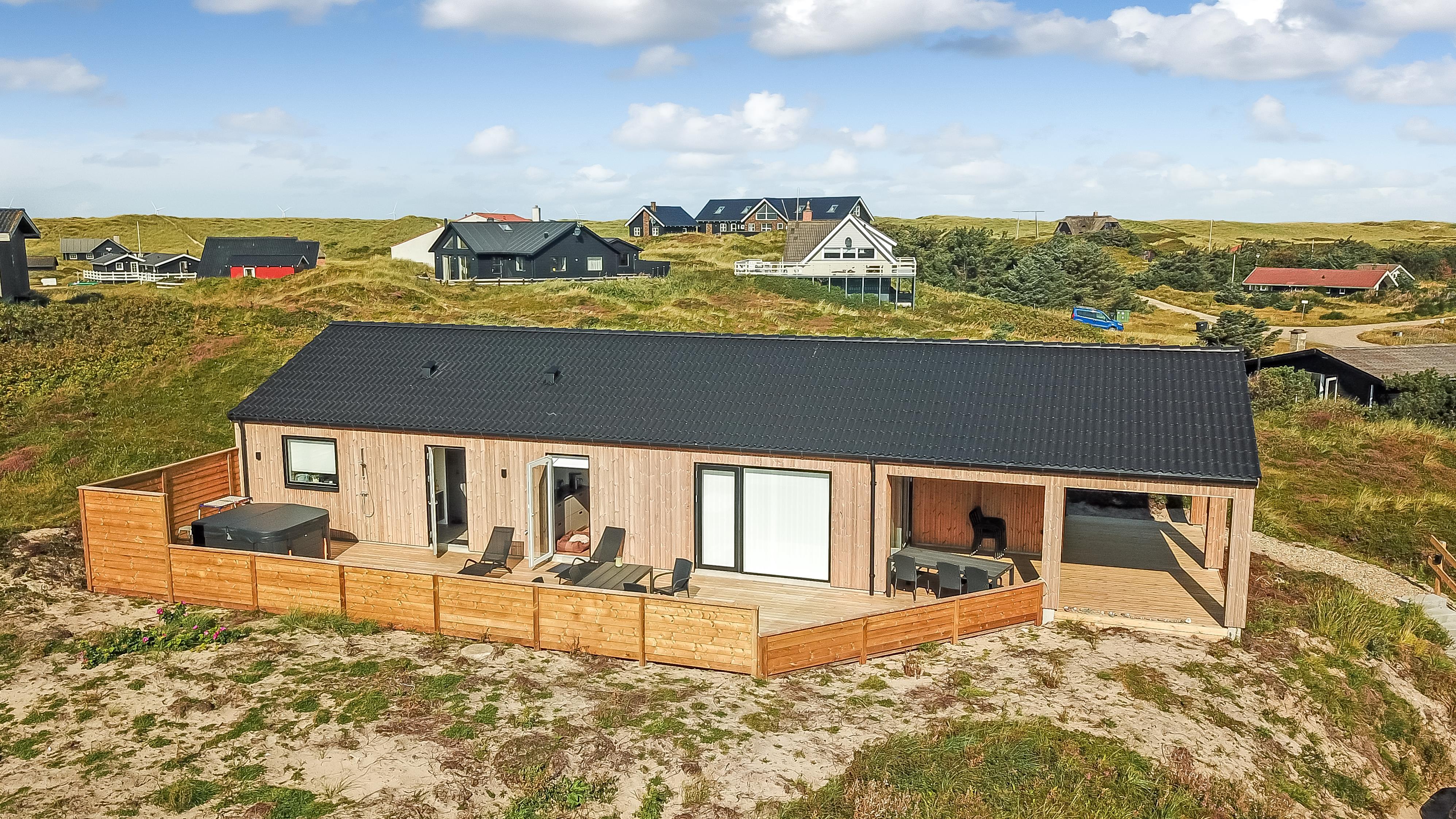 Huset er beliggende på en ca. 1.134 m2 stor kuperet, naturgrund kun 200 m fra Vesterhavet. Der er udgang til et fantastisk terrasseanlæg med stakit. Havemøbler, solvogne og gasgrill som kan flyttes rundt efter behag. Der er masser af læ kroge og fantastiske og masser af muligheder for at nyde den fantastiske udsigt. En tur i den udendørs spa gør oplevelsen unik og specielt på de mørke aftener med den klare stjernehimmel. En unik oplevelse som er ren terapi for sjæl og krop. Fra grunden kan man via grusstier nemt gå til direkte over klitten til Vesterhavet. Således er der ikke langt til strandfornøjelser som badning, drageflyvning, lystfiskeri eller vandreture i den friske luft hvor man til tider kan blive blæst helt igennem. Vesterhavets vandkant ligger blot 200 meter fra huset. Et utrolig dejligt hus, hvor der er tænkt på det meste og med masser af muligheder. 5 - 10 min fra huset ligger Vesterhavet, der altid inviterer til en frisk gå- eller løbetur. Områdets købmand har sæsonåbent og ligger ca. 1.500 m fra huset og som i sæsonen byder på frisk morgenbrød. Her kan de daglige indkøb også klares. Også området madsted ligger ca. 1.500 fra huset. Inden for 25-30 minutter kan flere aktiviteter og shopping muligheder nås. Så hvad enten I er til aktiv ferie eller total afslapning, danner dette flotte, nybygget feriehus en dejlig ramme både hvad angår hus, beliggenhed og omgivelser.