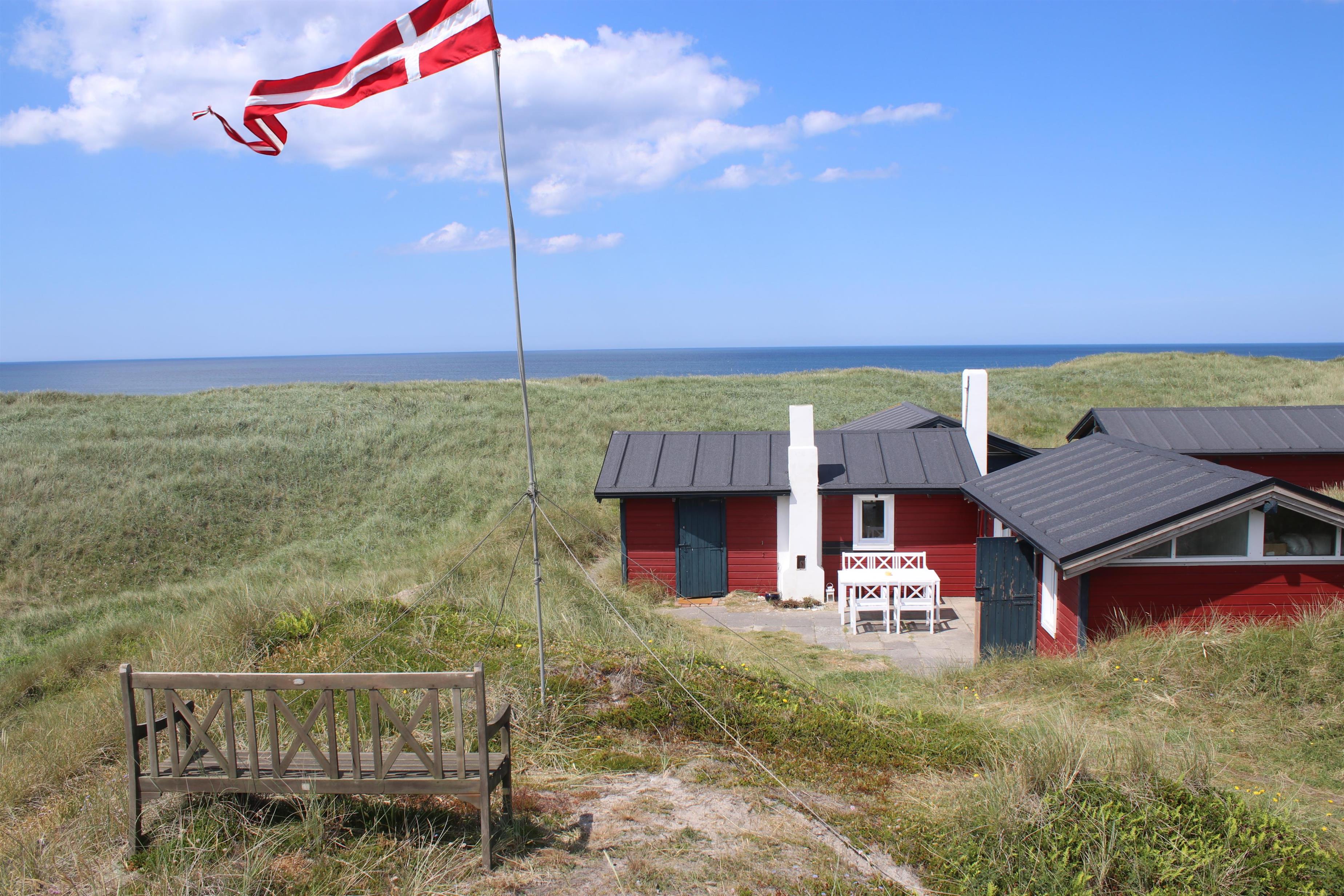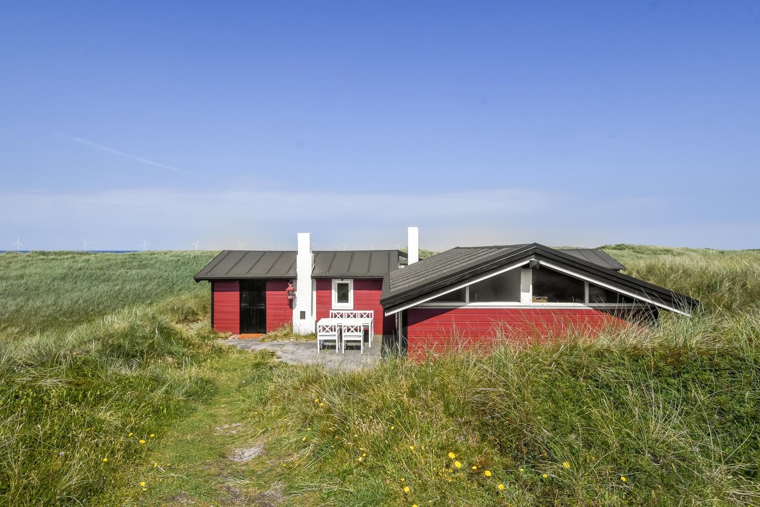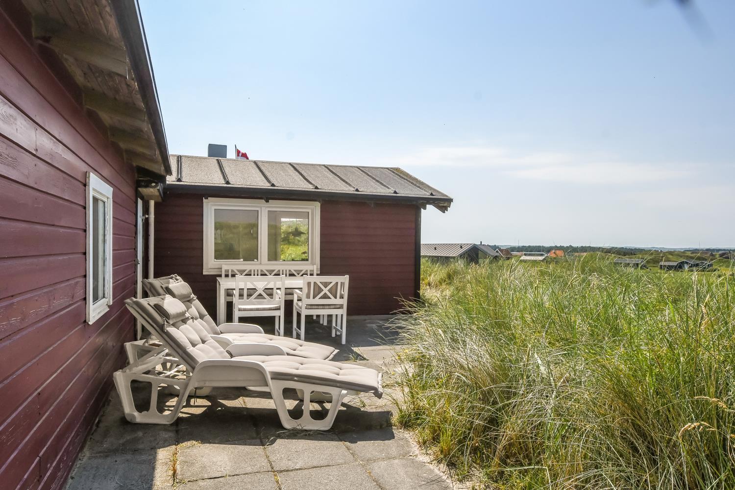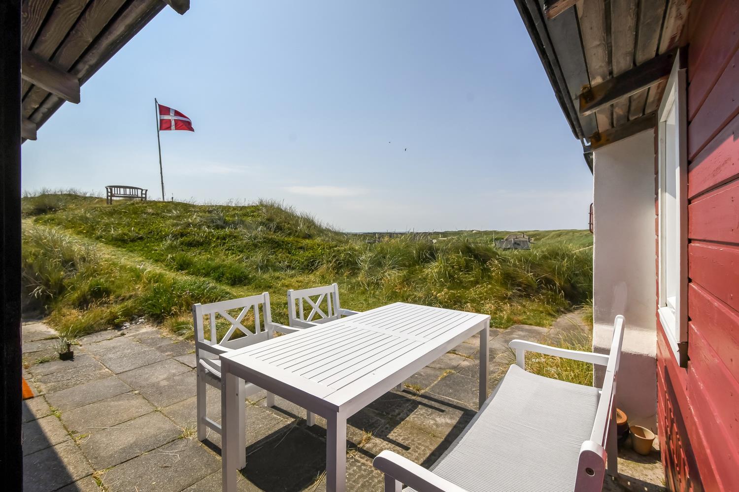 Dette hus ligger på en ca. 4.170 m2 klitgrund i første række til Vesterhavet. Fra grunden er der stier direkte over klitterne, direkte til Vesterhavet. Disse omgivelser er helt unikke og findes ikke lignende andre steder i området. De 2 huse giver masser af muligheder for gode solkroge på de 3 terrasser. Når I kommer op til huset tager den første terrasse imod. Terrassen ligger omgivet af klitter som danner en gryde. Her er der næsten altid læ og sol. På terrassen er der et borde bænkesæt og der er solvogne som kan flyttes rundt efter behov. Fra terrassen er der opgang til et udsigtspunkt med 1 romantisk bænk. her er der pragtfuld udsigt over Vesterhavet og de høje klitter. Nyd også husets 2 andre terrasser. Fra fordeler gangen er der udgang til en fantastisk vestvendt terrasse med havemøbler og en dejlig gasgrill. Bedre sted at nyde et måltid findes simpelthen ikke. Sidst men ikke mindst er der fra opholdsstuen udgang til huset bagudvendte terrasse som næsten er bygget ind i klitterne med udendørs bruser.. Når i kommer frem til huset parkeres bilen nedenfor huset og via trapperne gennem den naturlige allé går I op til huset (Det er forbud mod at gå via klitterne). Her får I dagens motion - men det er med garanti indsatsen værd. Selve huset er hyggeligt og pænt med det er beliggenheden, som er unik og derfor er der ikke gået på kompromis med stilen i huset, som ikke er tip top moderne med velvalgt til huset beliggenhed. En sand nydelse for de få heldige der får lov til at leje dette private og personlige badehus.